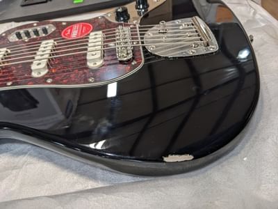 10053 Frigidaire 3.2 cu ft retro mini frig in black, handle is missing dents and scuff marks on back, and on side door