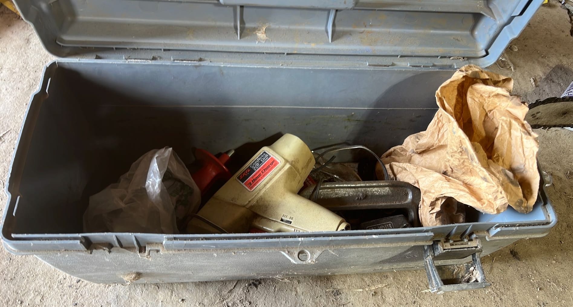 94 Plastic toolbox & contents - one latch broken - includes Skil 3/8" cordless drill, 9”x20”x9.5”