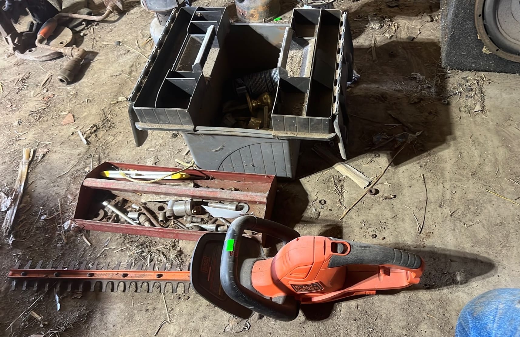 104 Black & Decker hedge trimmer electric, plastic toolbox and contents, metal tray and tools