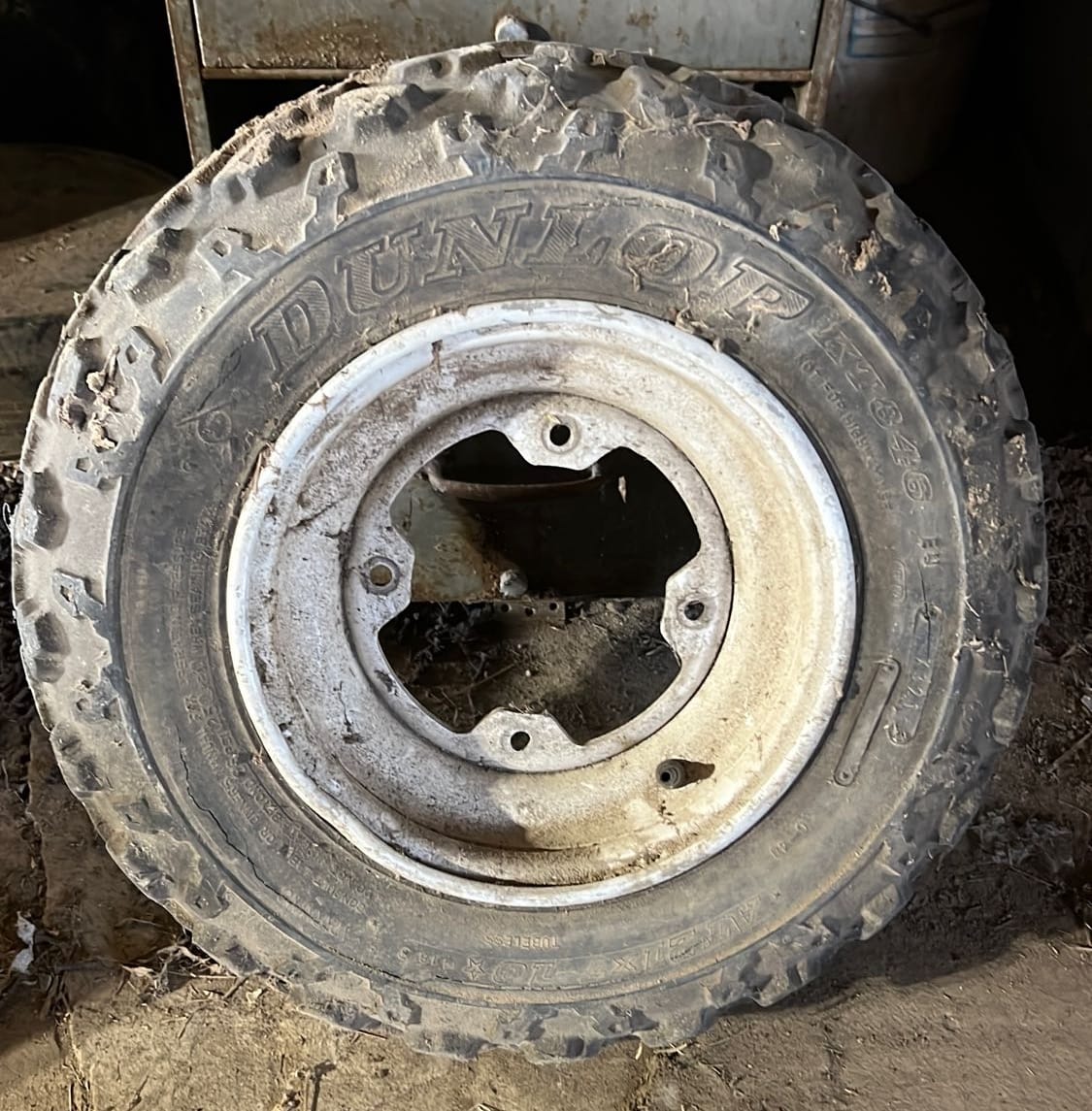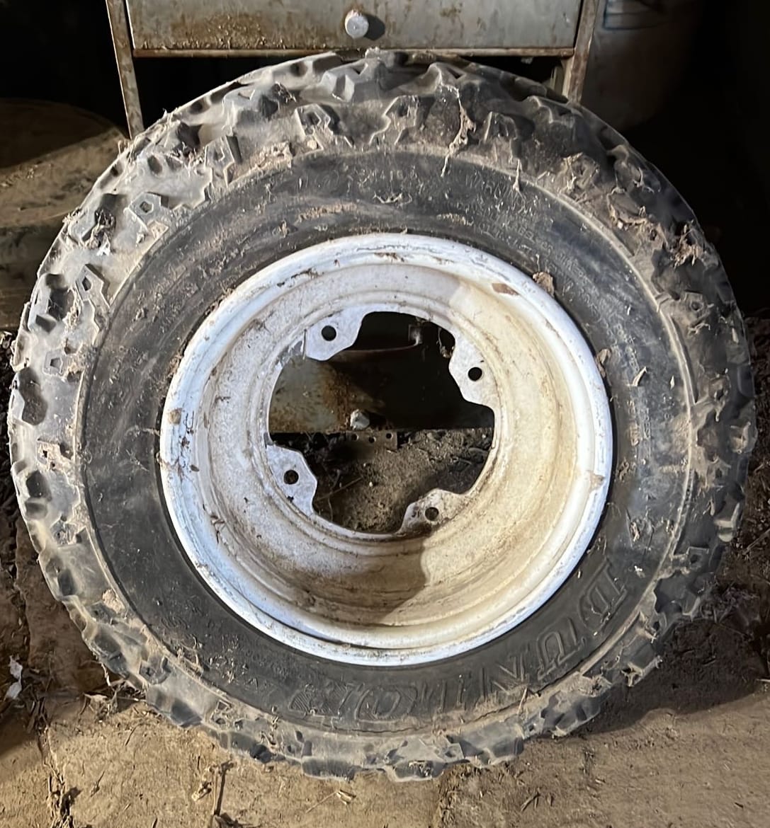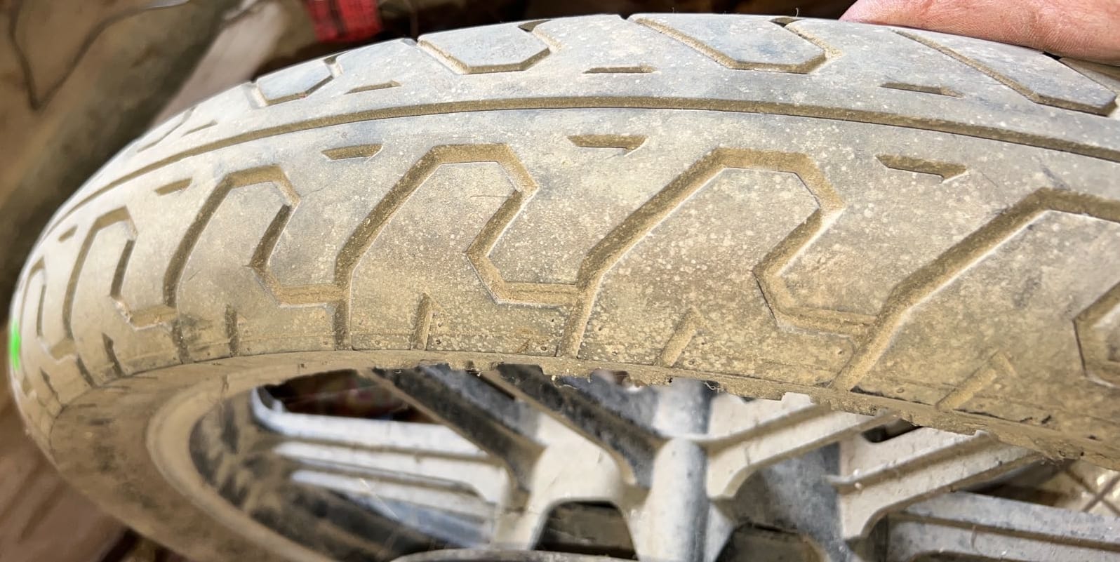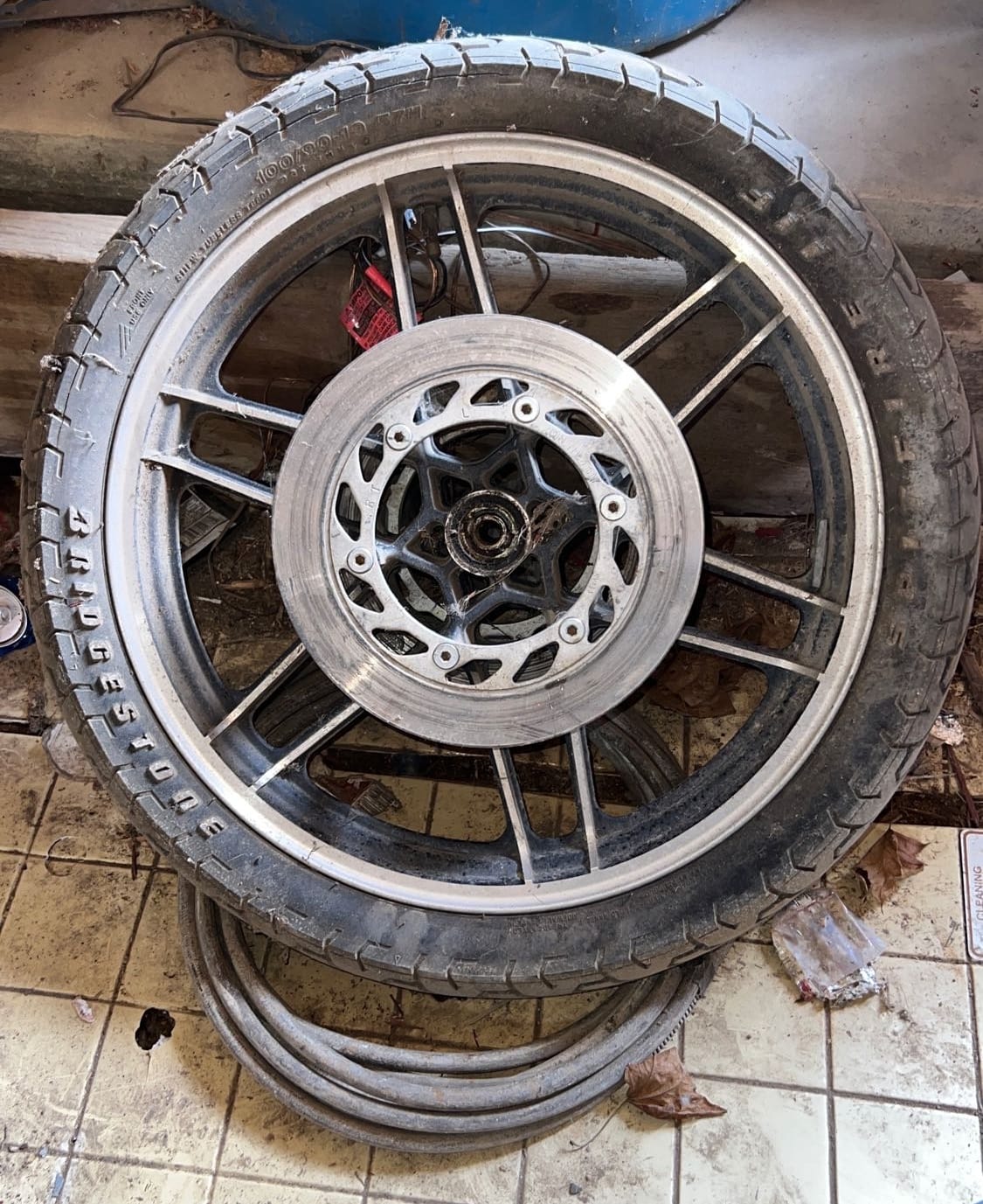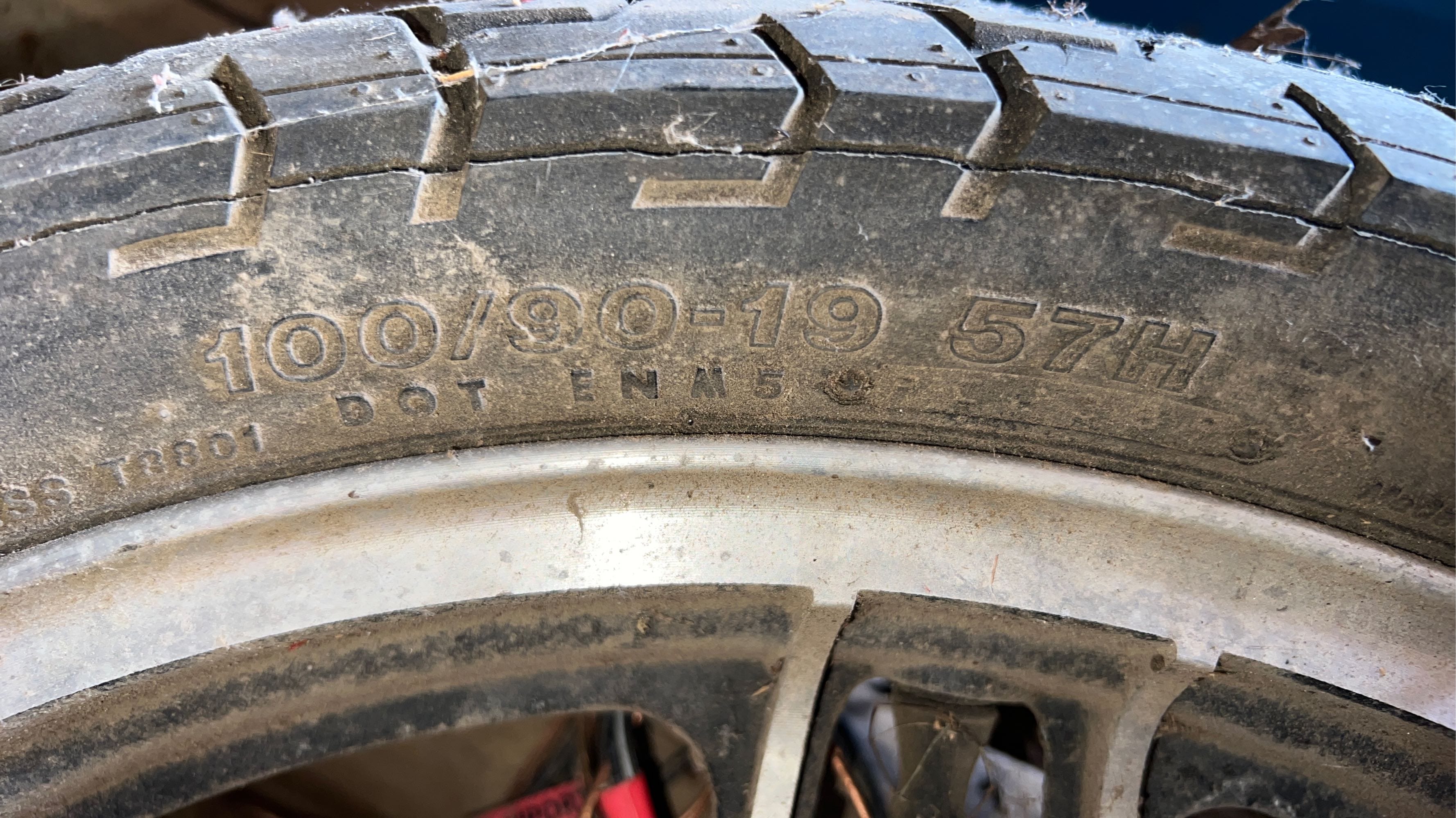 112 Bridgestone motorcycle tire in rim, 100/90-19 57H