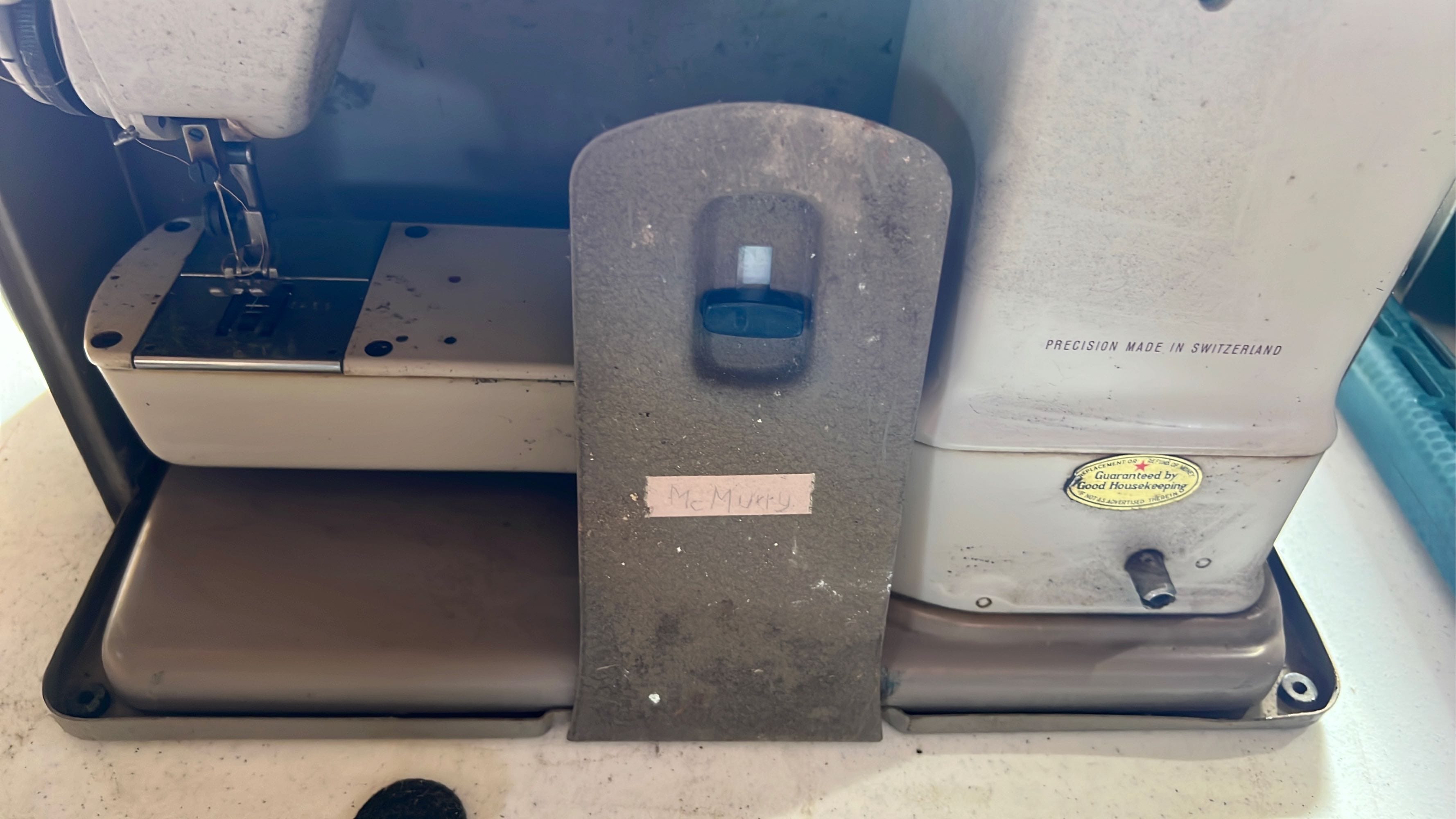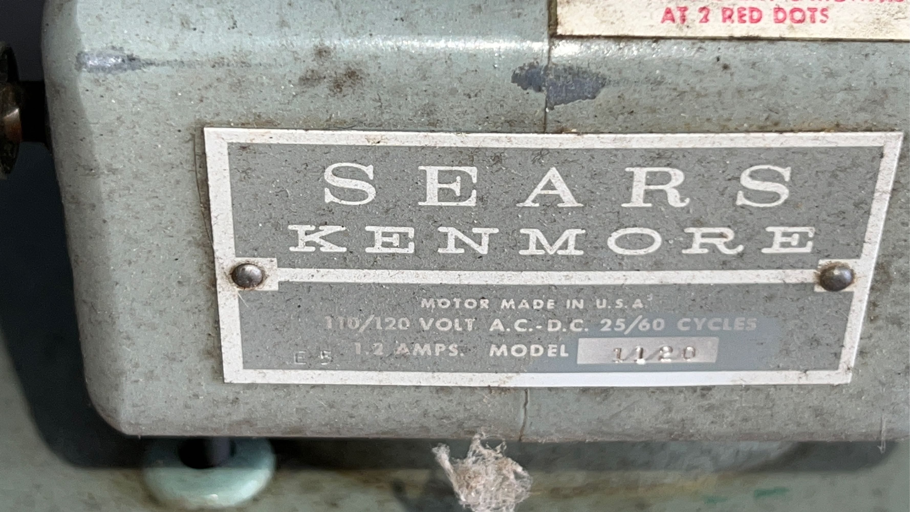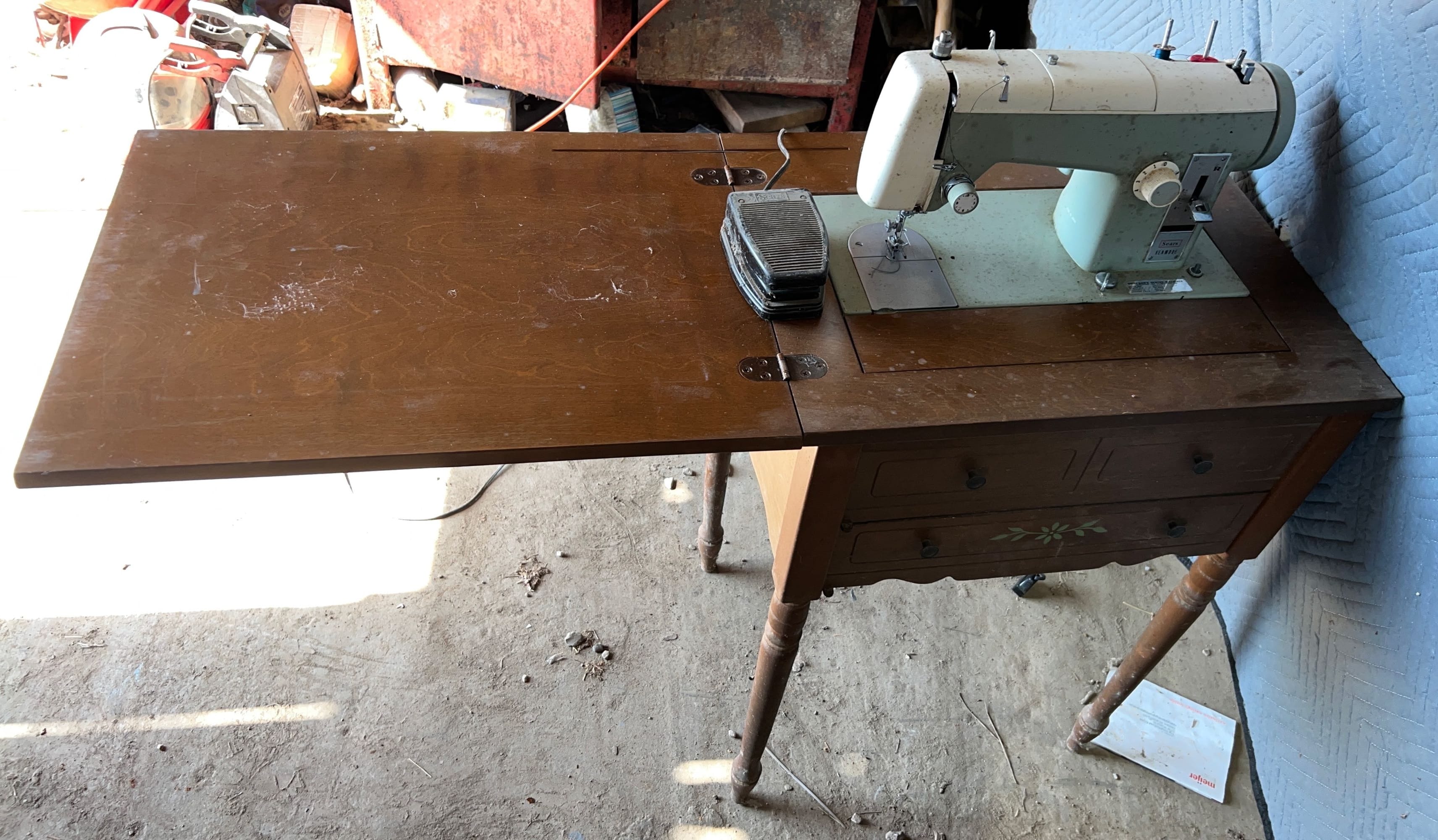 111 Kenmore sewing machine model 1120 in cabinet, 17.5”x 22.5”x31” with foot control
