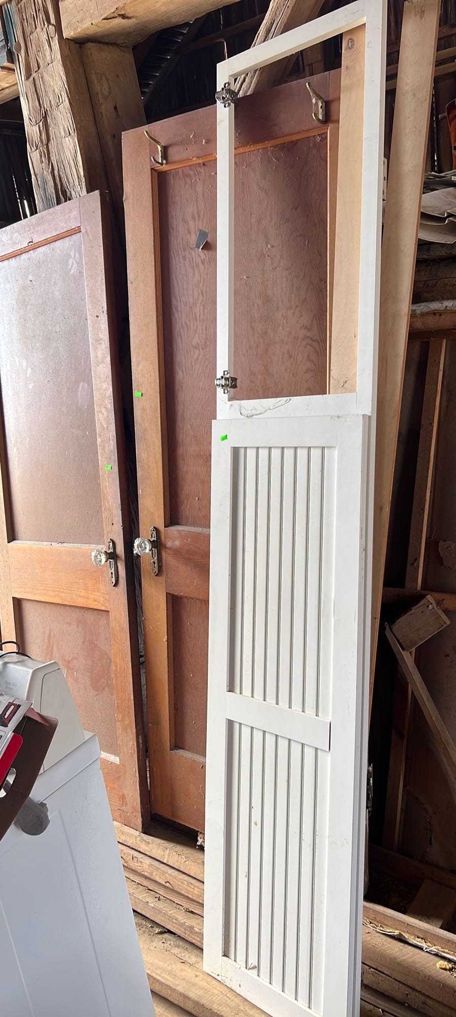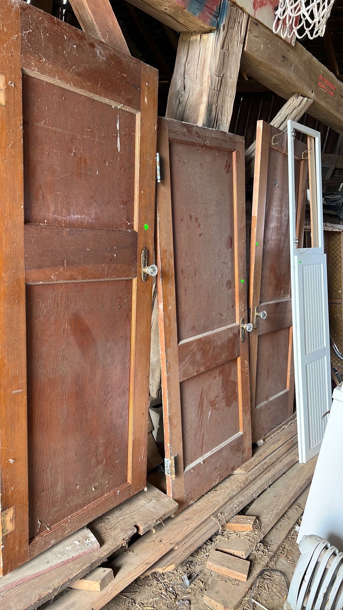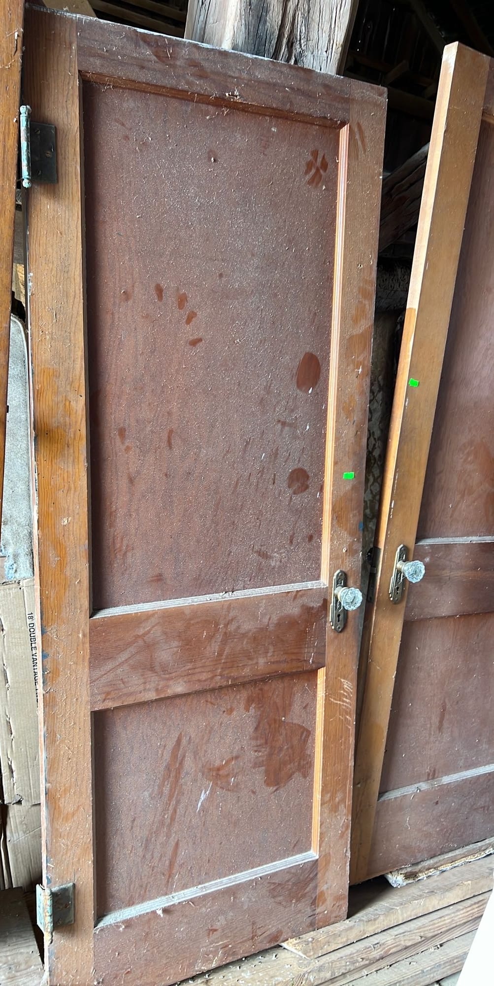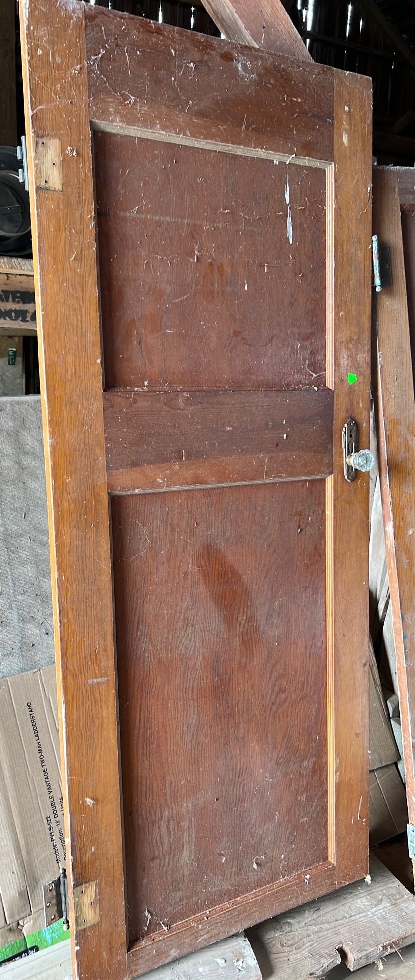 120 (3) Wood doors - 29”, 29.5”, 30” with vintage glass door knobs, White door panel, 18”x88.5”