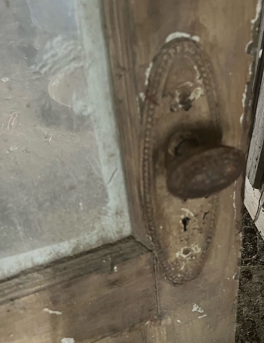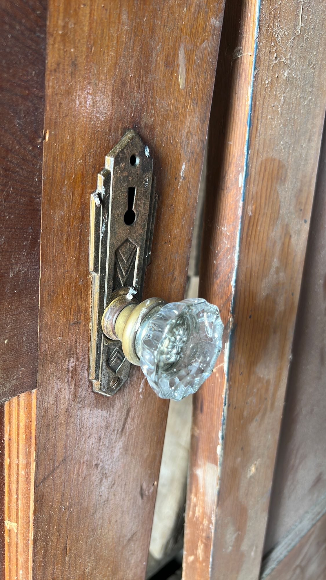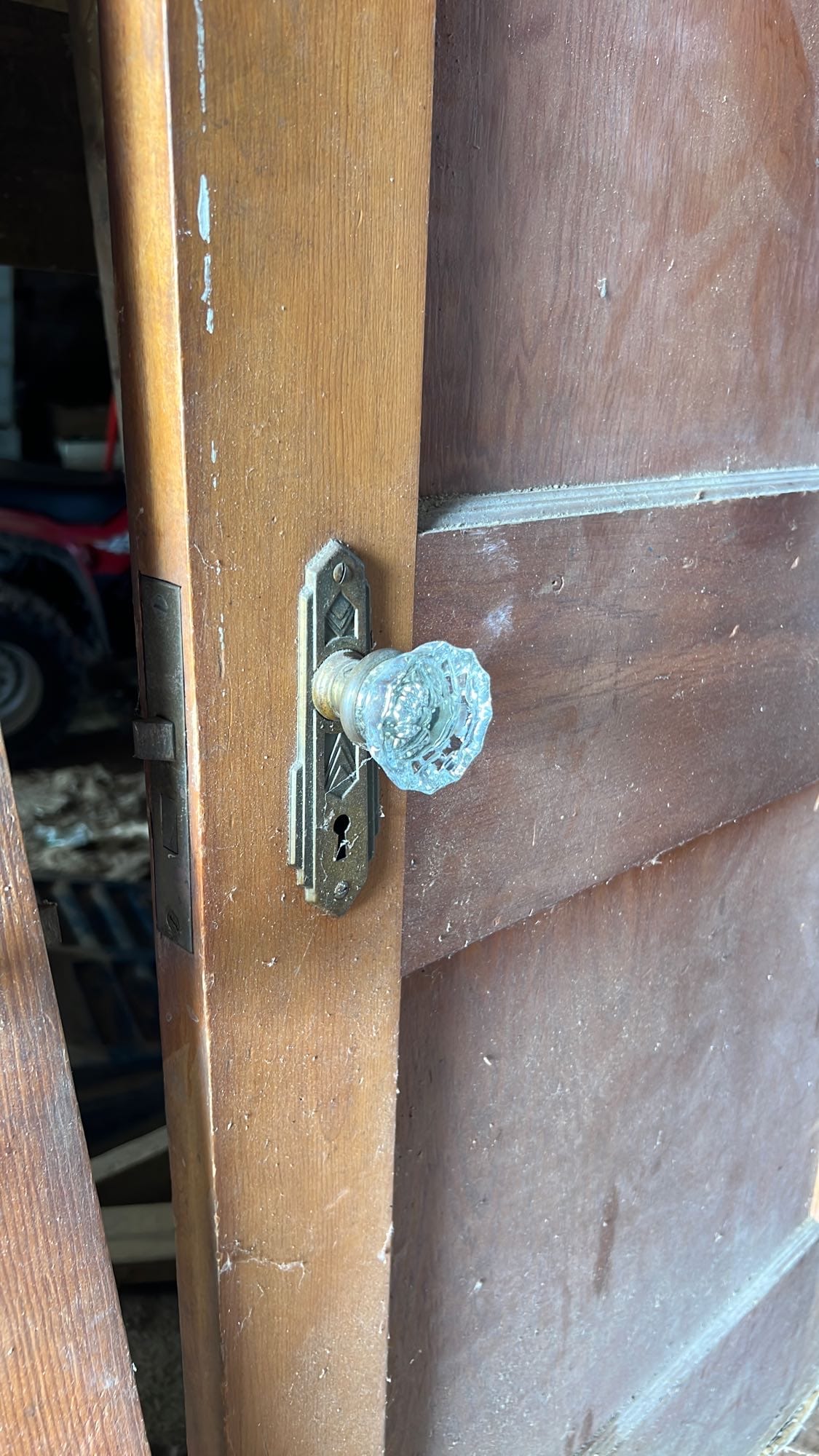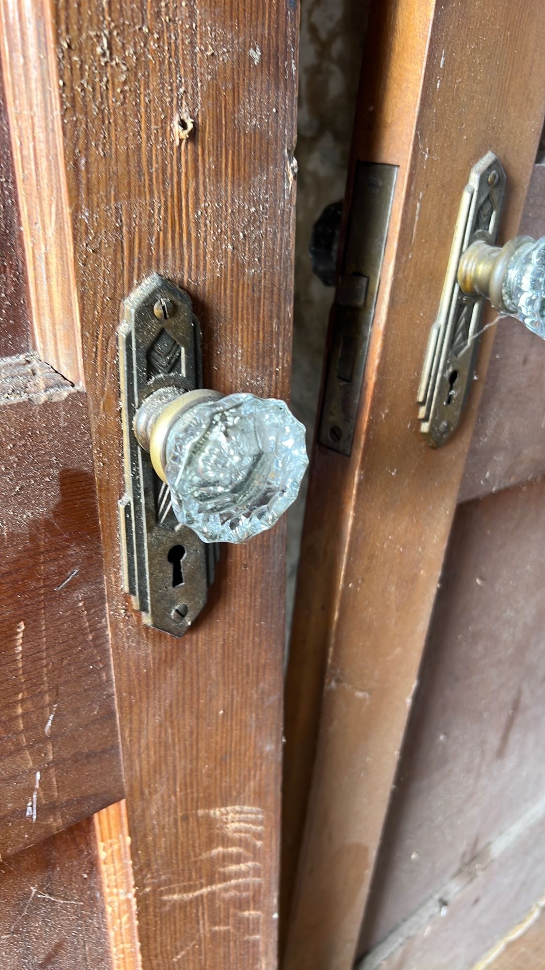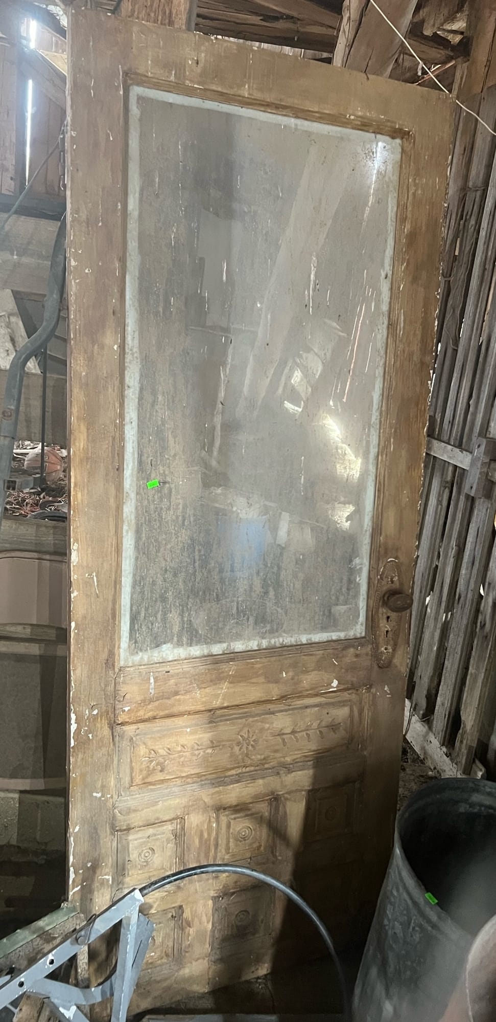 120 (3) Wood doors - 29”, 29.5”, 30” with vintage glass door knobs, White door panel, 18”x88.5”
