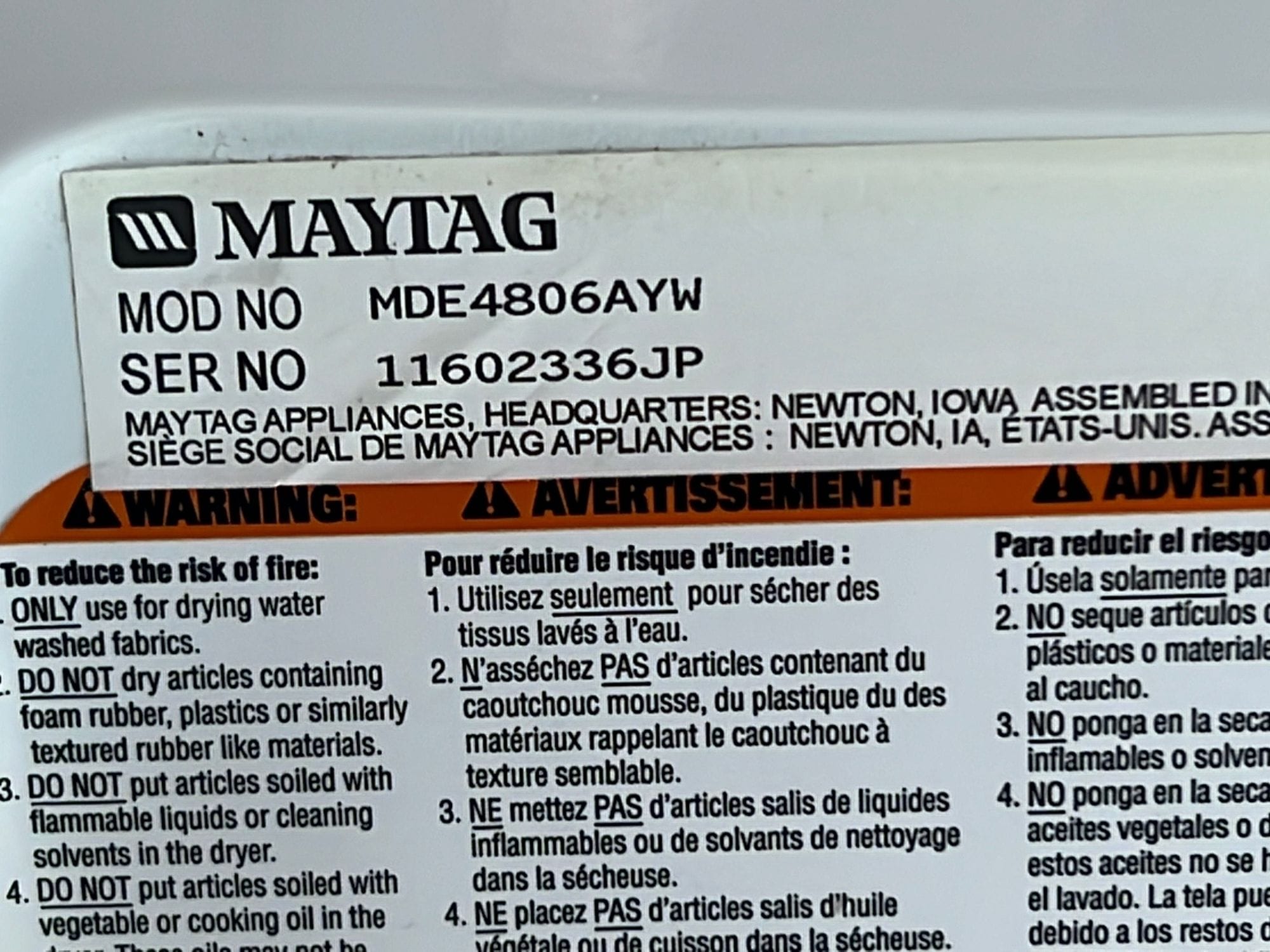 123 Maytag Dryer Heavy Duty • Super size Capacity • Quiet Series 200 / 12 Cycles • Elec. Series, Model #MDE4806AYW • Serial #11602336JP