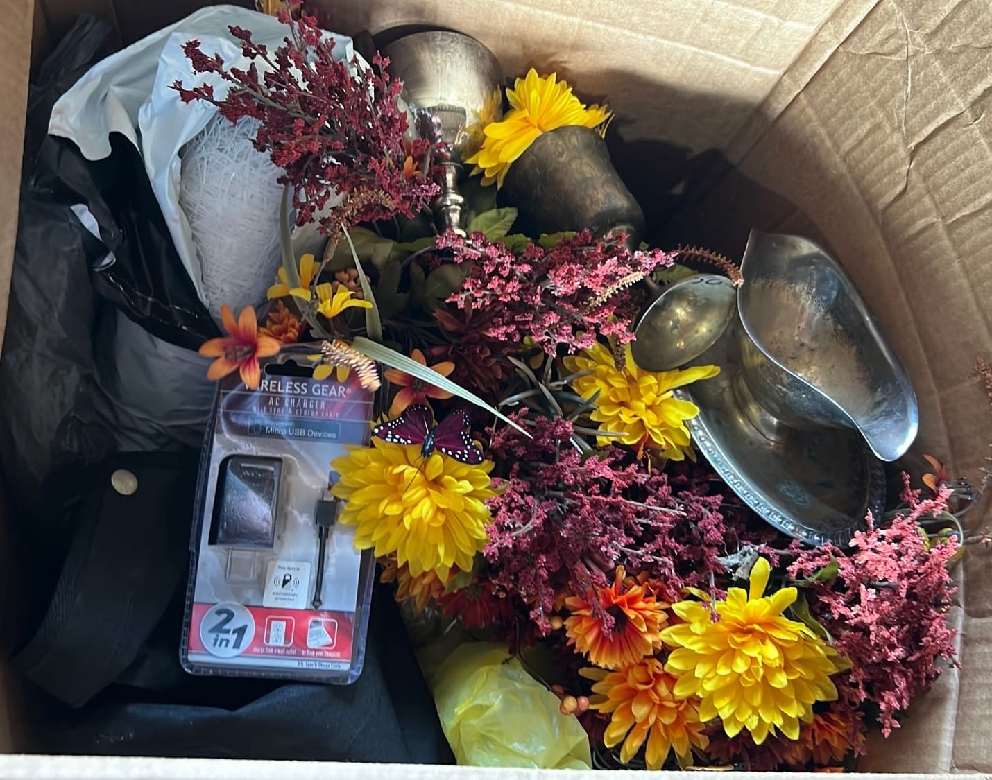 129 Wm. Rogers Gravy Boat •Raimond Silver Plate Italy Wine goblet & Artificial Flowers • Plastic Meshing (NIPKG) • Wireless Gear charger
