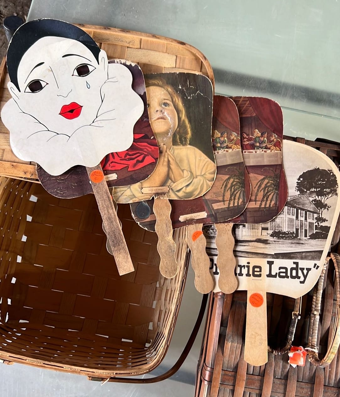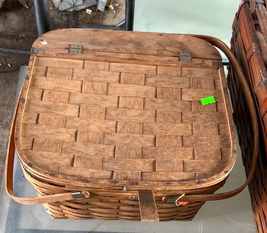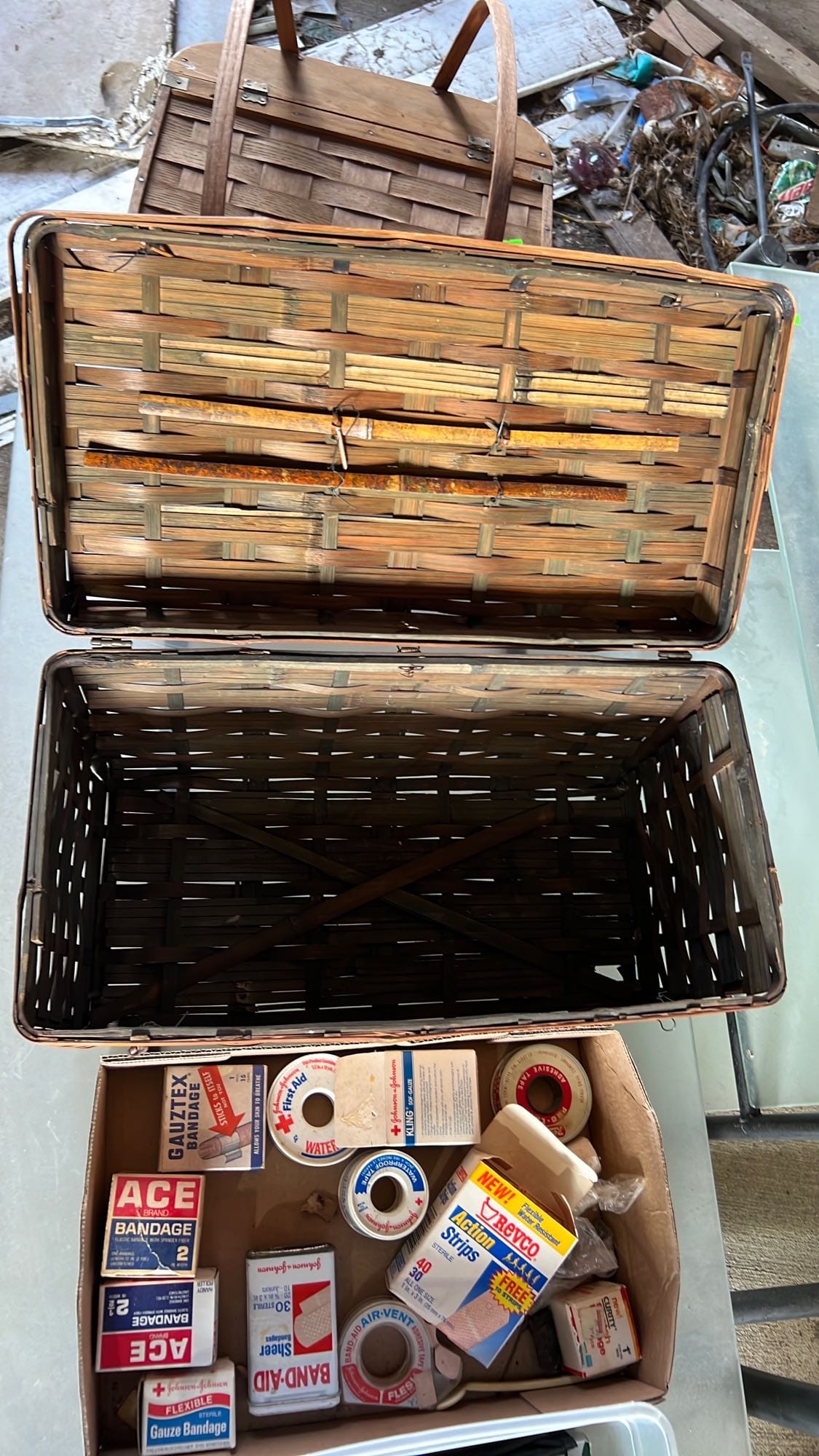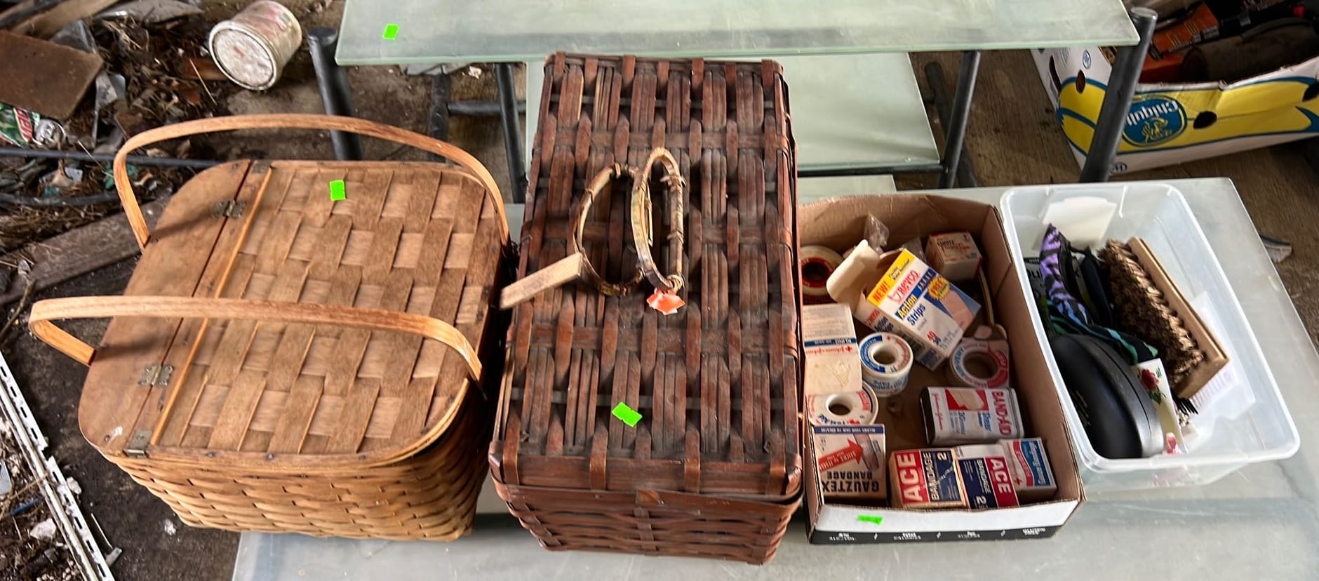 131 (2) Picnic Baskets & Advertisement Hand Fans - Williams Funeral Home Wolcottville IN. 13”x7.5”x12.5”, 19”x8.5”x10” & Natural Stone Jewelry (necklace & earrings), Brush, Thermometer, Ace bandage assortment