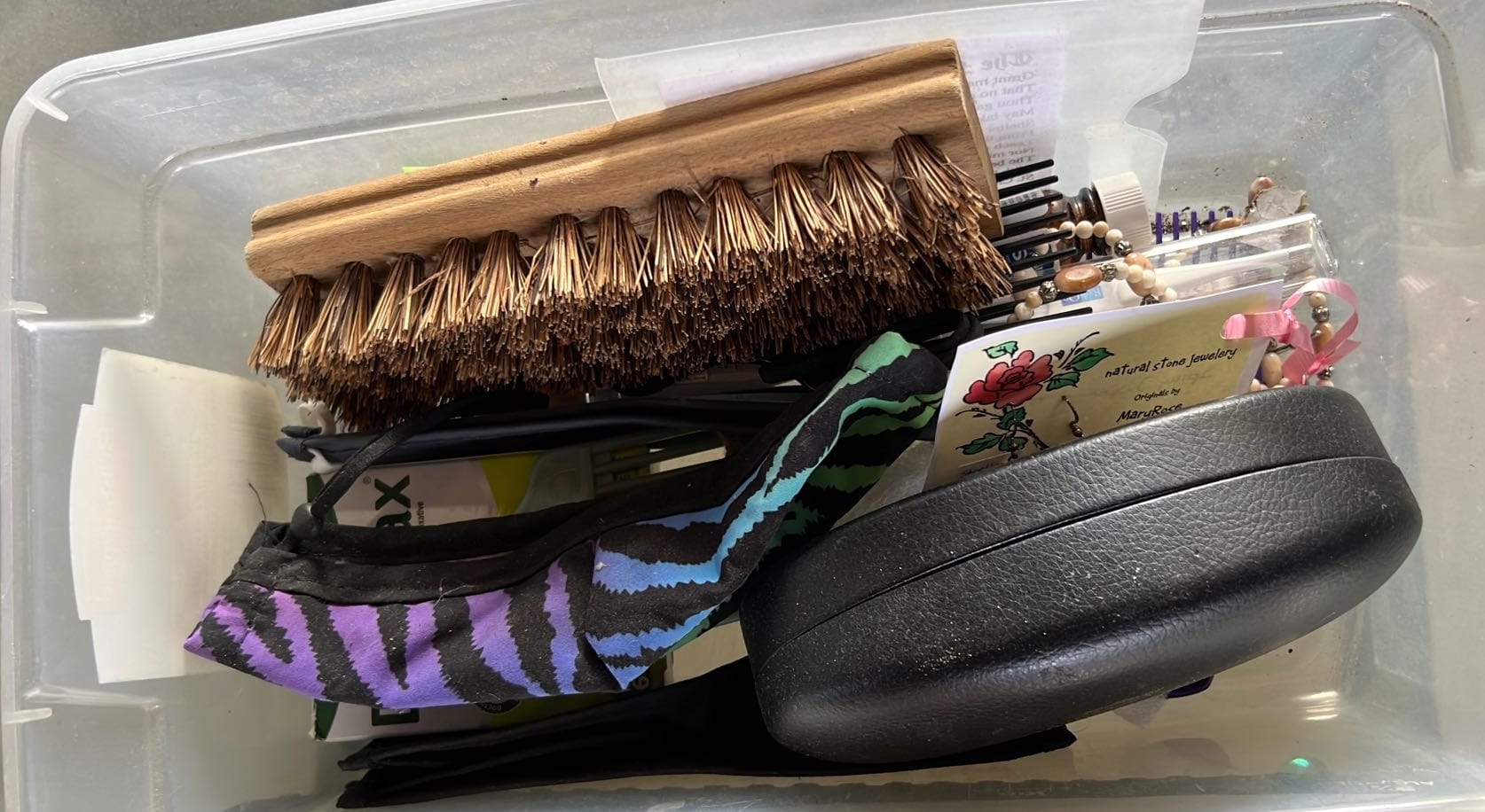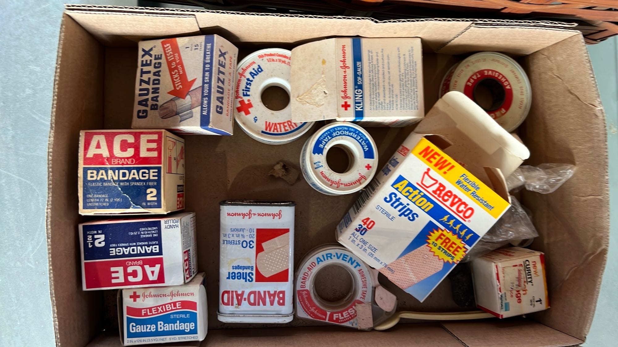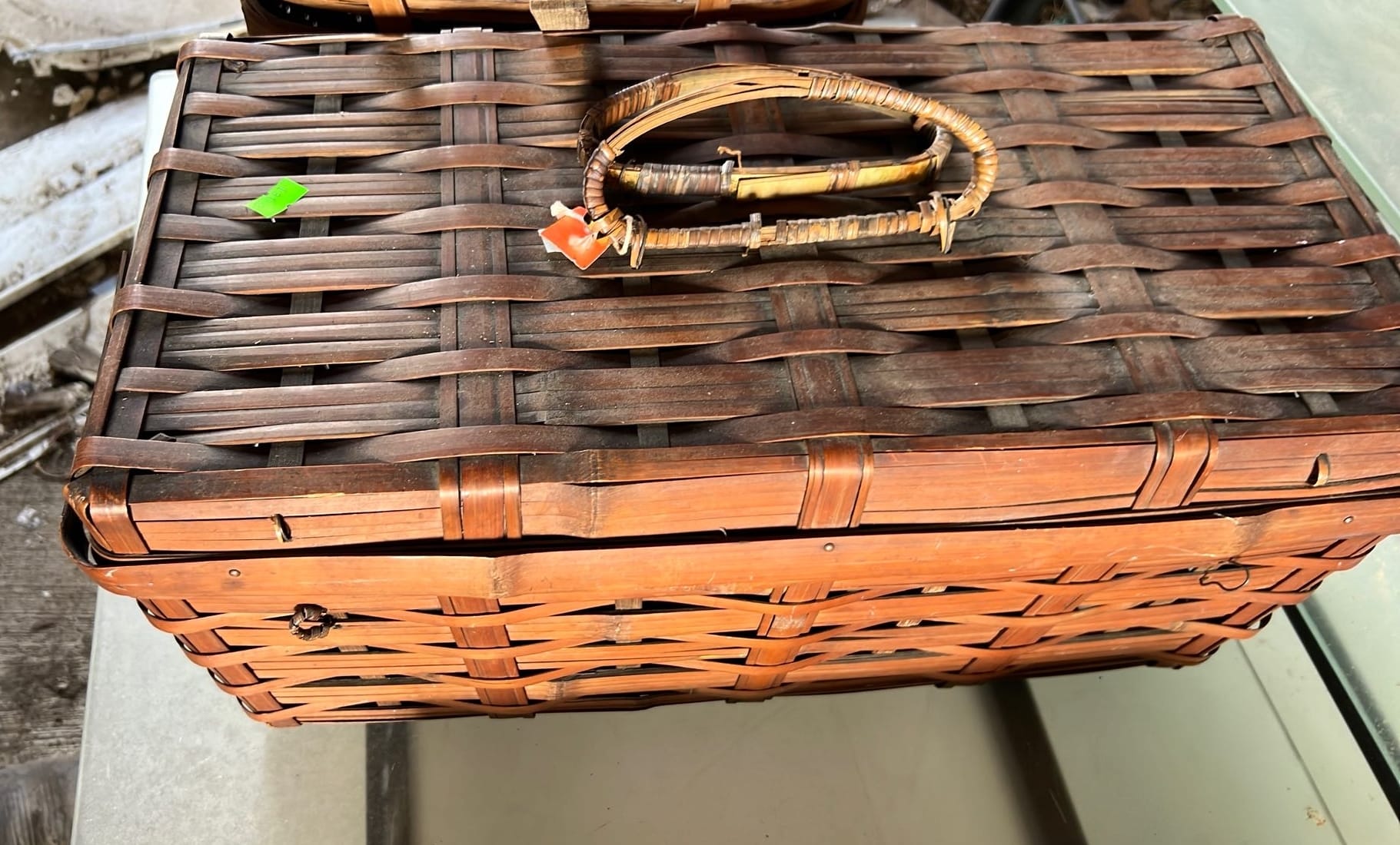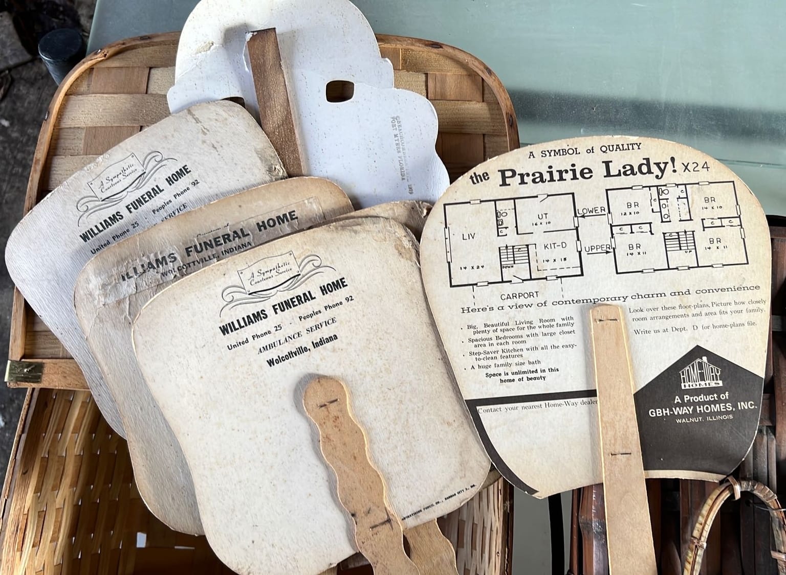 131 (2) Picnic Baskets & Advertisement Hand Fans - Williams Funeral Home Wolcottville IN. 13”x7.5”x12.5”, 19”x8.5”x10” & Natural Stone Jewelry (necklace & earrings), Brush, Thermometer, Ace bandage assortment