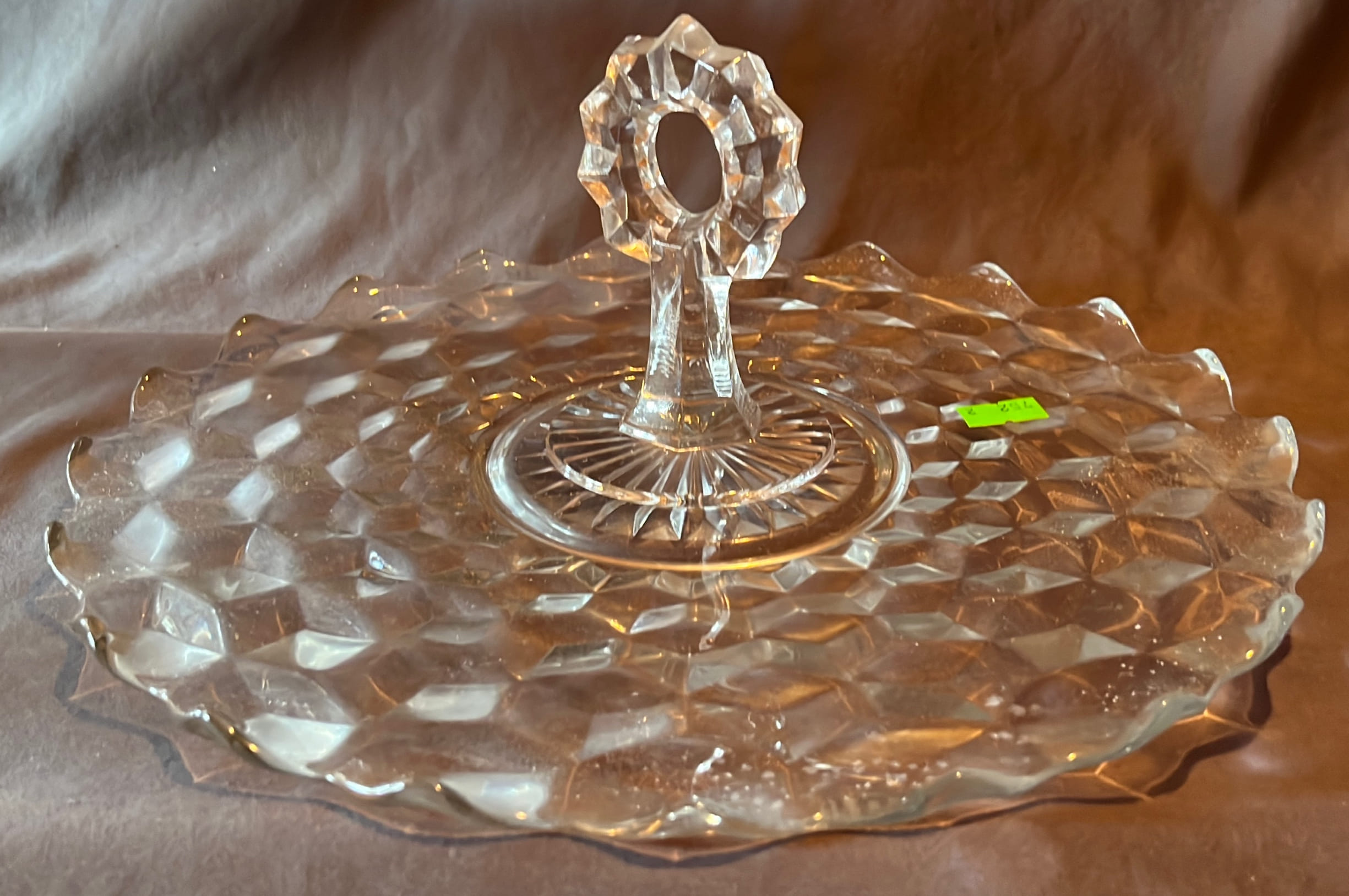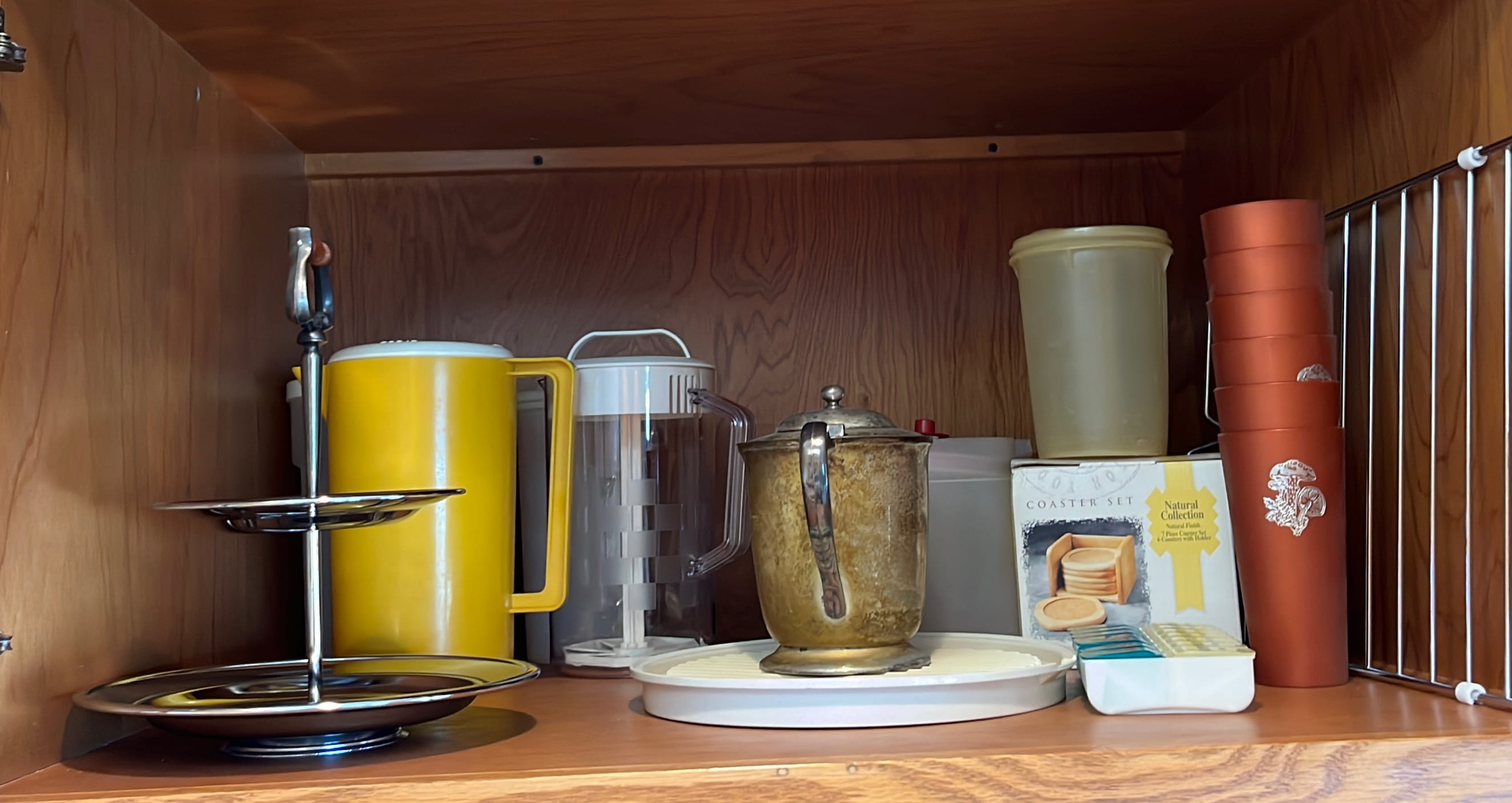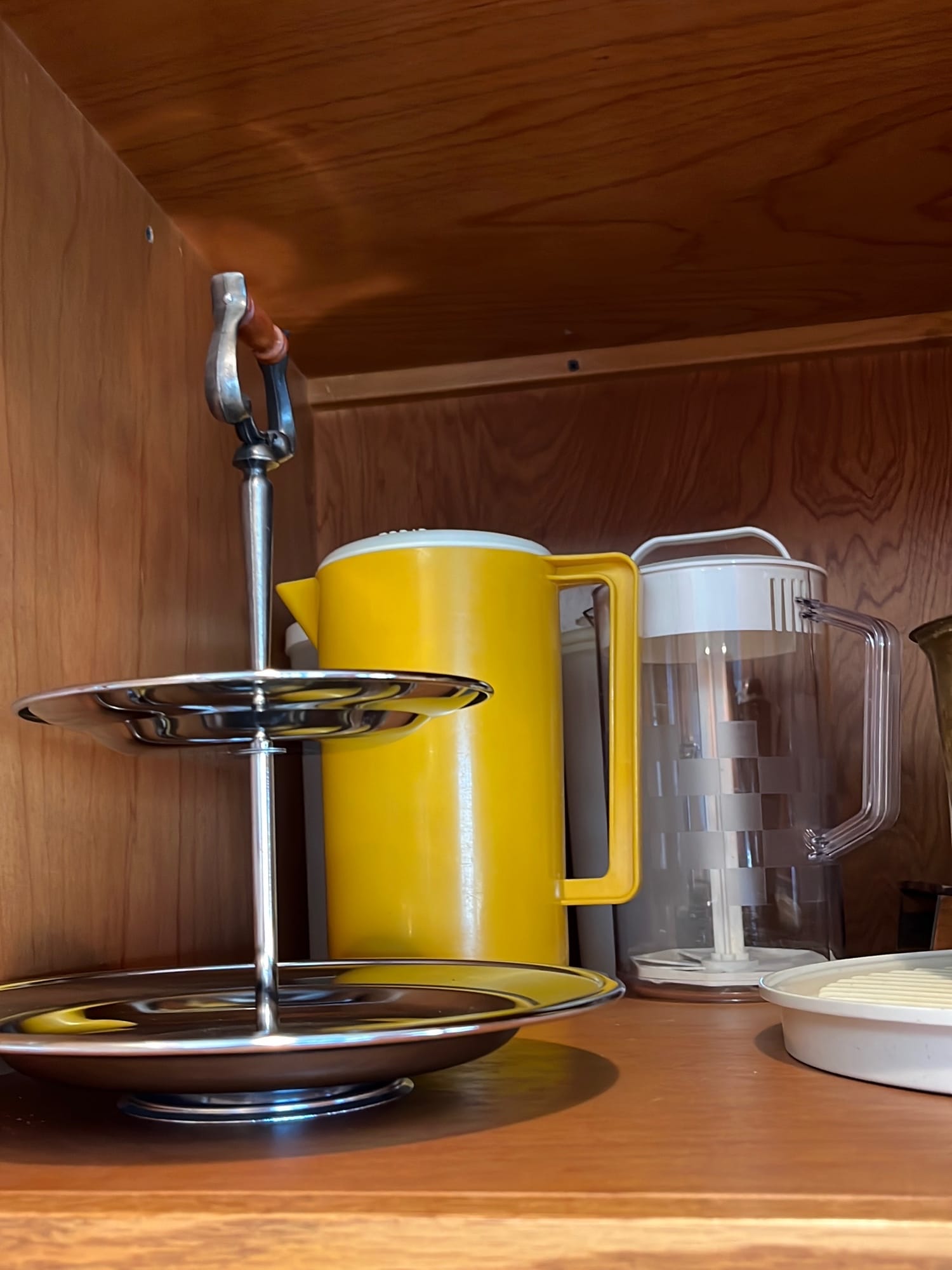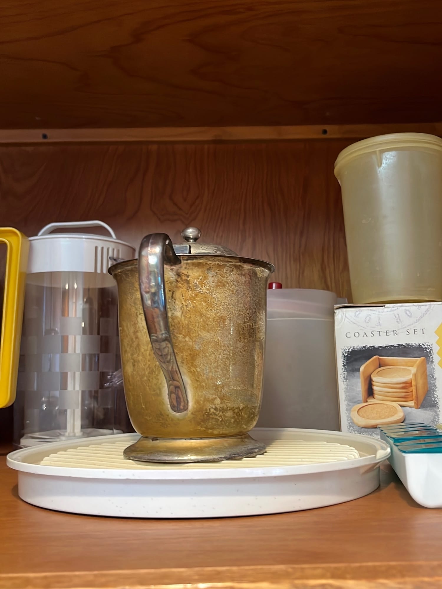 225 Silverplate pitcher, tiered server, plastic pitchers contents of cabinet as shown in pictures
