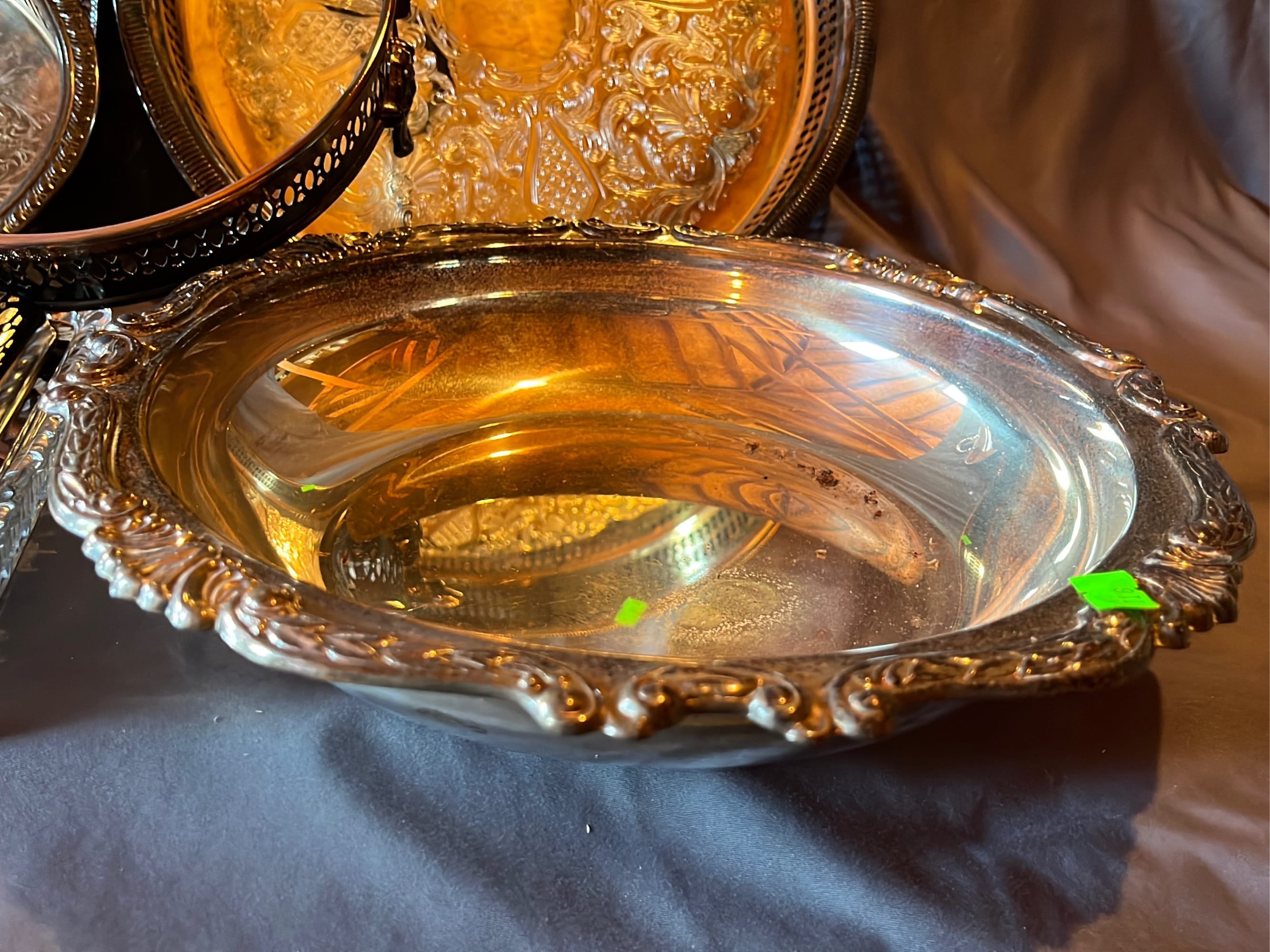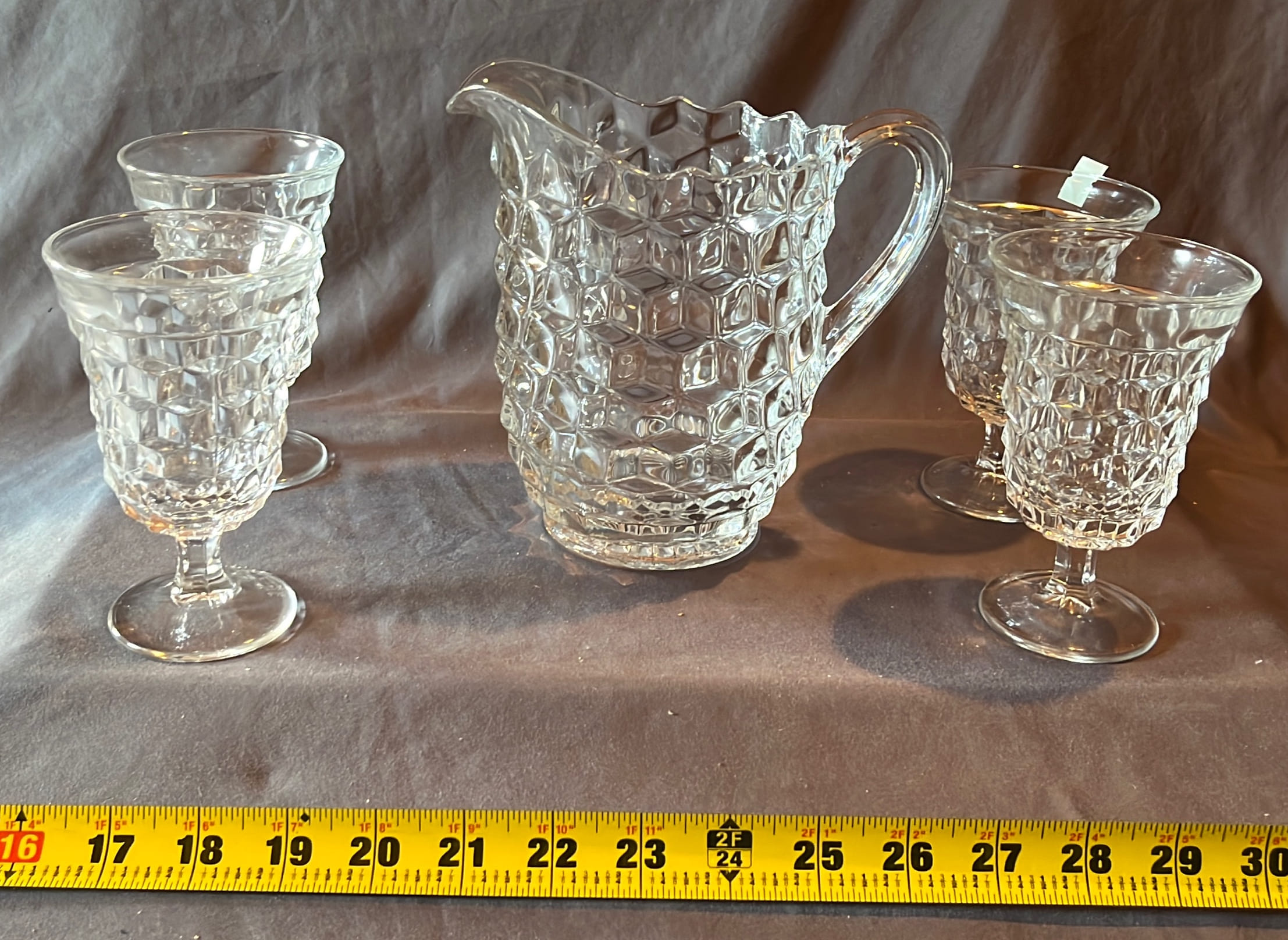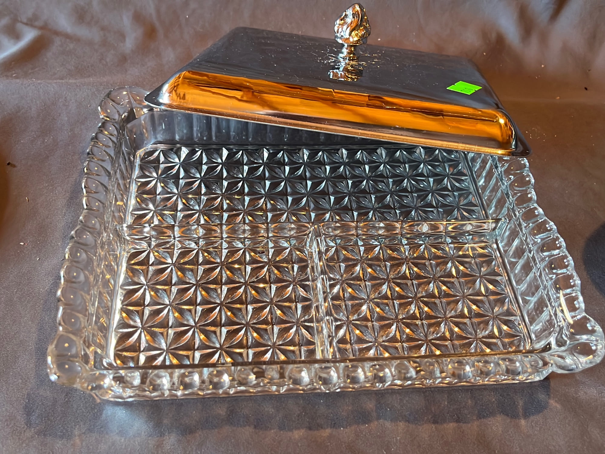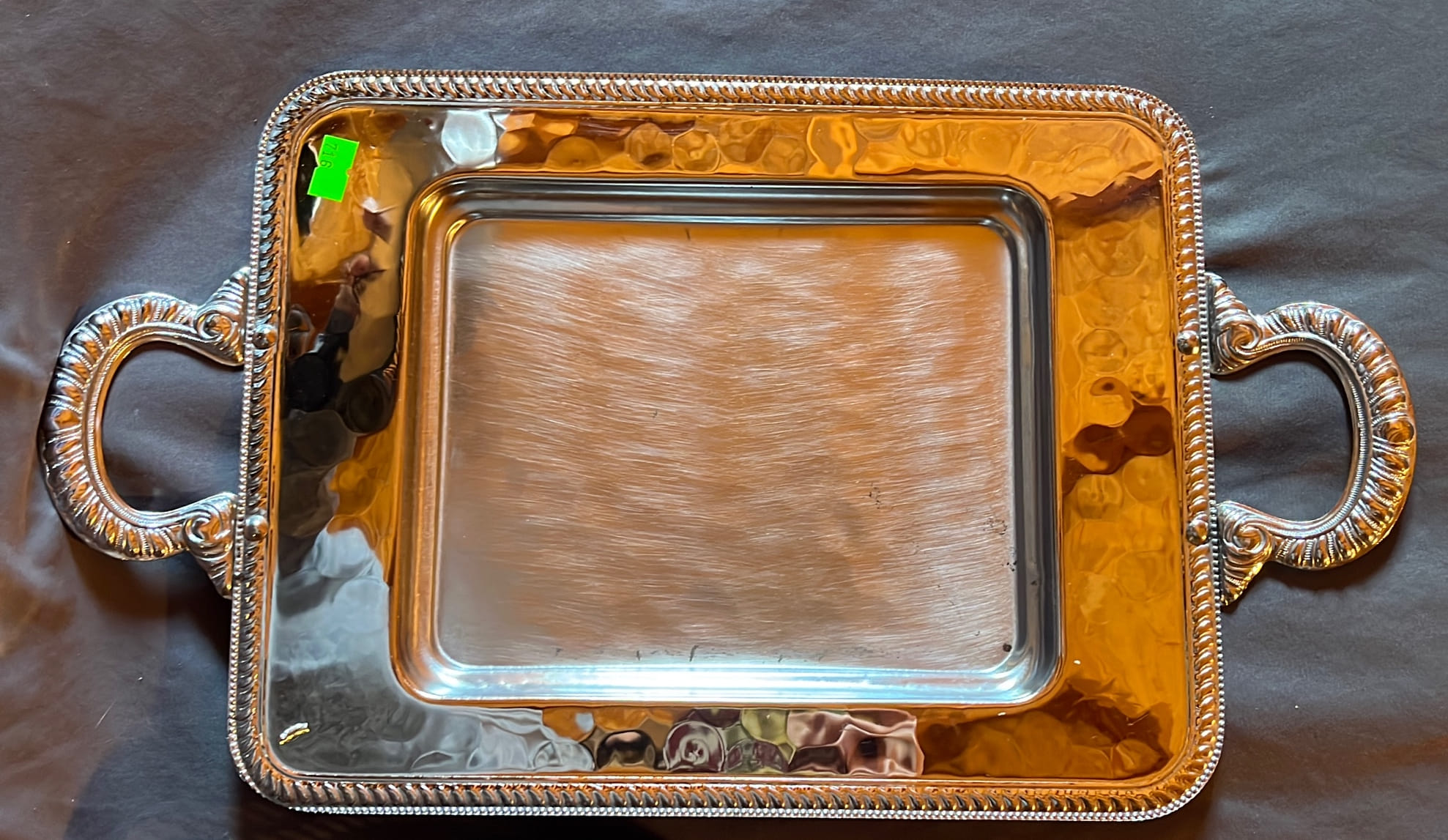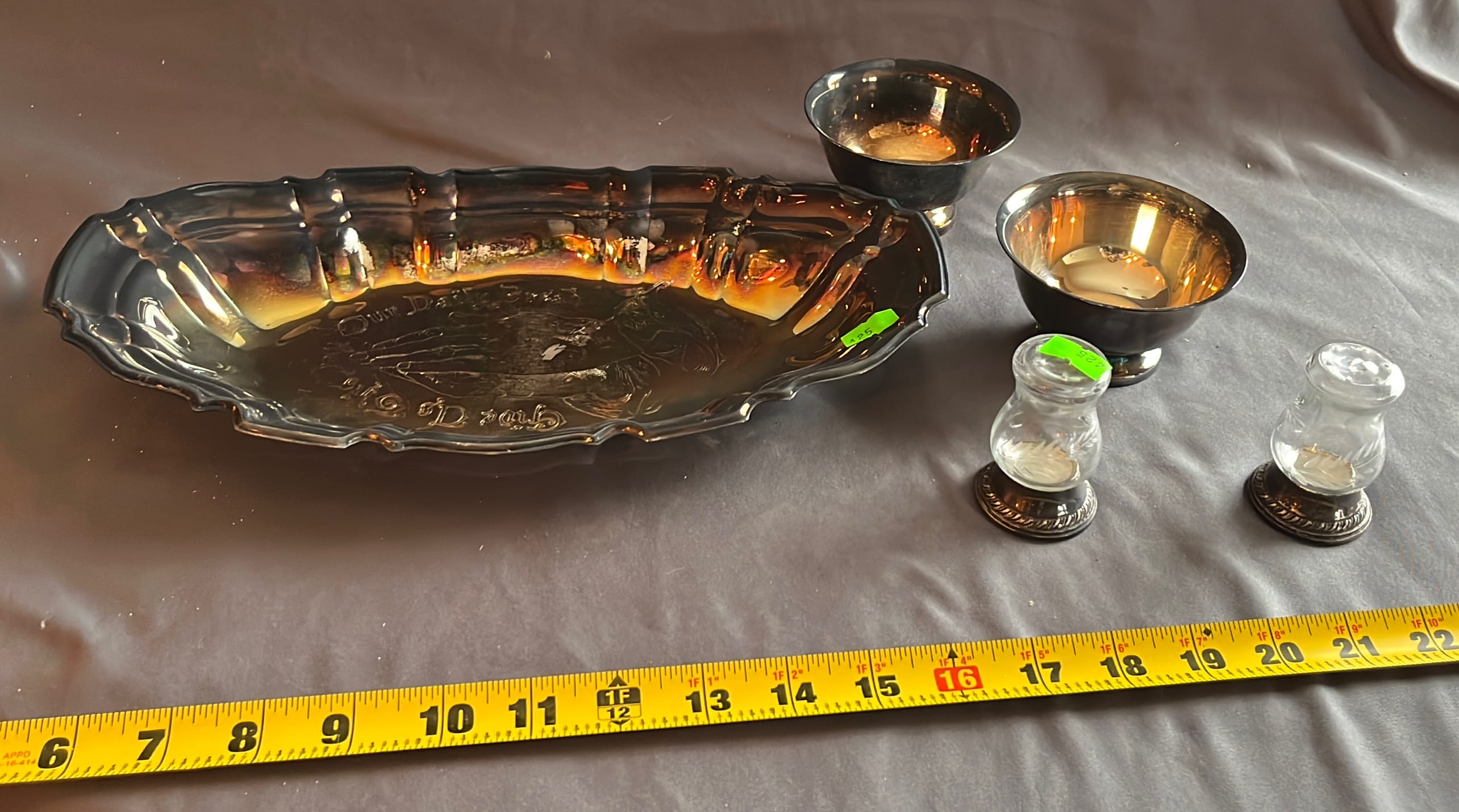 225 Silverplate pitcher, tiered server, plastic pitchers contents of cabinet as shown in pictures