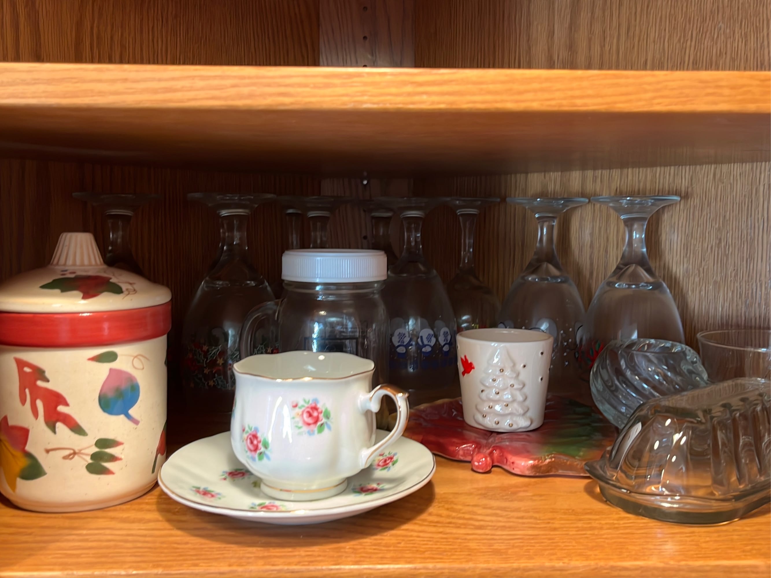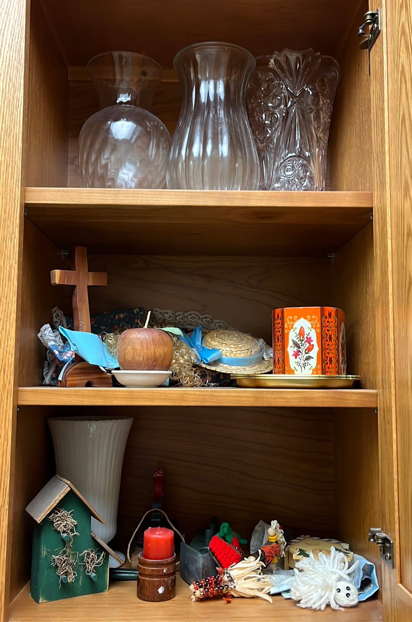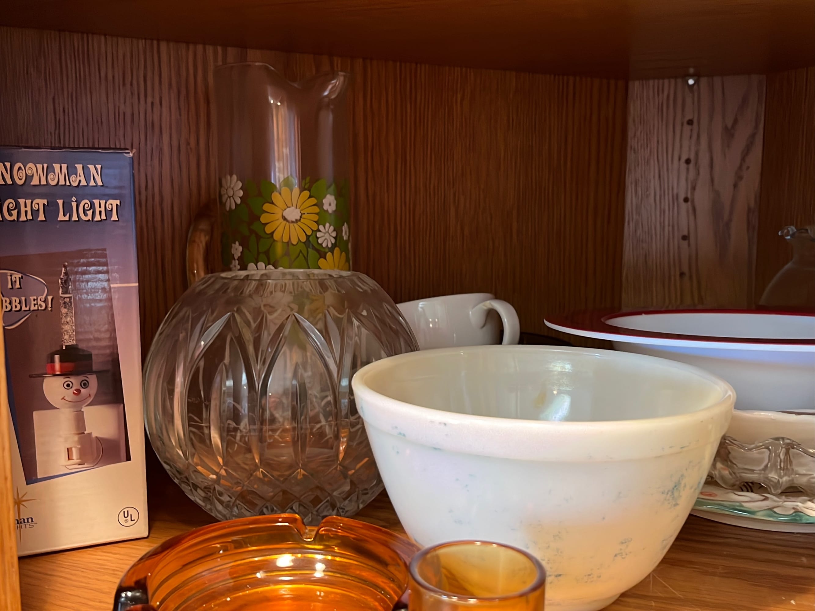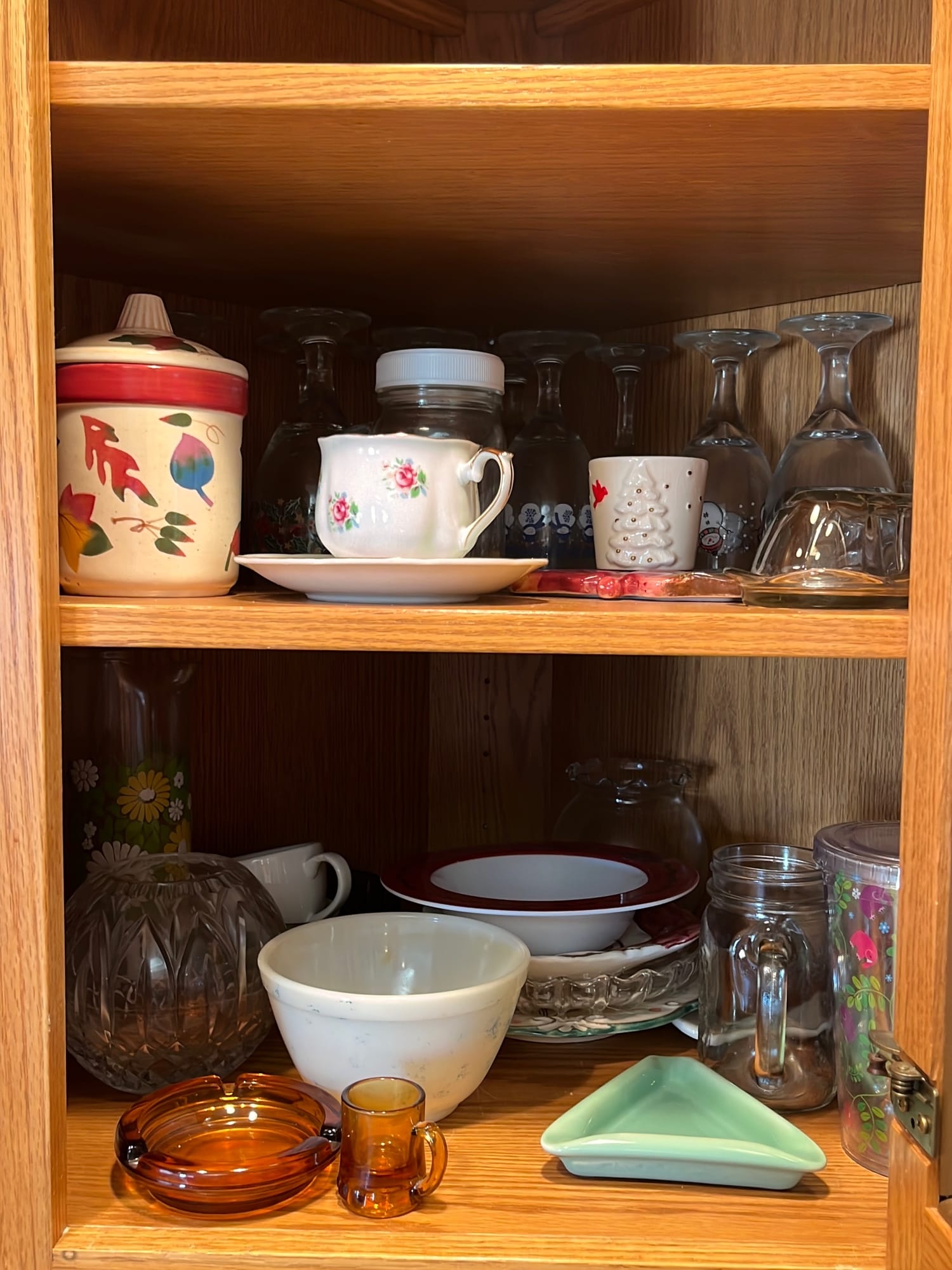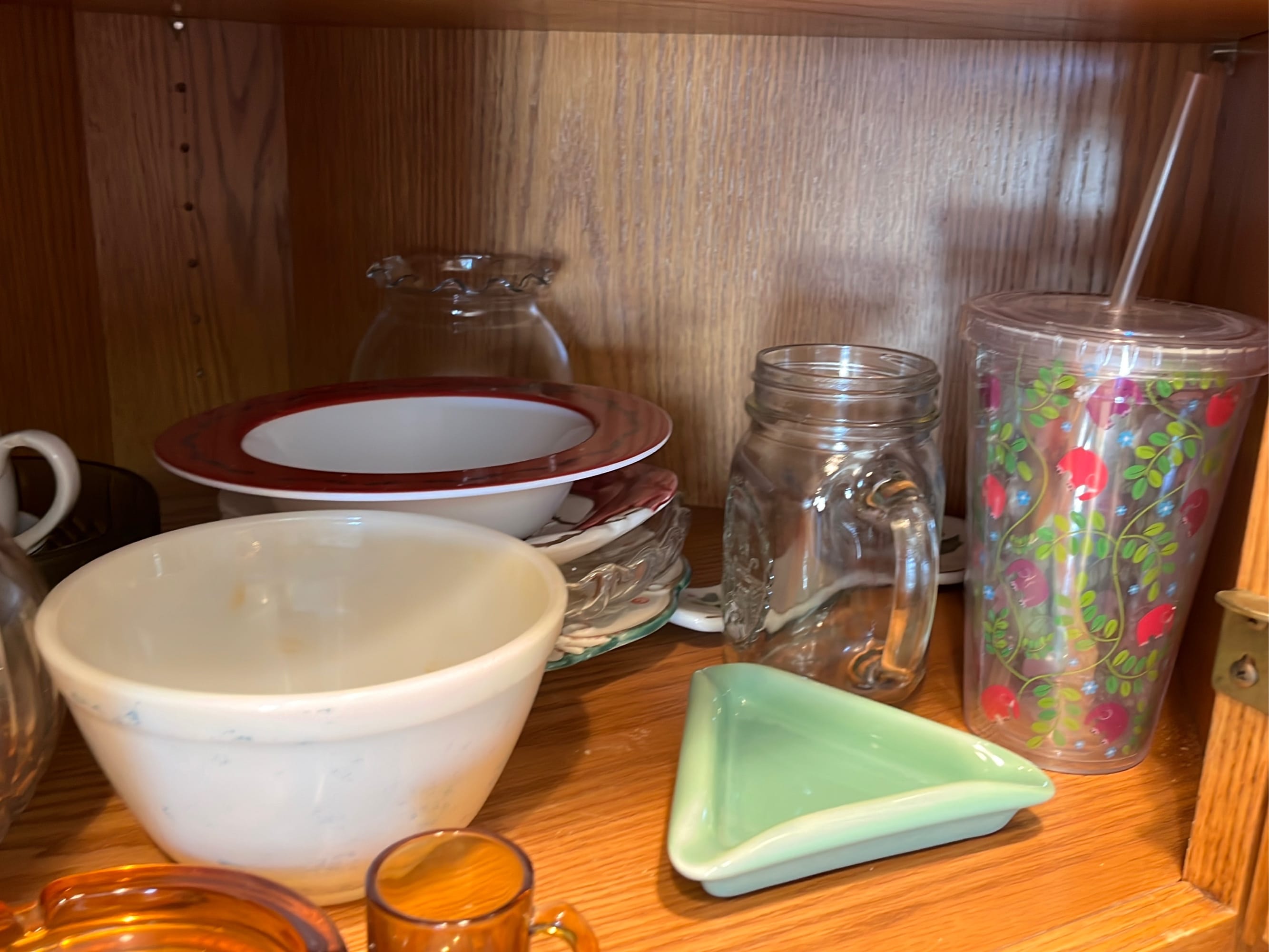 210 Glassware assortment, pyrex blue bowl color is worn away, cut glass rose bowl, contents of cabinet as shown in pictures