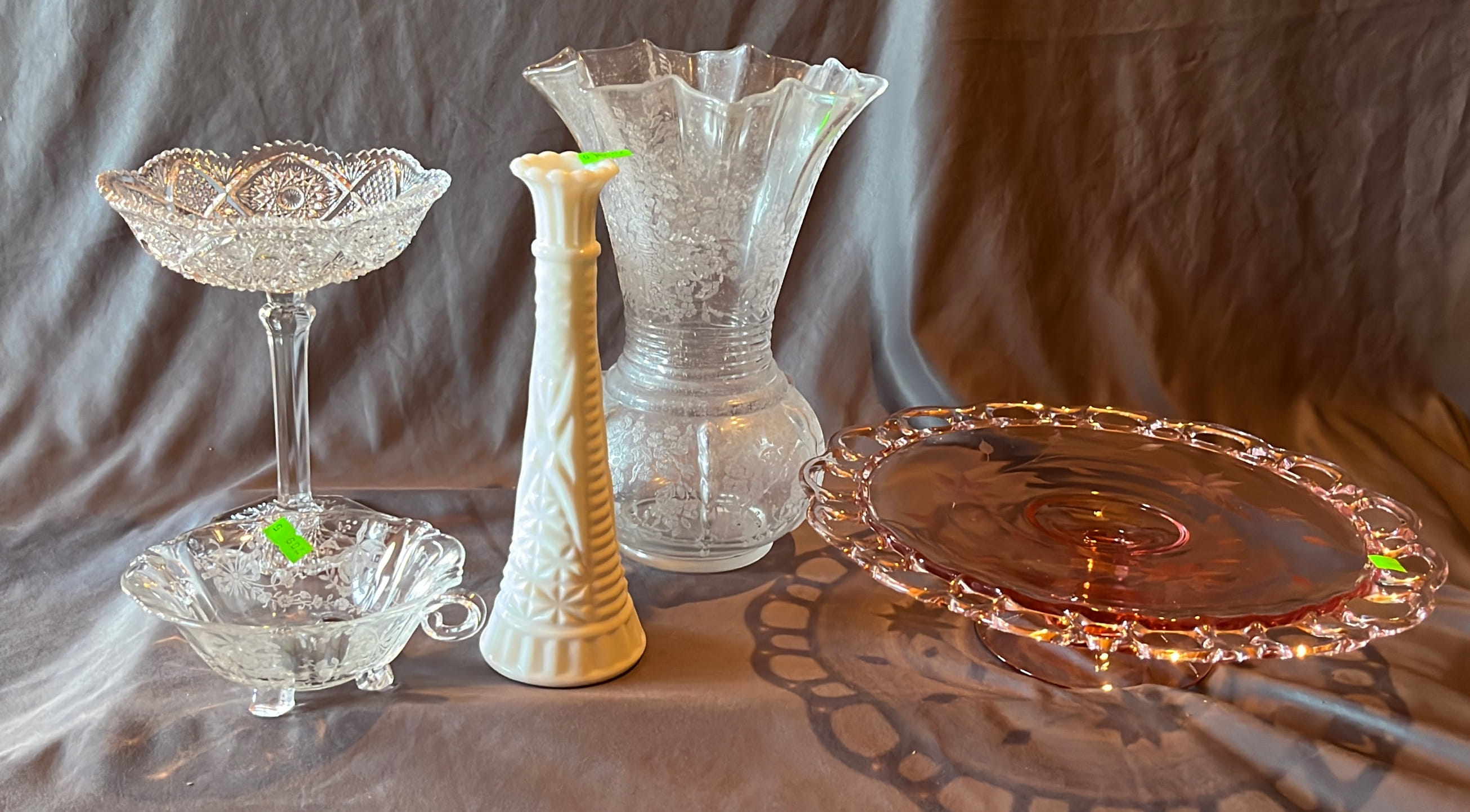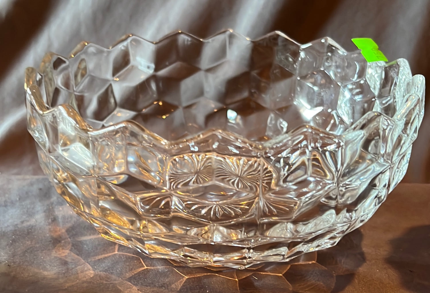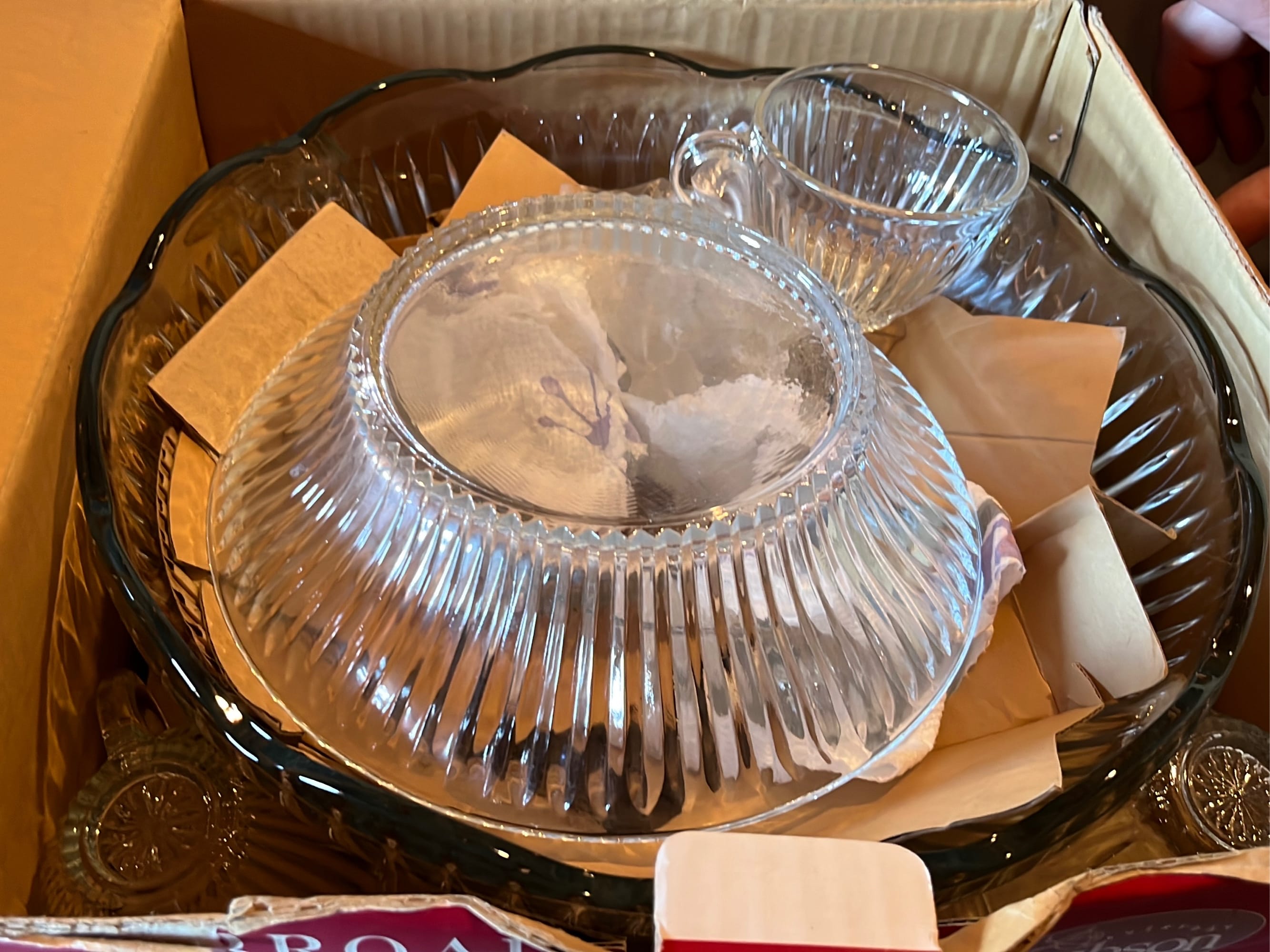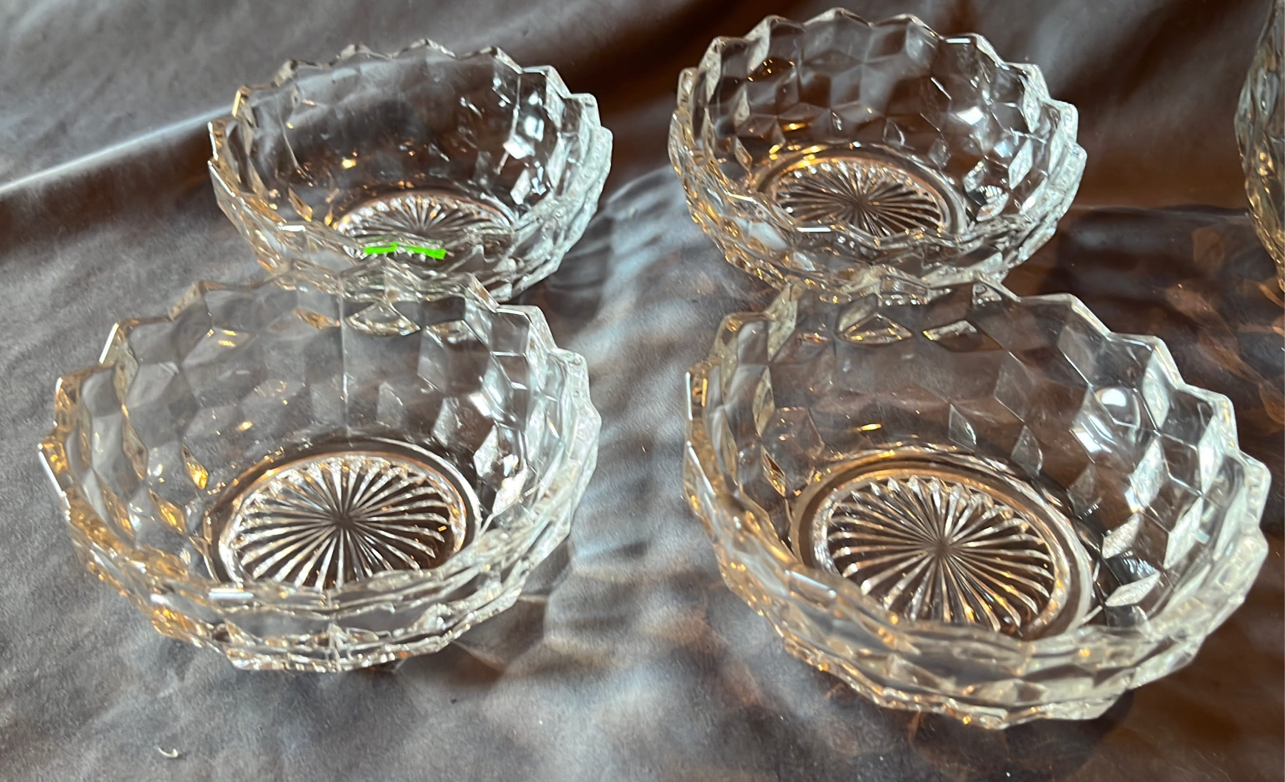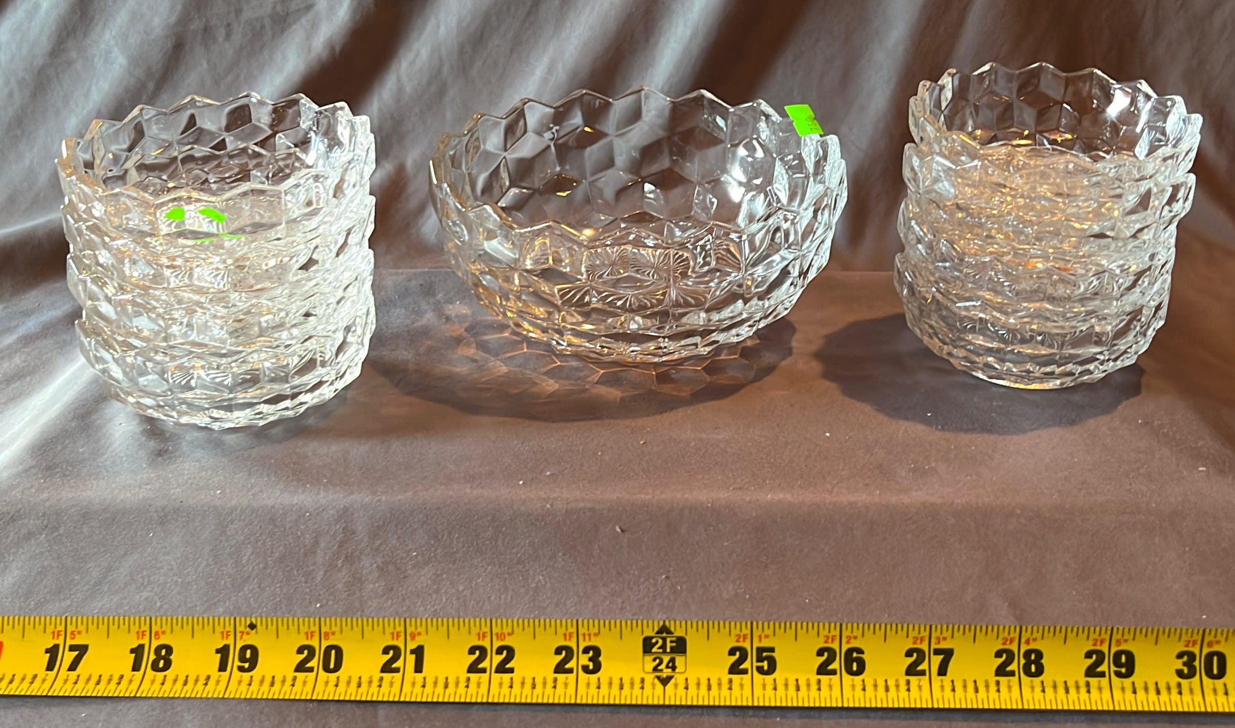 210 Glassware assortment, pyrex blue bowl color is worn away, cut glass rose bowl, contents of cabinet as shown in pictures