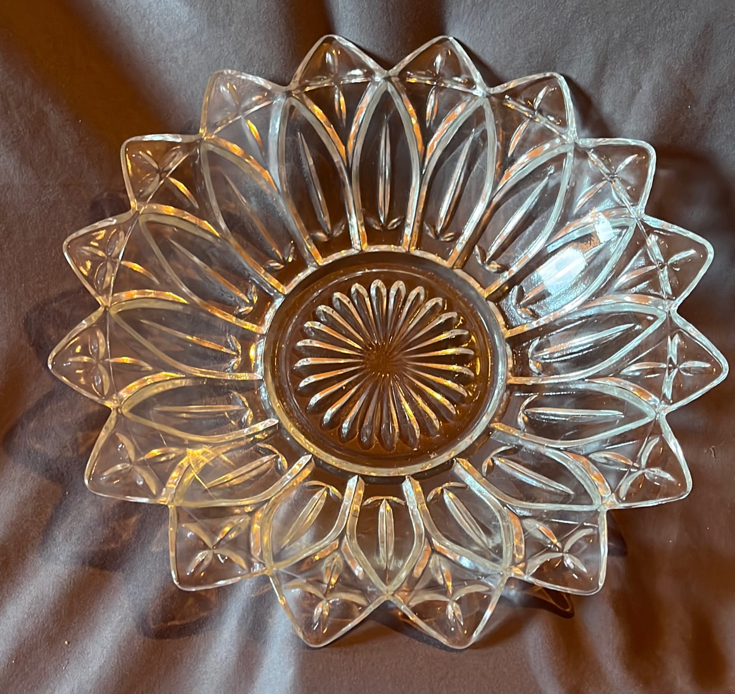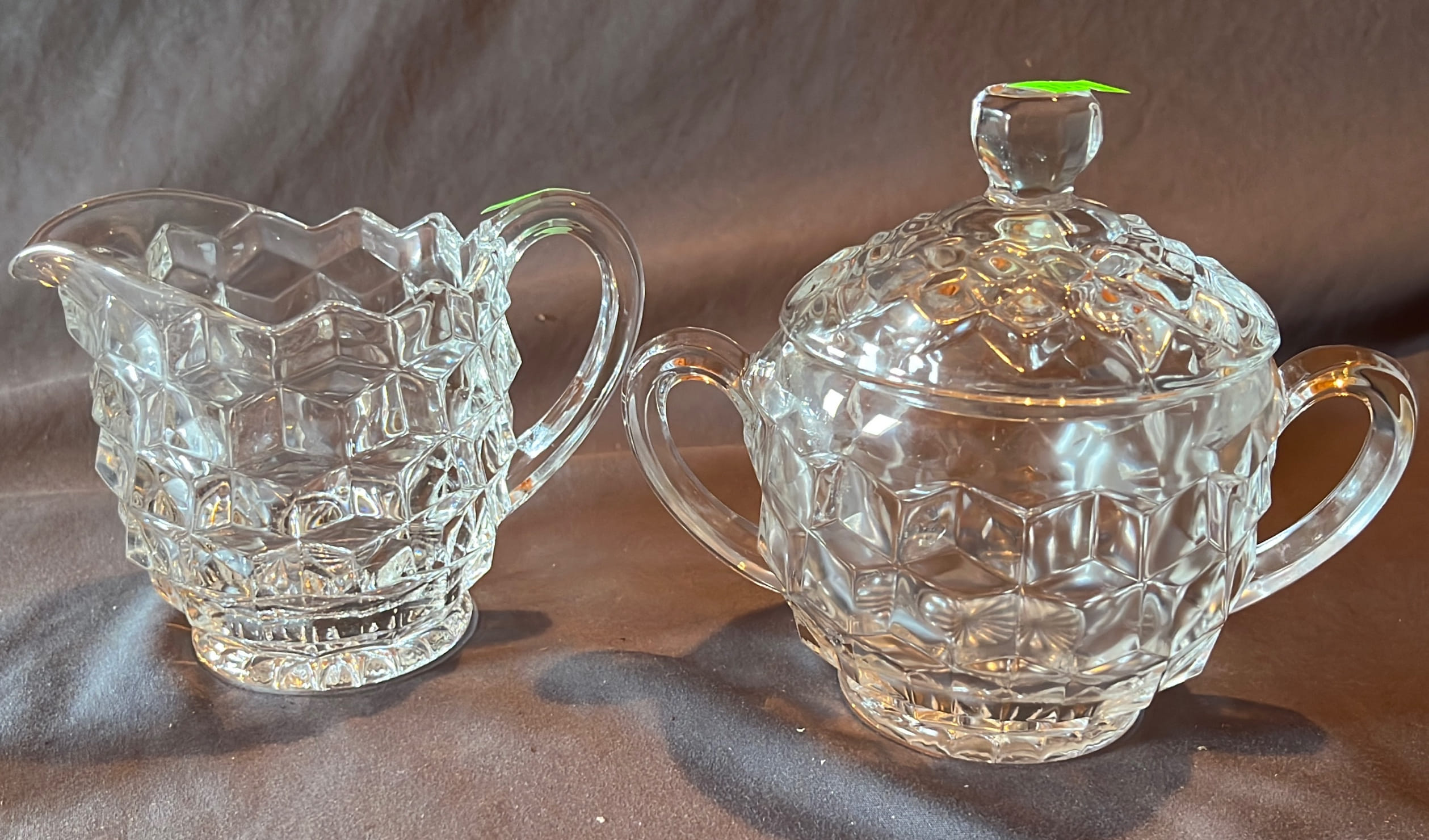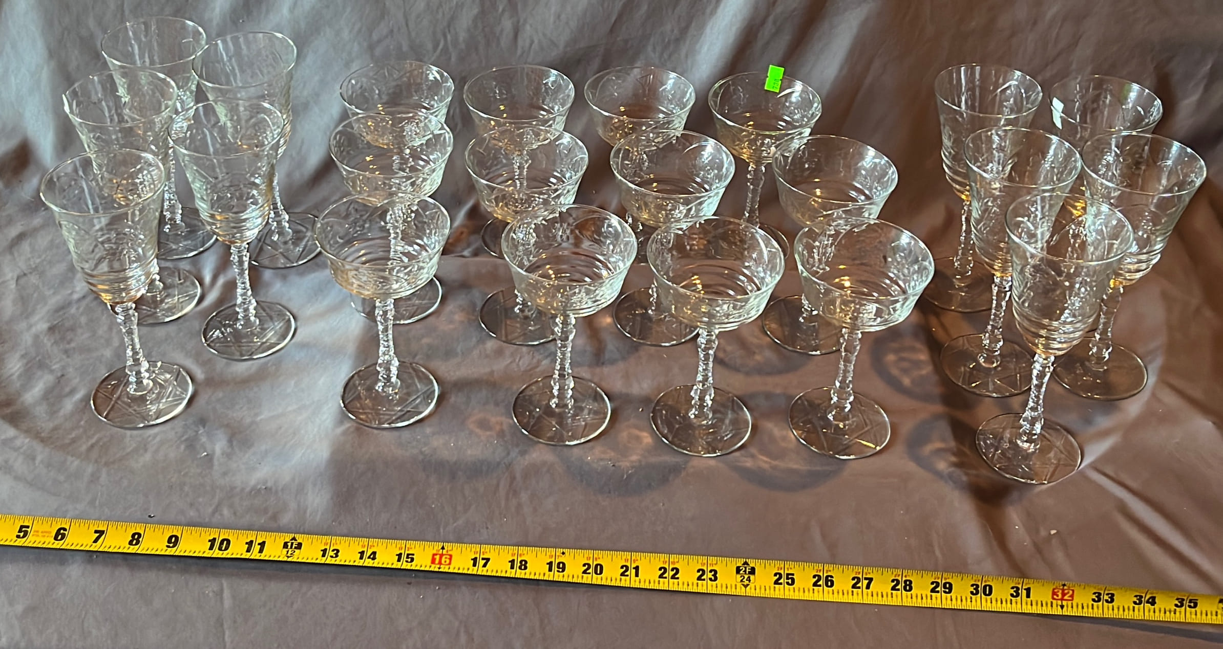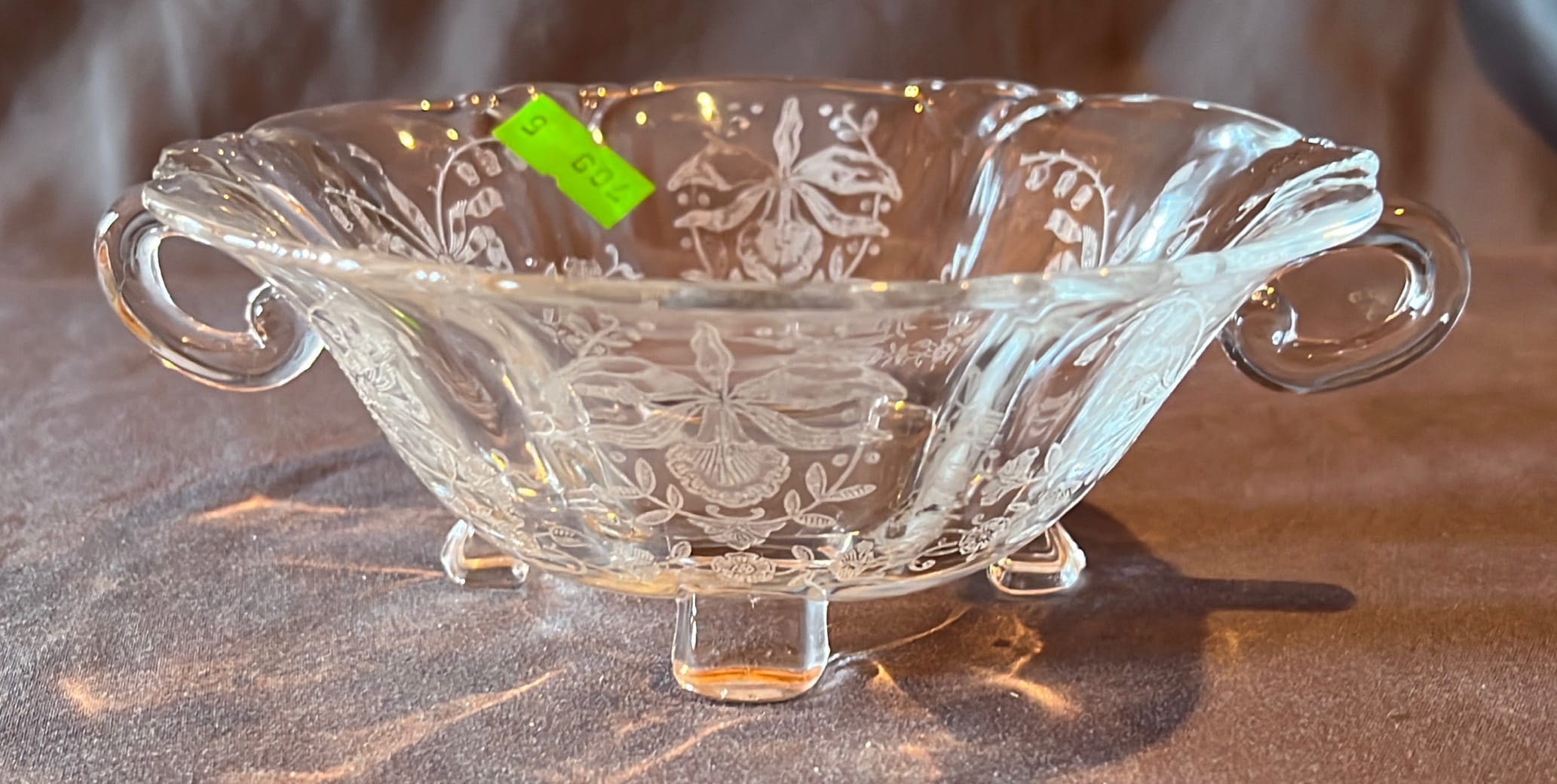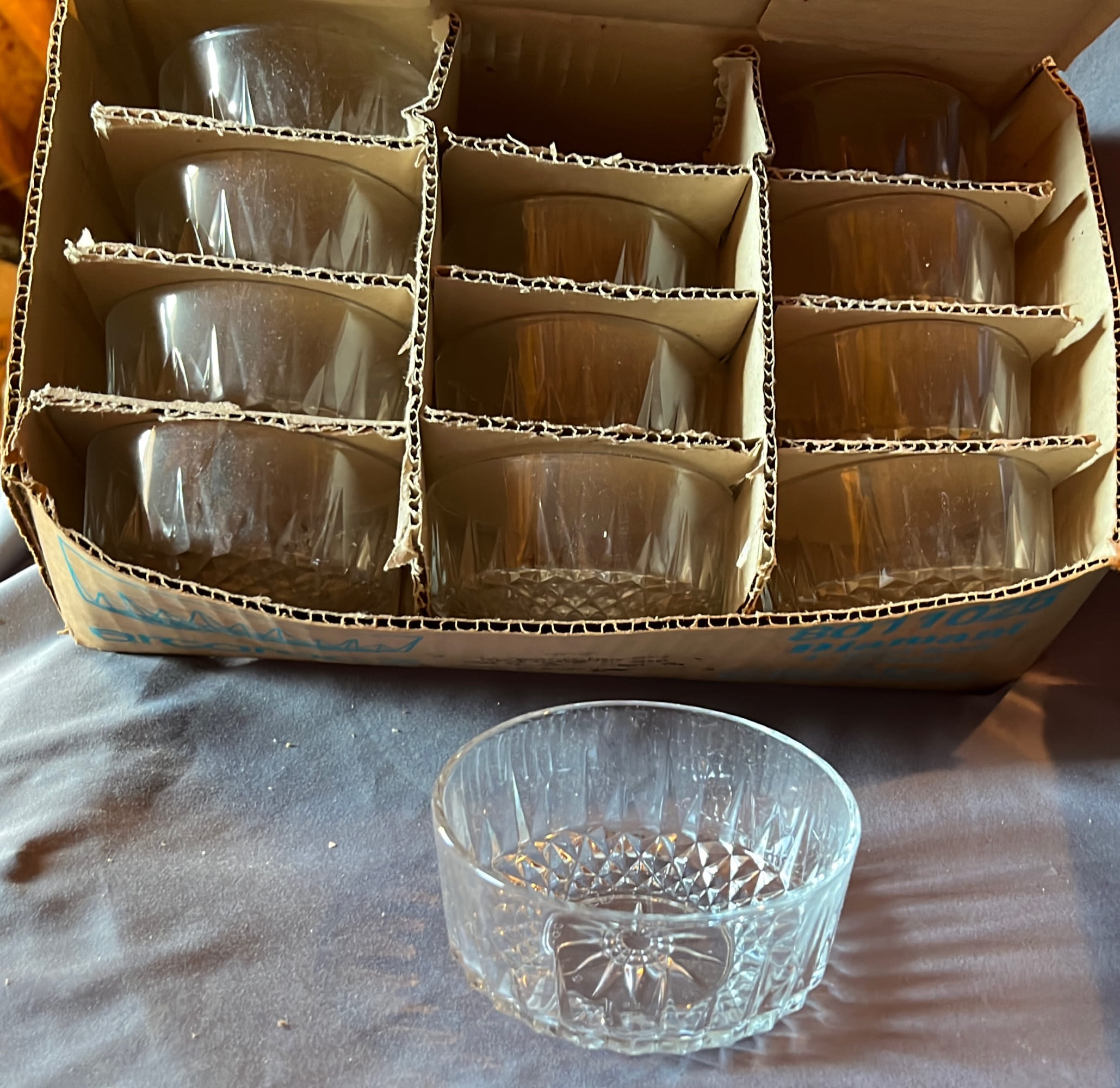 210 Glassware assortment, pyrex blue bowl color is worn away, cut glass rose bowl, contents of cabinet as shown in pictures