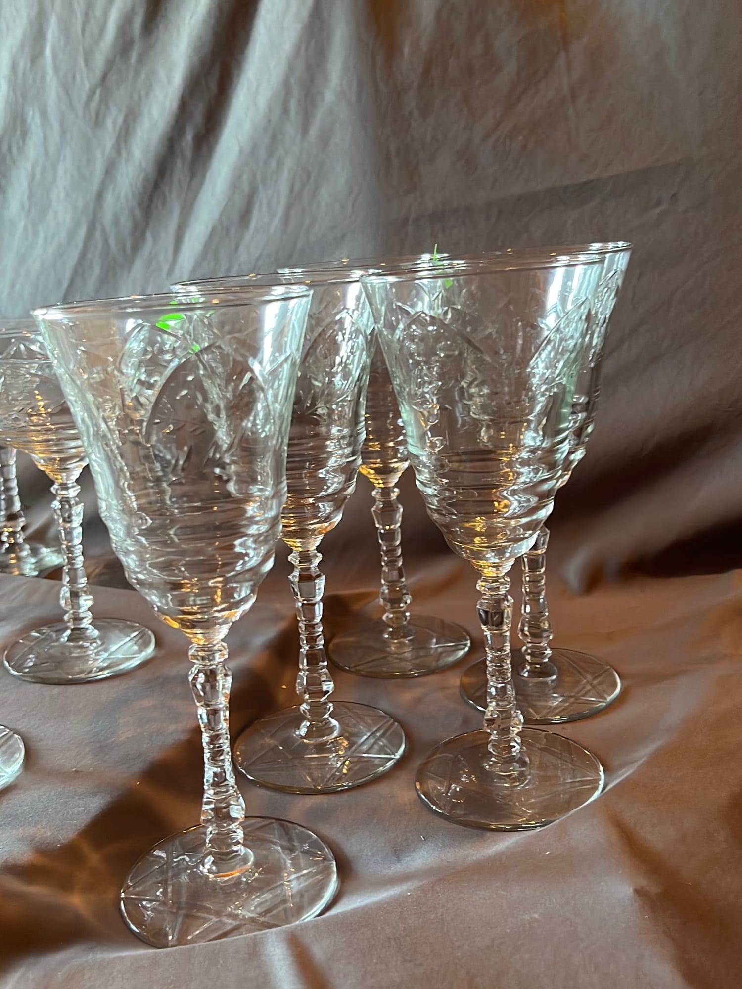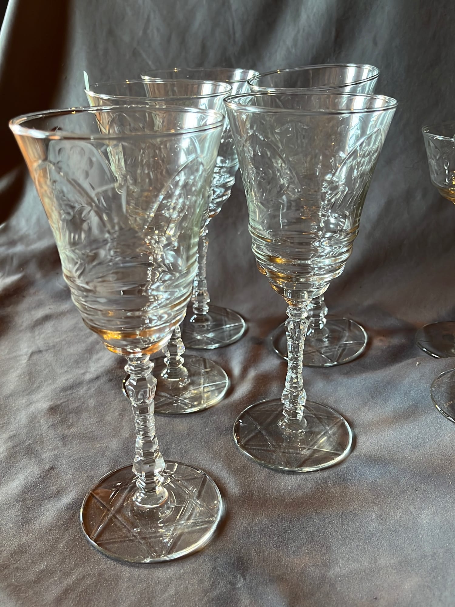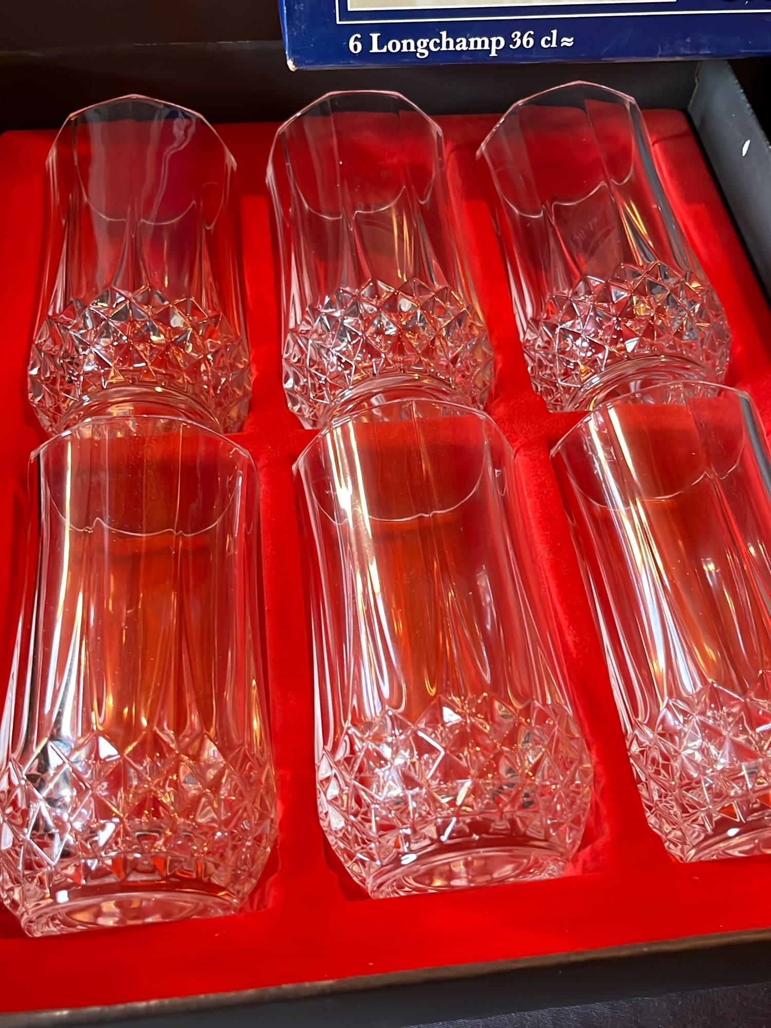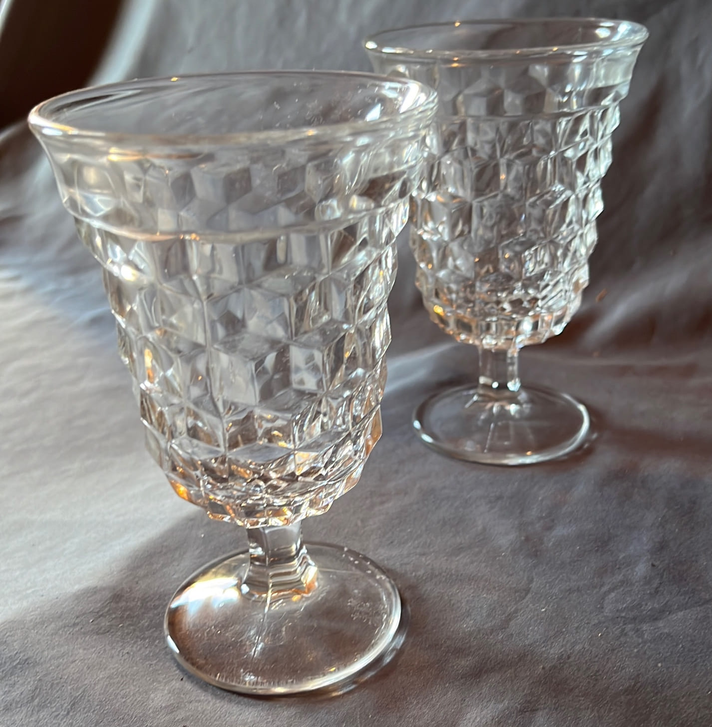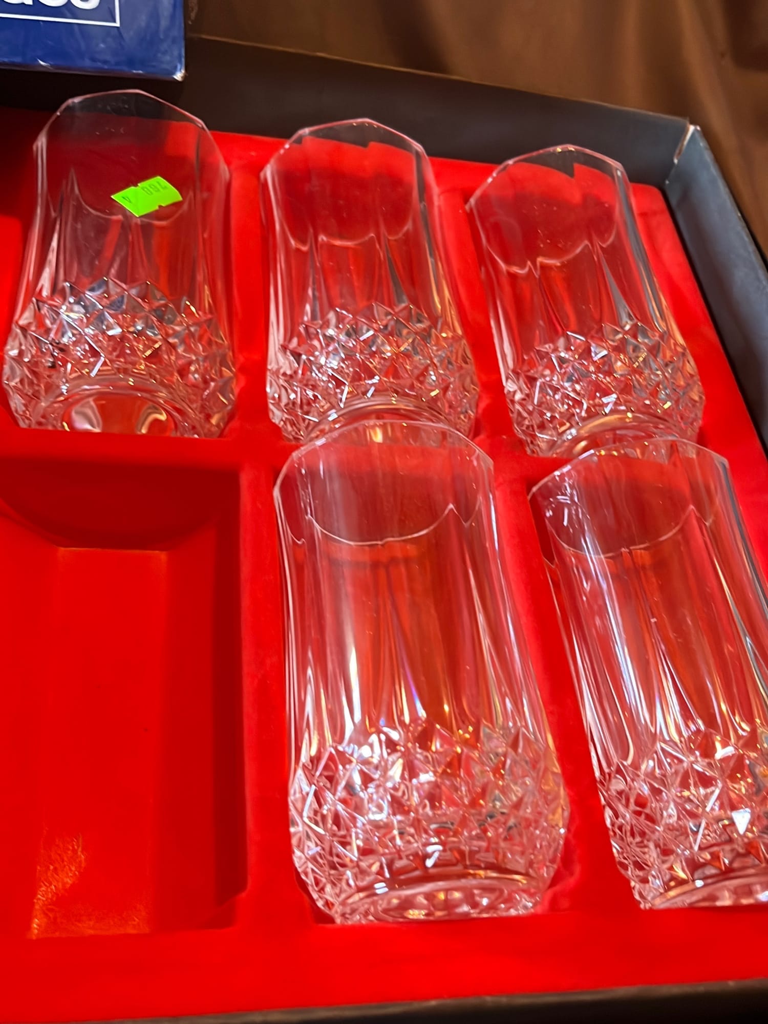 210 Glassware assortment, pyrex blue bowl color is worn away, cut glass rose bowl, contents of cabinet as shown in pictures
