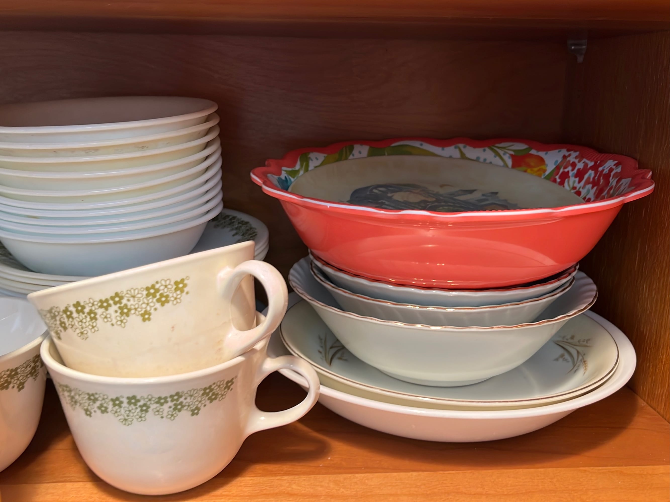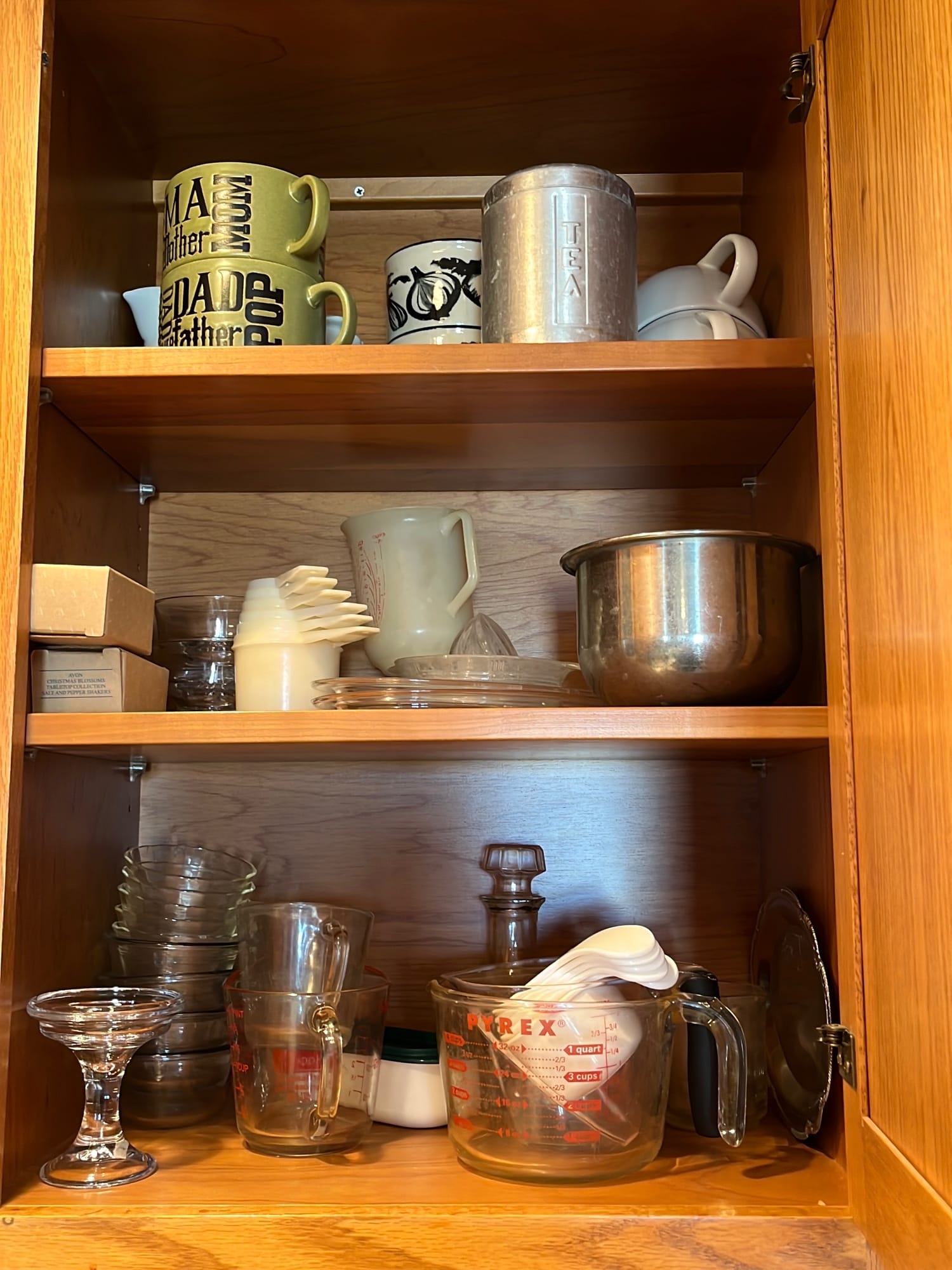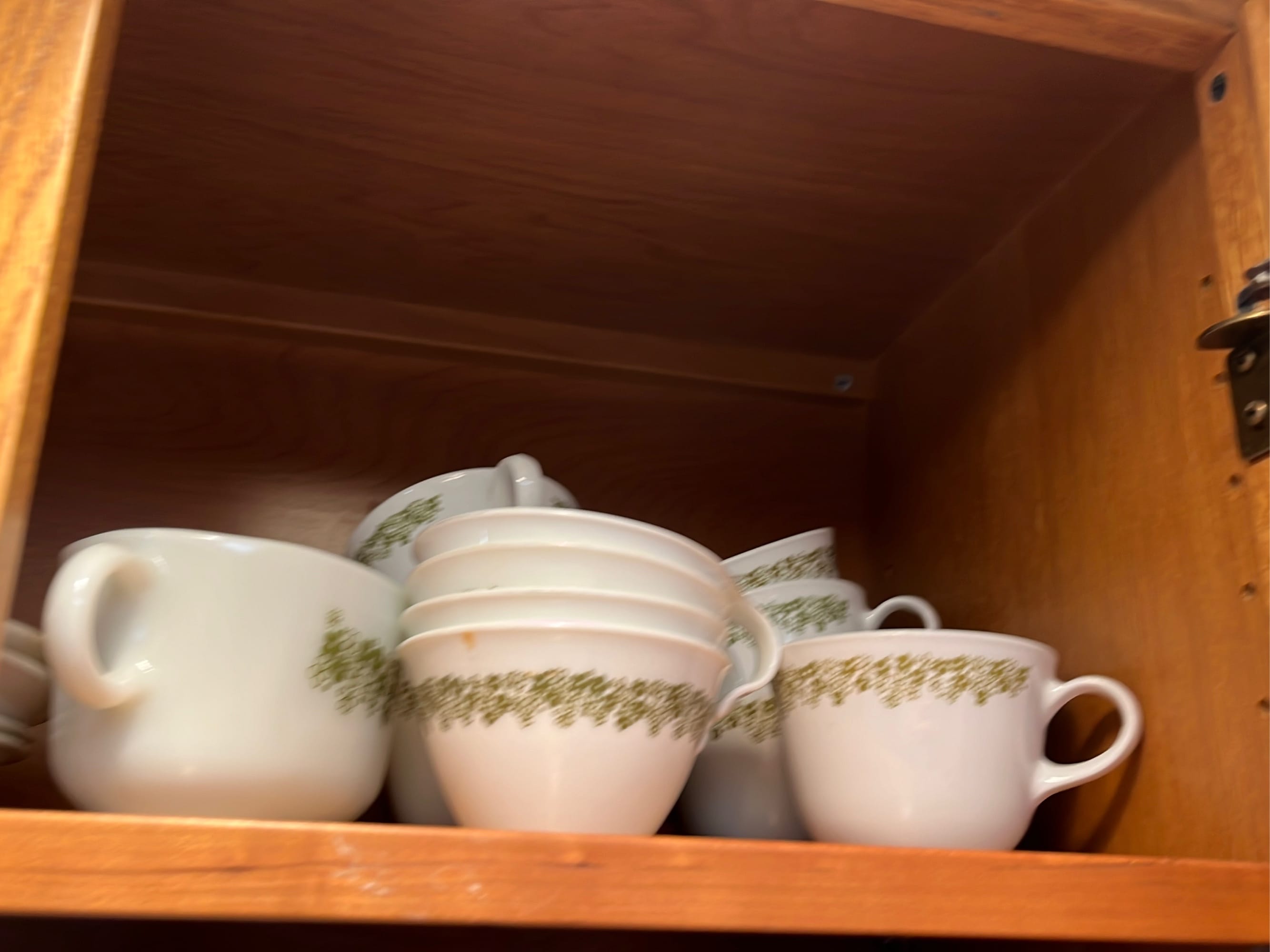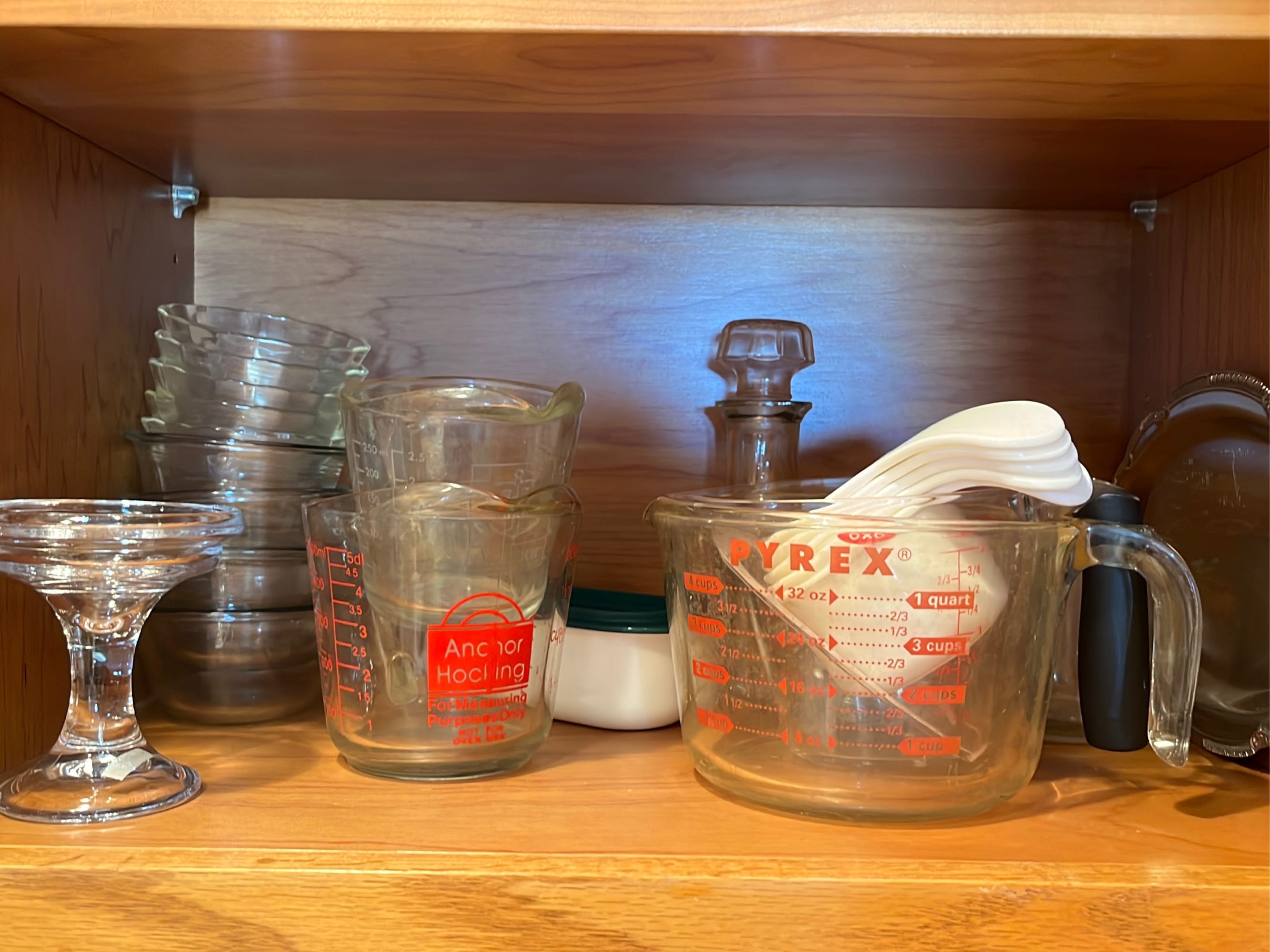 211 Pyrex measuring cups, mugs, SS bowl, contents of cabinet as shown in pictures