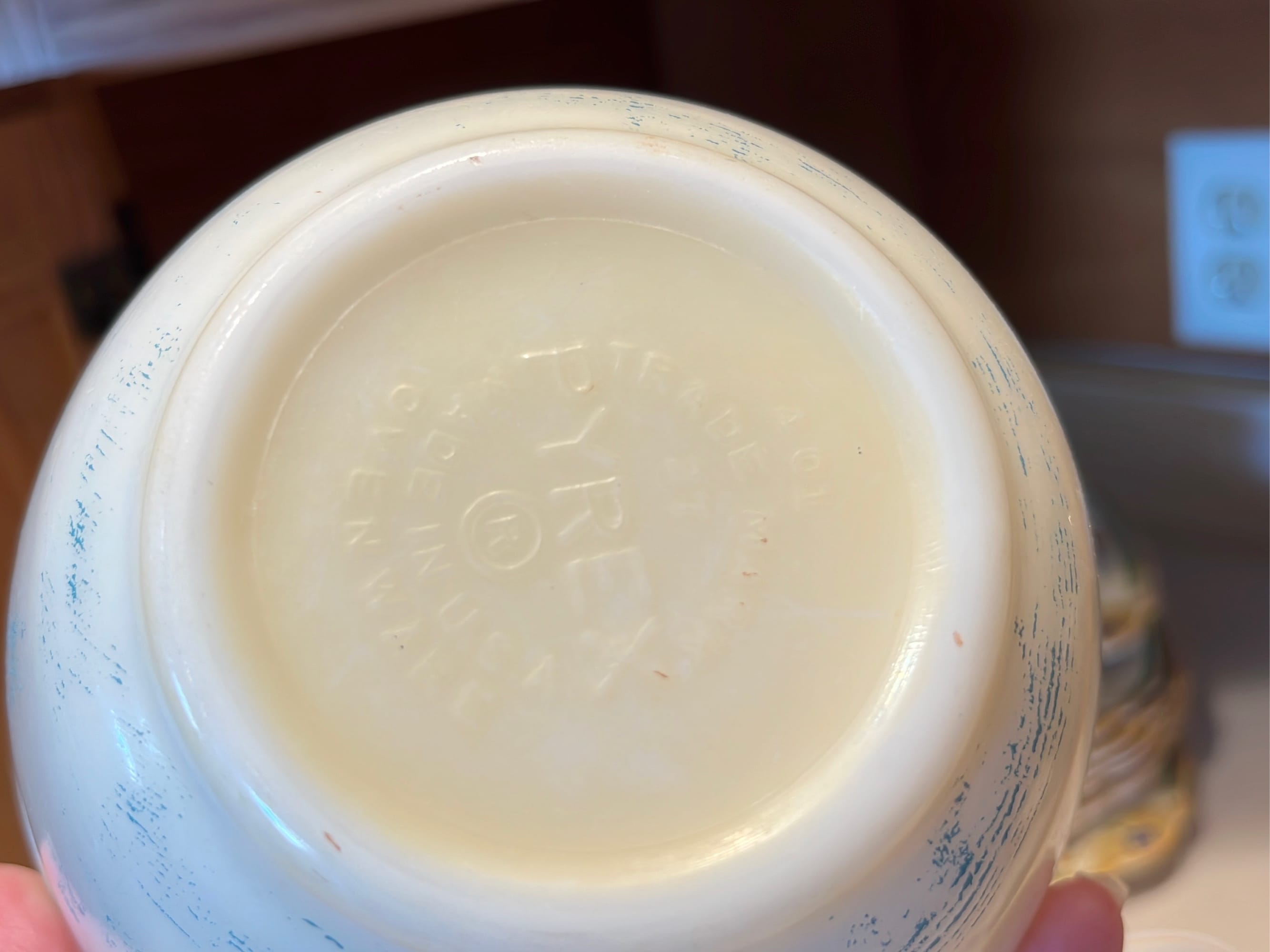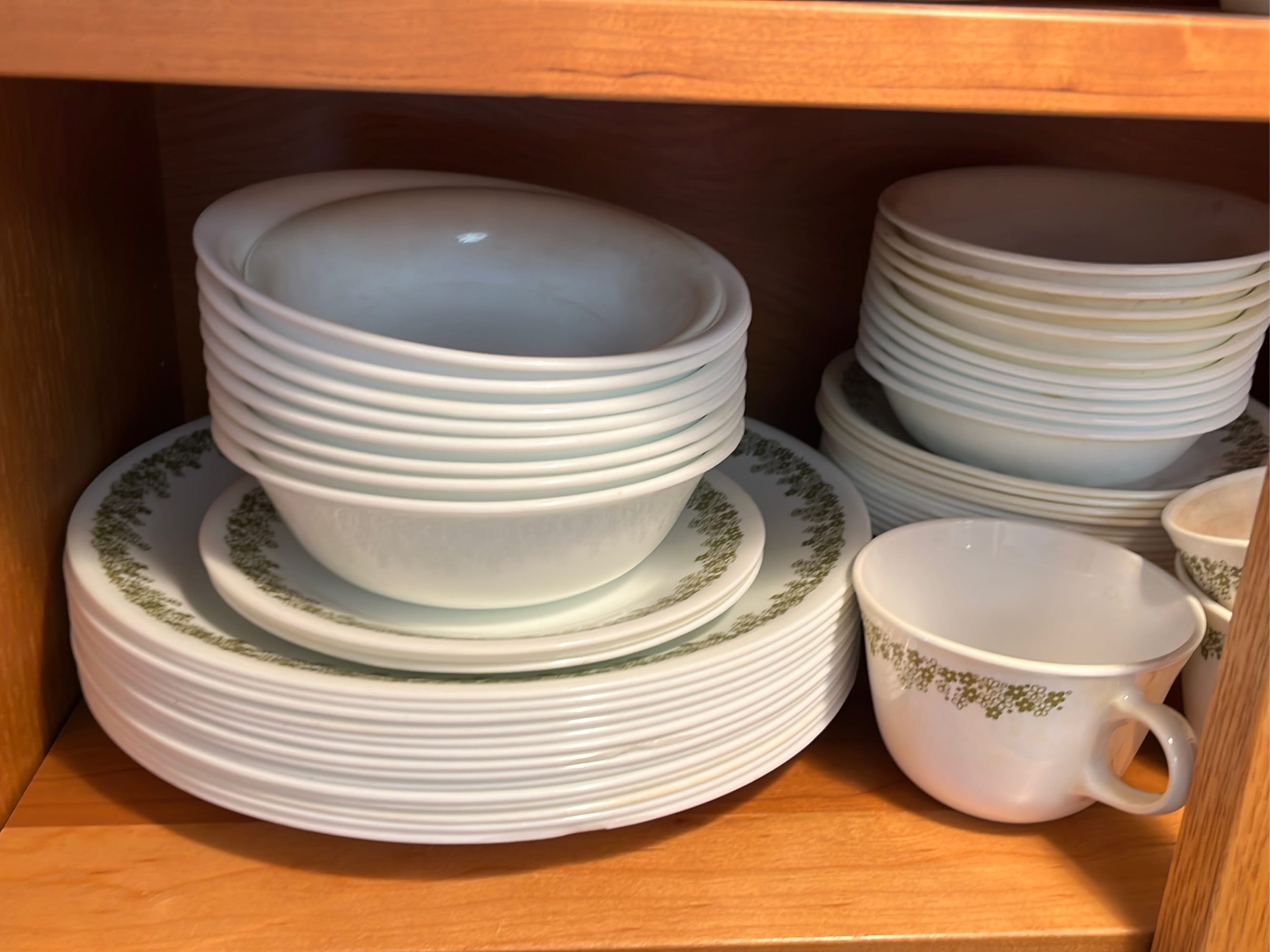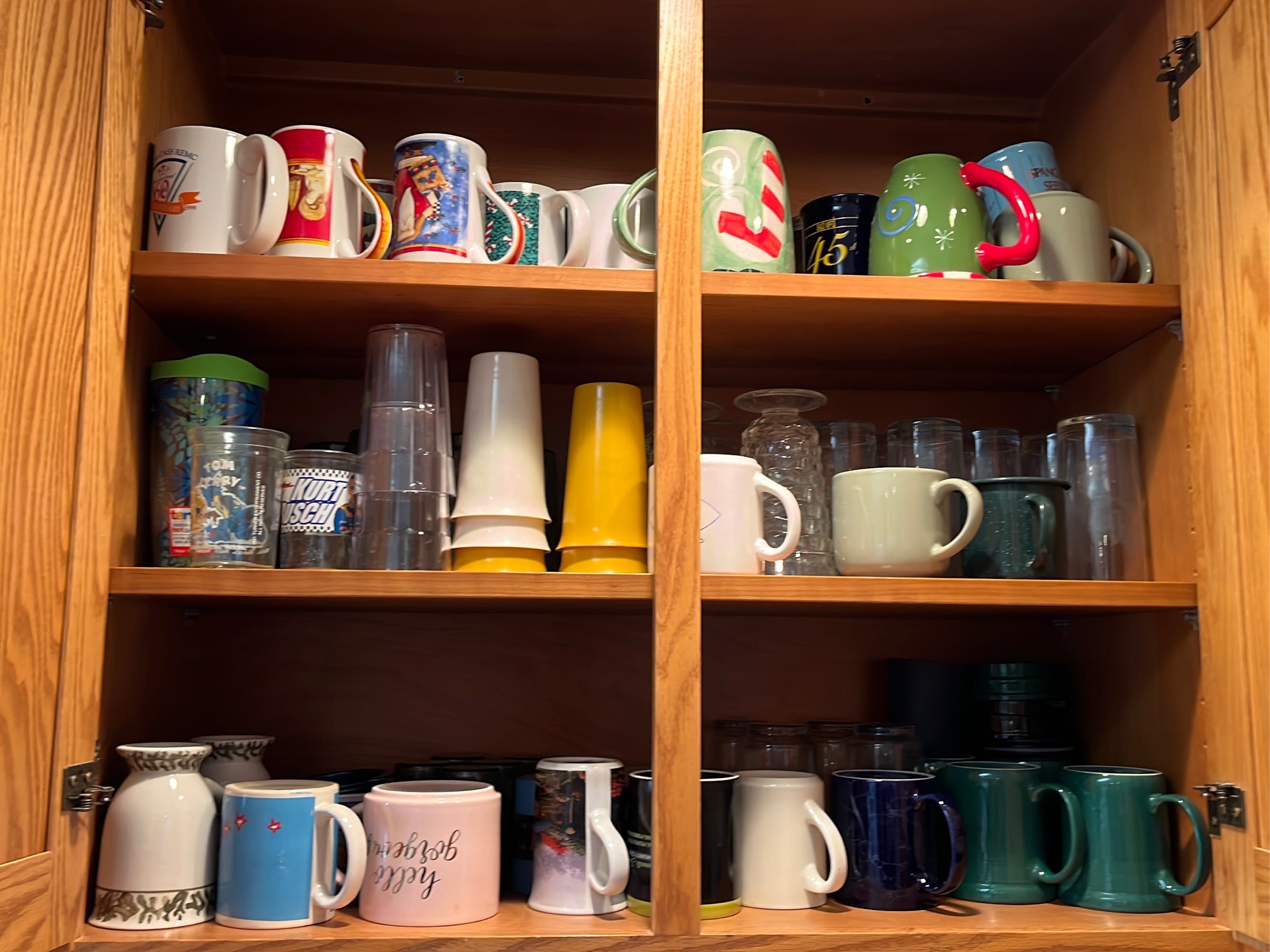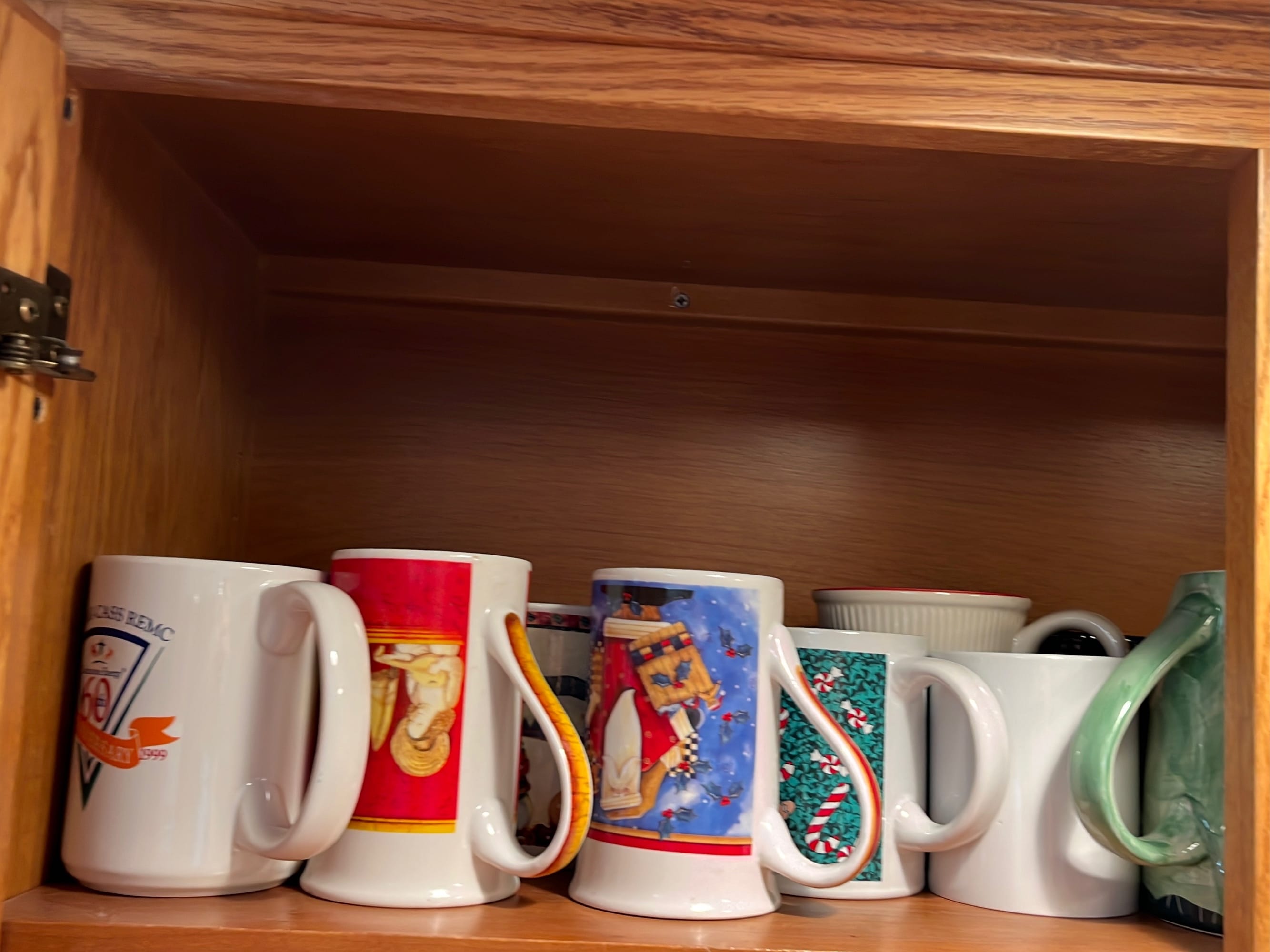 211 Pyrex measuring cups, mugs, SS bowl, contents of cabinet as shown in pictures
