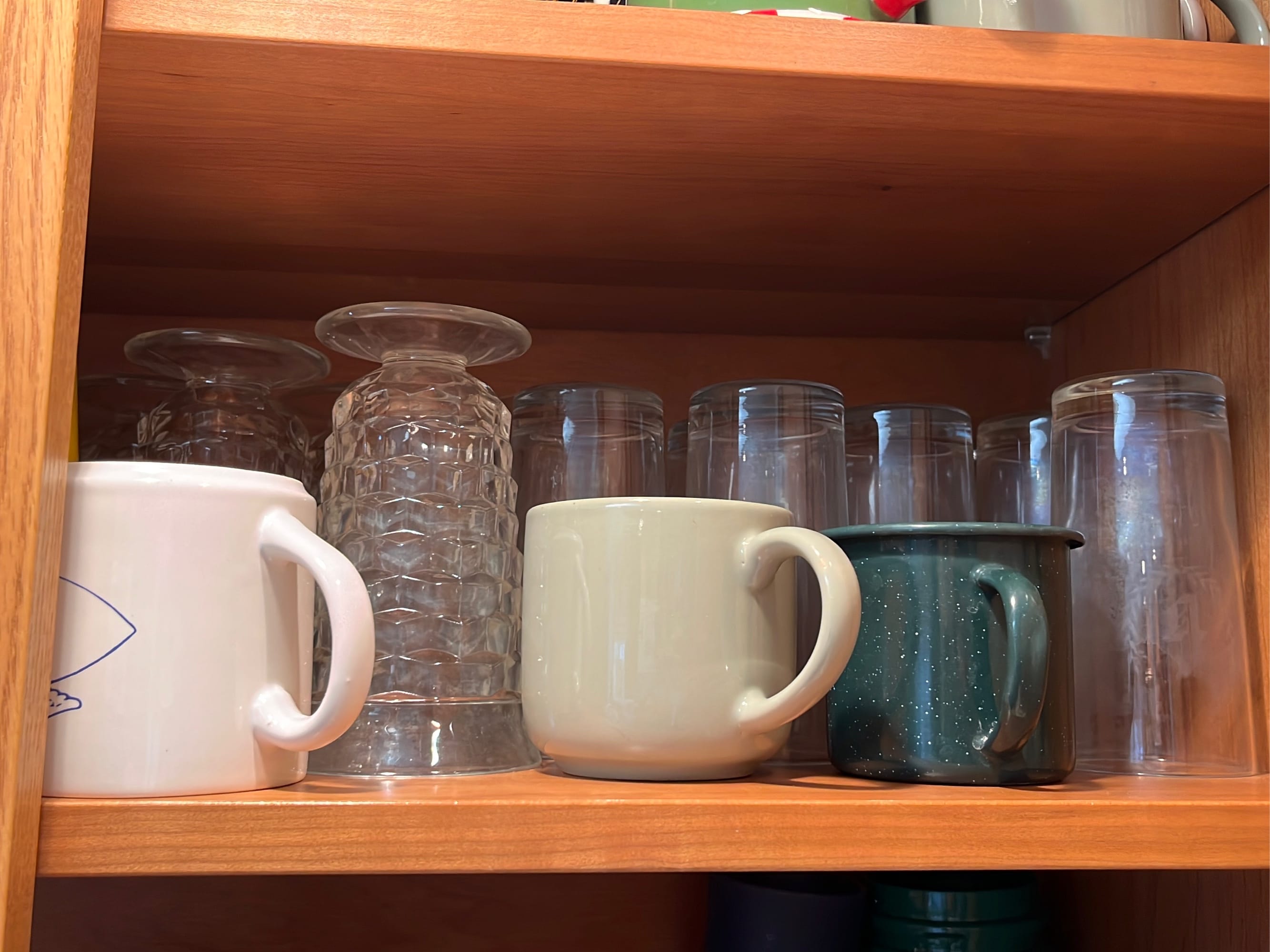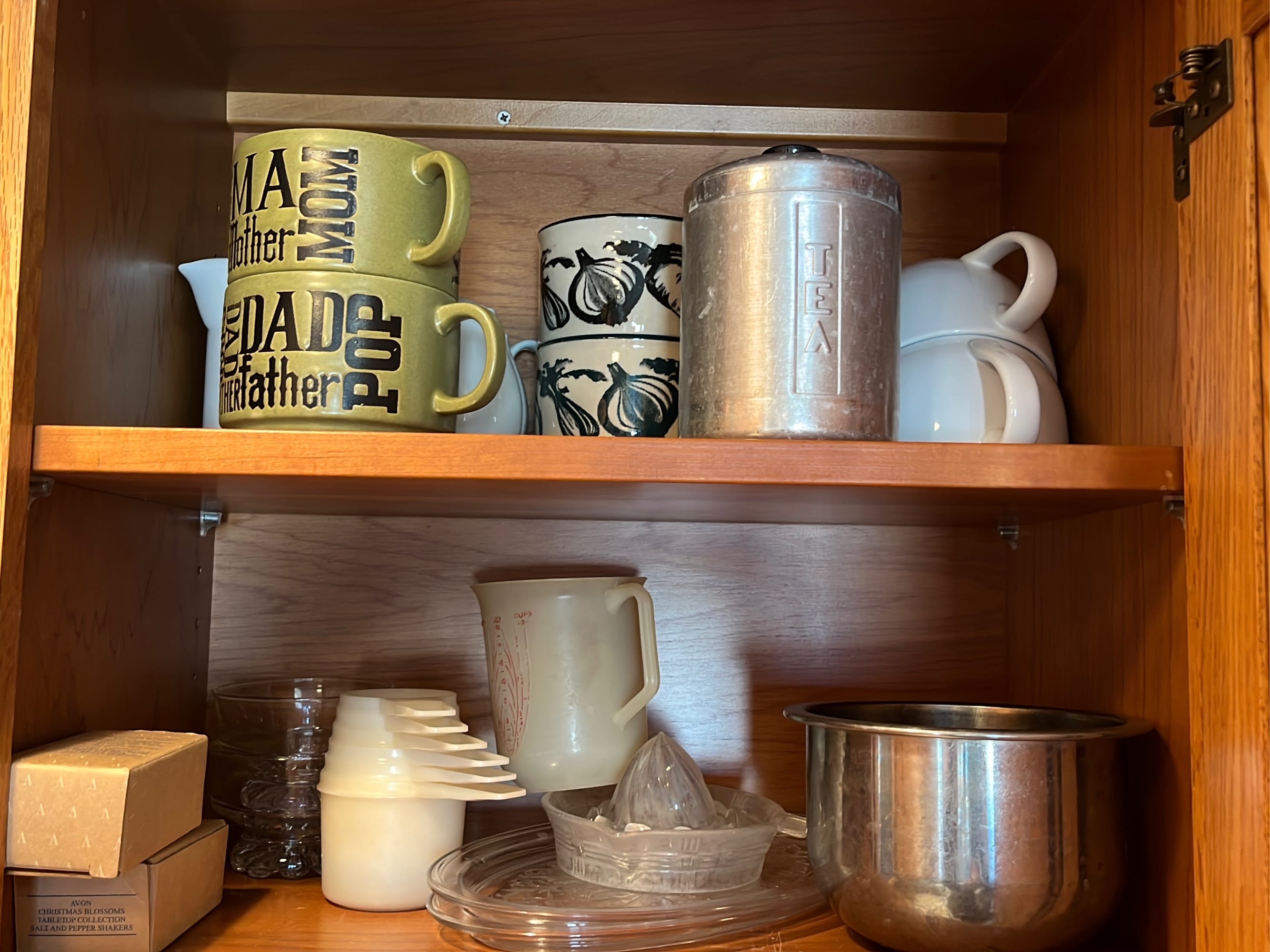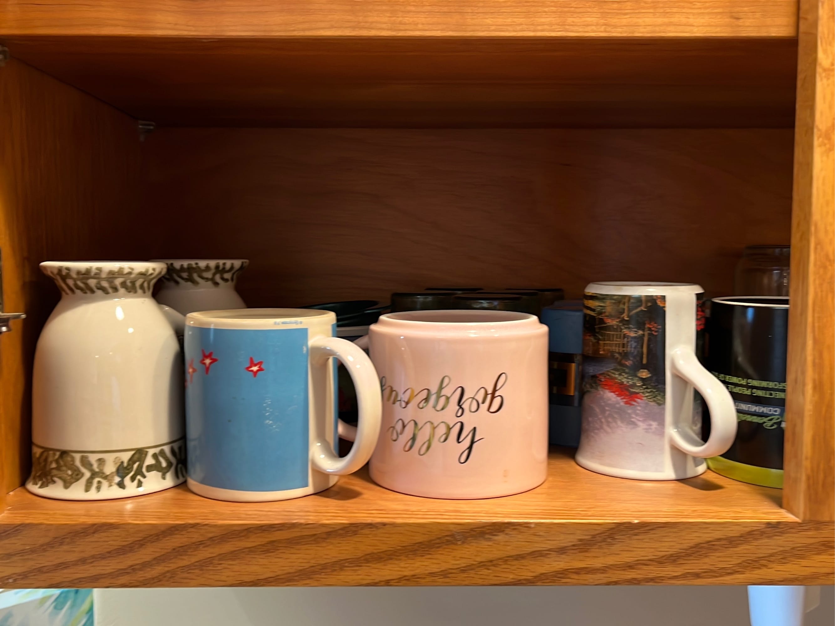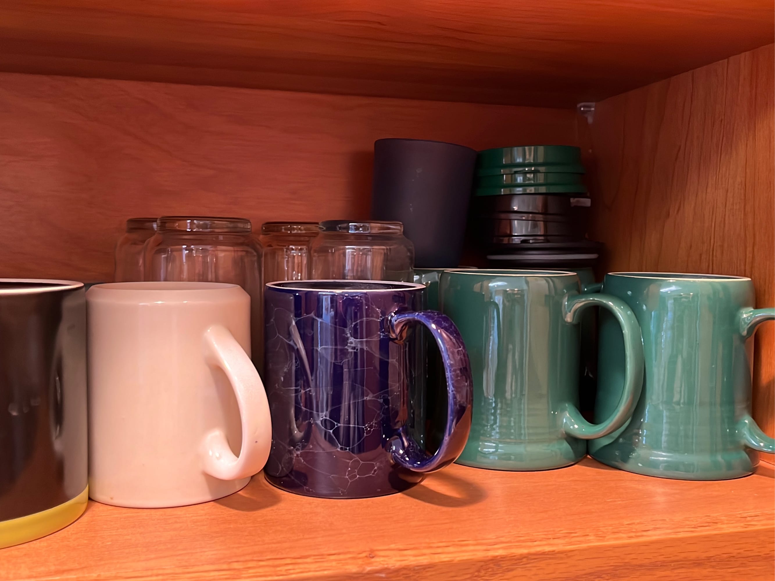 211 Pyrex measuring cups, mugs, SS bowl, contents of cabinet as shown in pictures