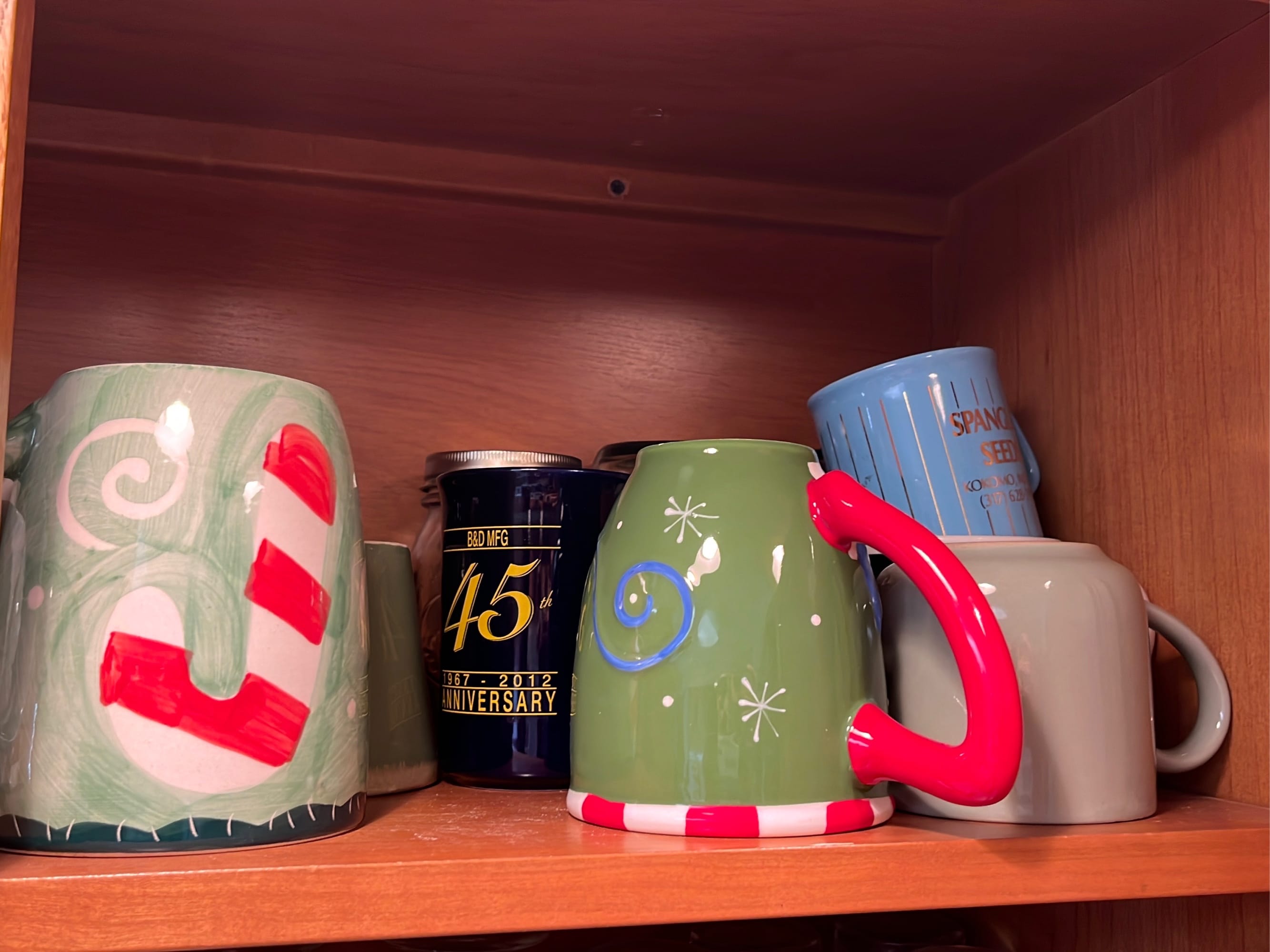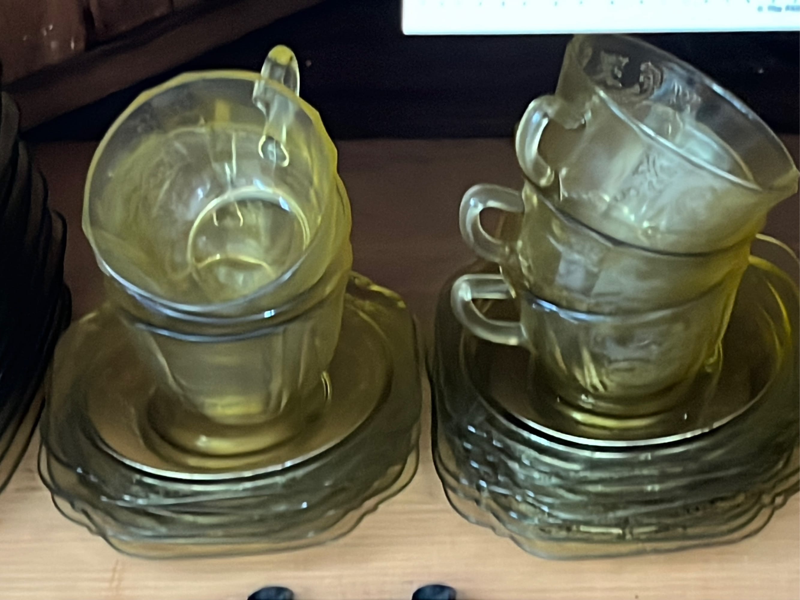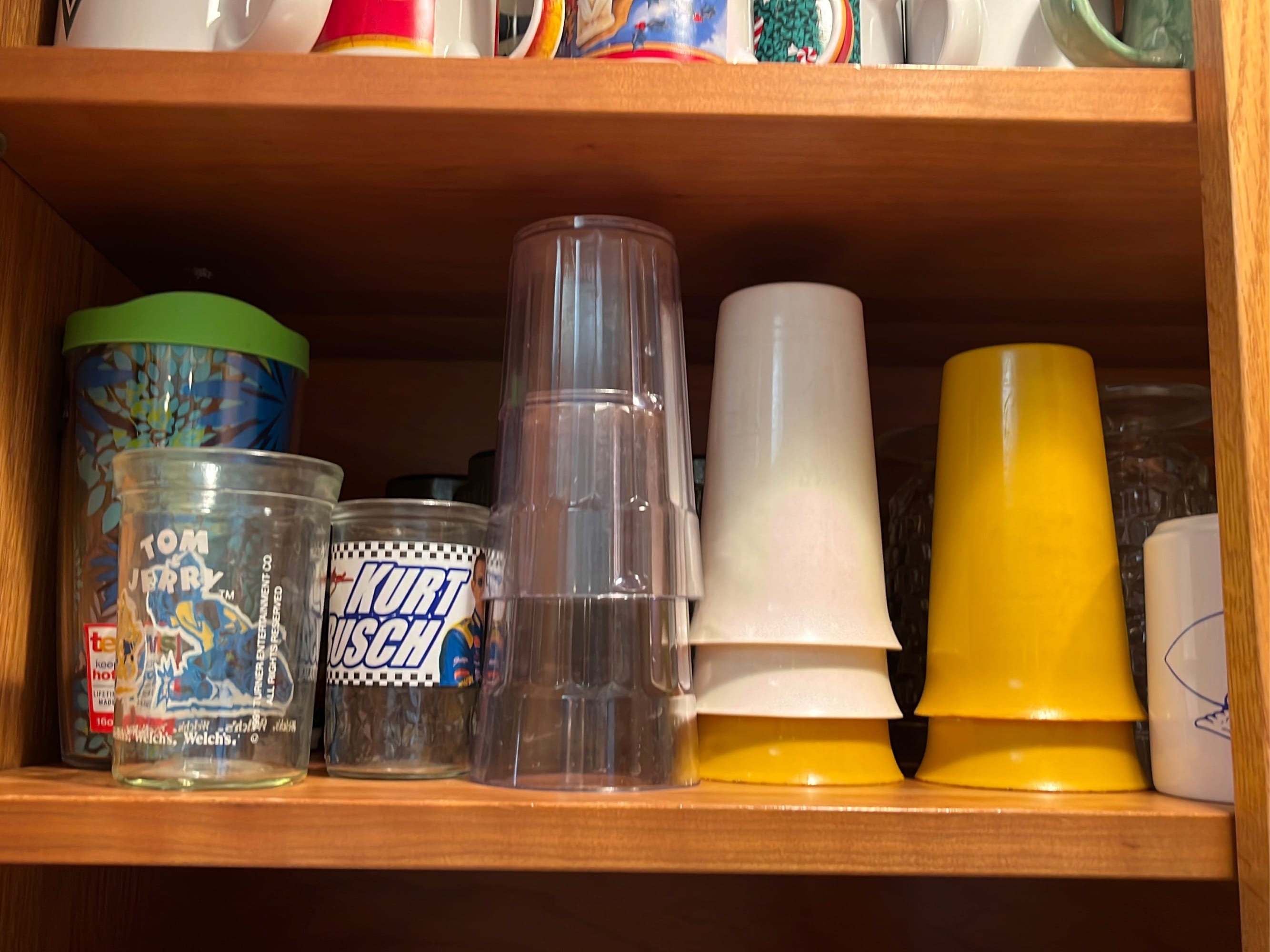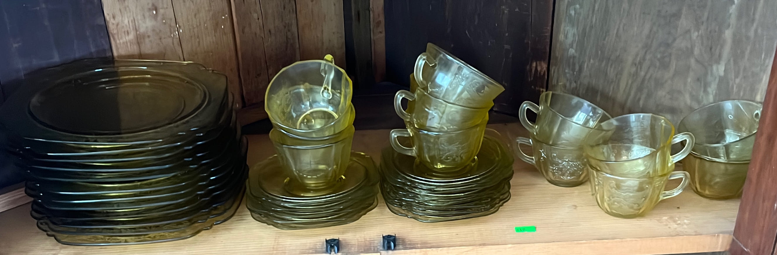211 Pyrex measuring cups, mugs, SS bowl, contents of cabinet as shown in pictures