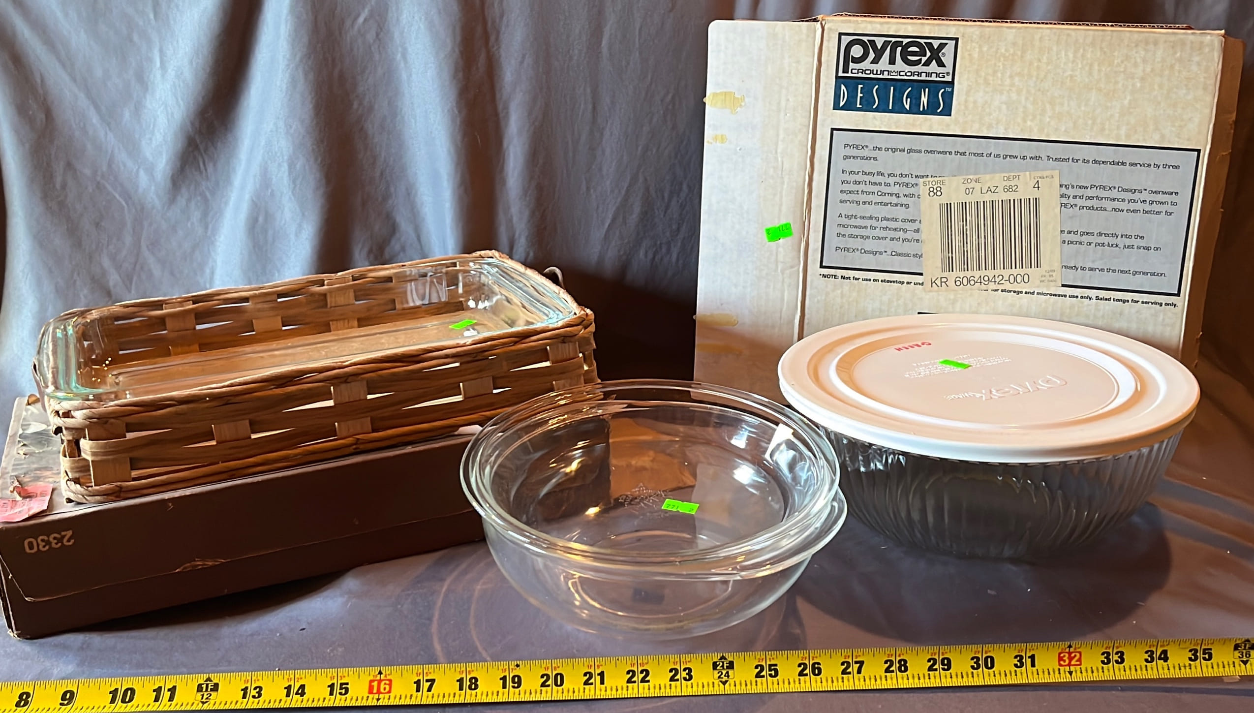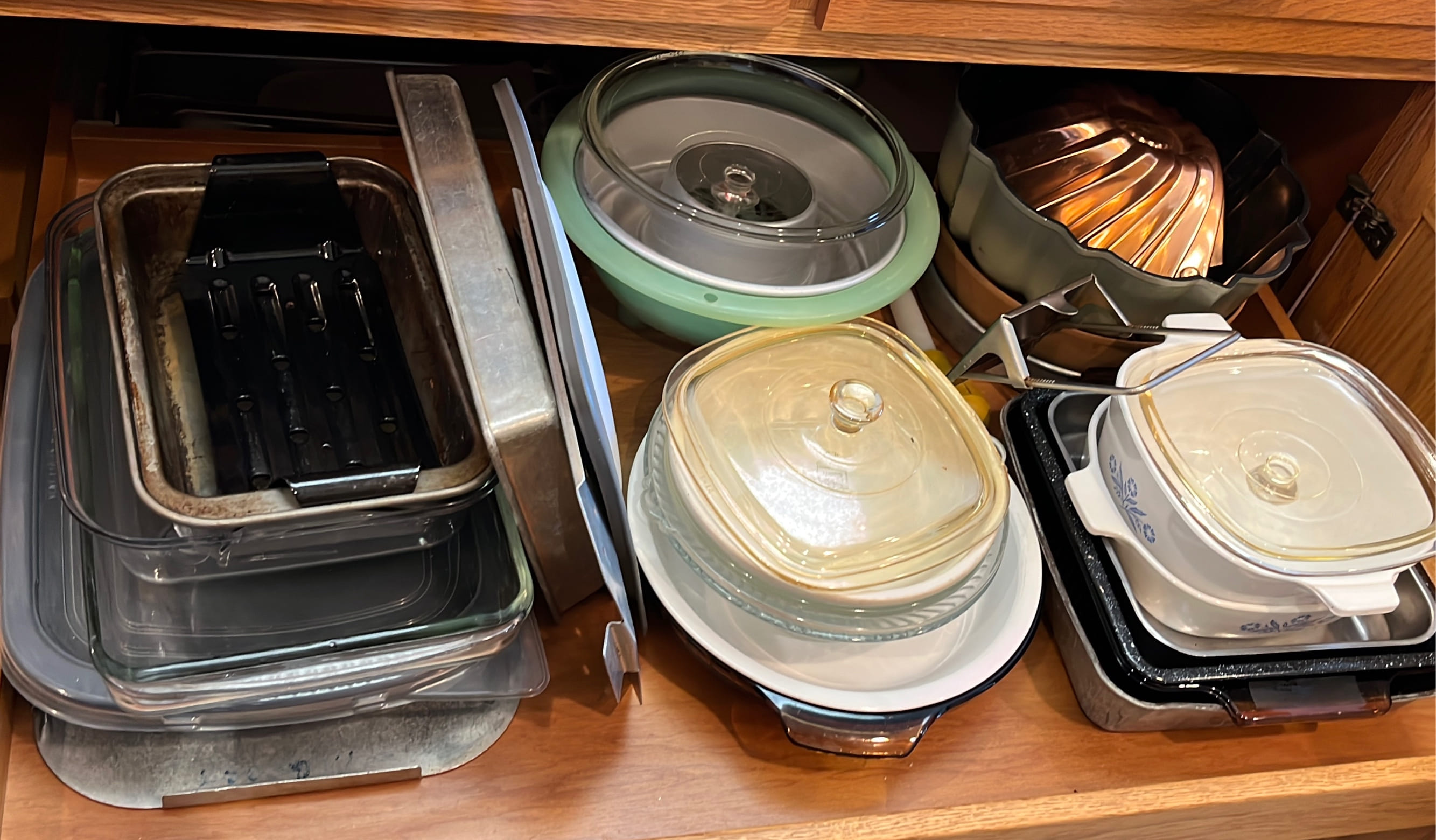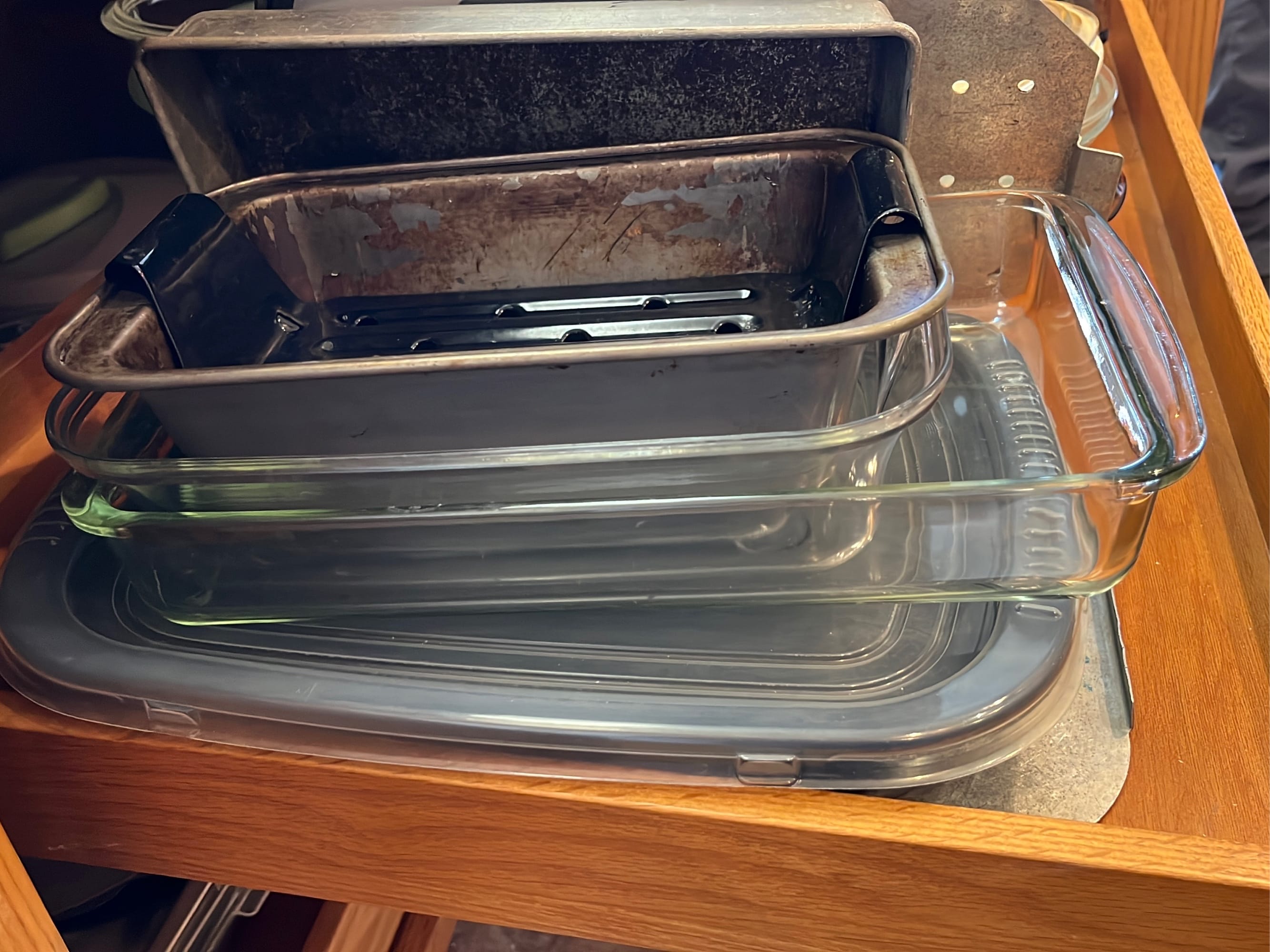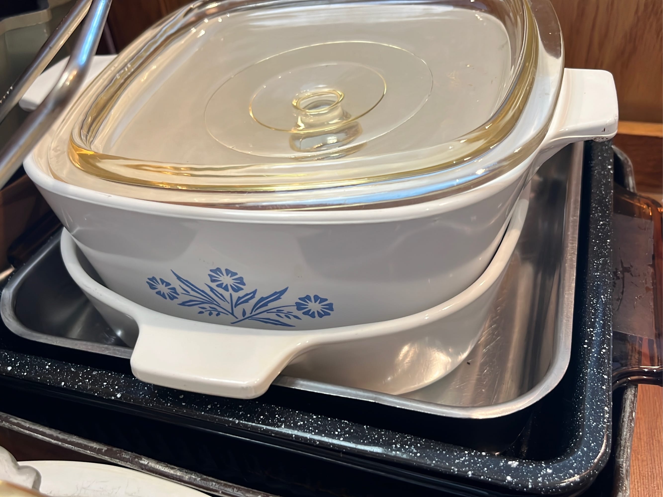 240 Glass and aluminum baking dishes, Corelle casserole dishes