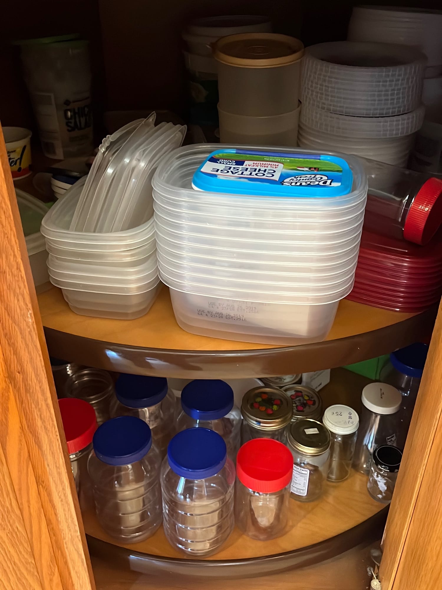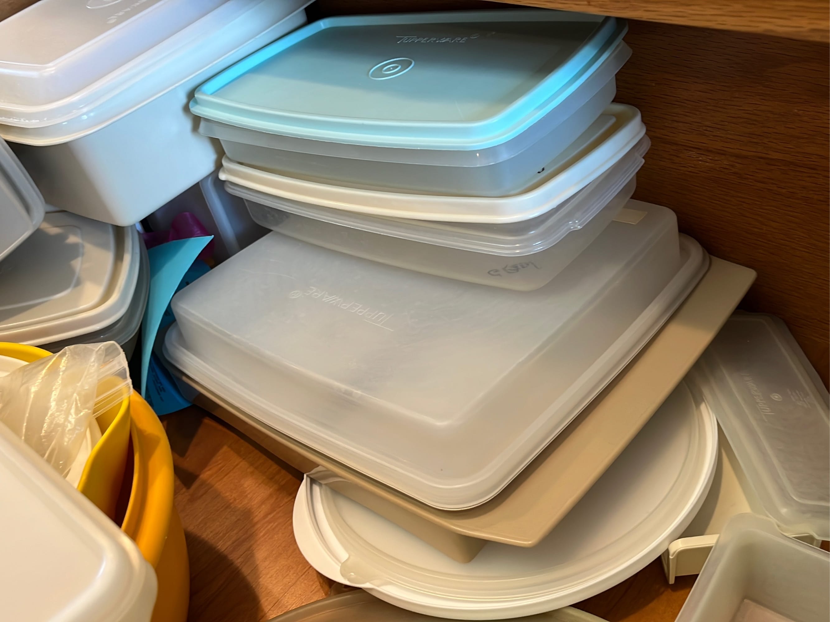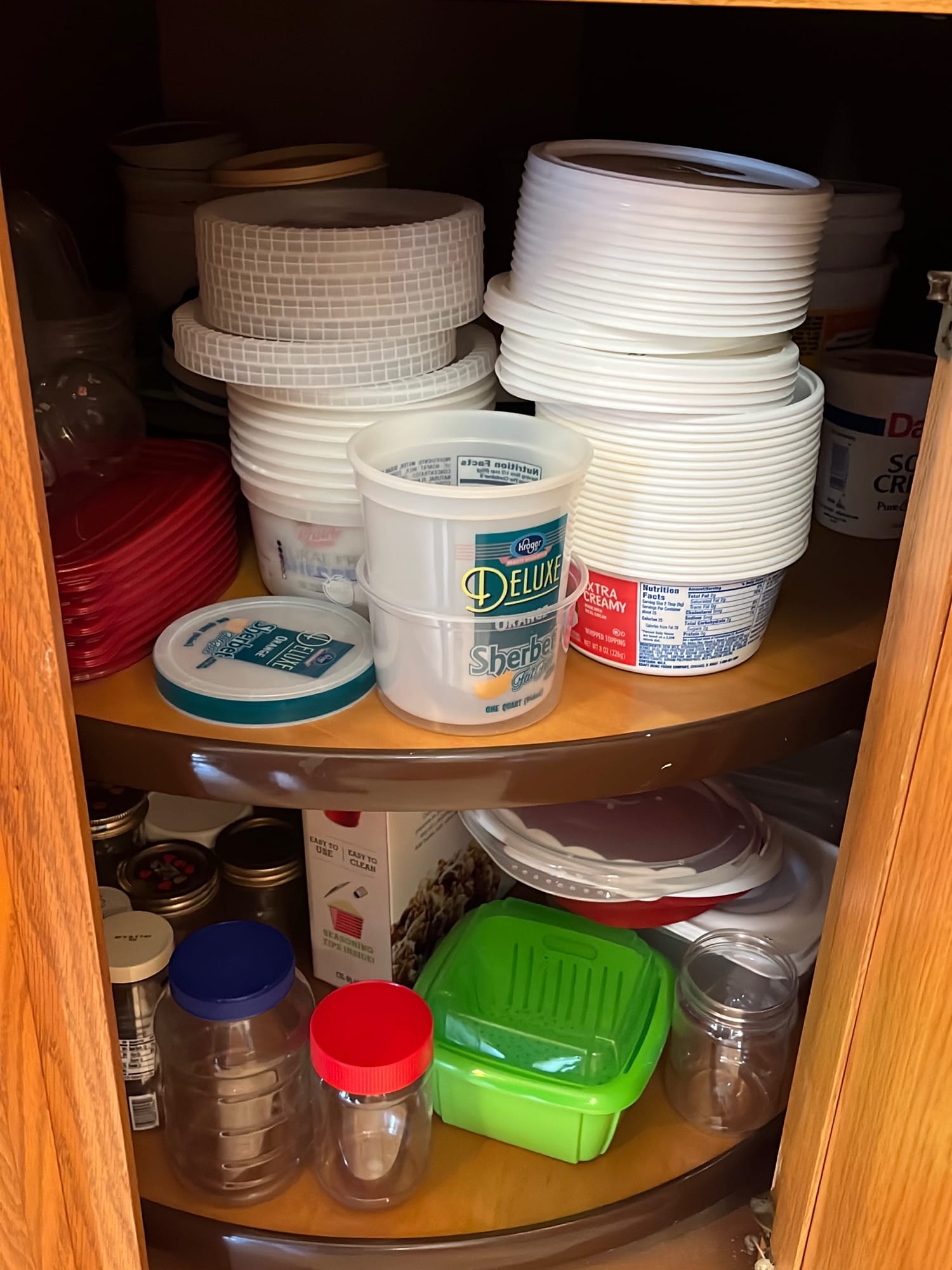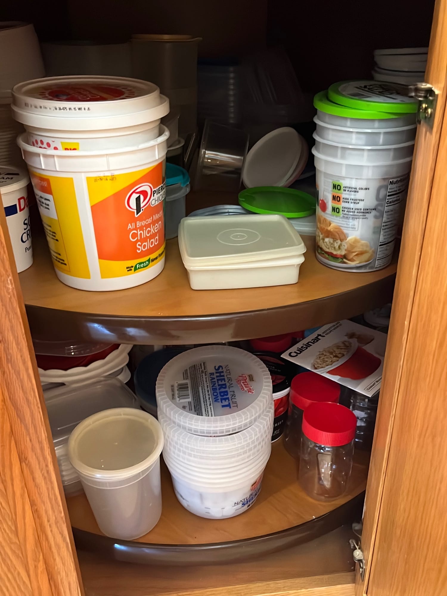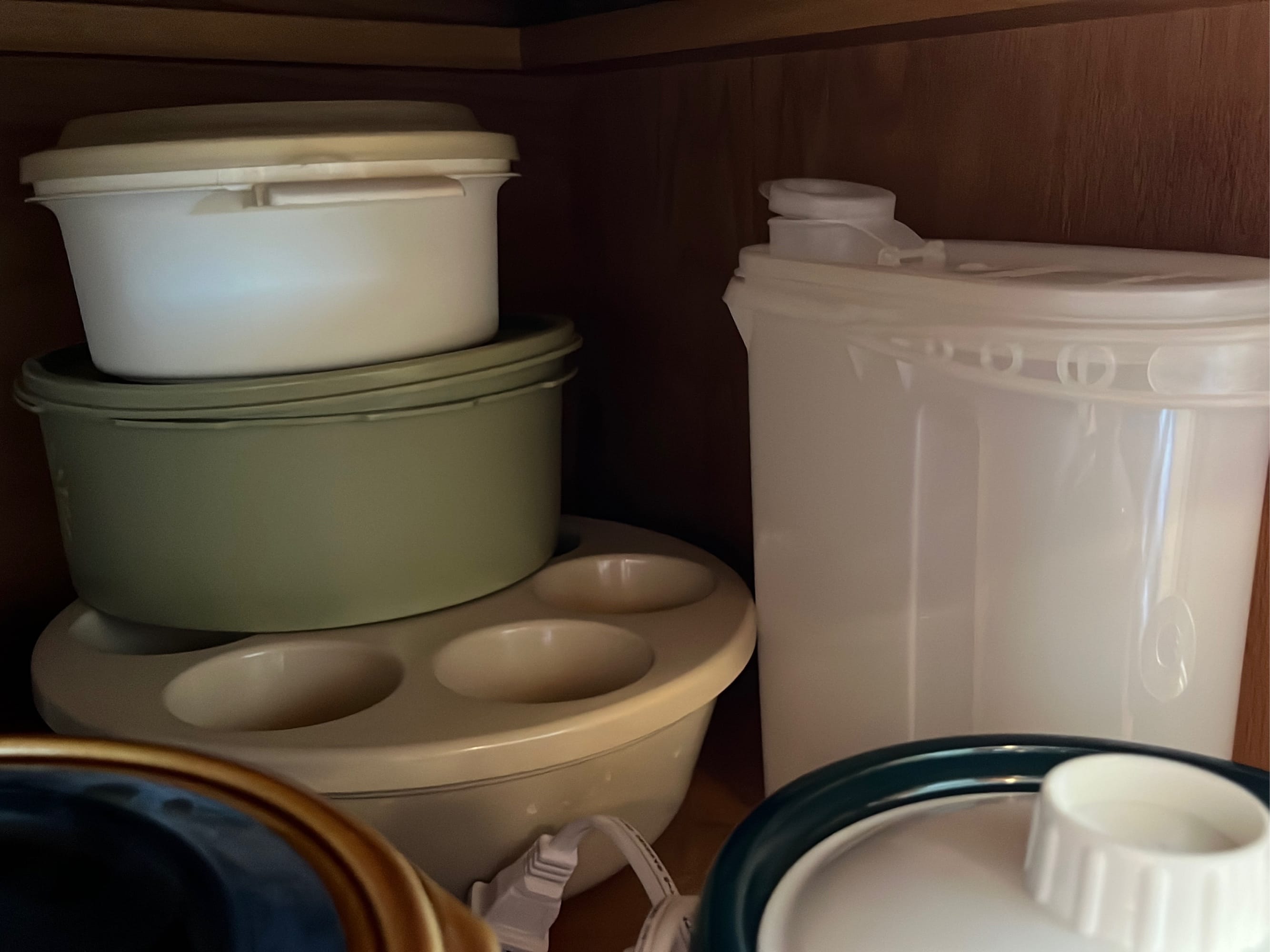 217 Plastic containers, Cuisinart collapsible popcorn bowl contents of cabinet as shown in pictures