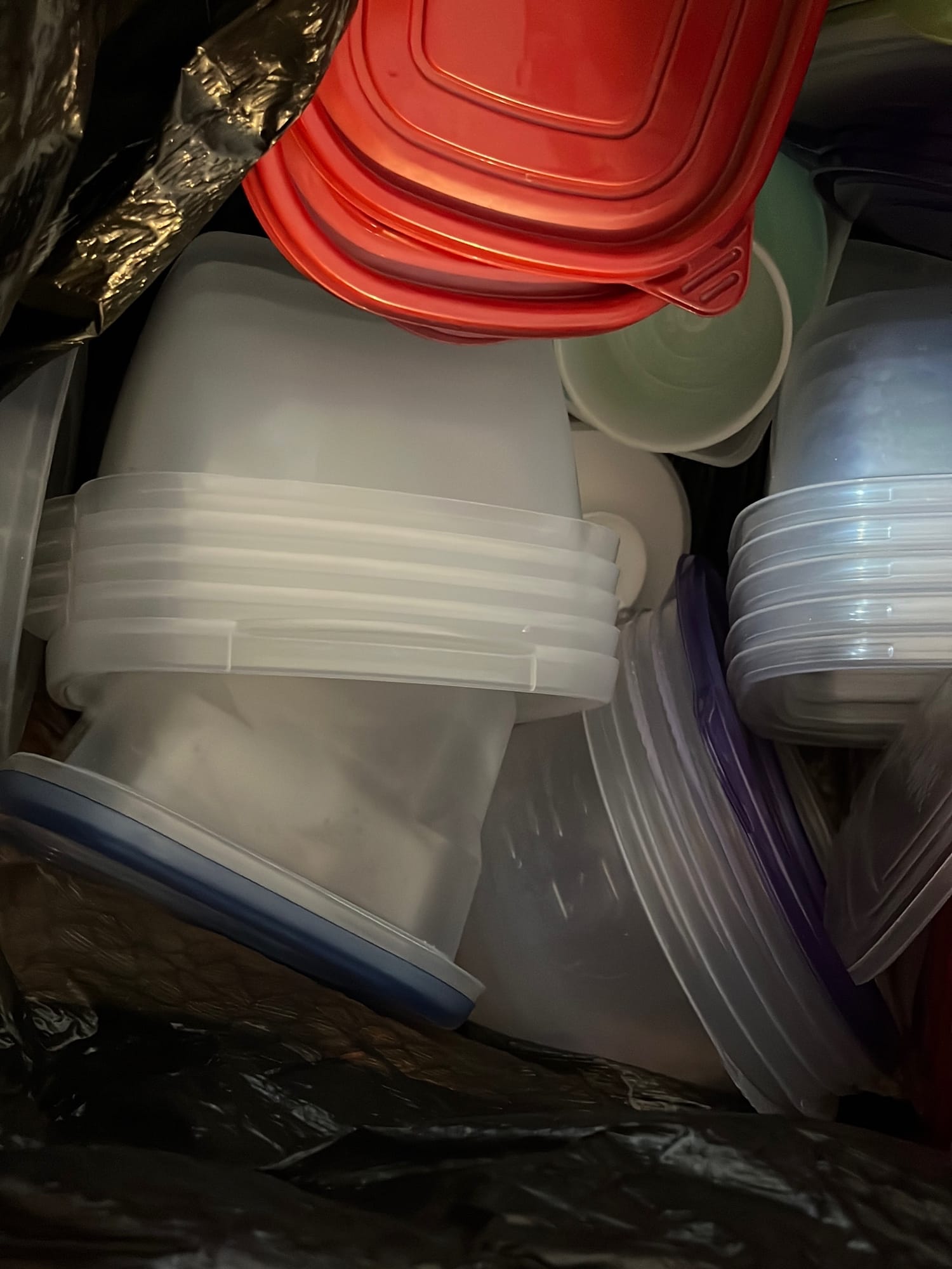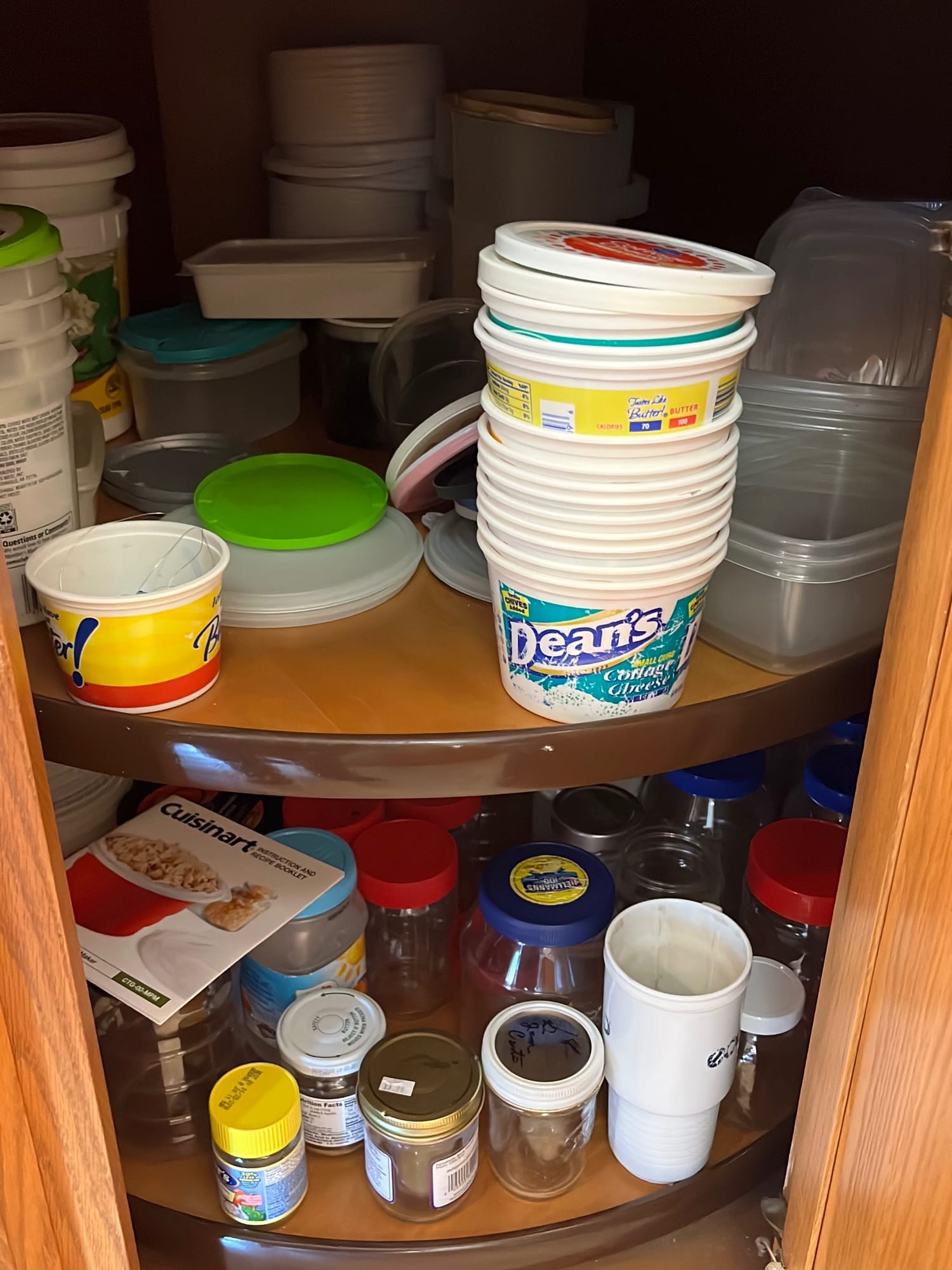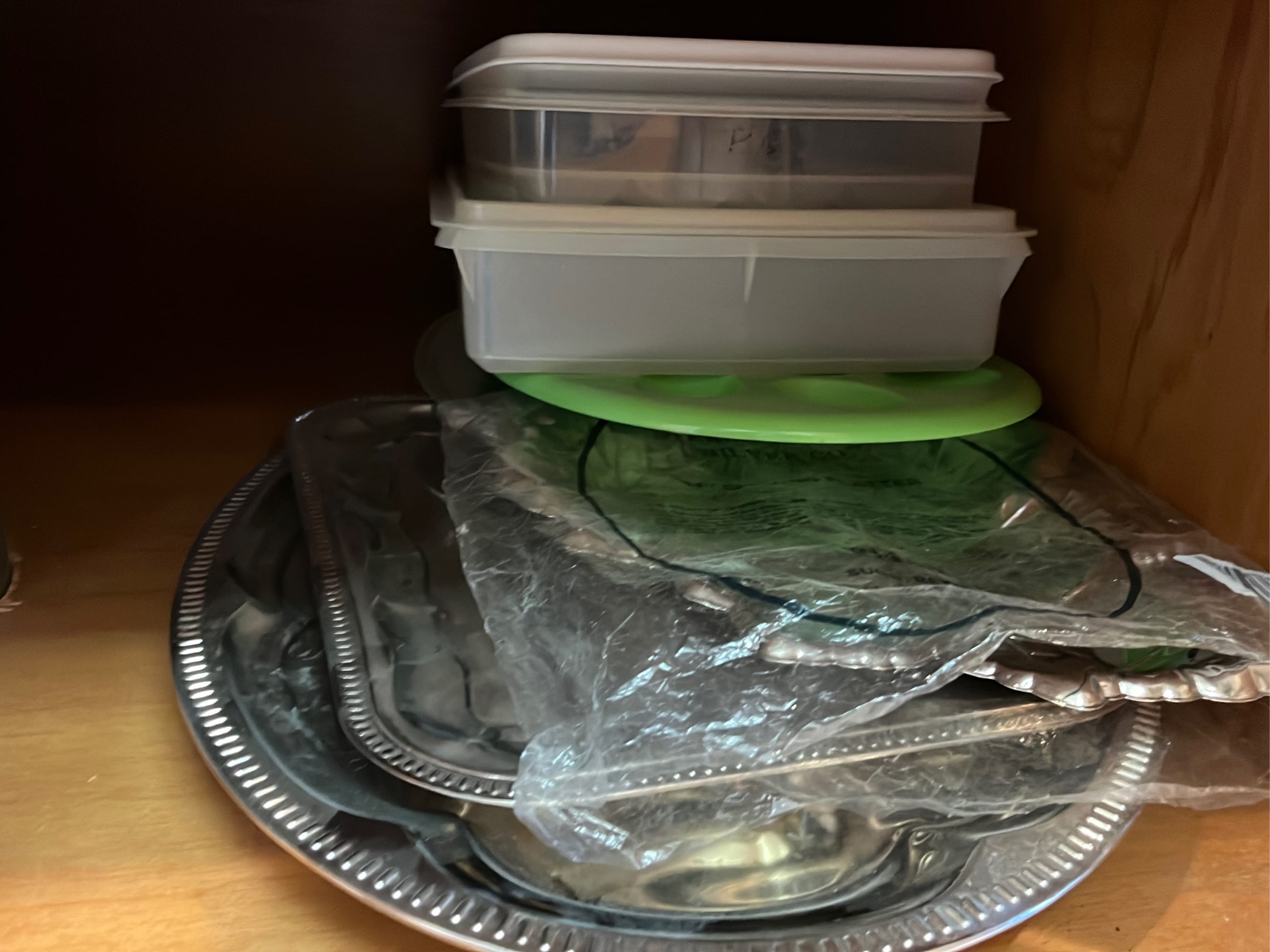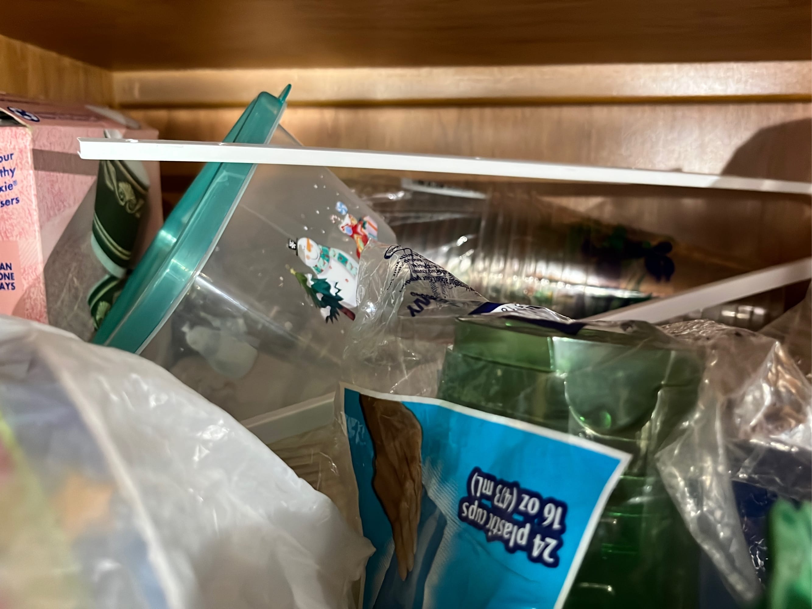 217 Plastic containers, Cuisinart collapsible popcorn bowl contents of cabinet as shown in pictures