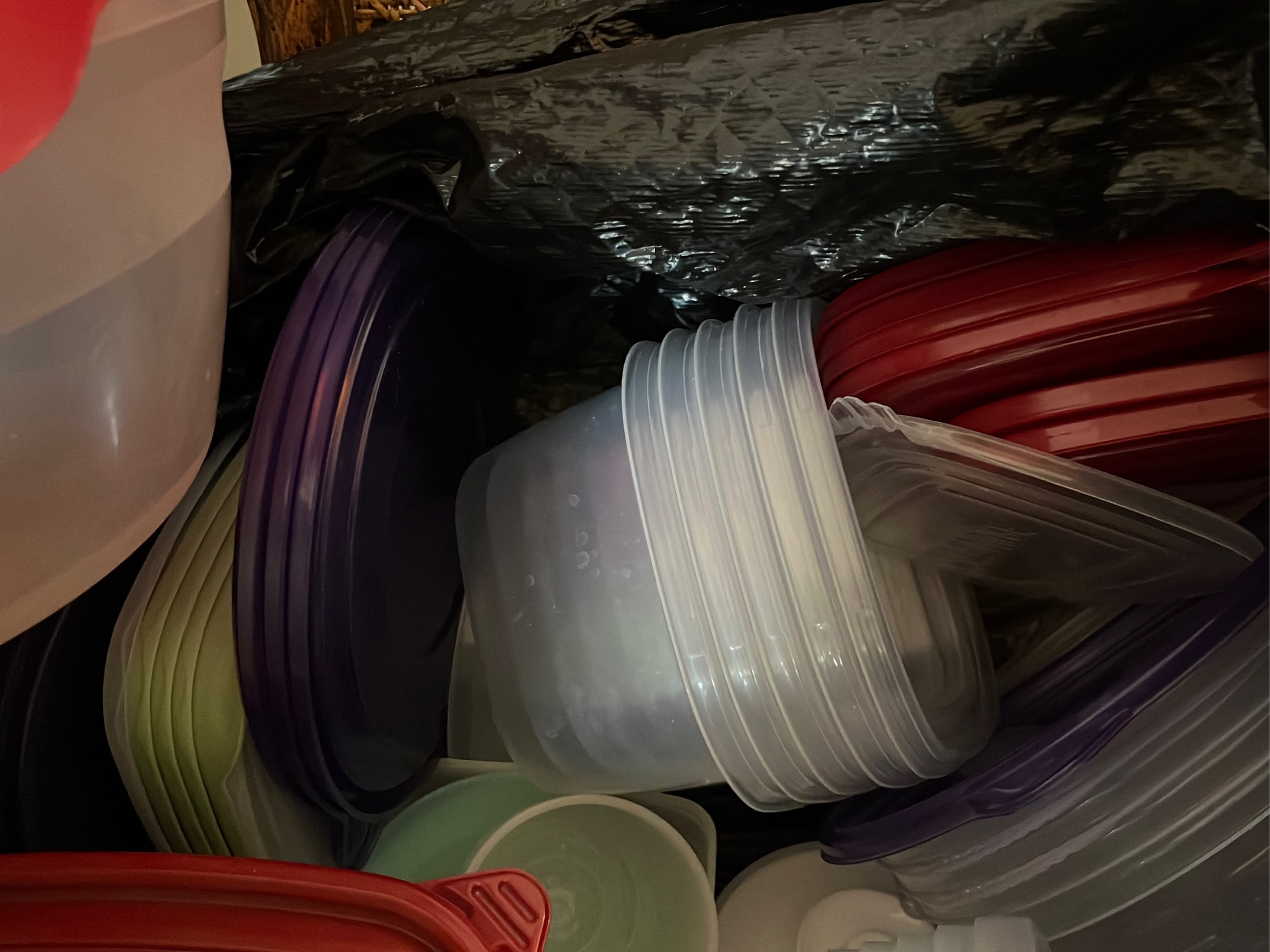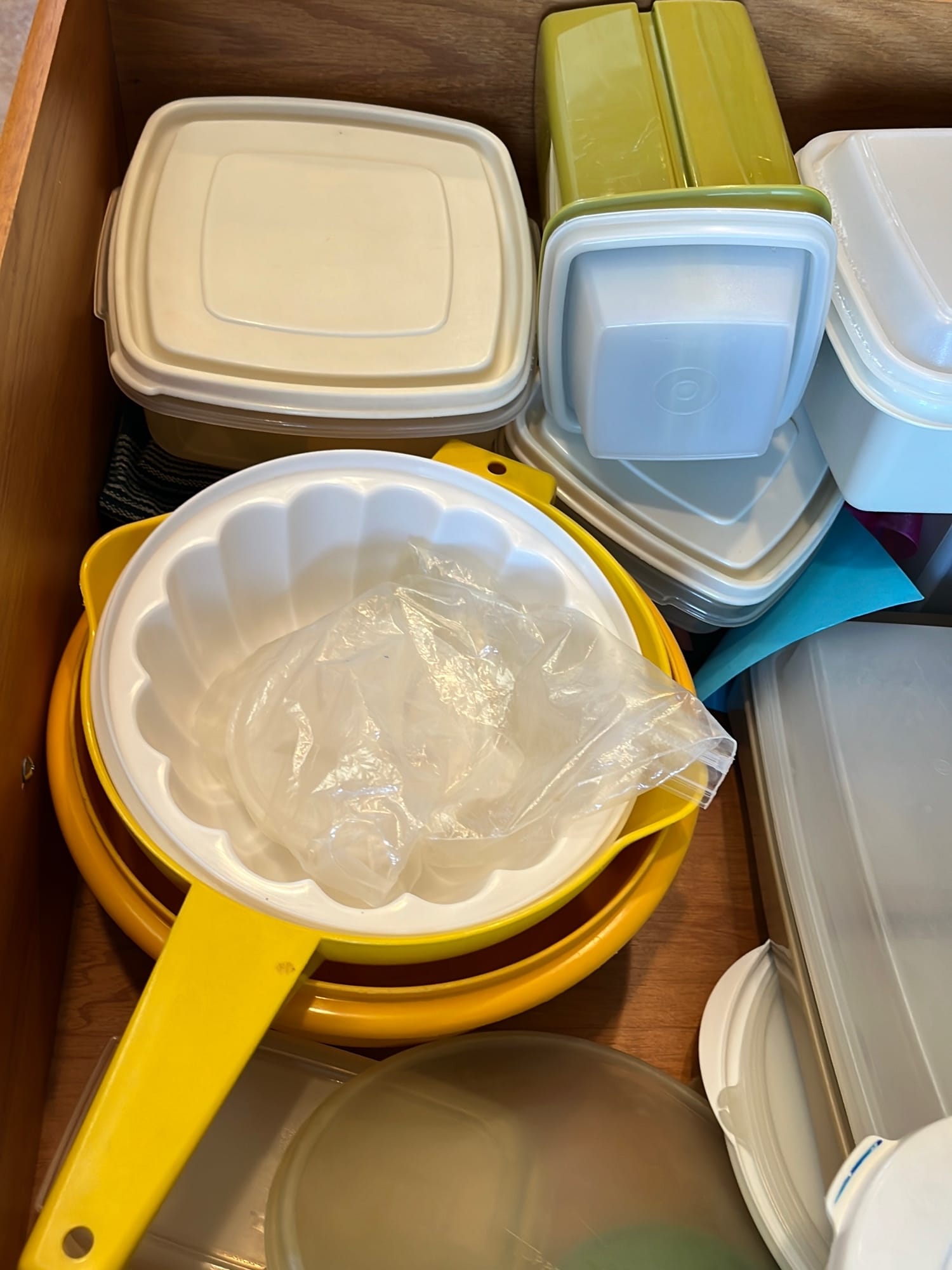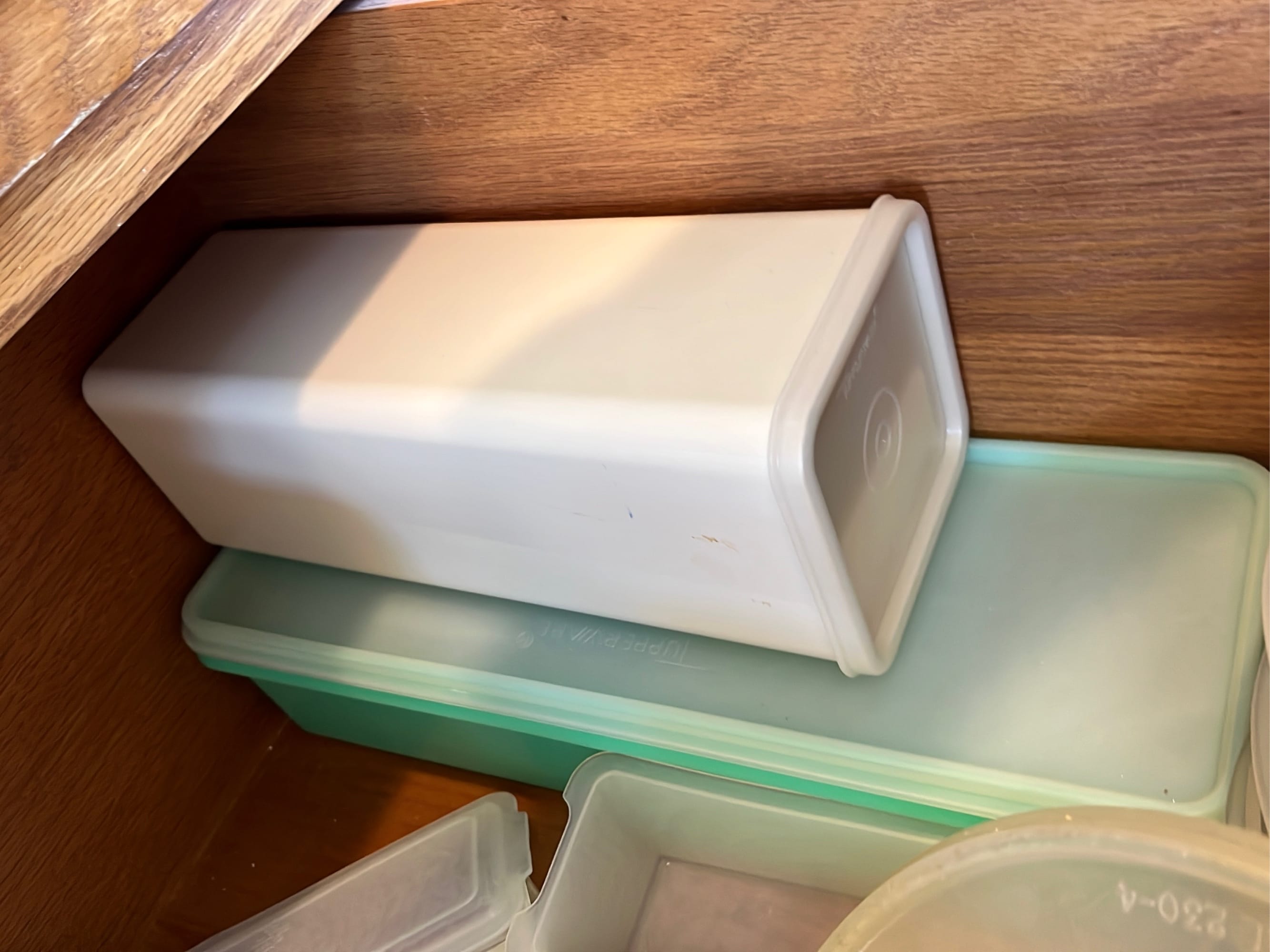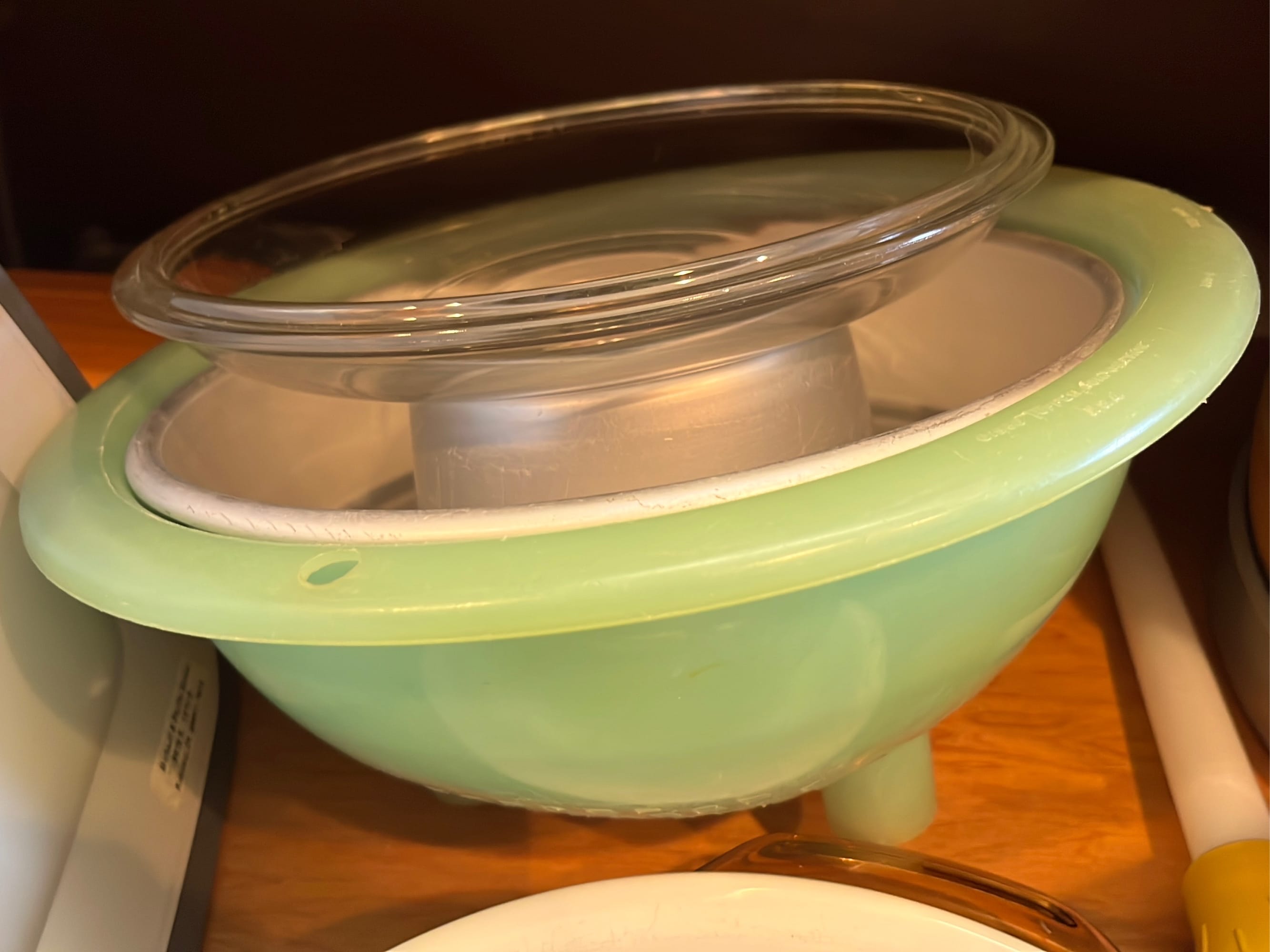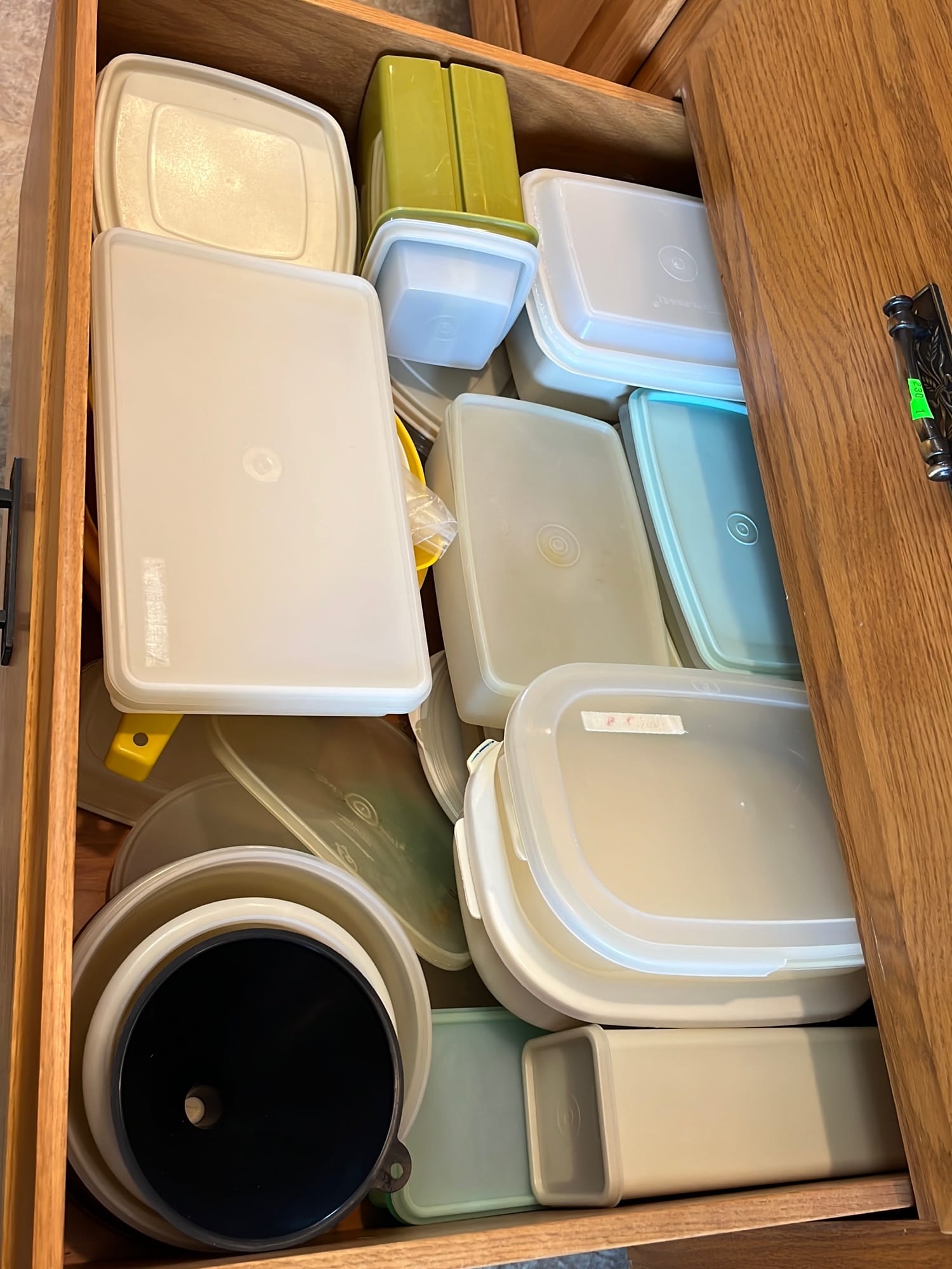 217 Plastic containers, Cuisinart collapsible popcorn bowl contents of cabinet as shown in pictures