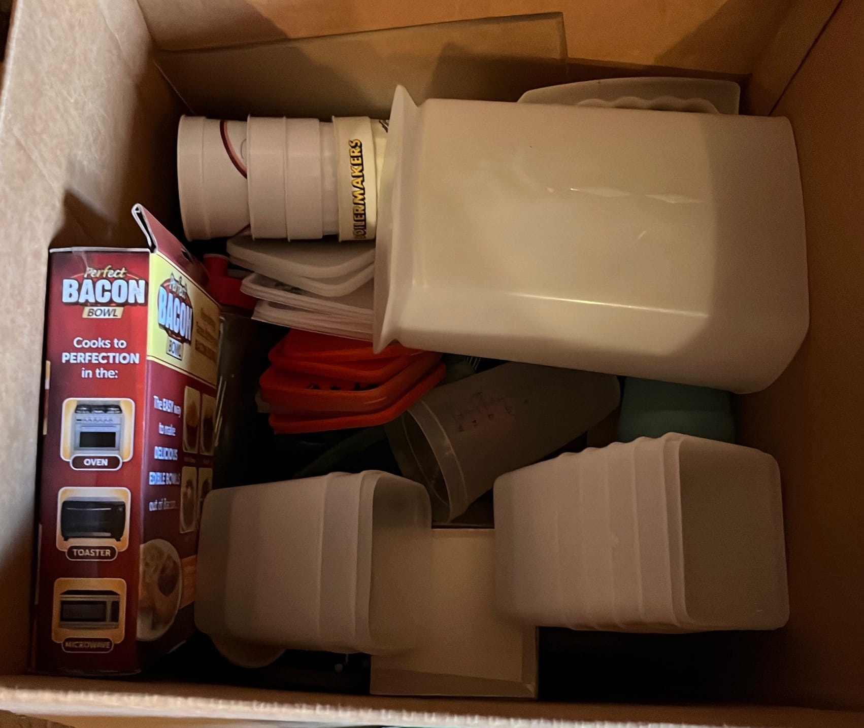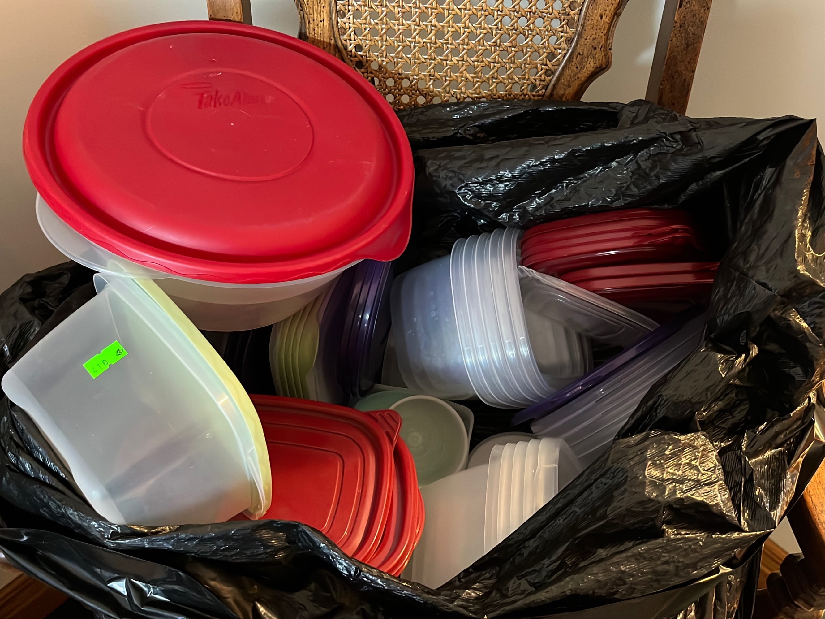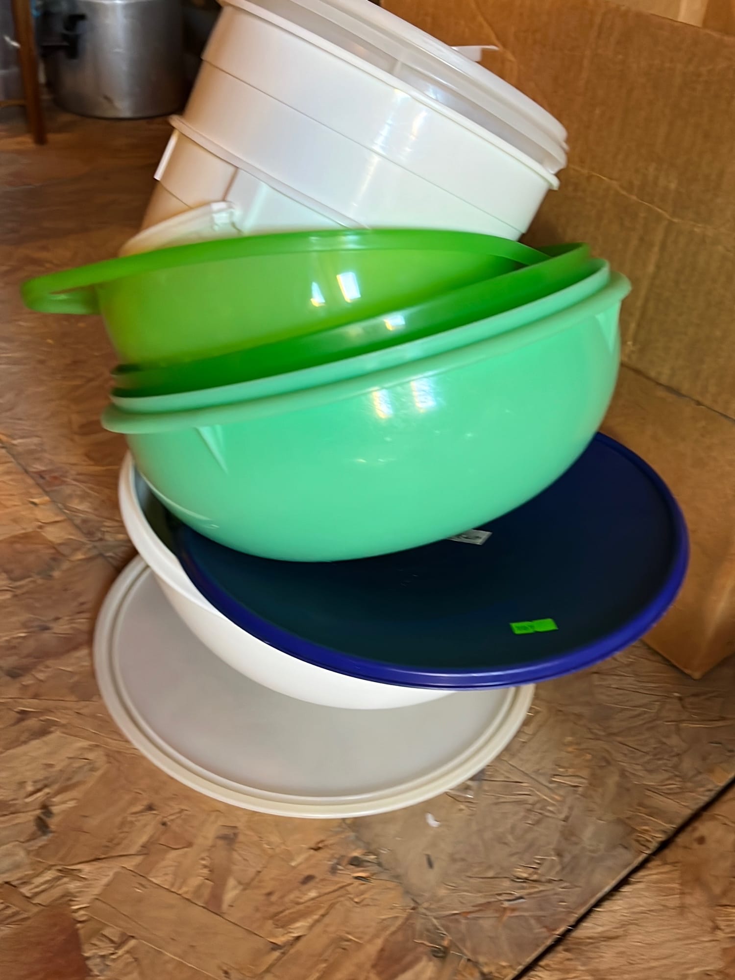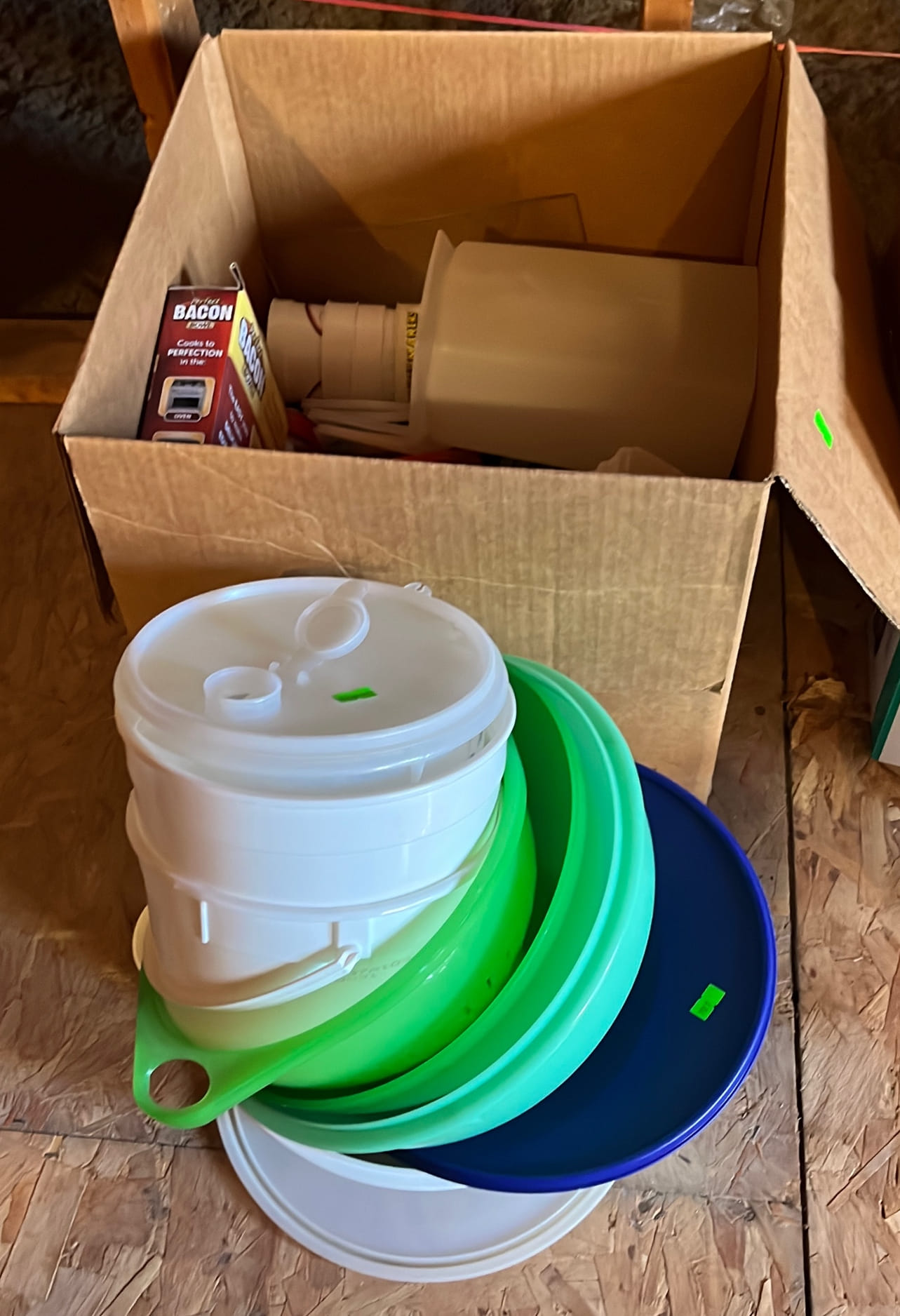 217 Plastic containers, Cuisinart collapsible popcorn bowl contents of cabinet as shown in pictures