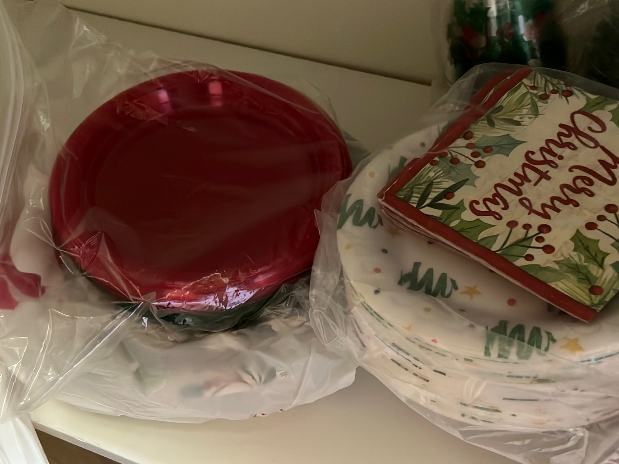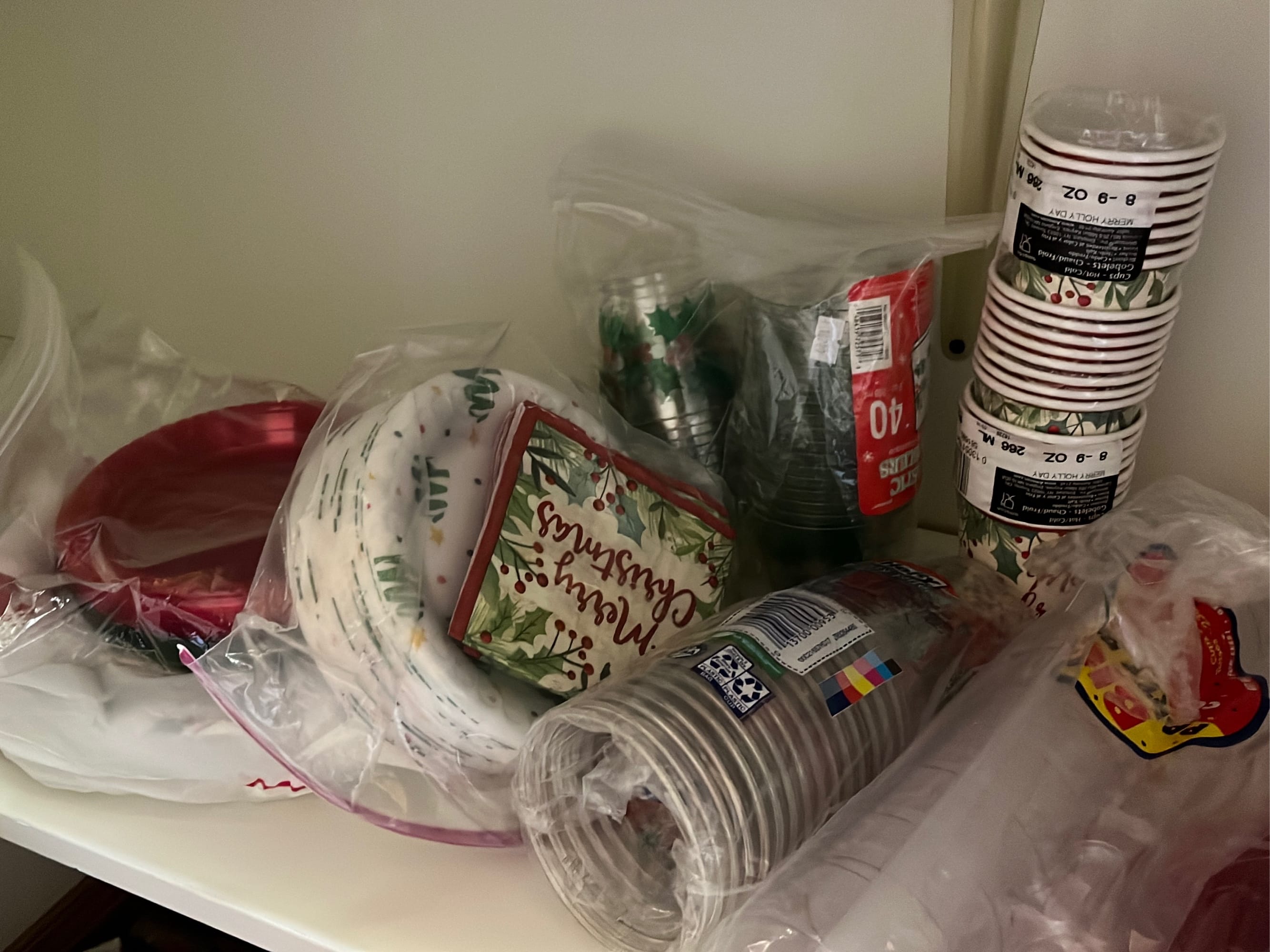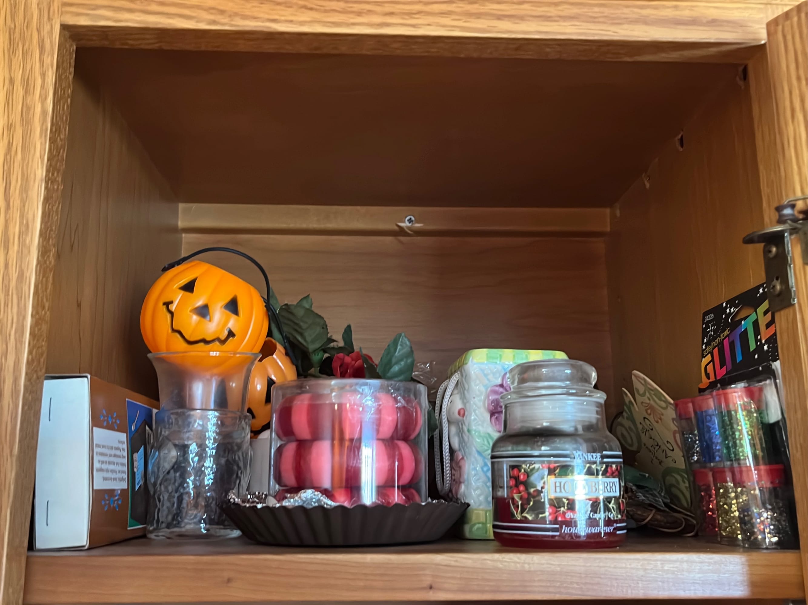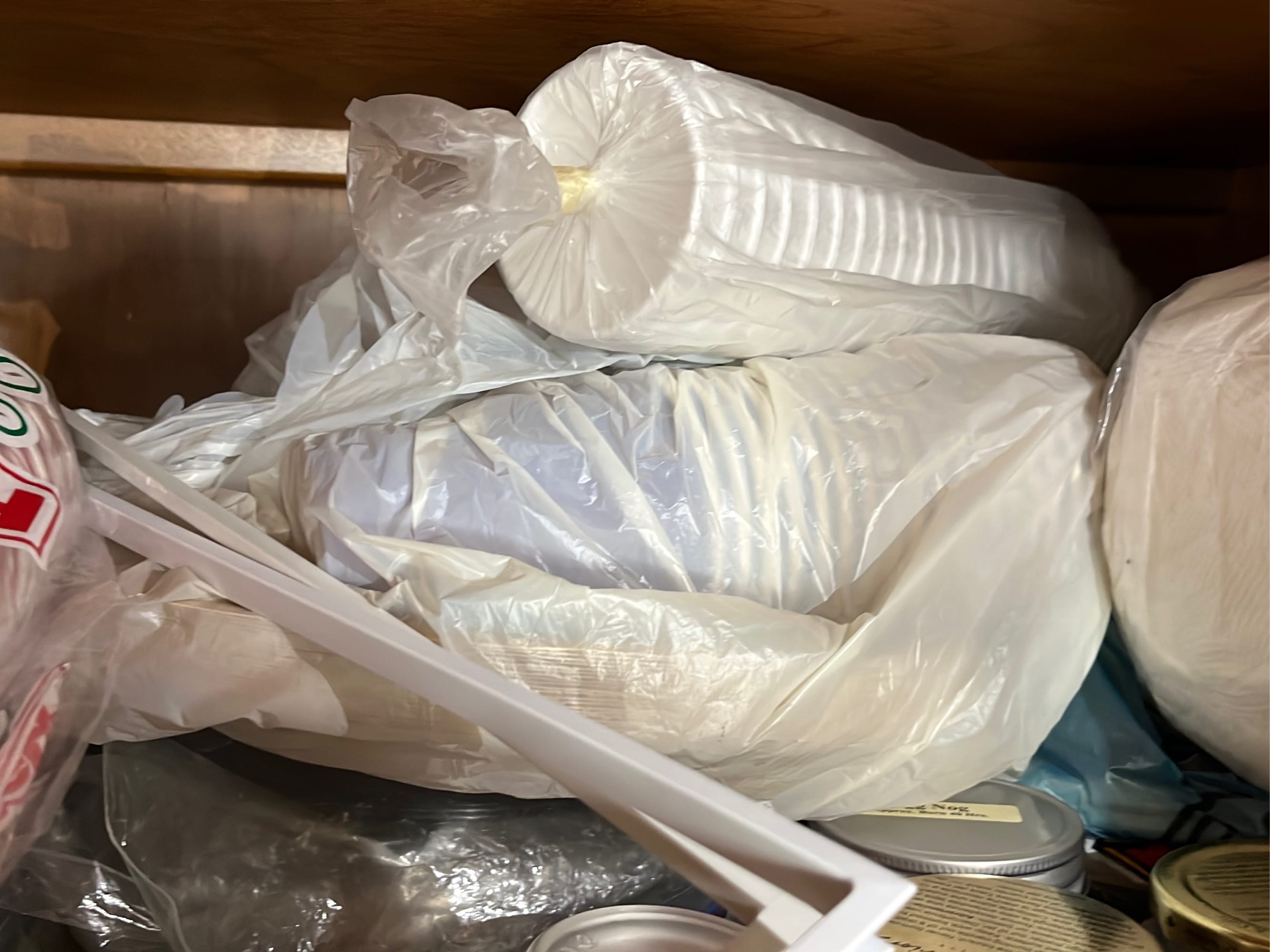 215 Paper and plastic ware, candles contents of cabinet as shown in pictures