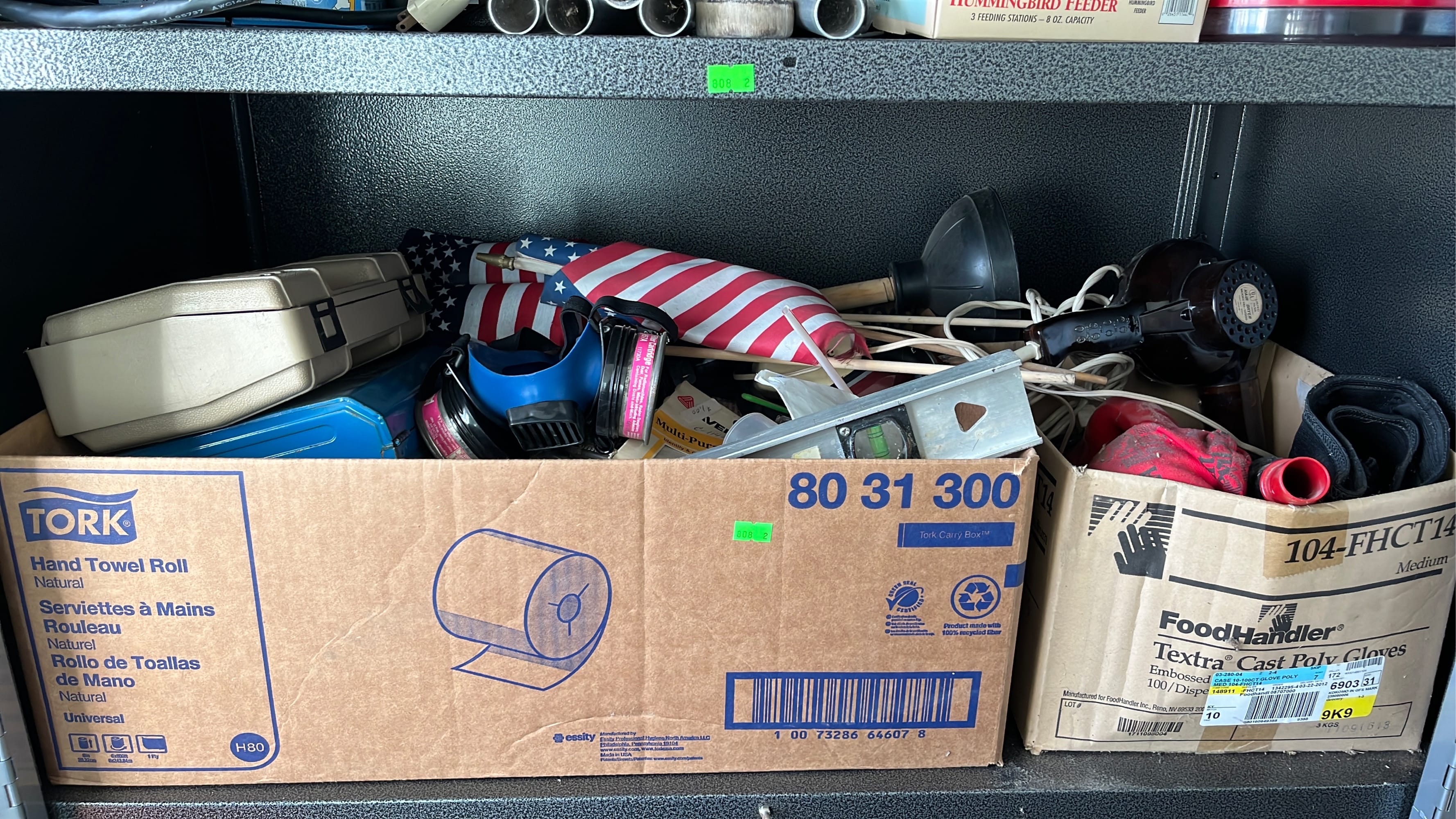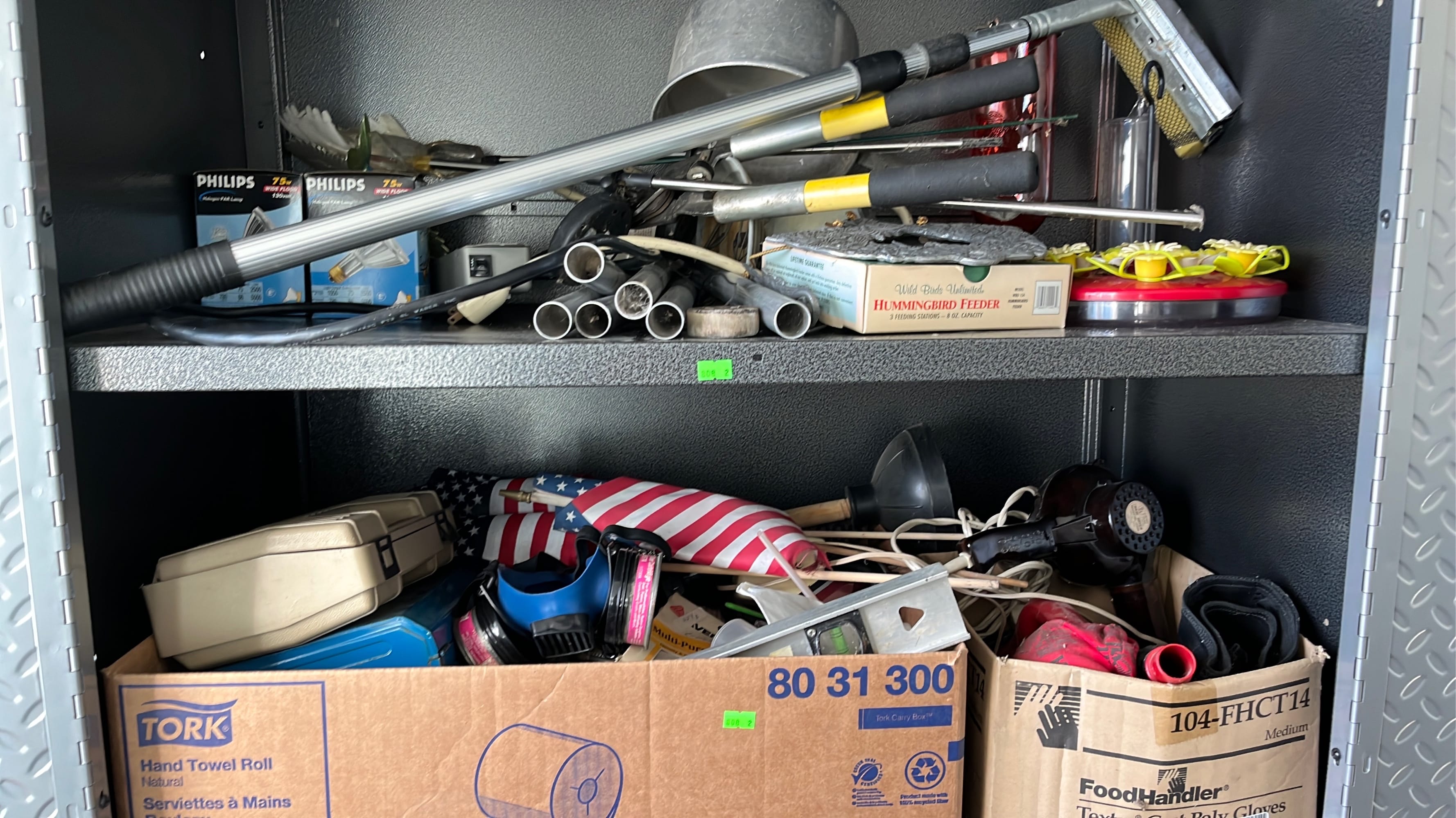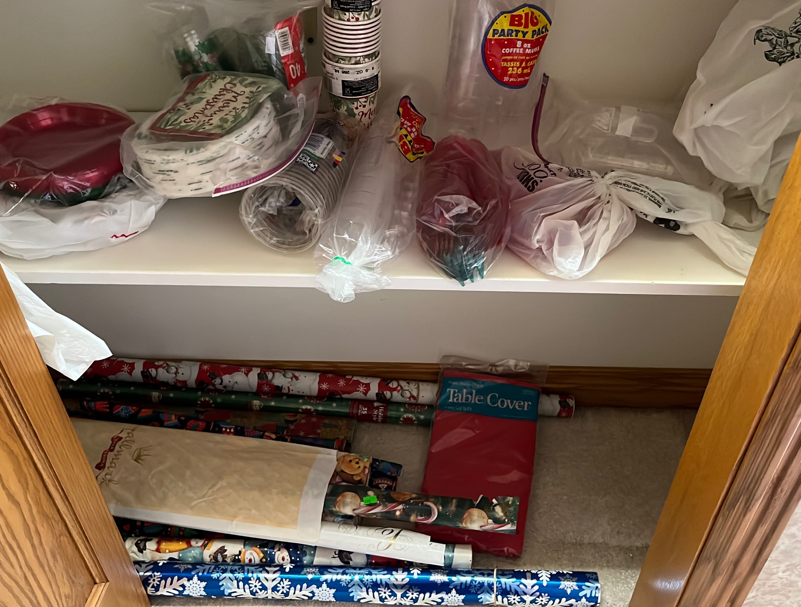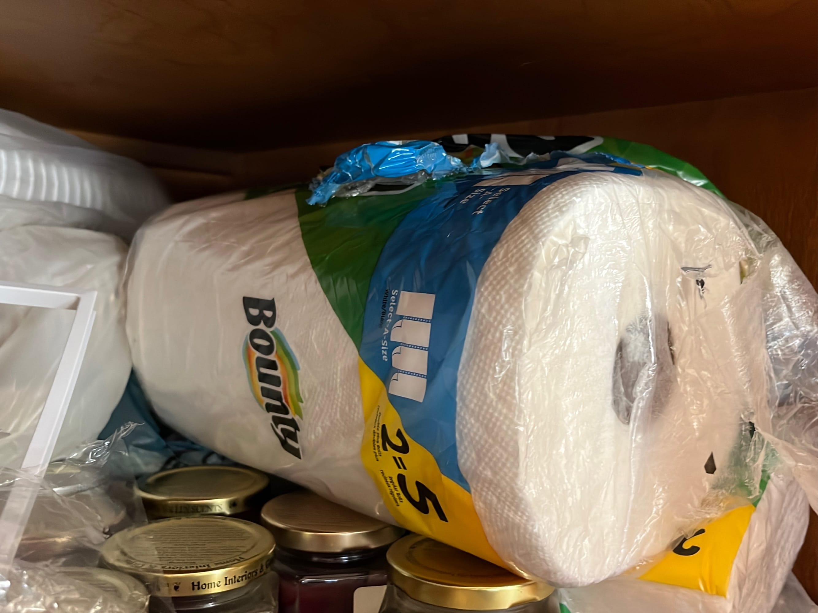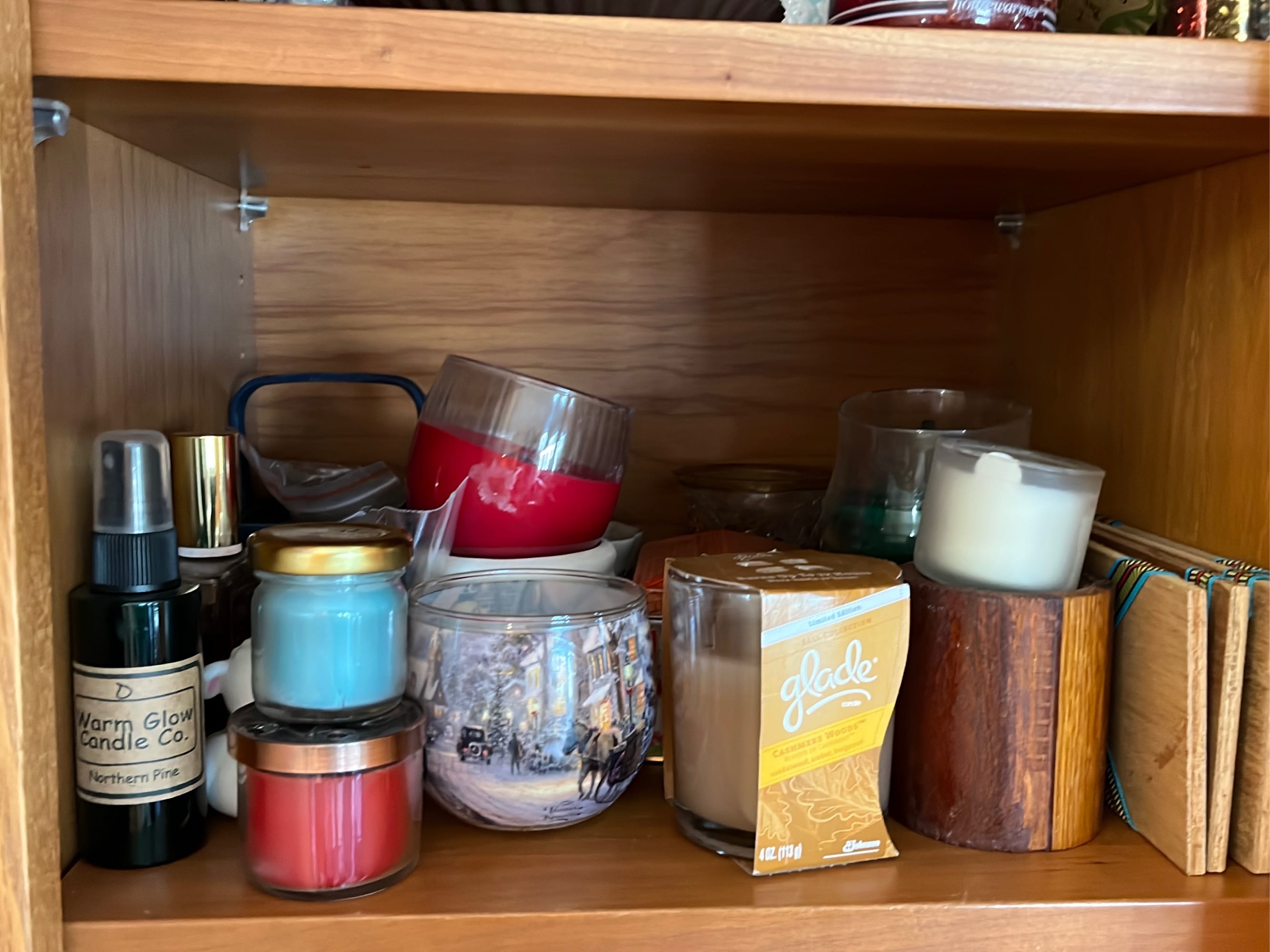 215 Paper and plastic ware, candles contents of cabinet as shown in pictures