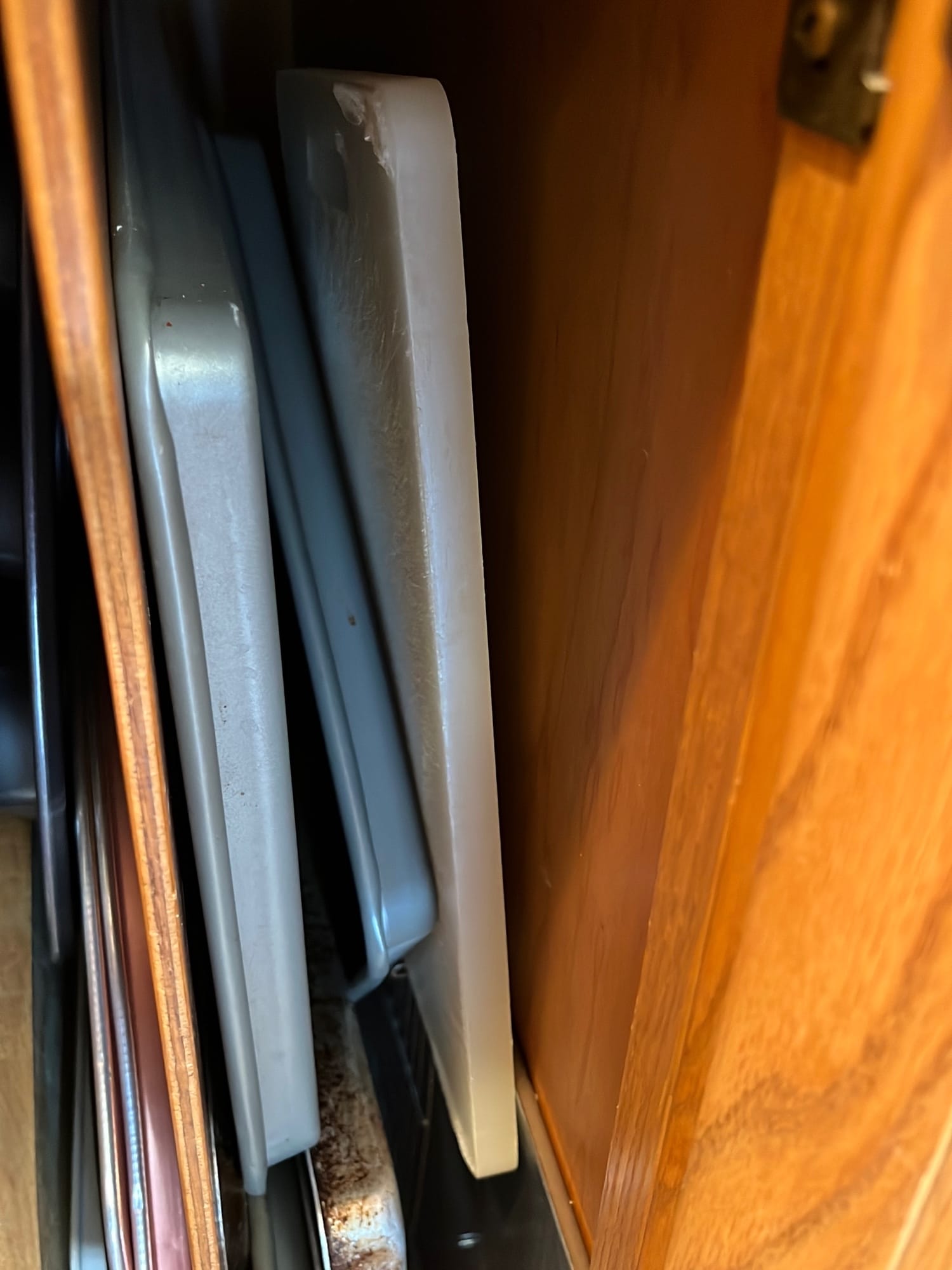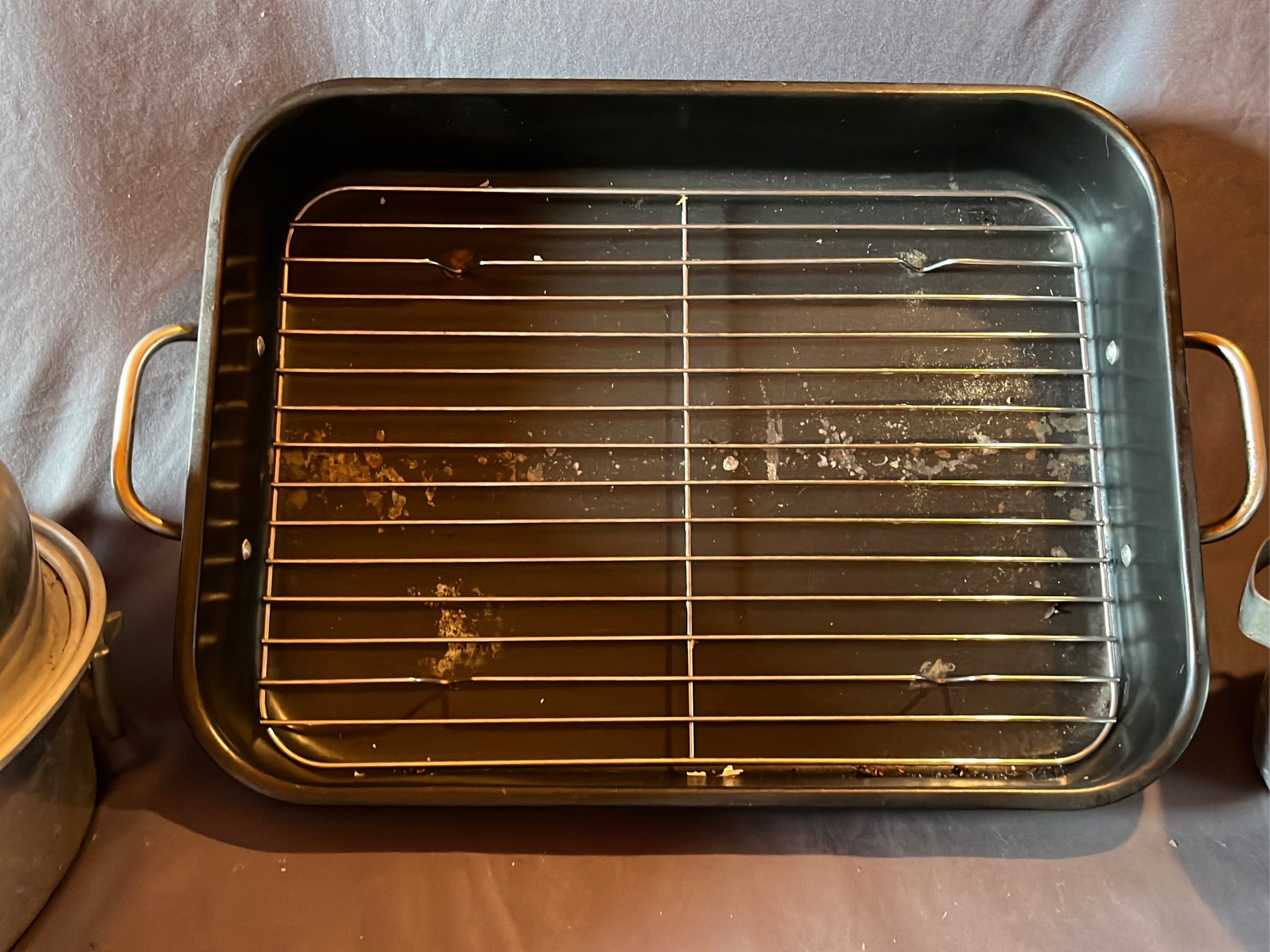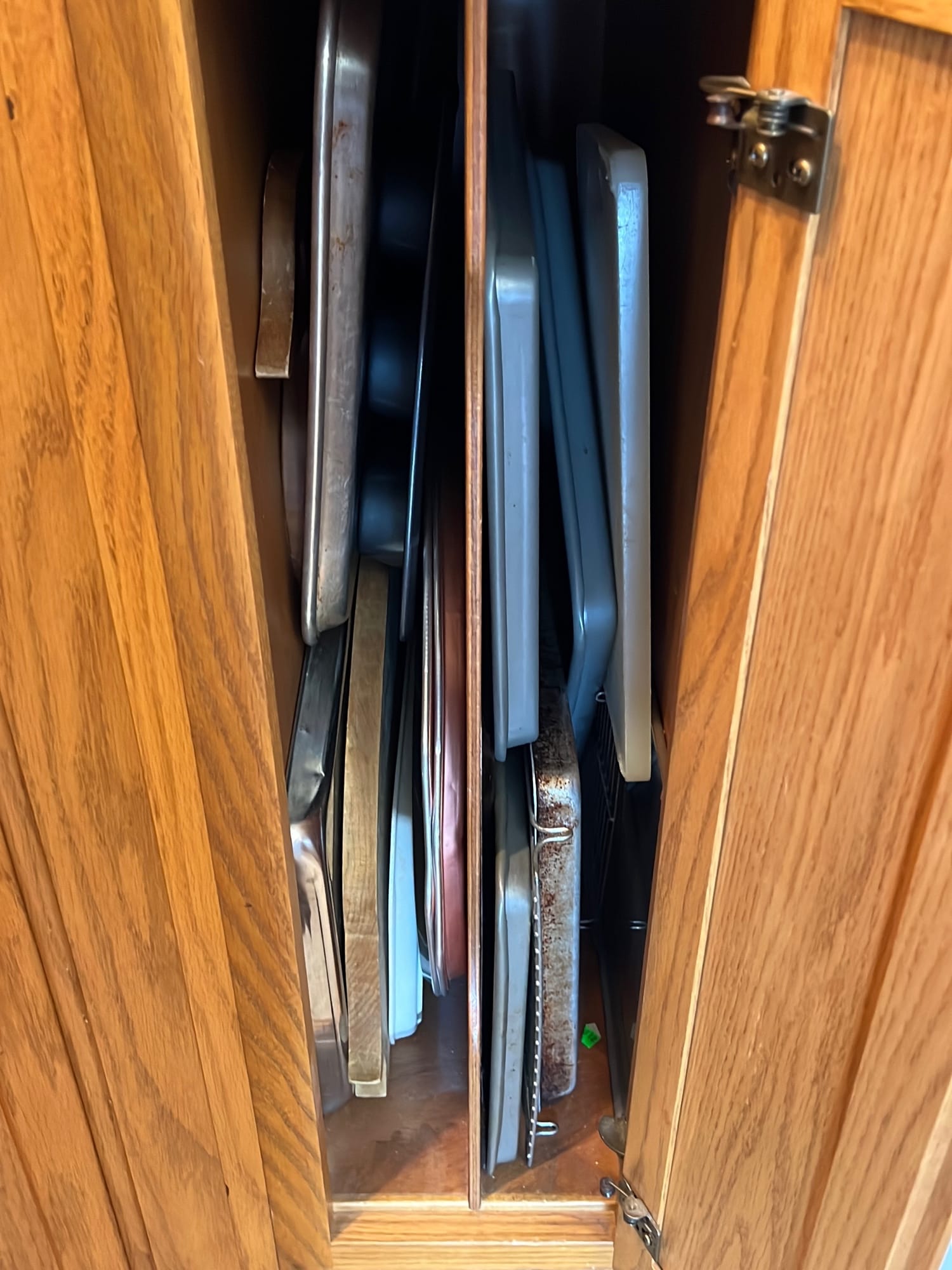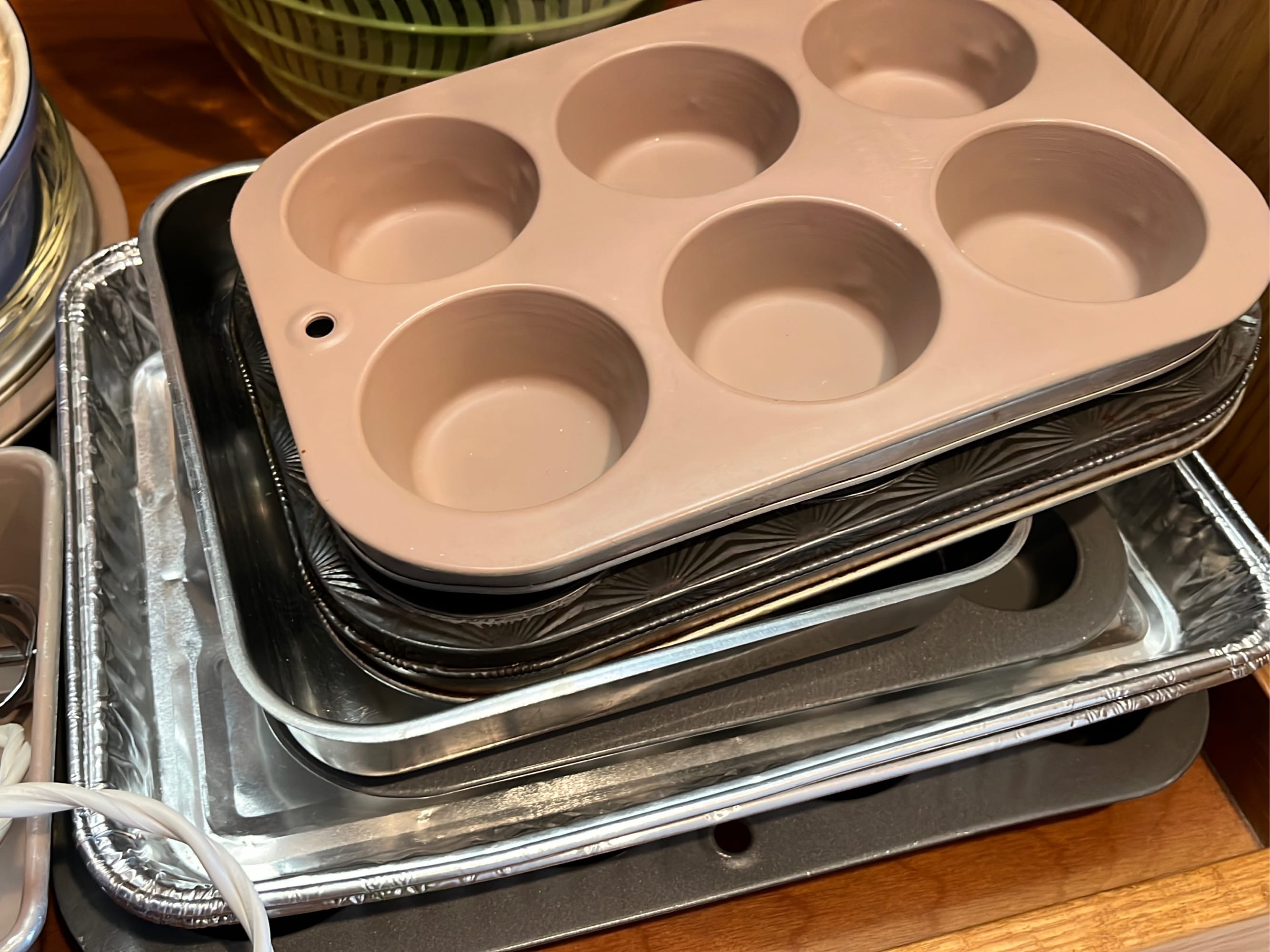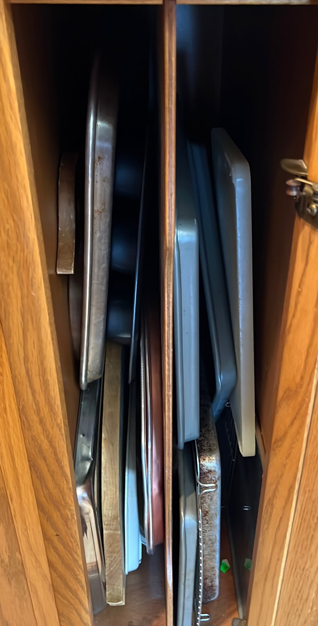 216 Cookie sheets and muffin pans, wood pig cutting board