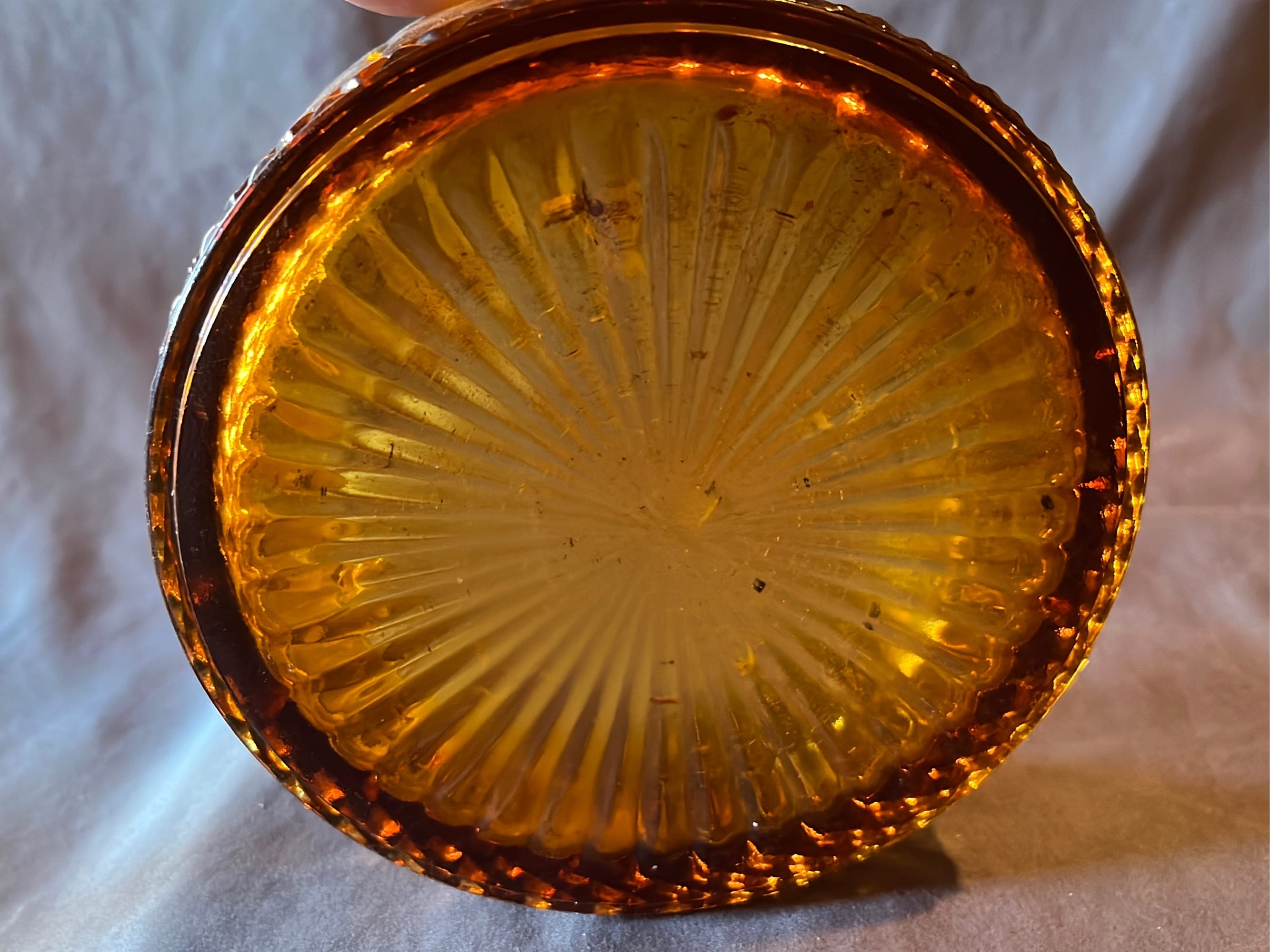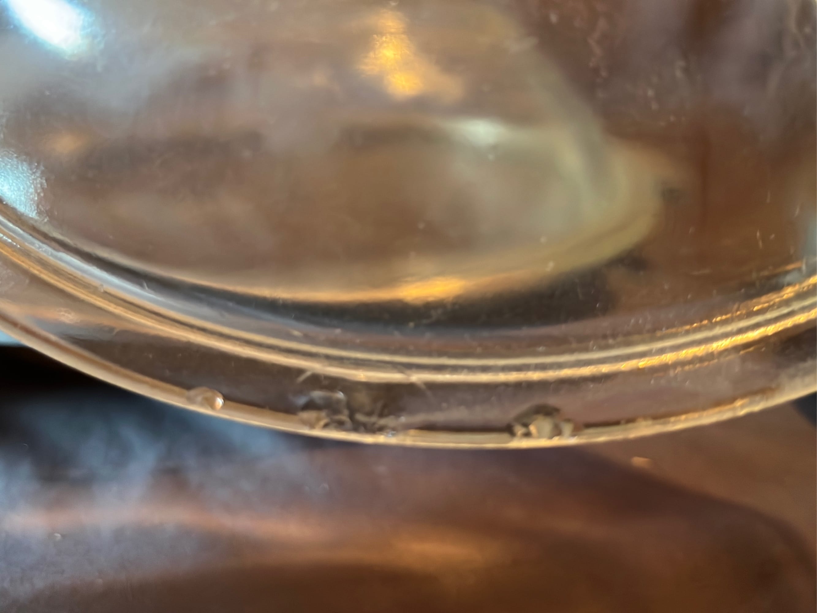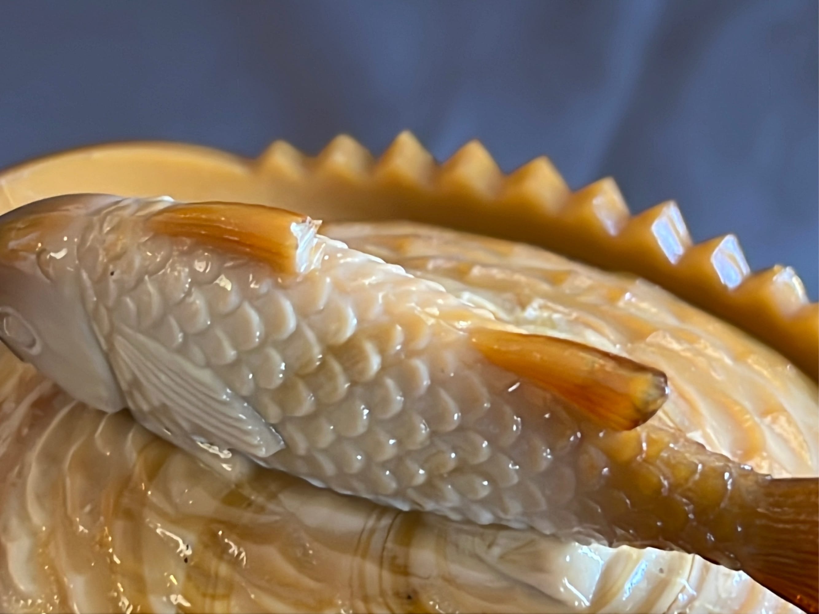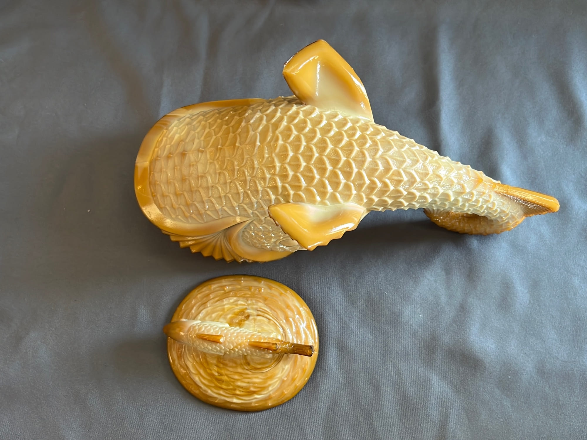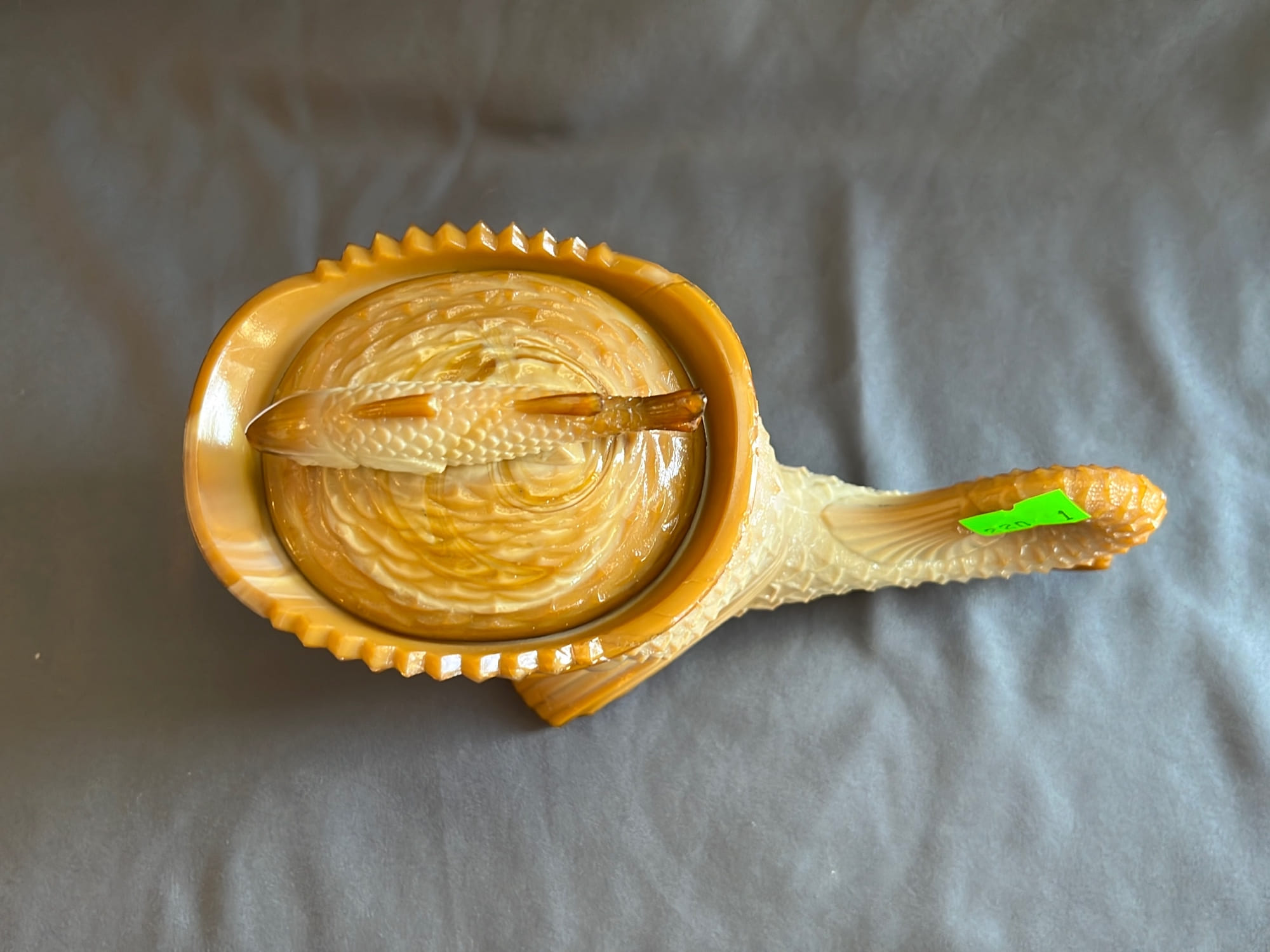 220 Greentown Chocolate Slag sawtooth dolphin, fin on top lid fish is chipped, 6x4.5in
