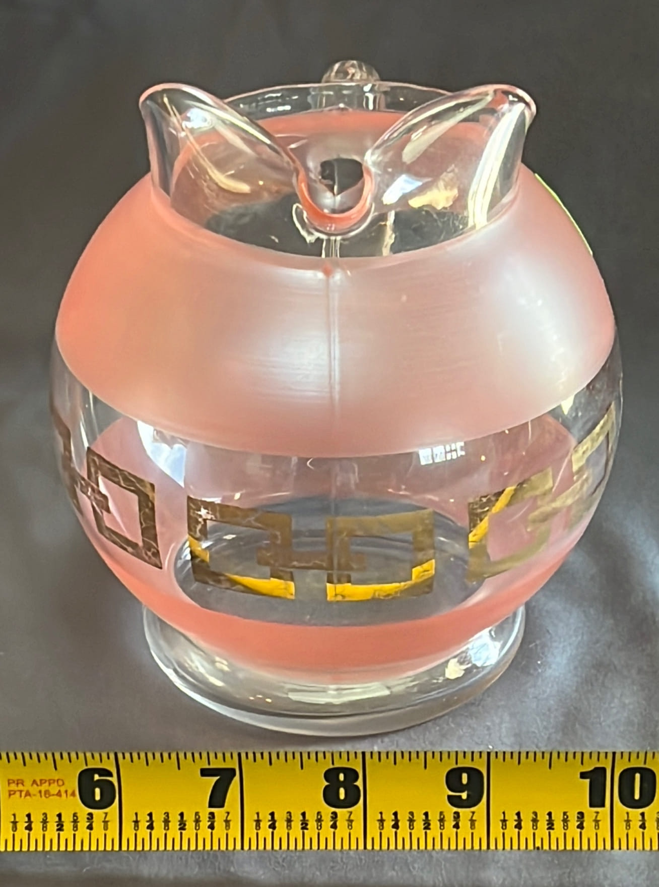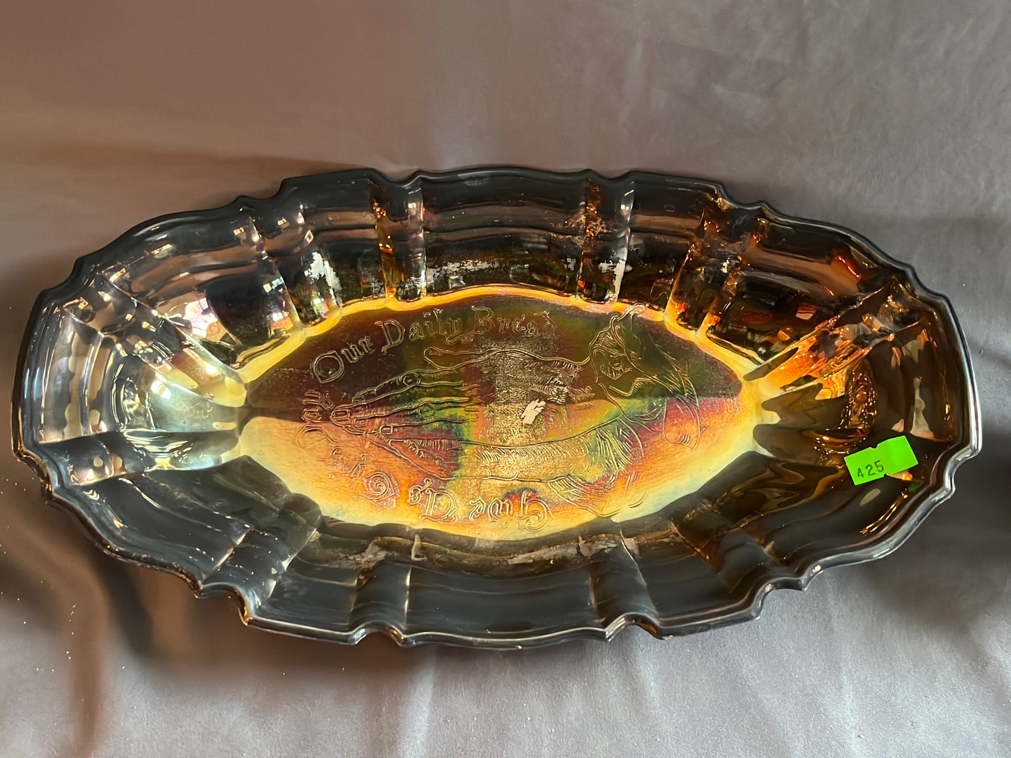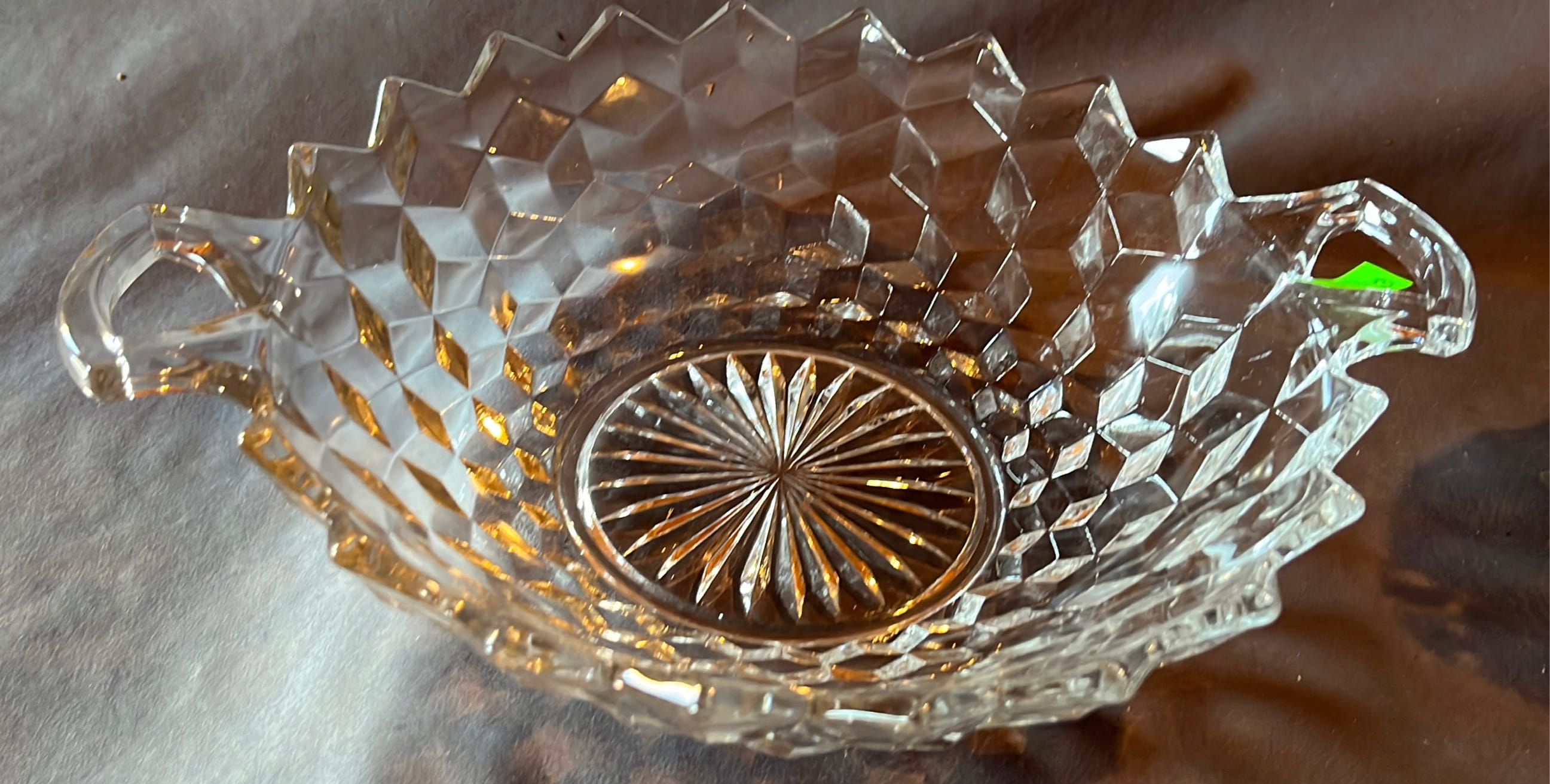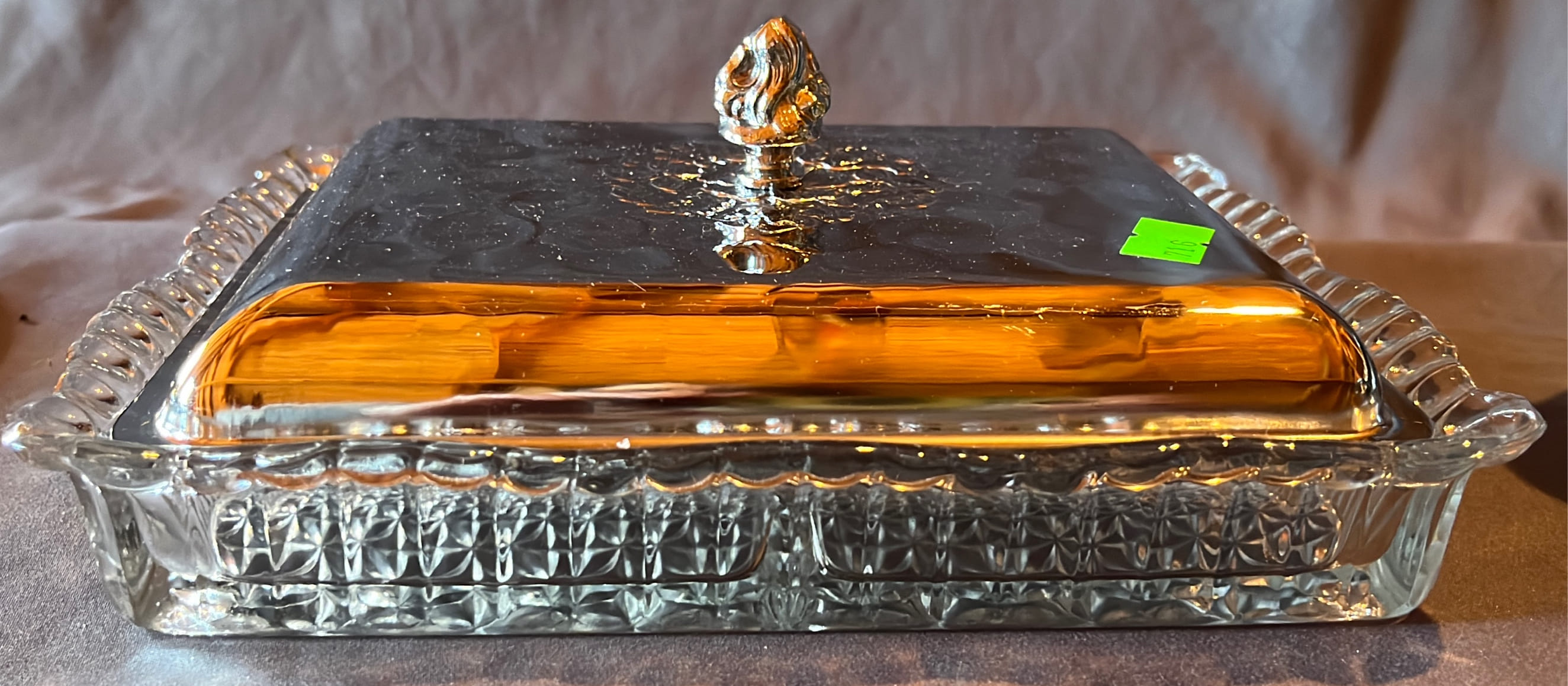 220 Greentown Chocolate Slag sawtooth dolphin, fin on top lid fish is chipped, 6x4.5in
