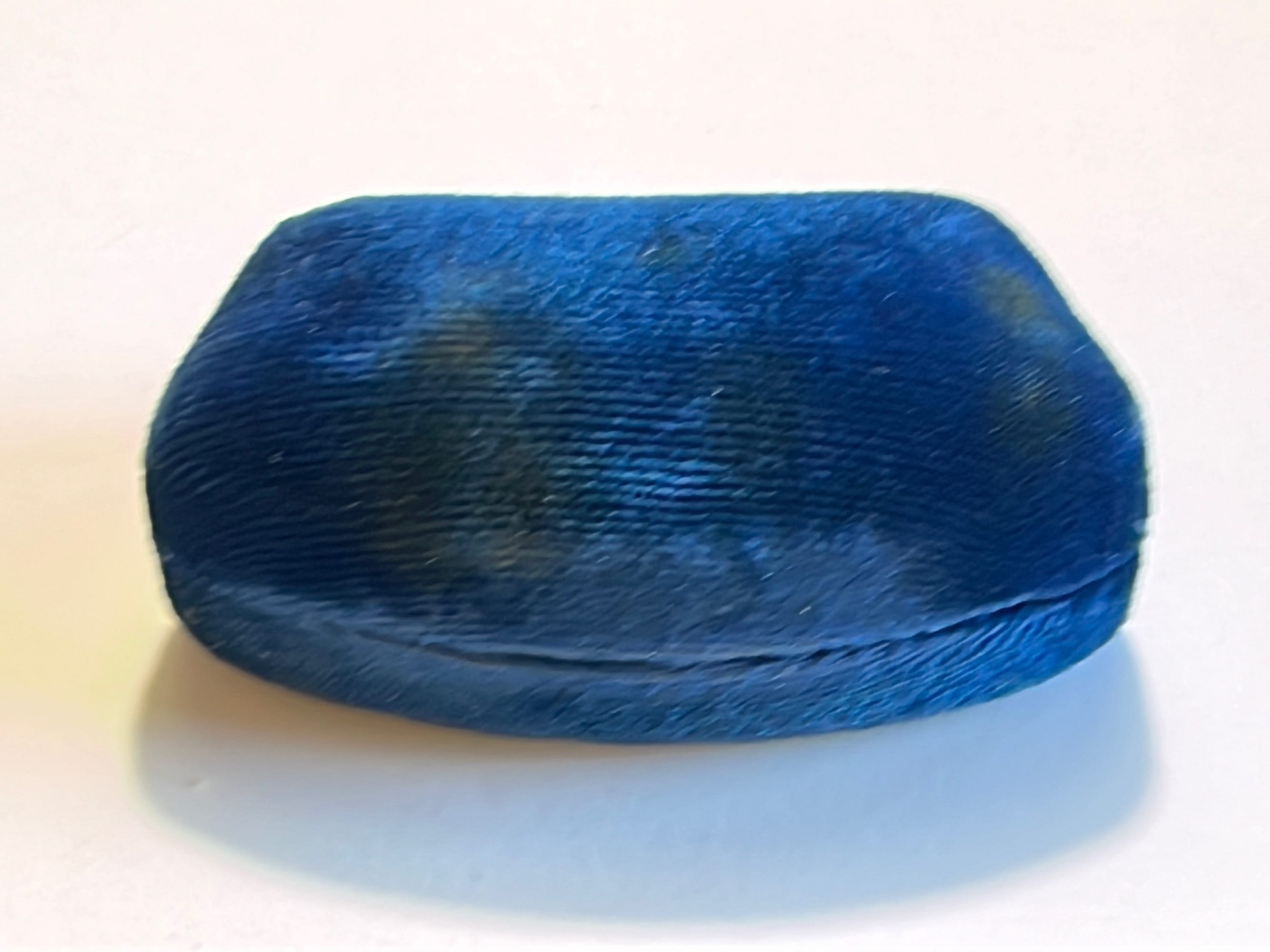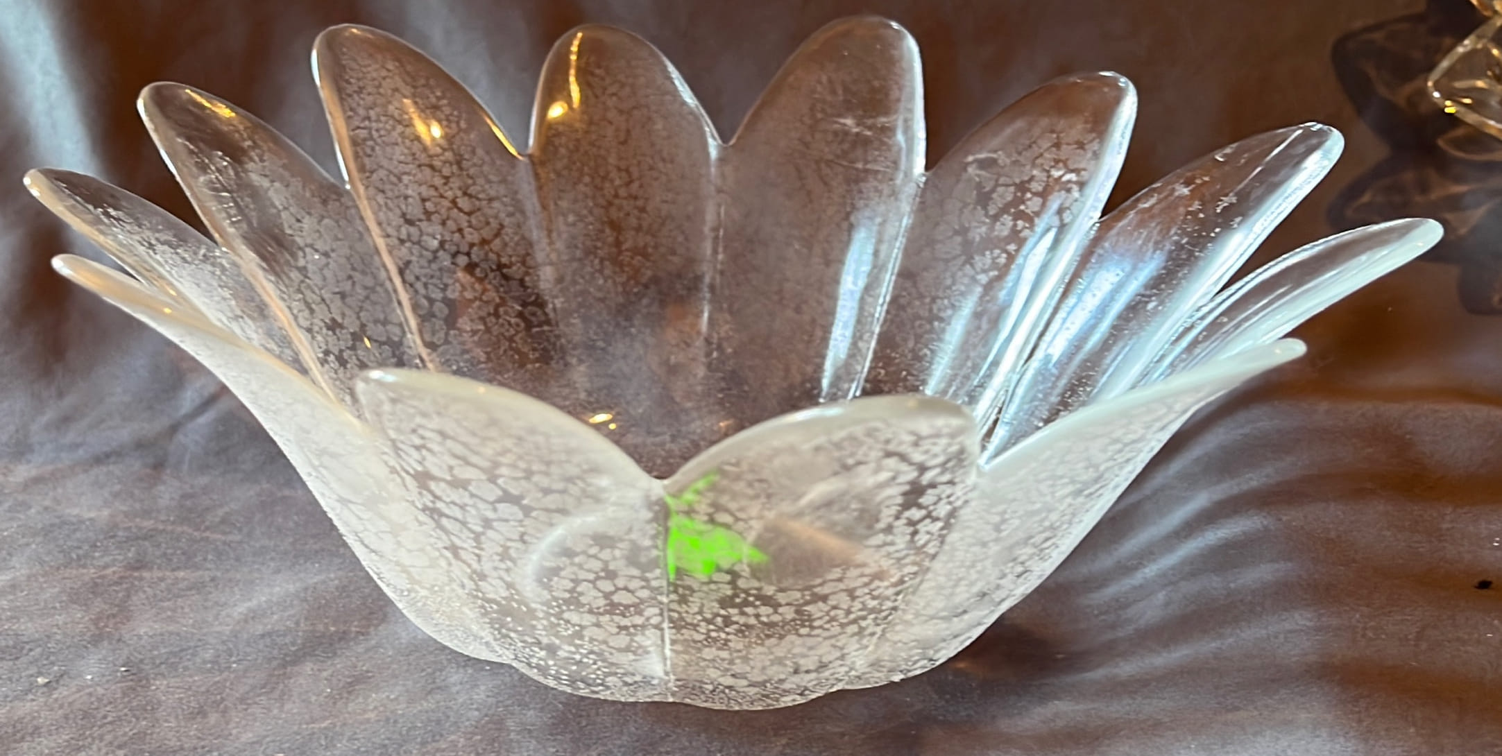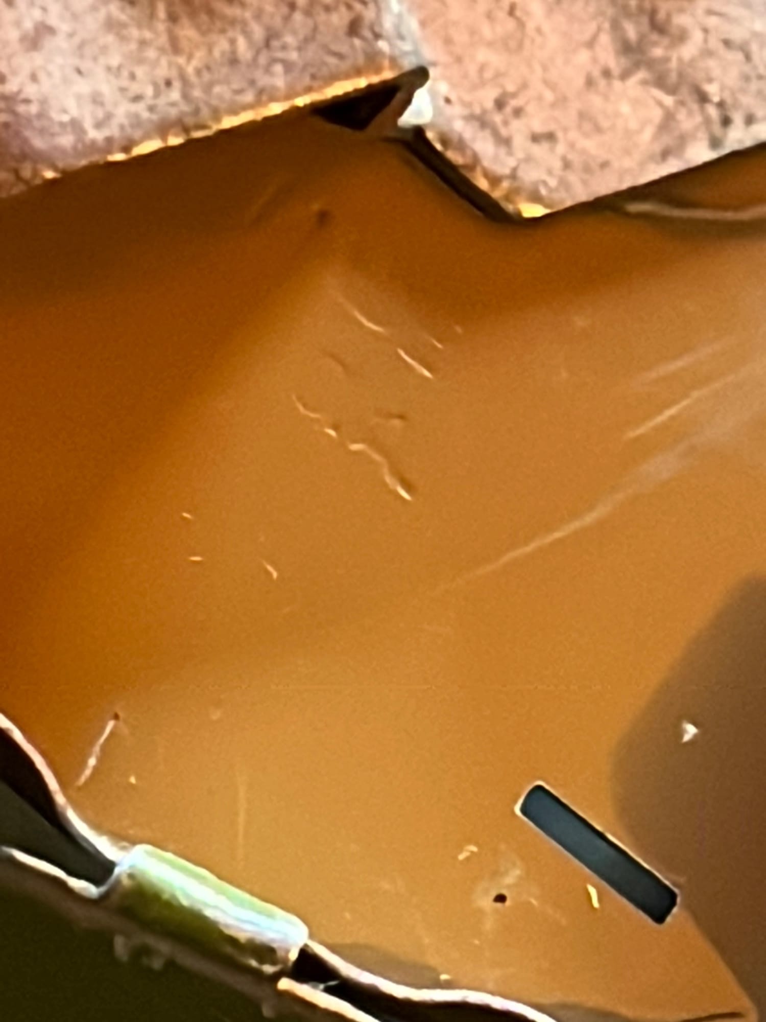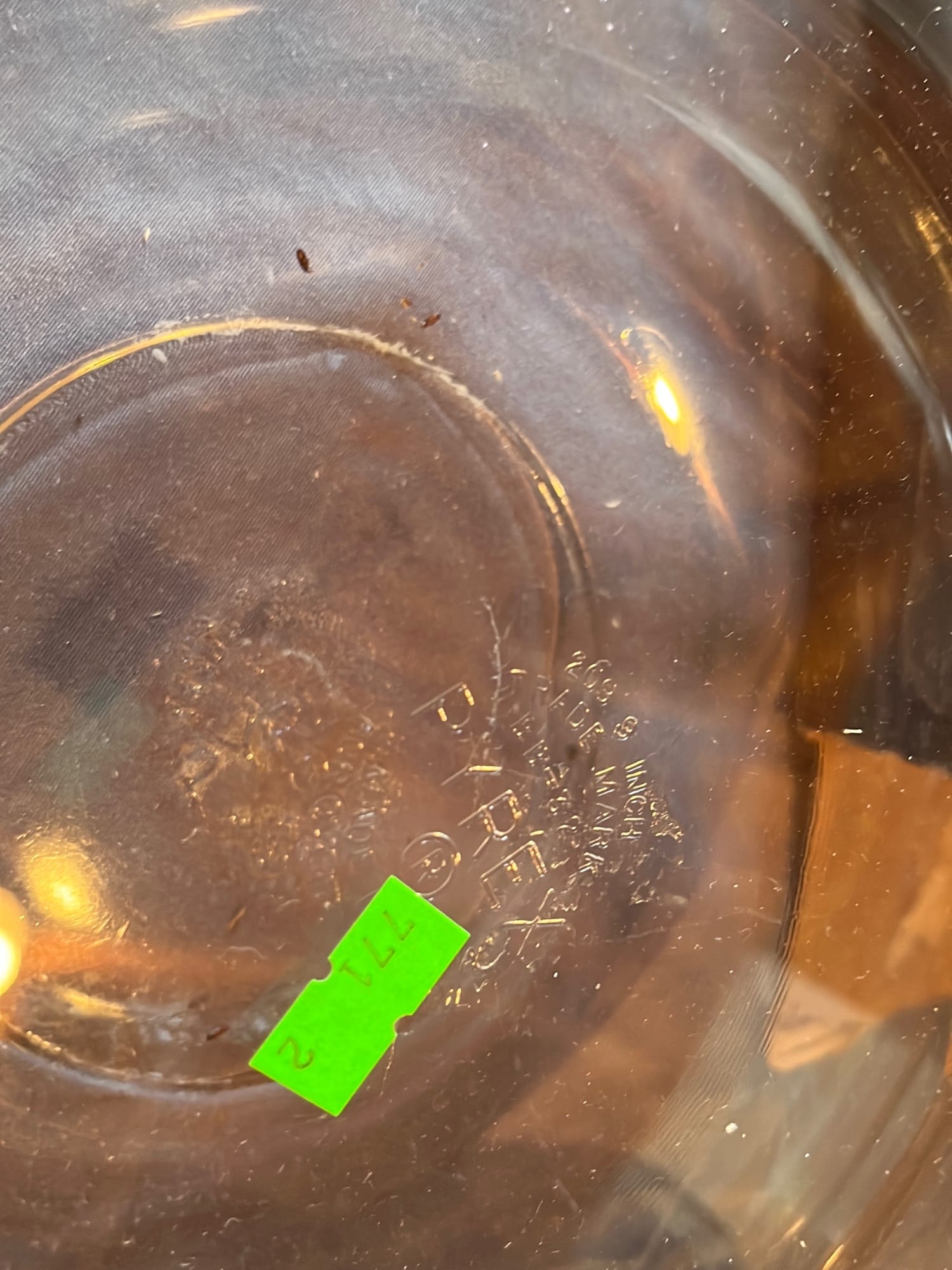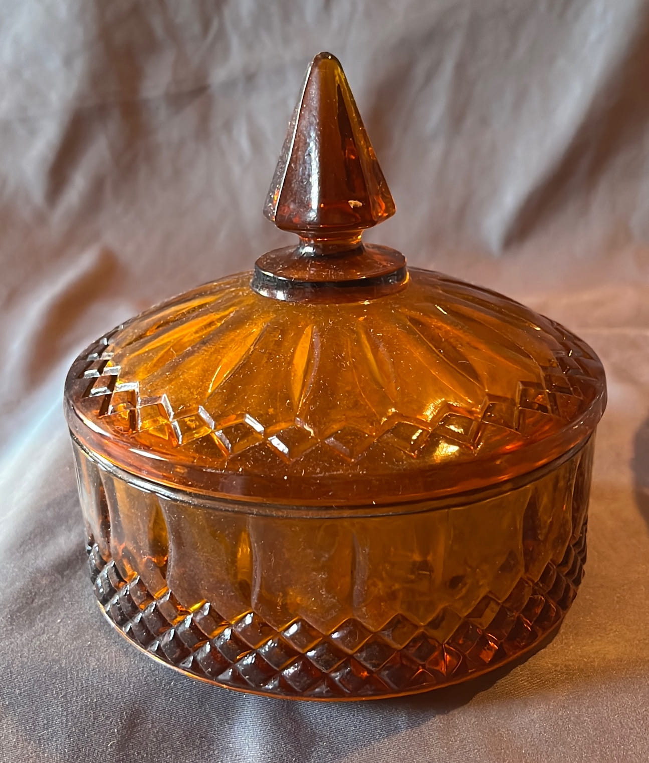 220 Greentown Chocolate Slag sawtooth dolphin, fin on top lid fish is chipped, 6x4.5in