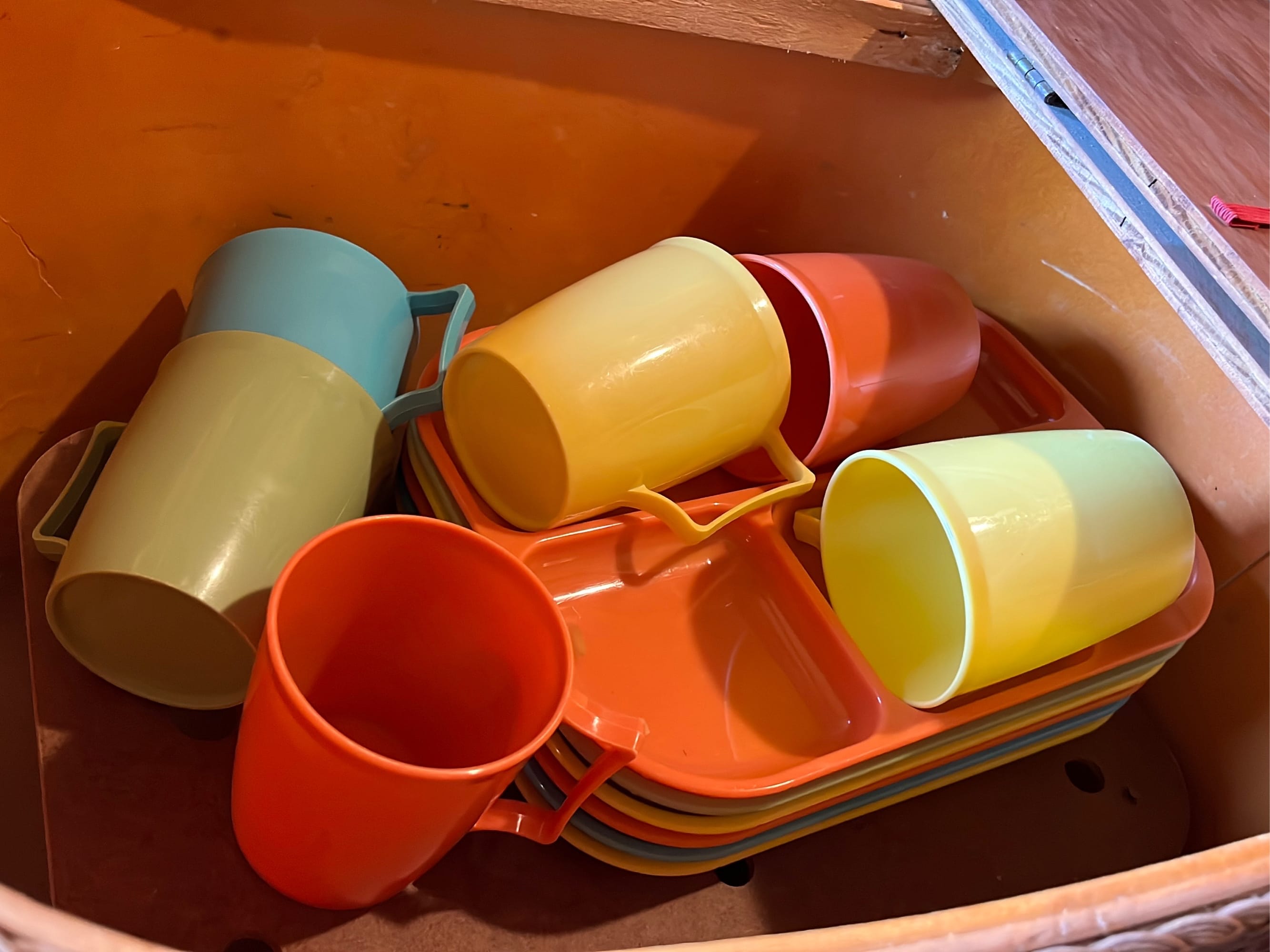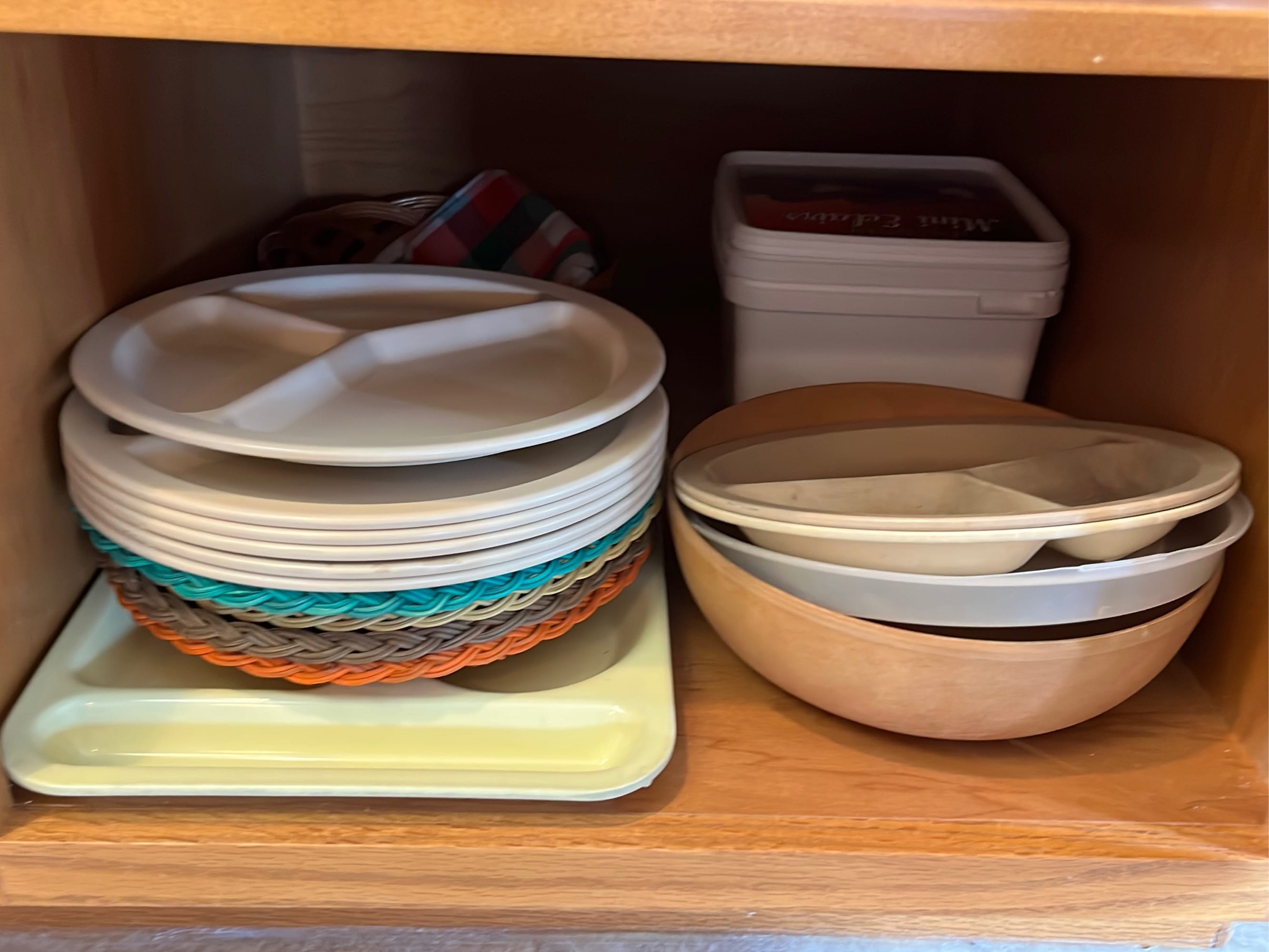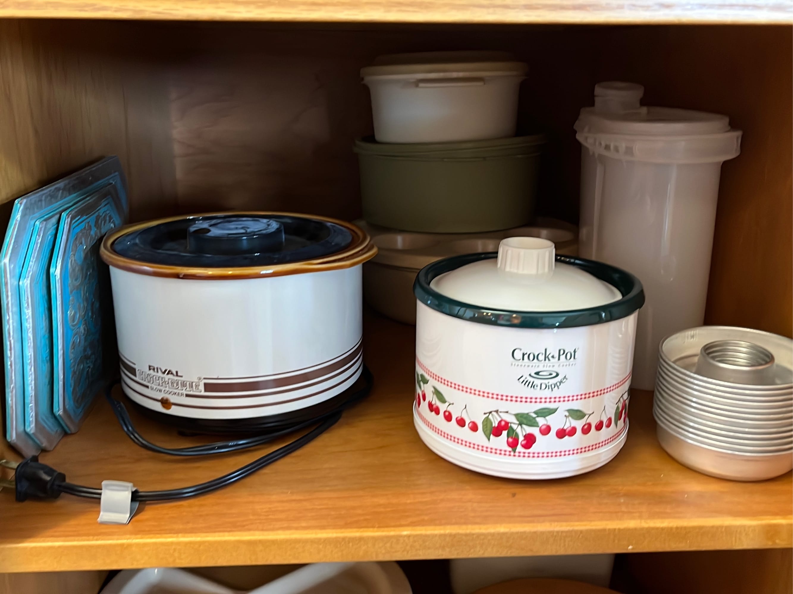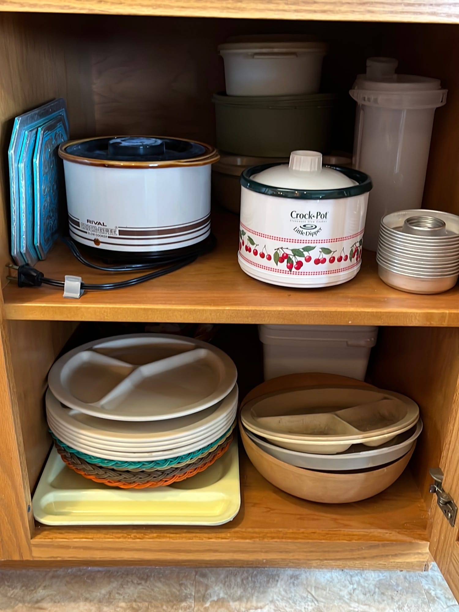 229 Mini Crock pots, plasticware Texasware plates contents of cabinet as shown in pictures