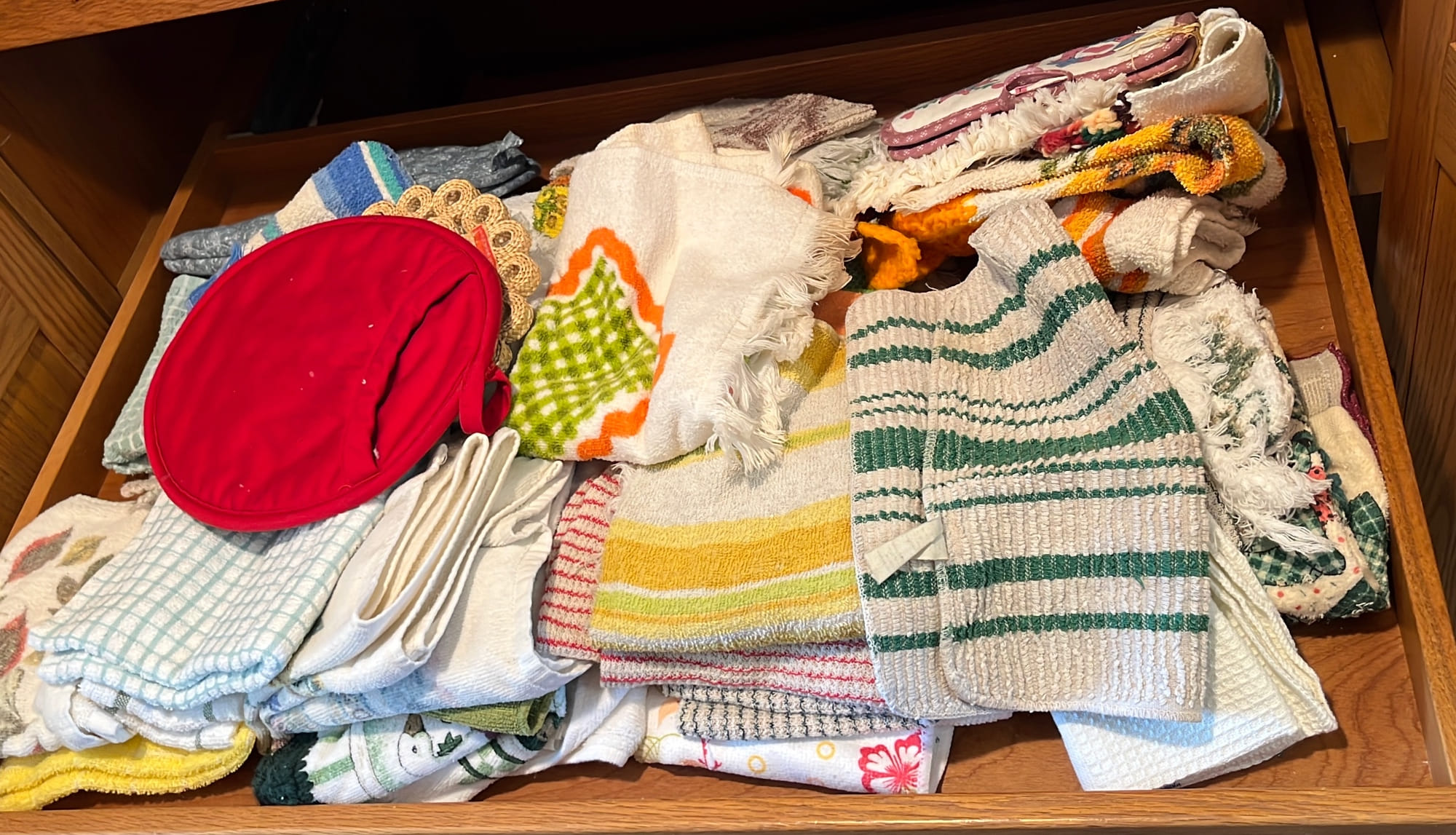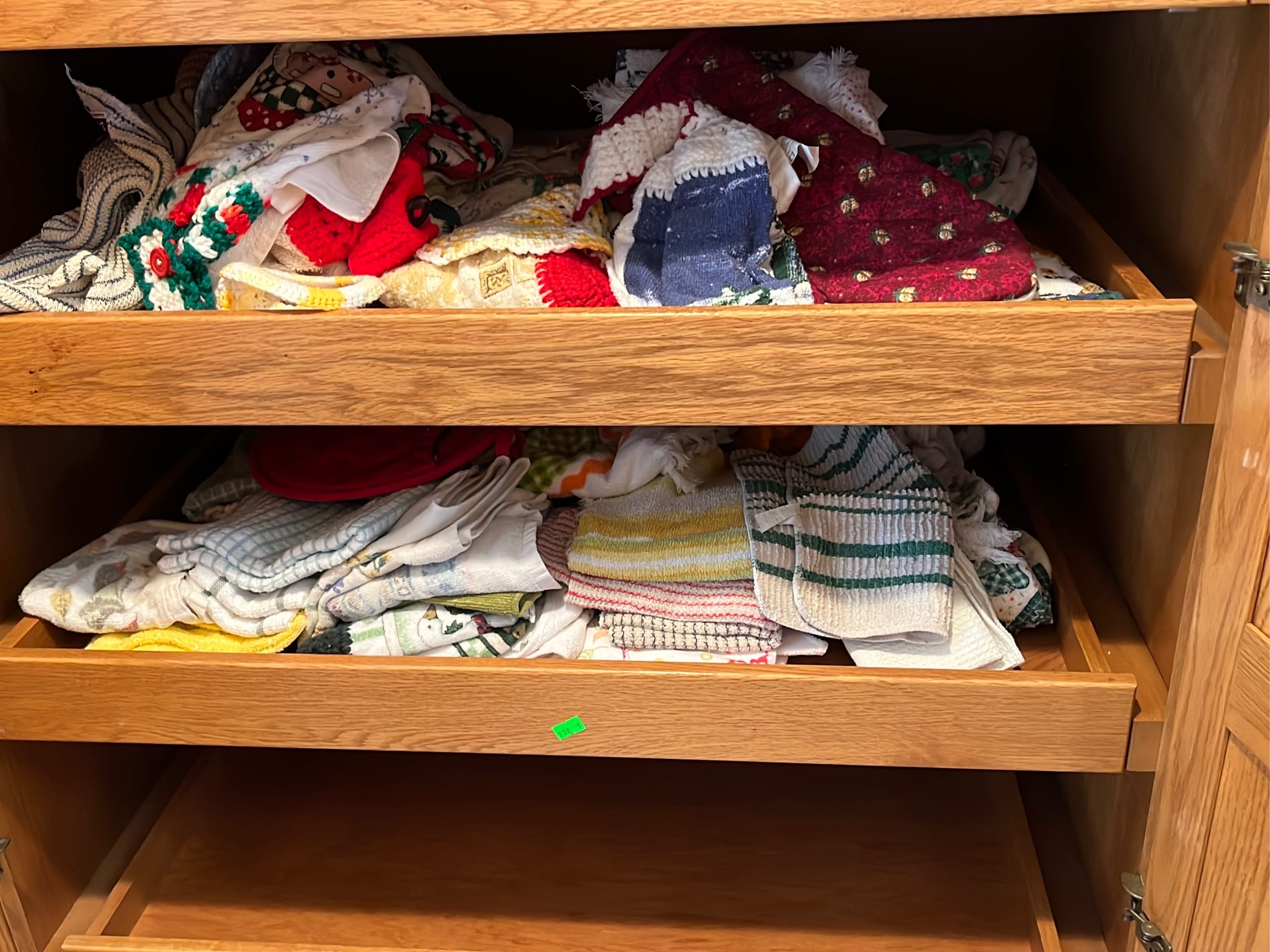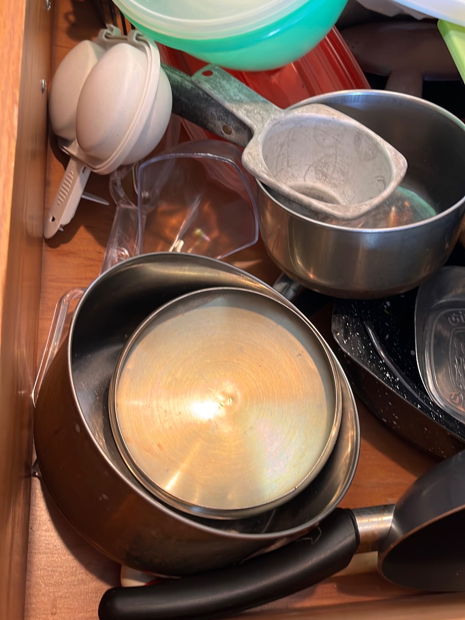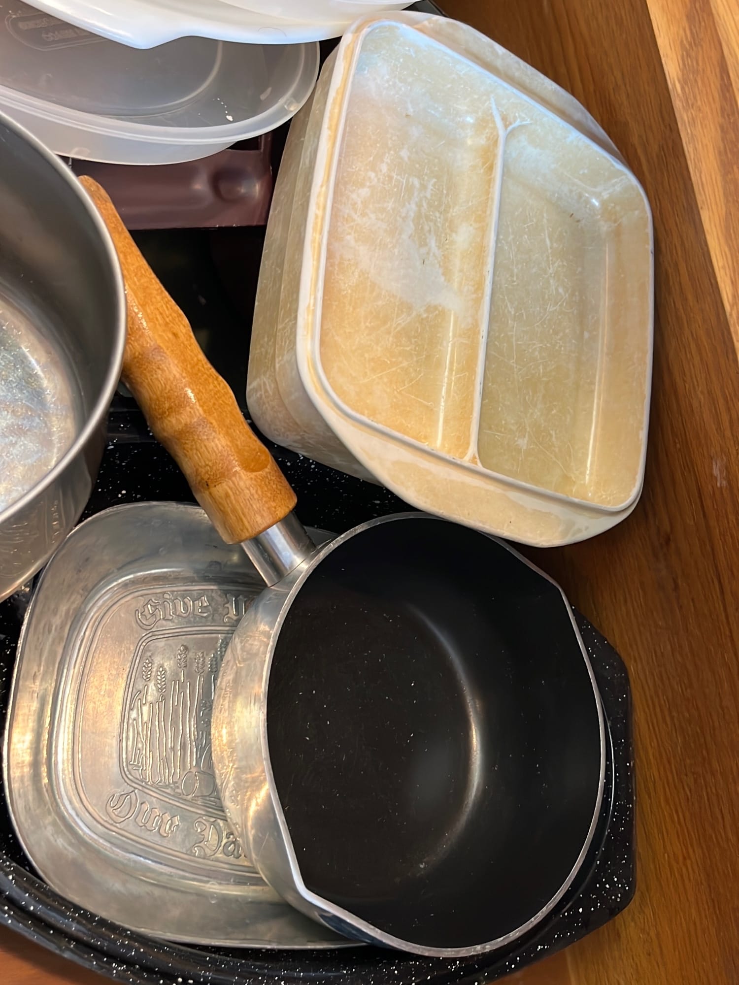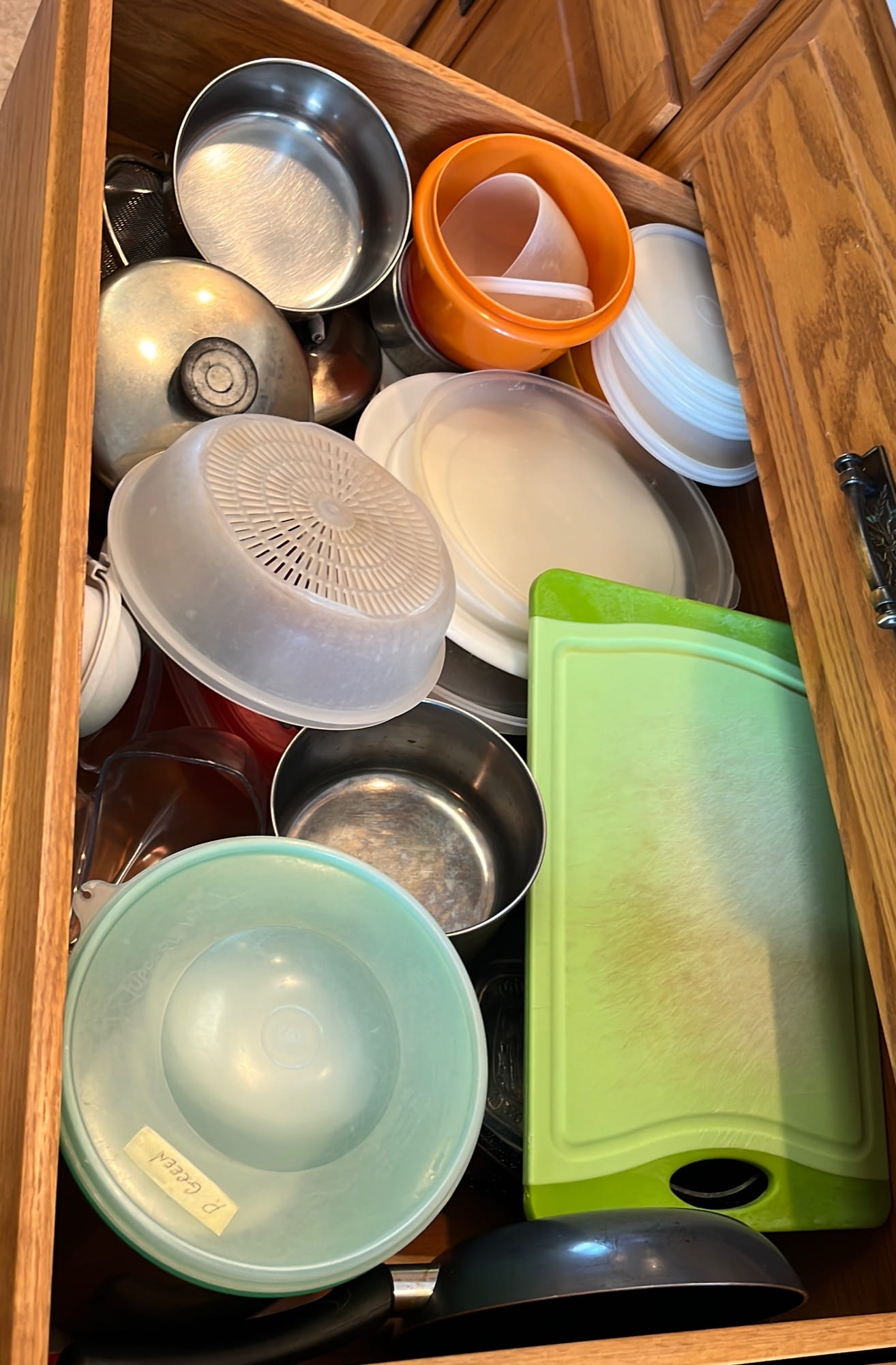 230 Sauce pans and plasticware, granite roaster, contents of drawer as shown in pictures
