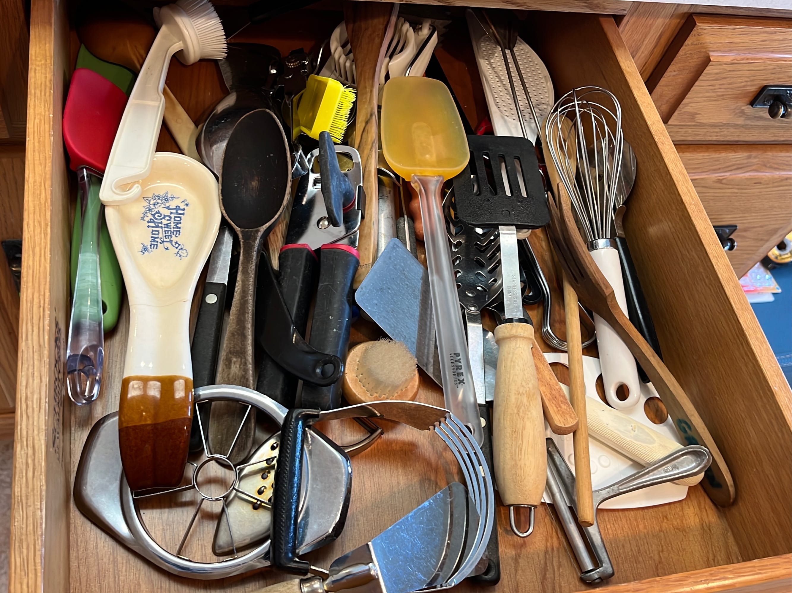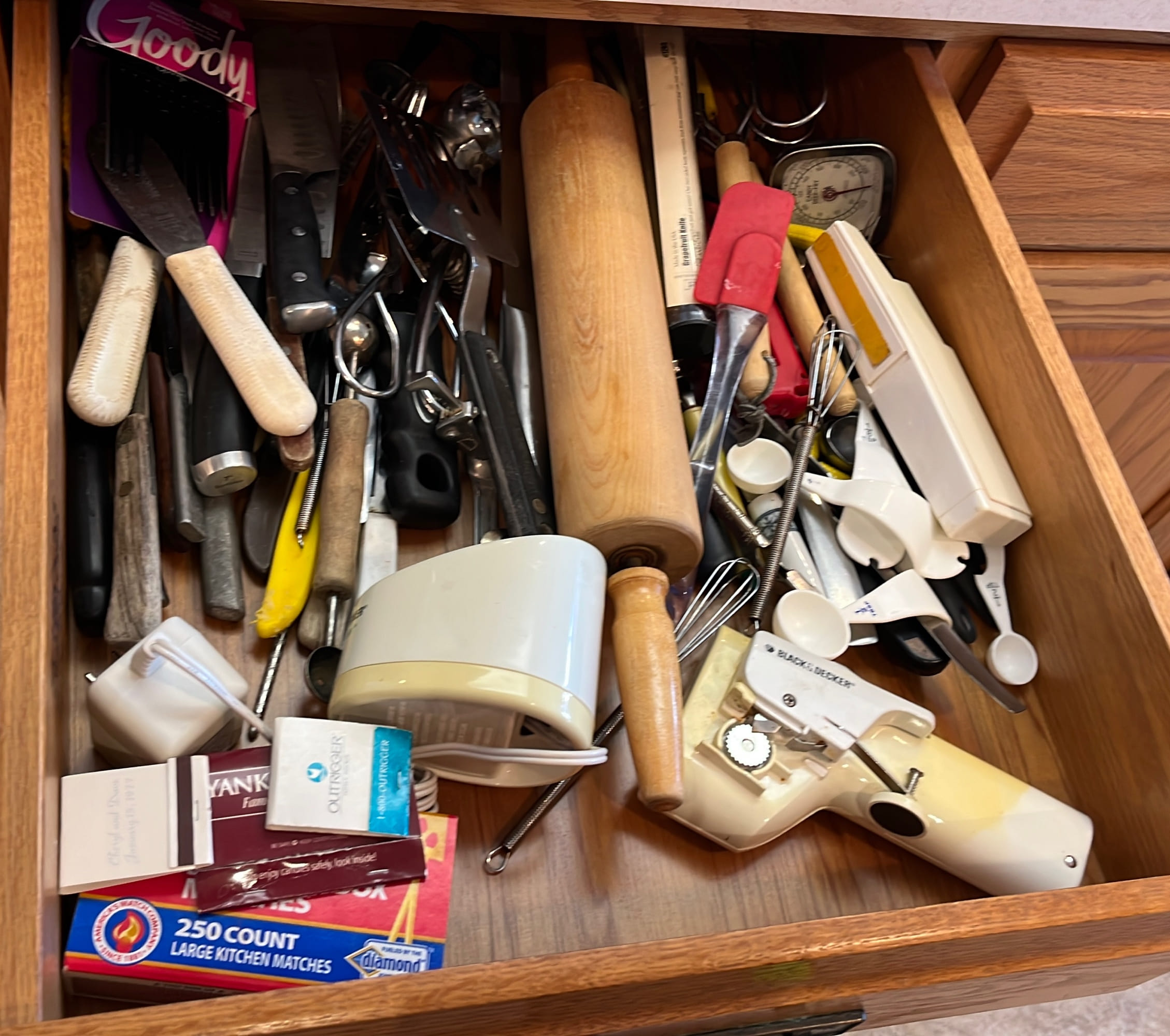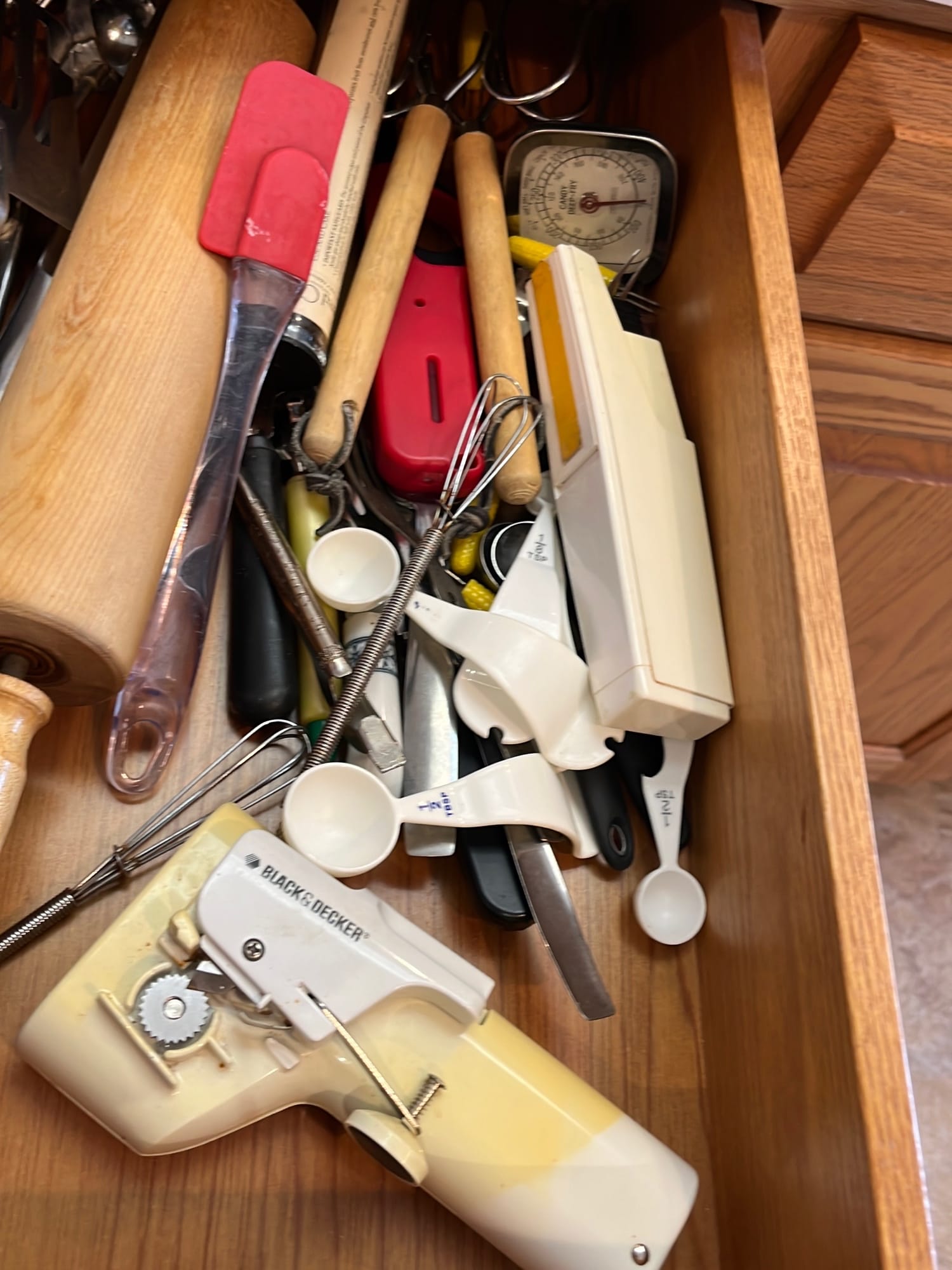 237 Kitchen utensils, can opener, rolling pin contents of drawer as shown in pictures