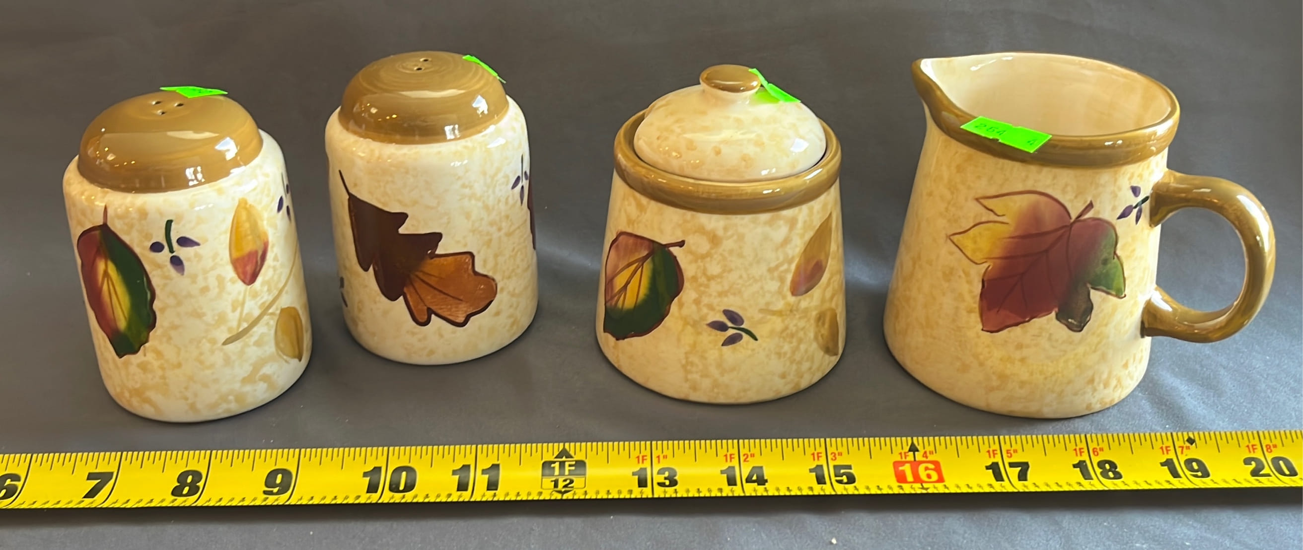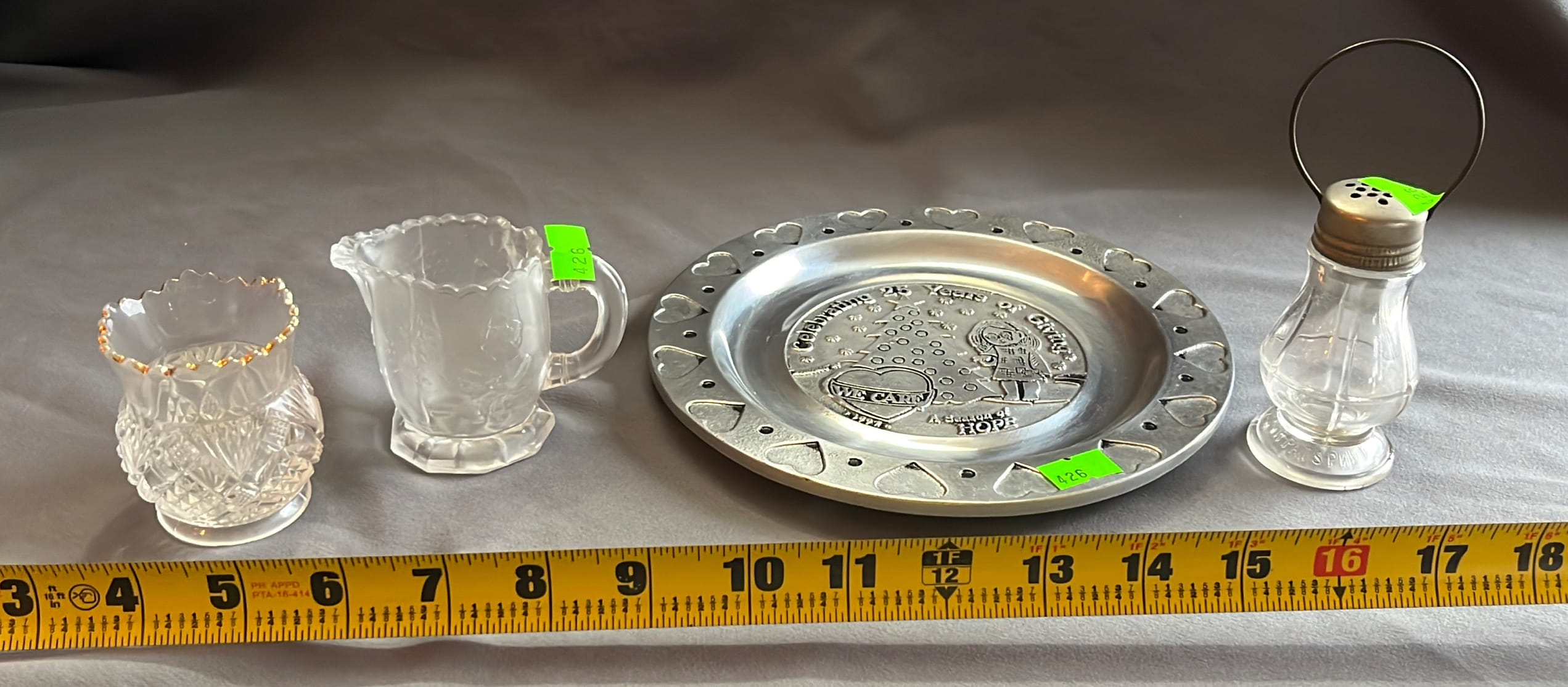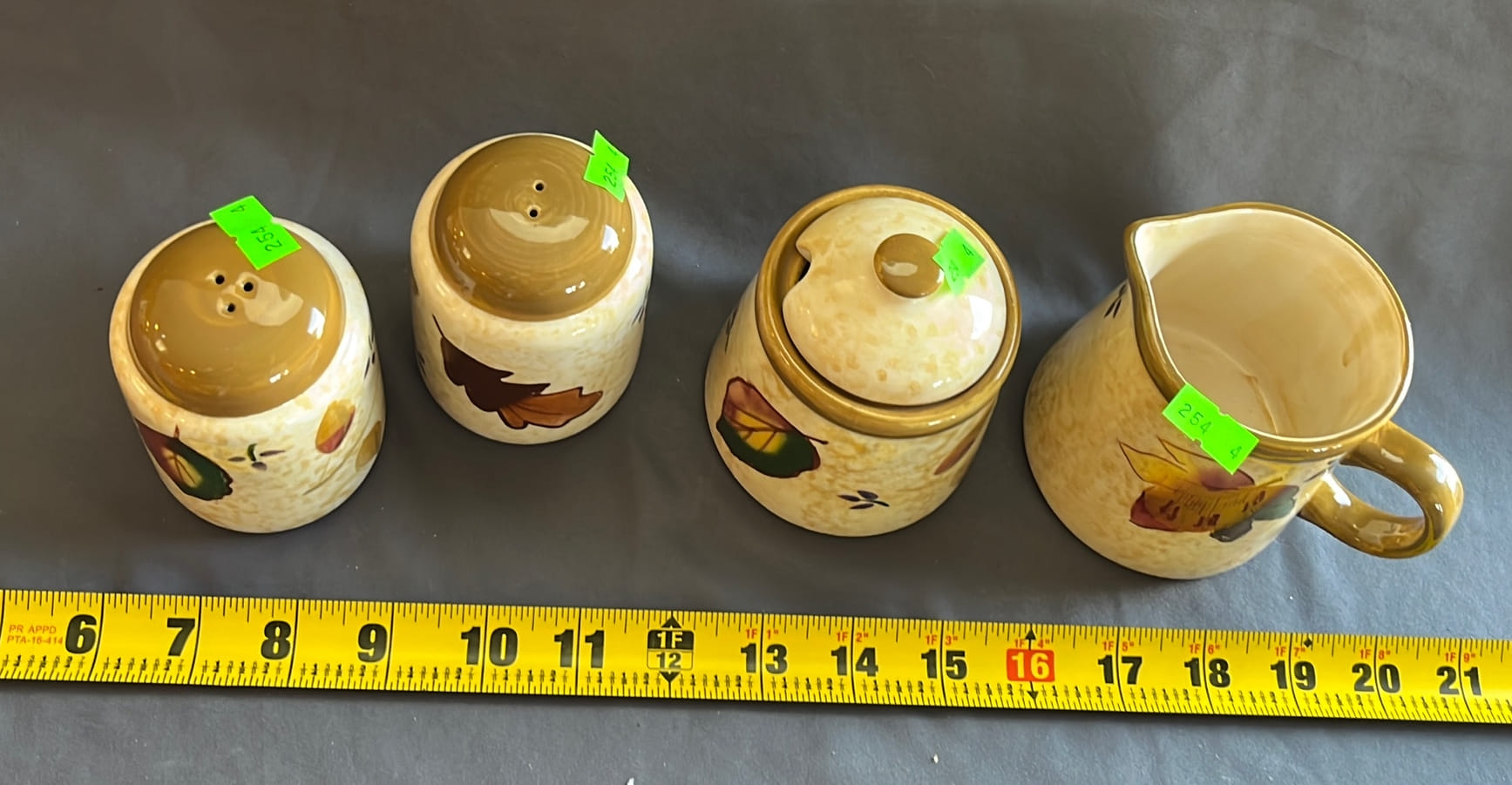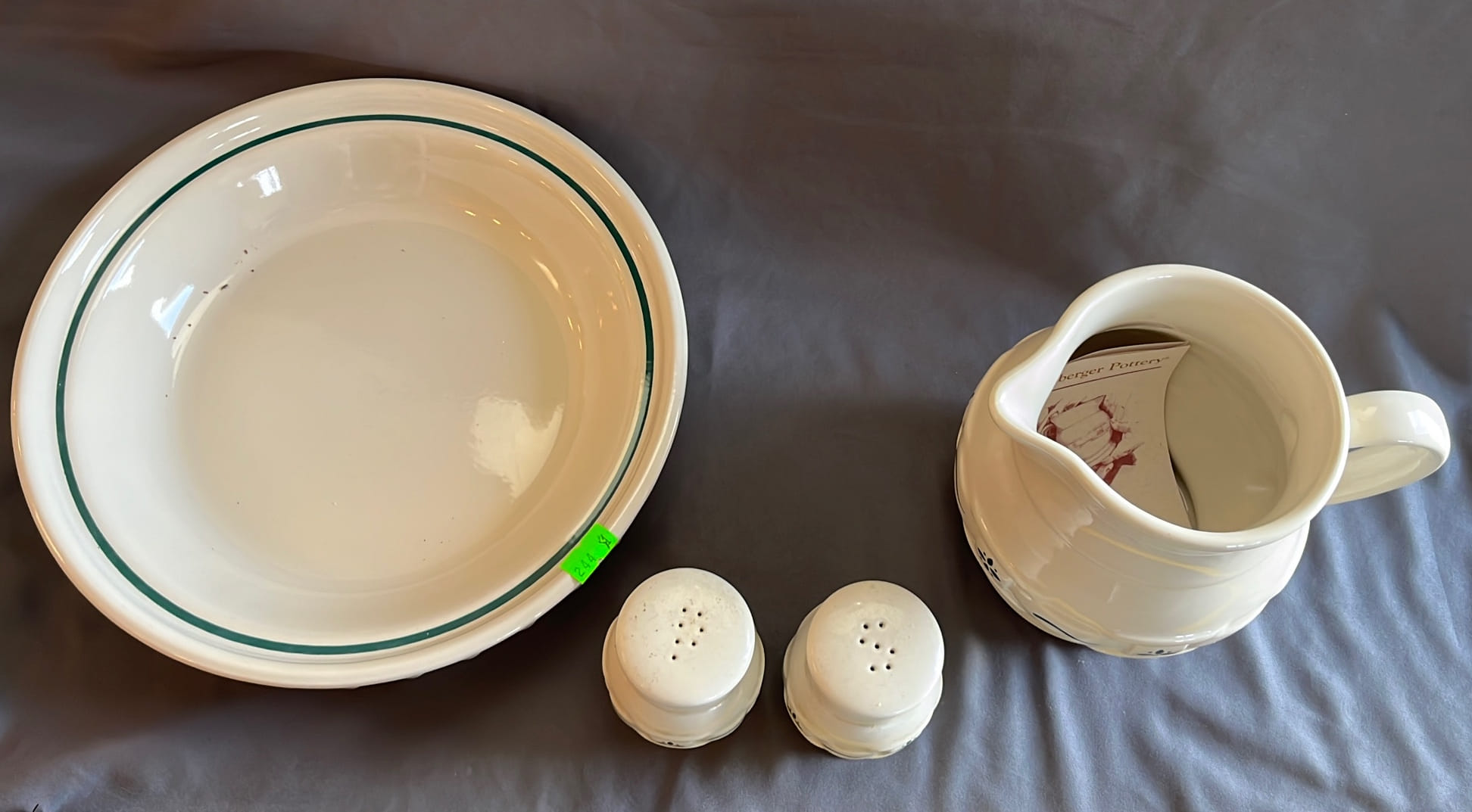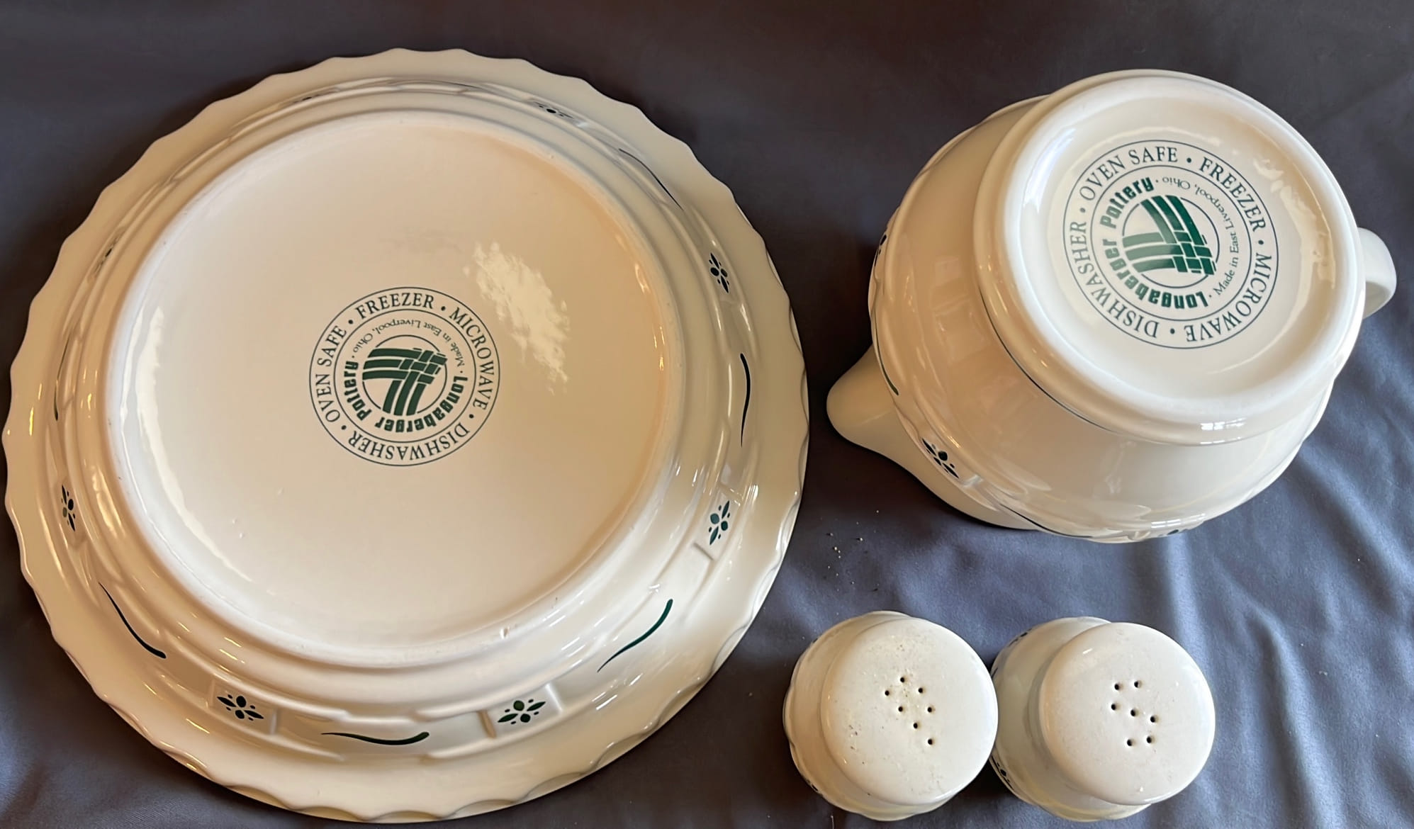 244 Longaberger pitcher 6in, shakers, pie plate 10in