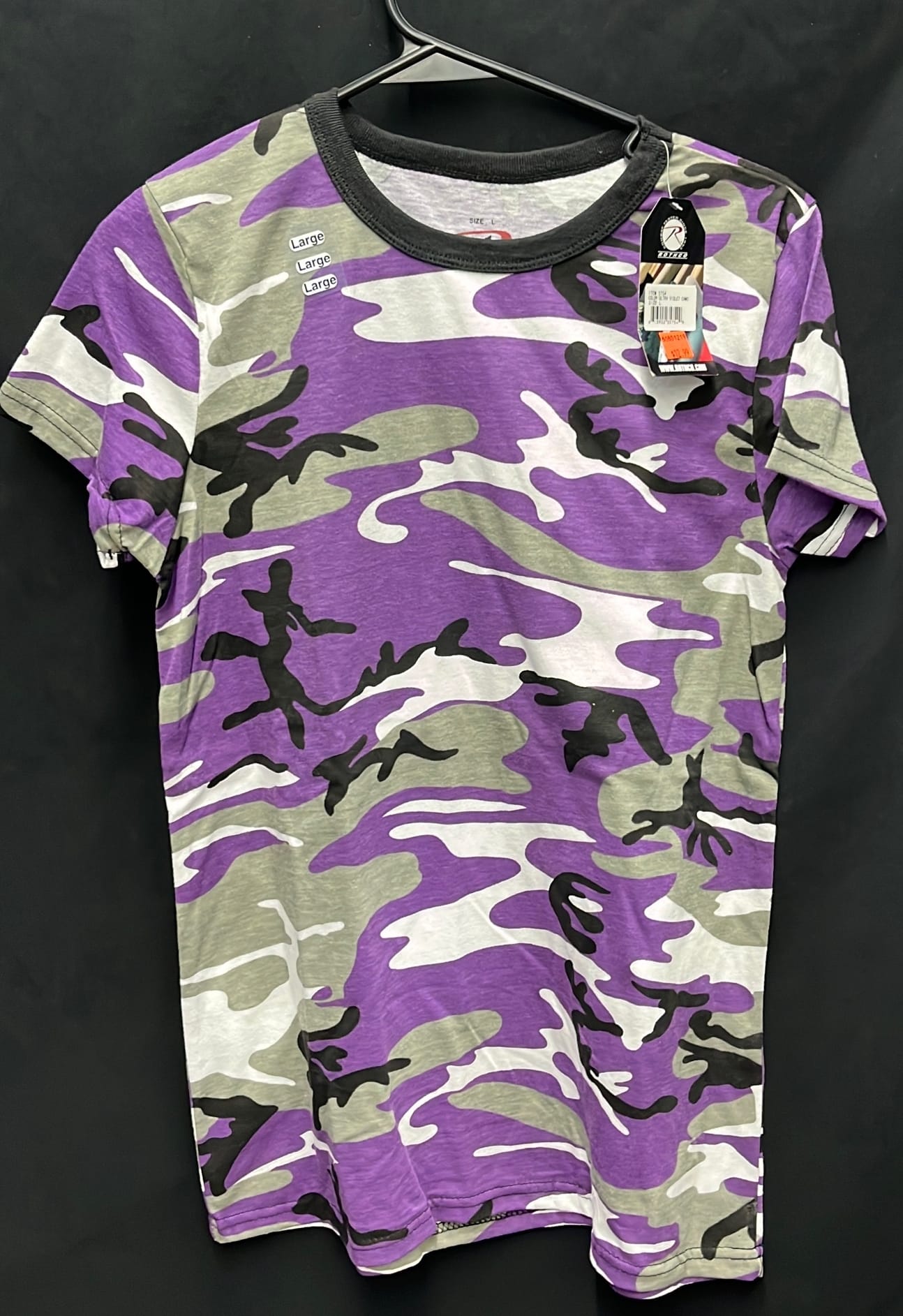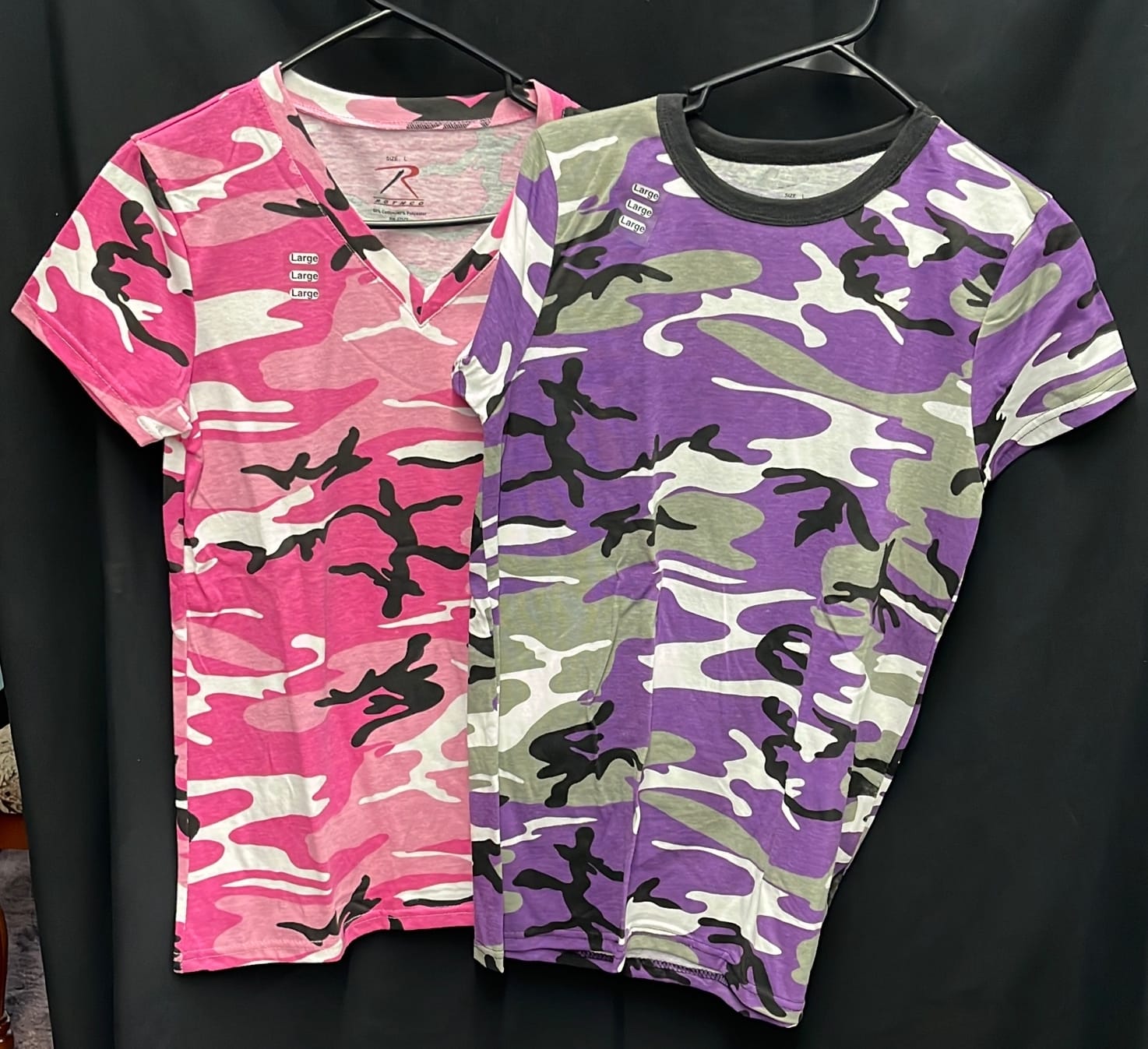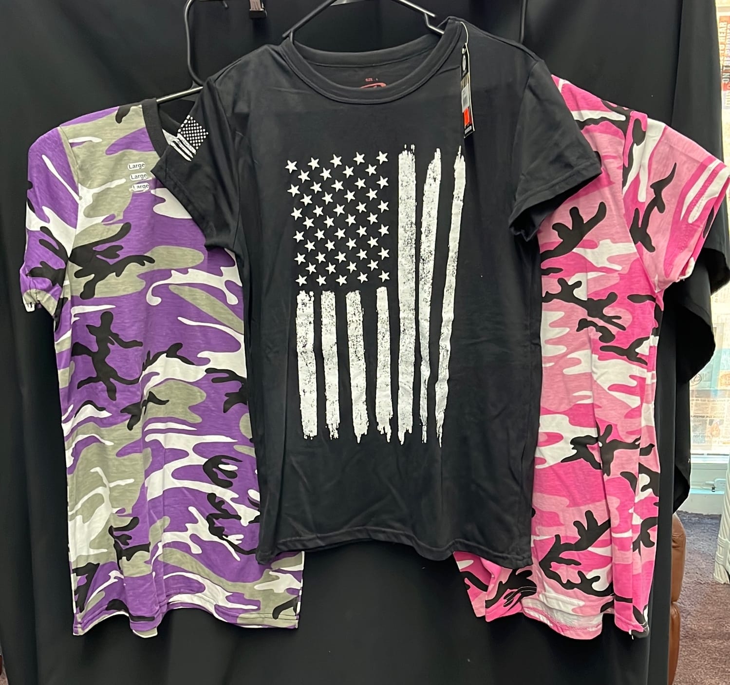 210 3 size large women's Rothco short sleeve t-shirts pink and purple camo, black patriotic