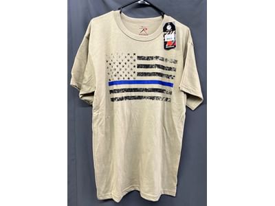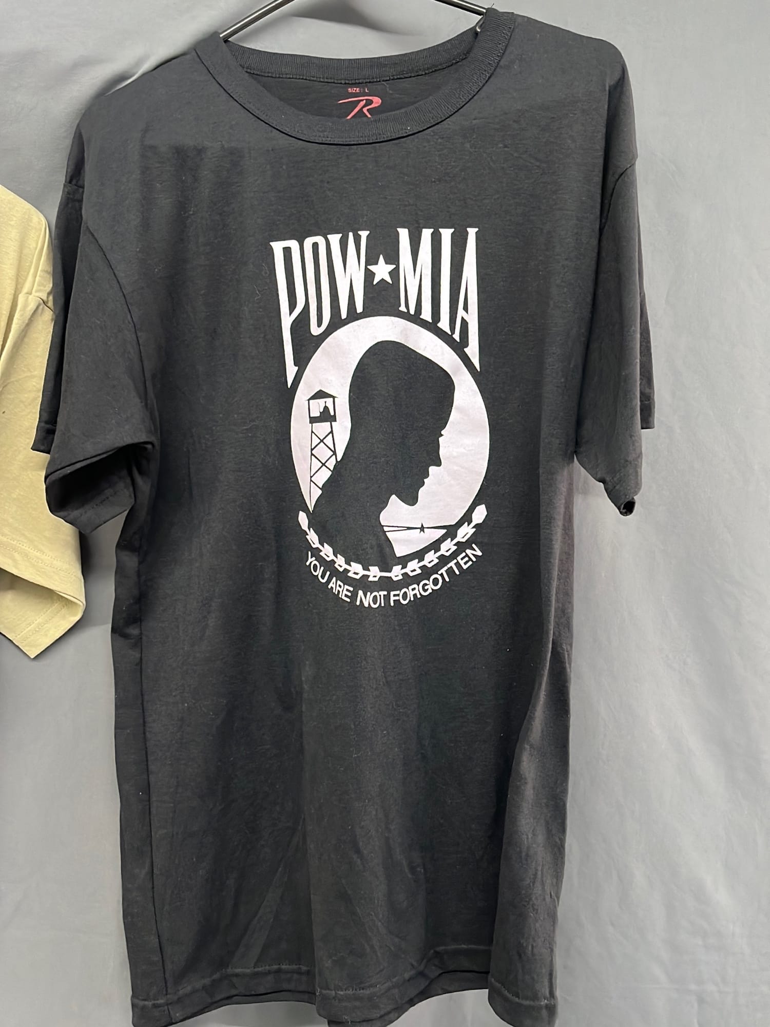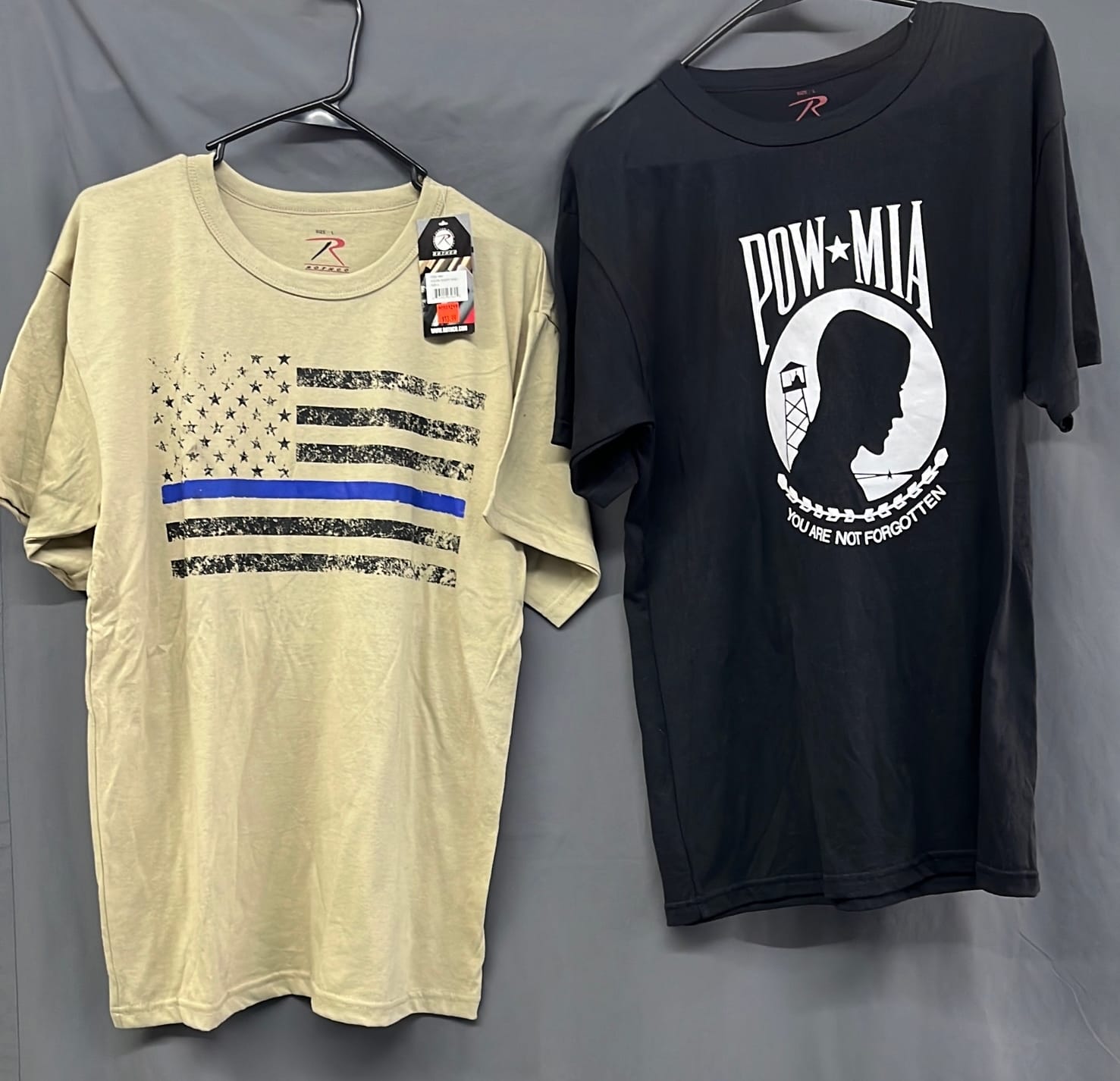 274 Two Large size t-shirts , tan patriotic and black pow-mia