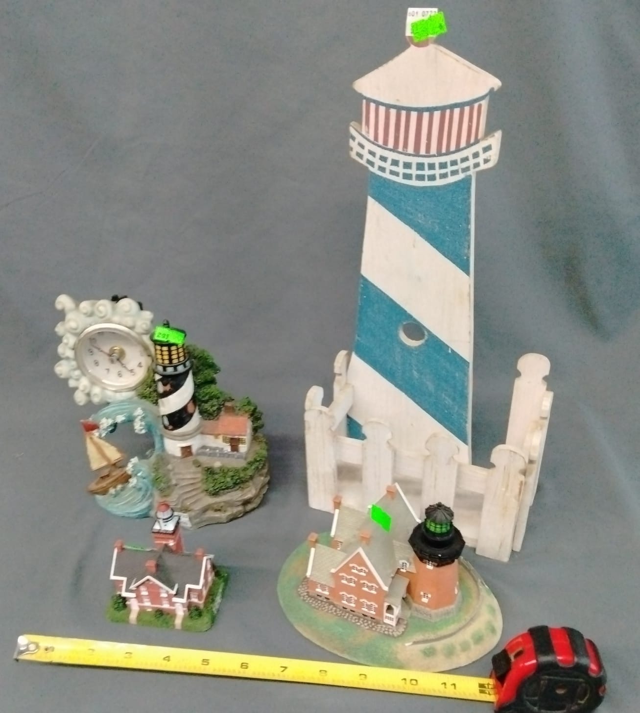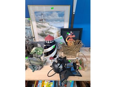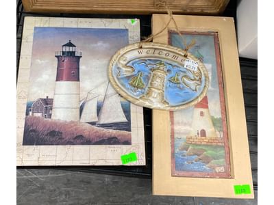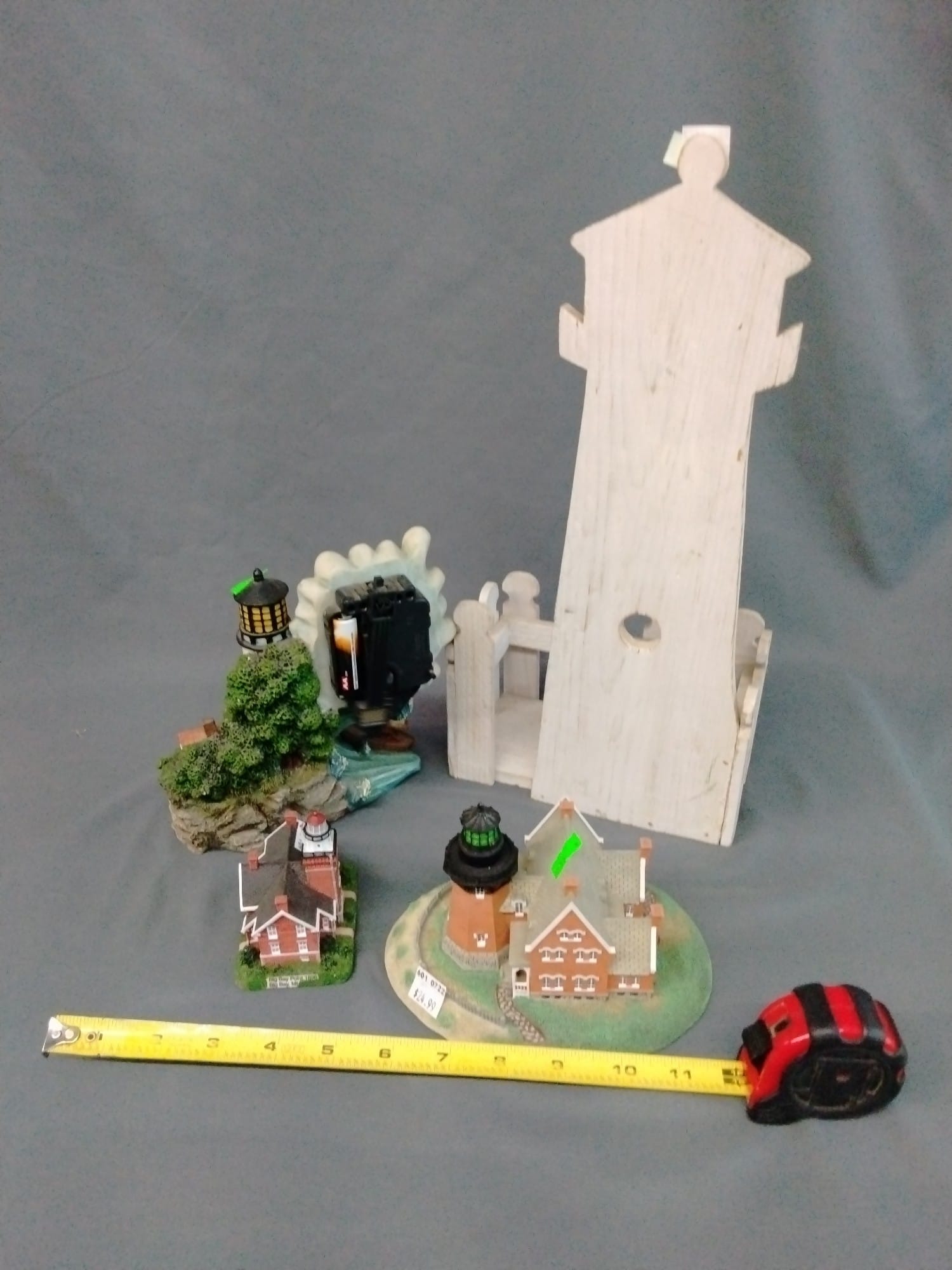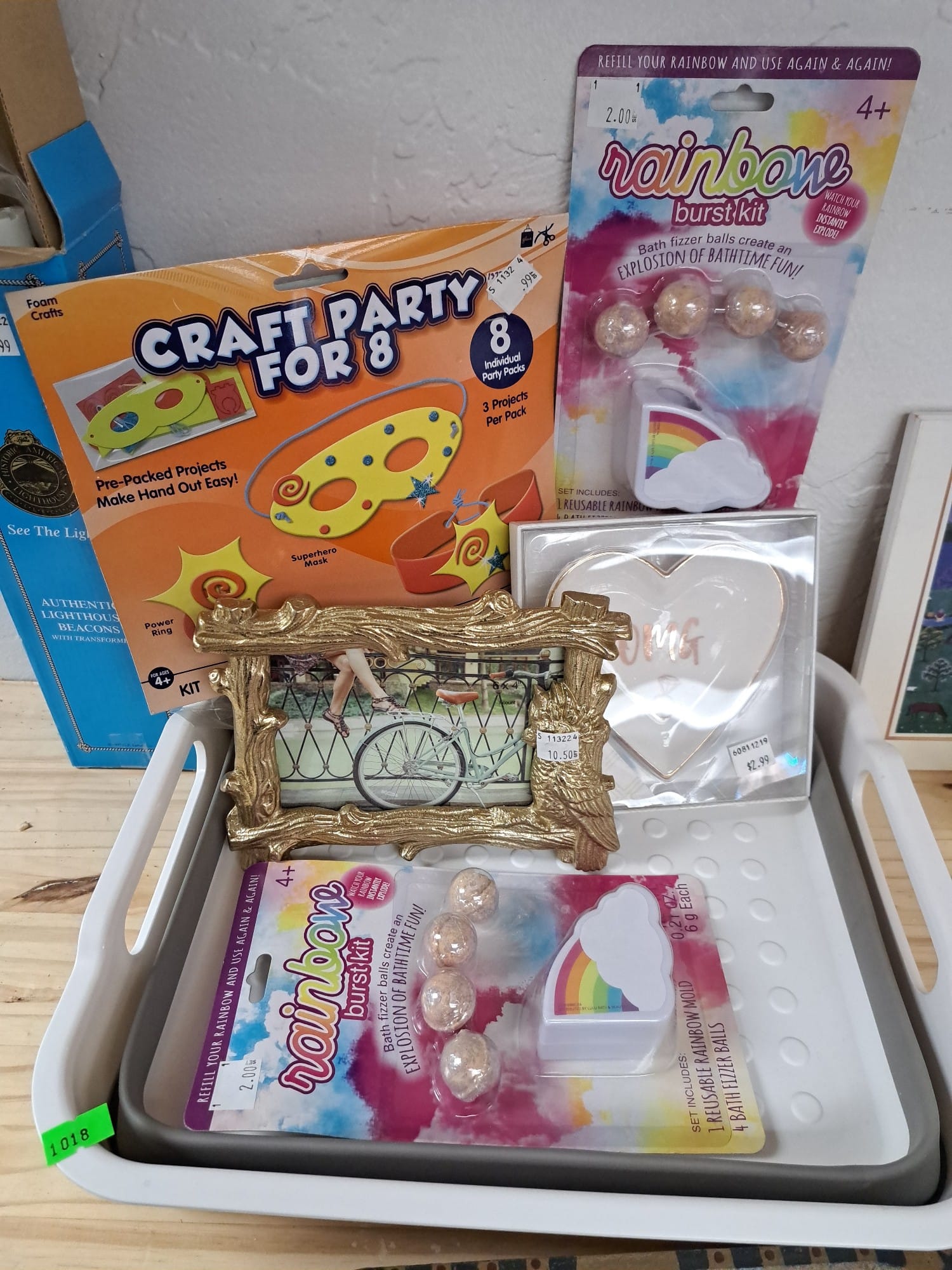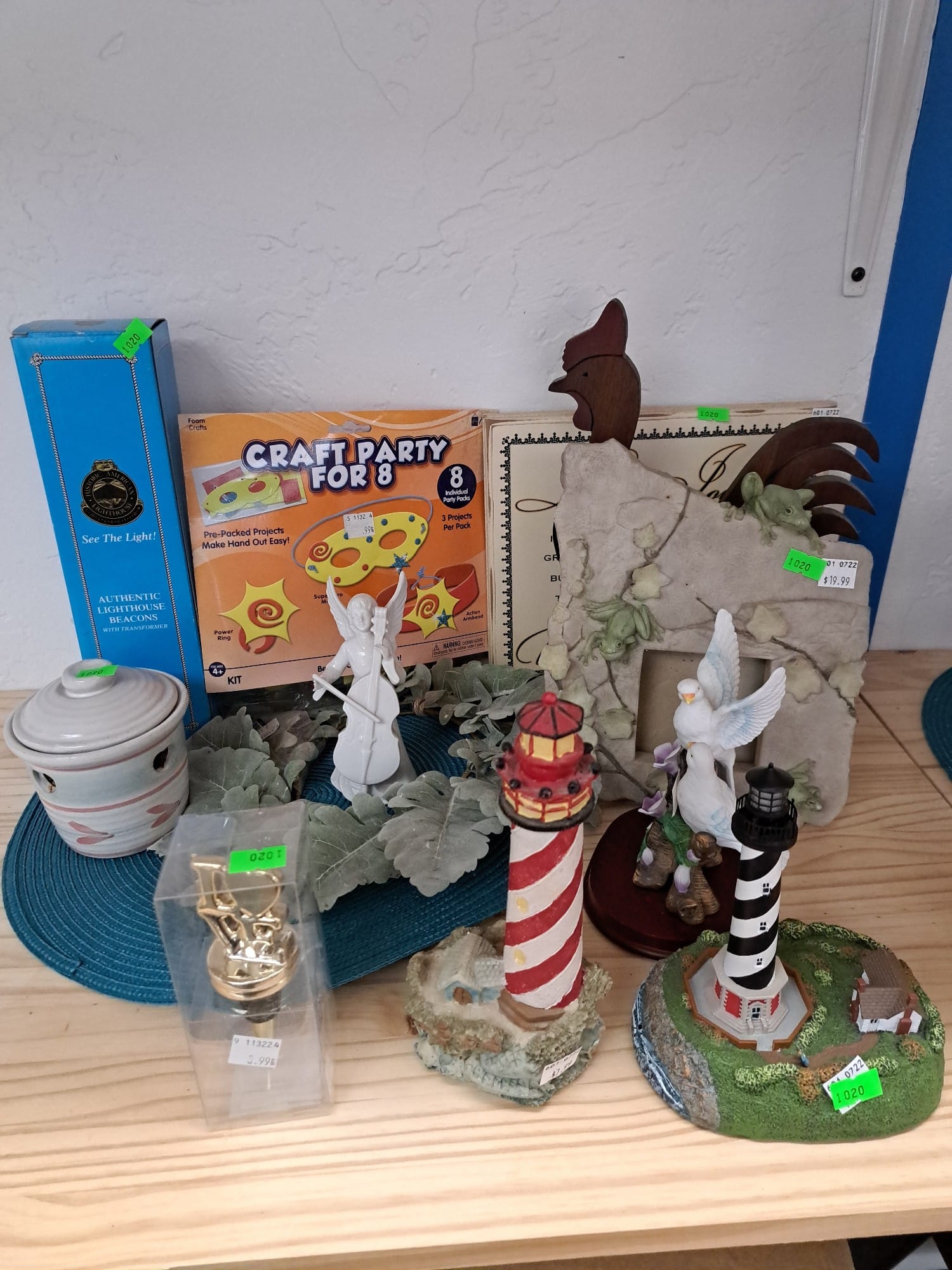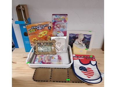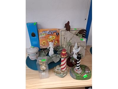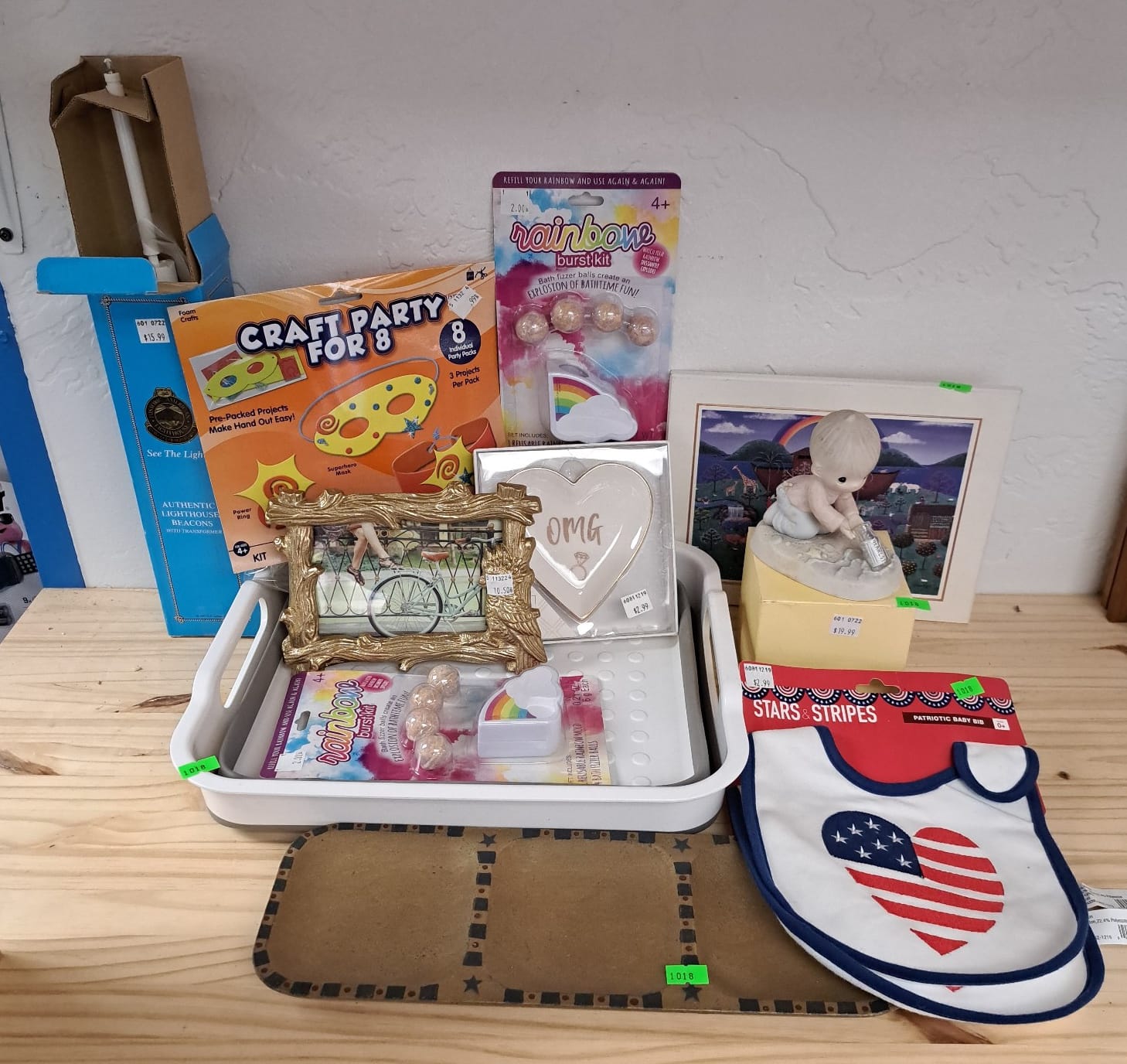 1018 Picture frame, bibs, Precious Moments figurine, bath balls, trays, craft party projects, model lighthouse beacon with transformer