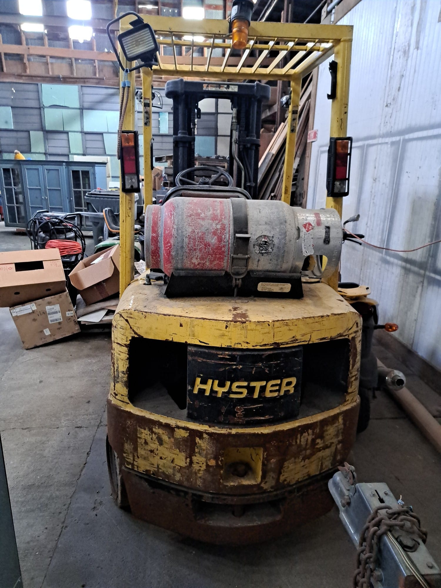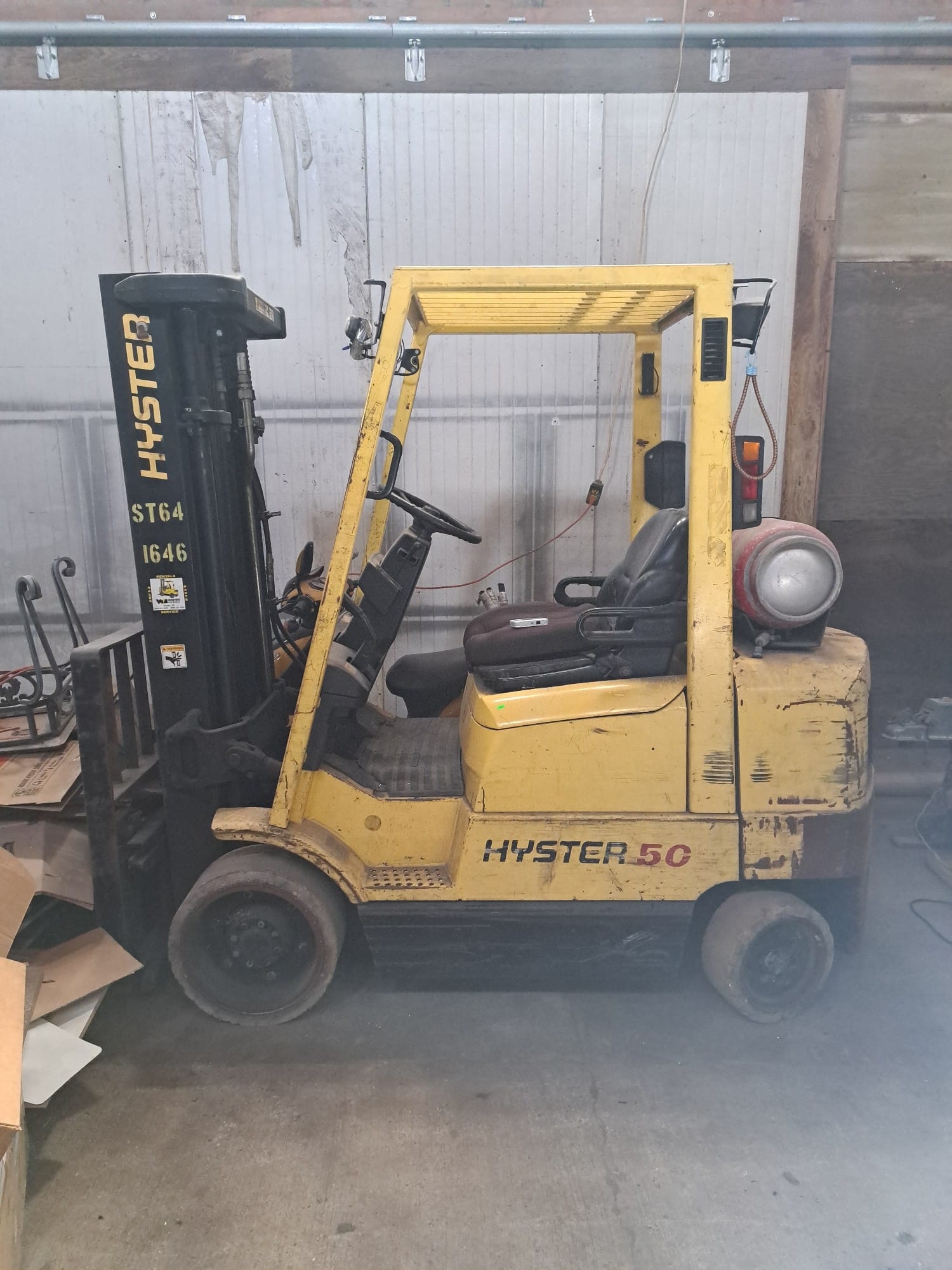 900 Hyster 50 hard surface Forklift, includes LP tank, 8867 hrs, 5000lbs, Runs good, no capacity data tag