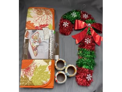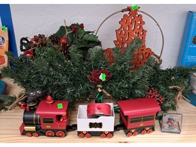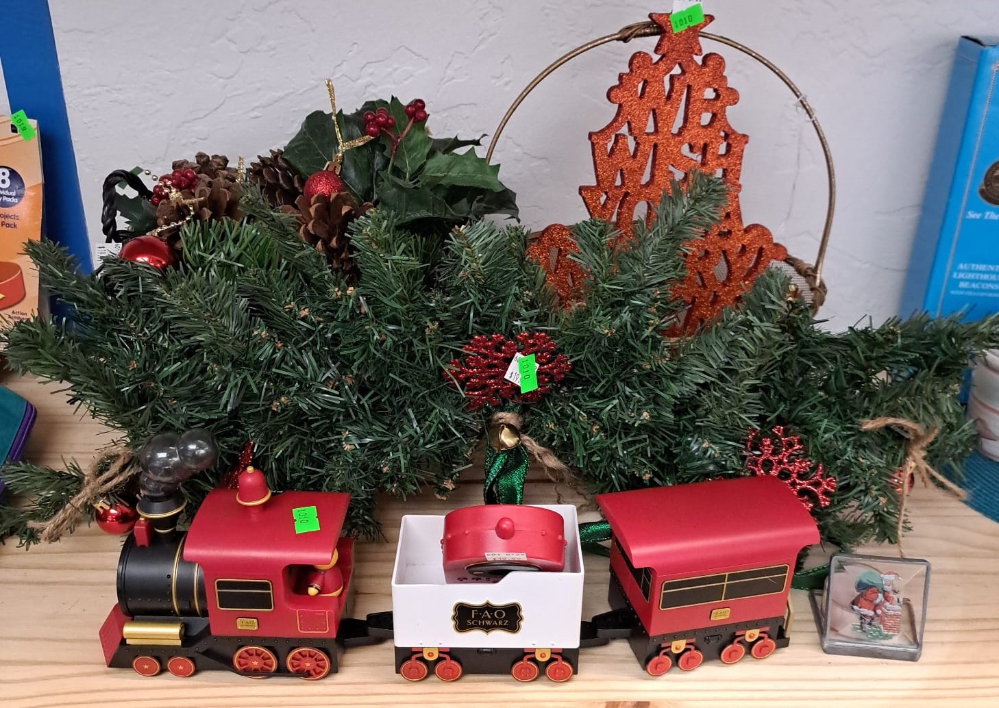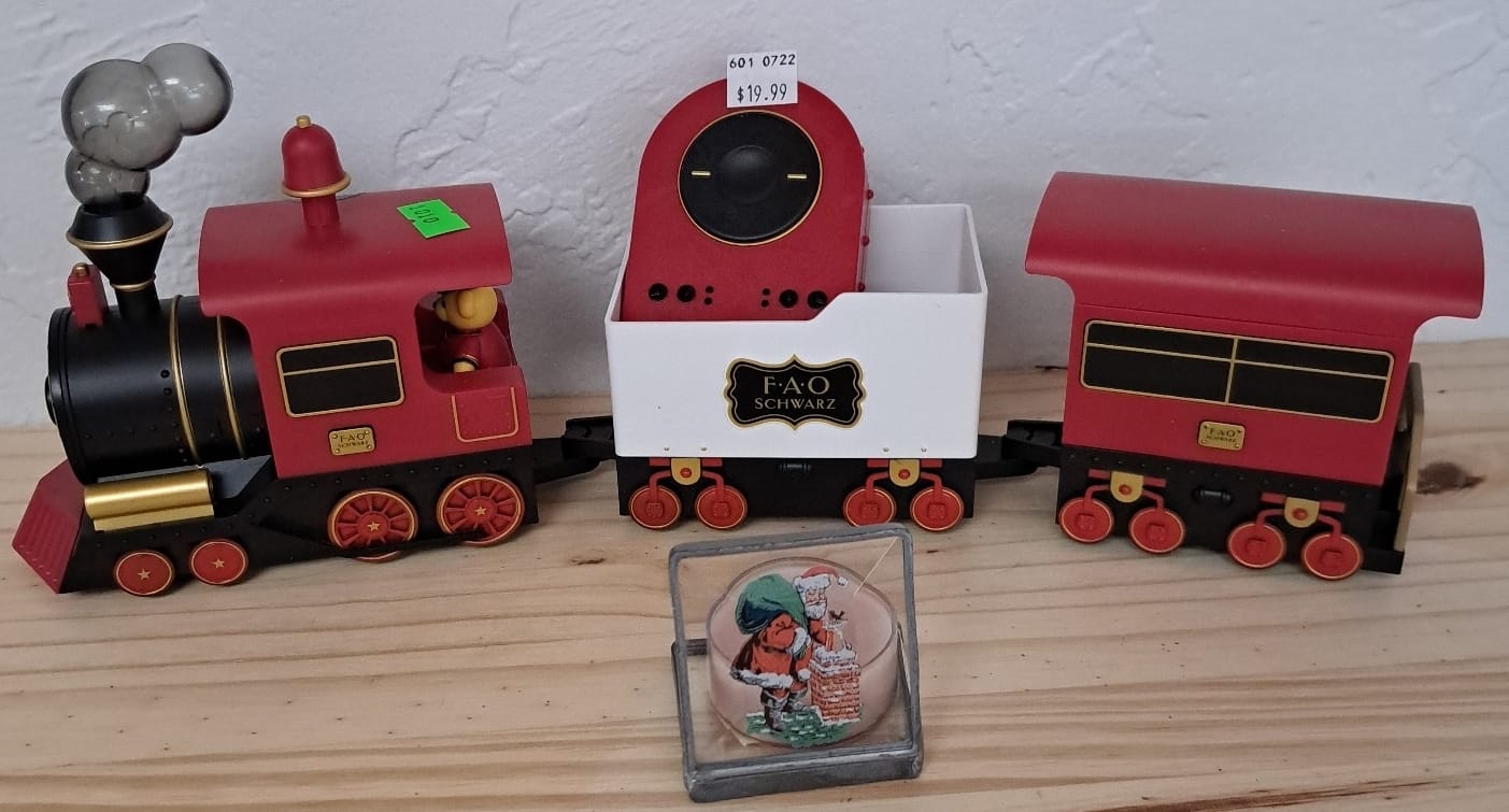 1010 FAO Schwartz plastic train, Christmas decorations