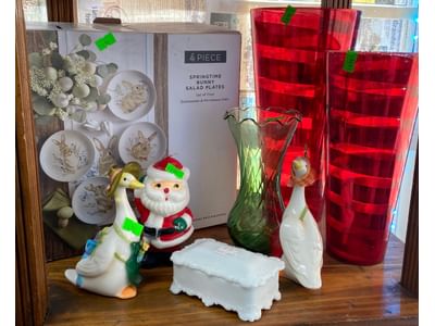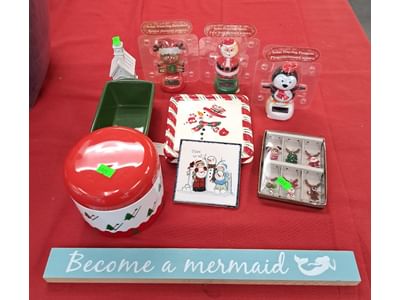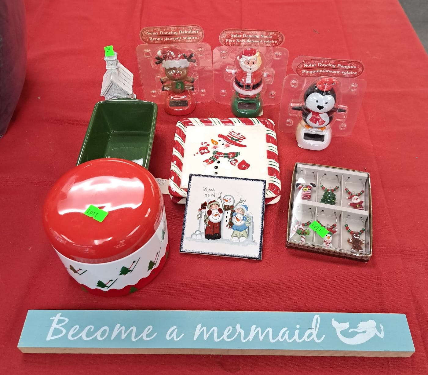 1011 Christmas dishware, Solar dancing penguin, Santa, & reindeer, Church decor, Drink charms, Canister, Holiday ceramic kitchenware, Mermaid sign