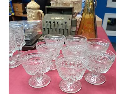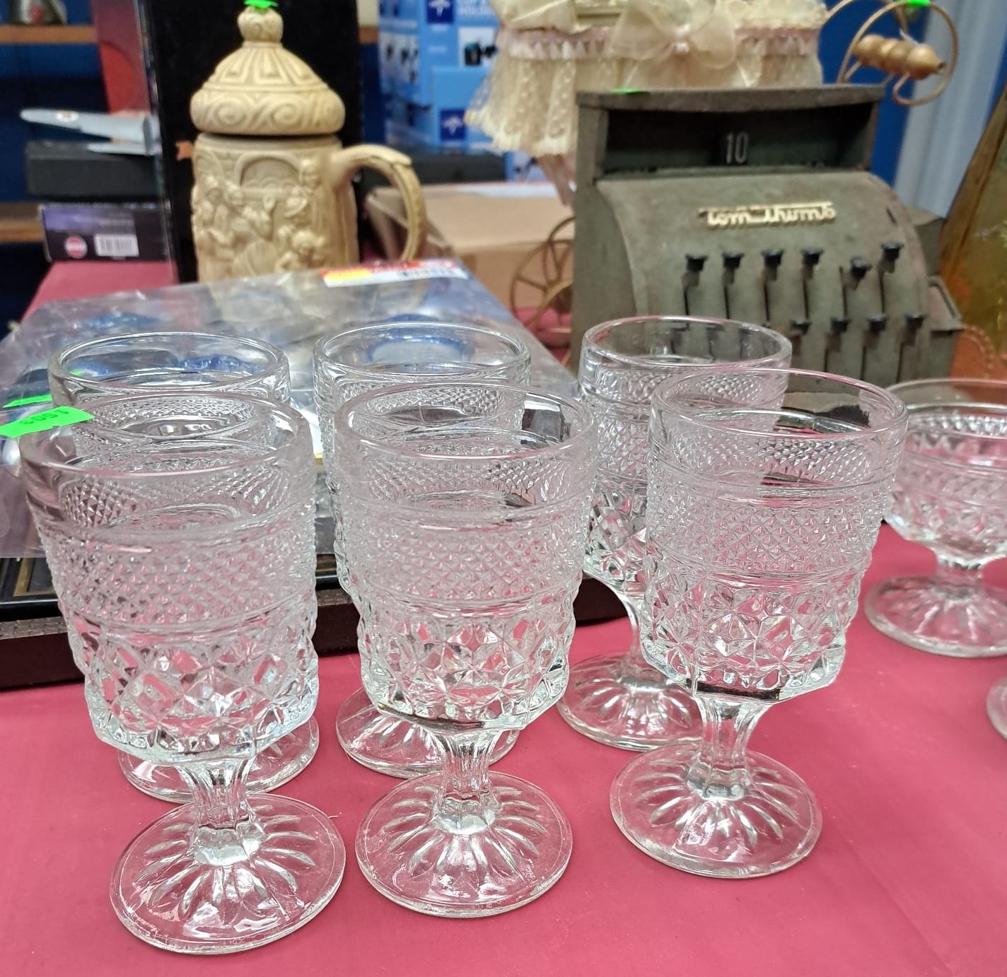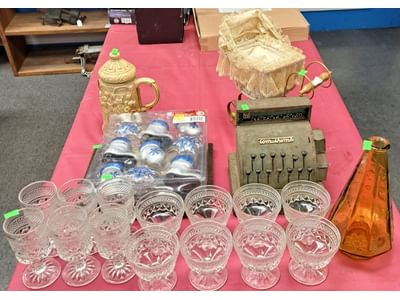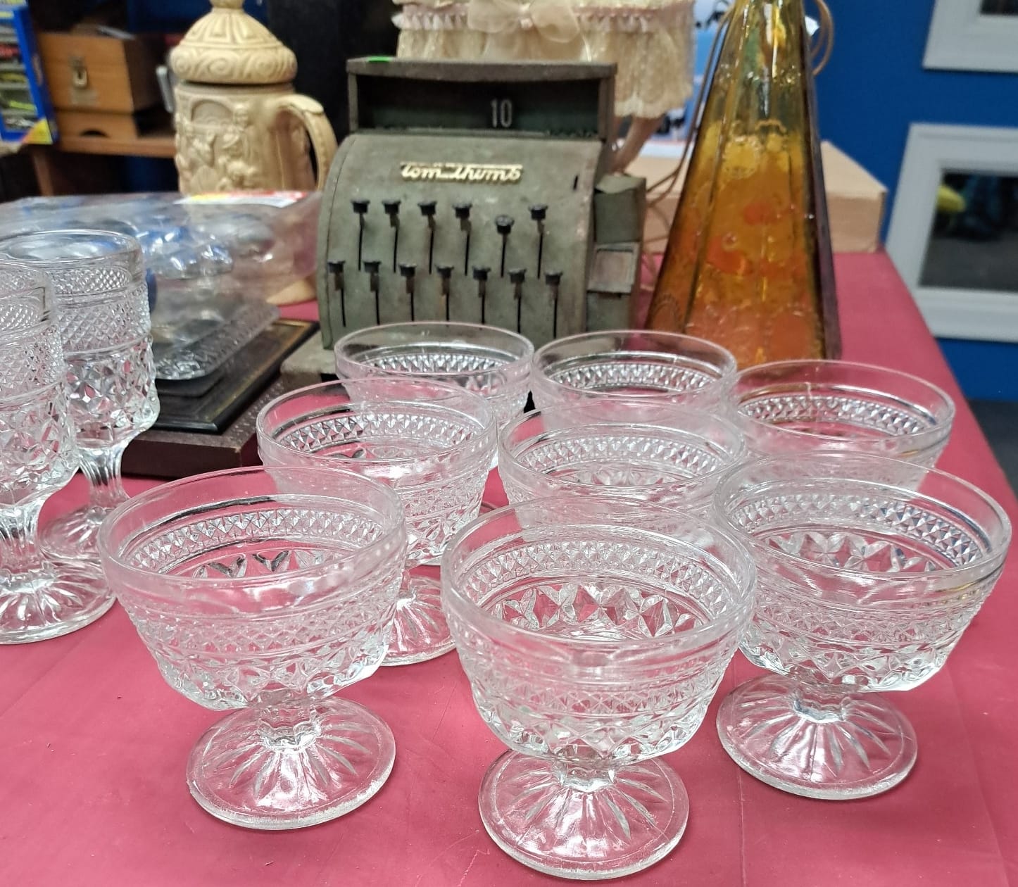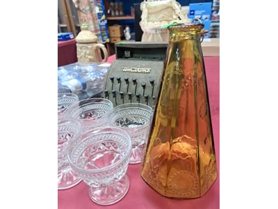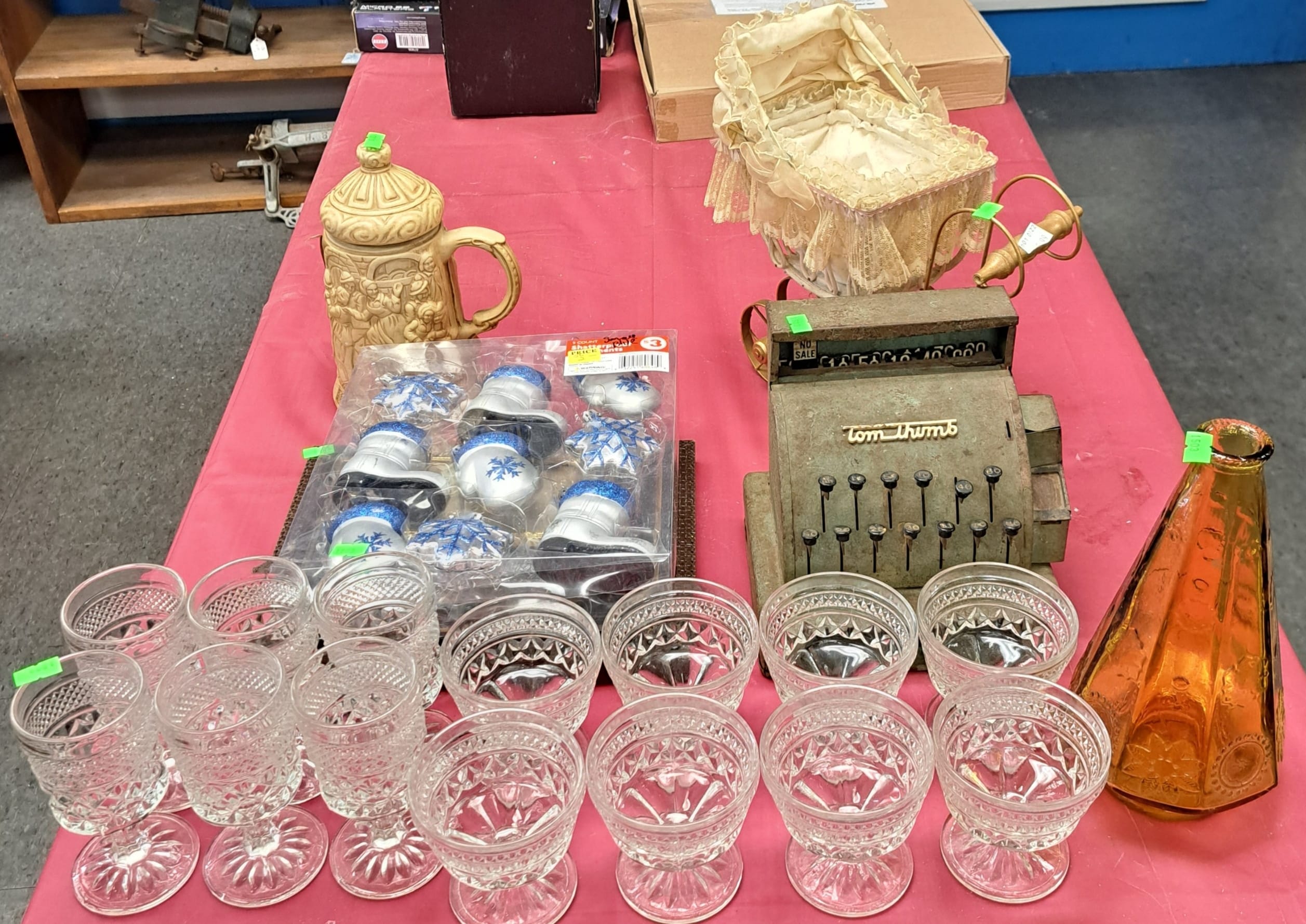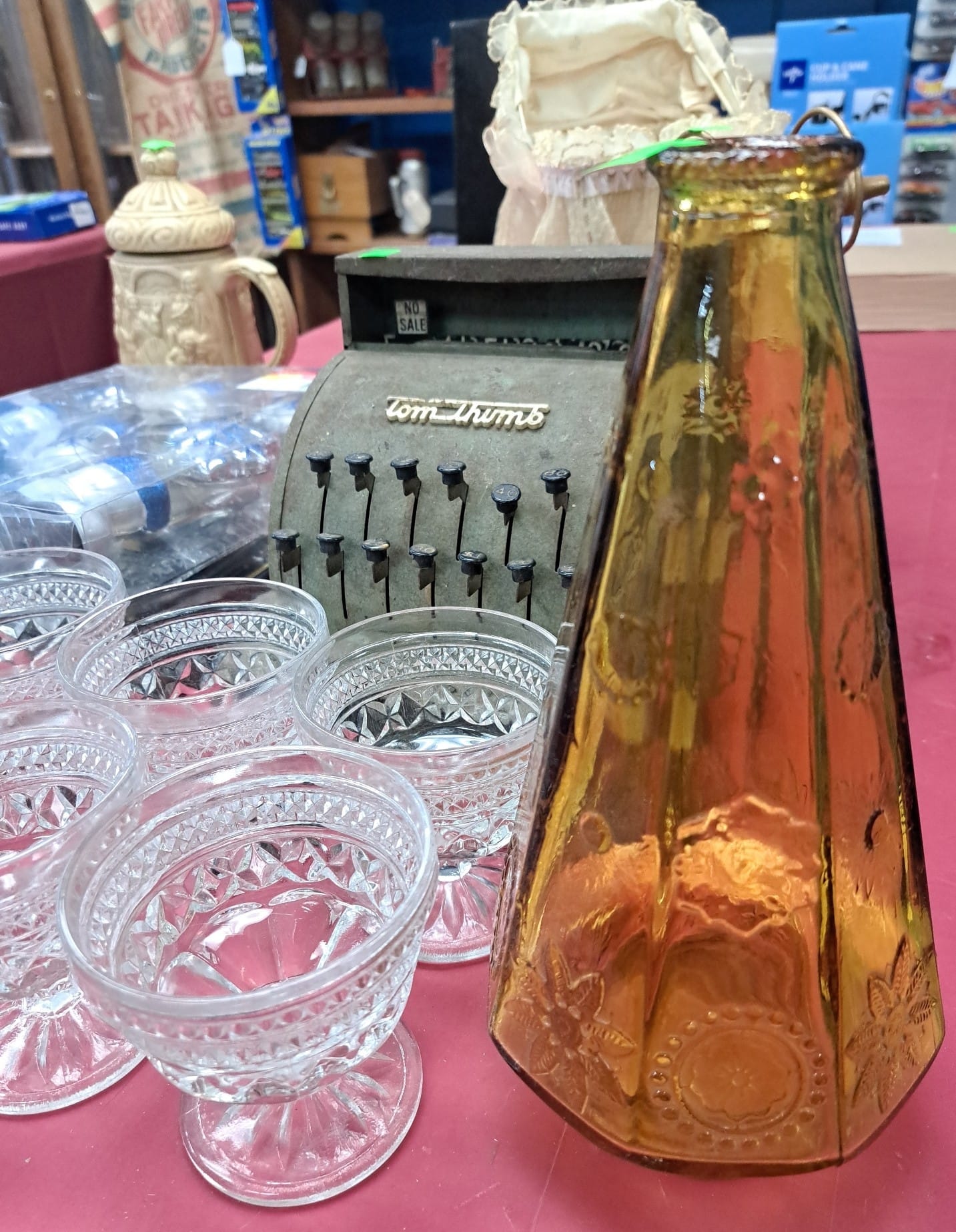 1503 Ornaments, Tim thumb toy register no drawer, metal buggy, beam decanter, amber glass jar, pressed glass sherbets and goblets, frames