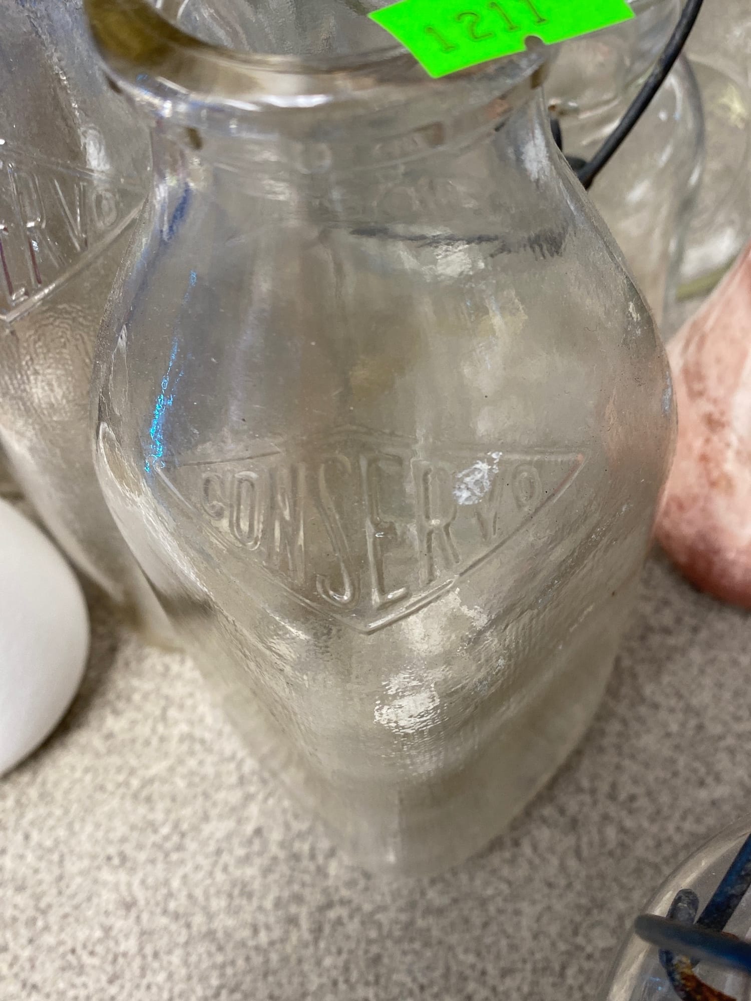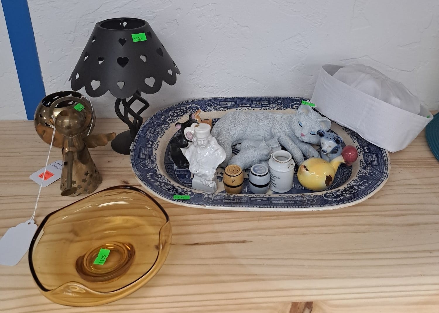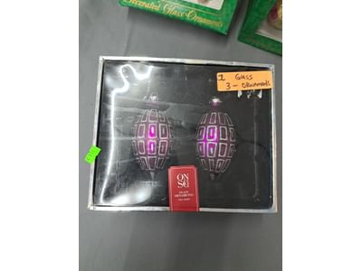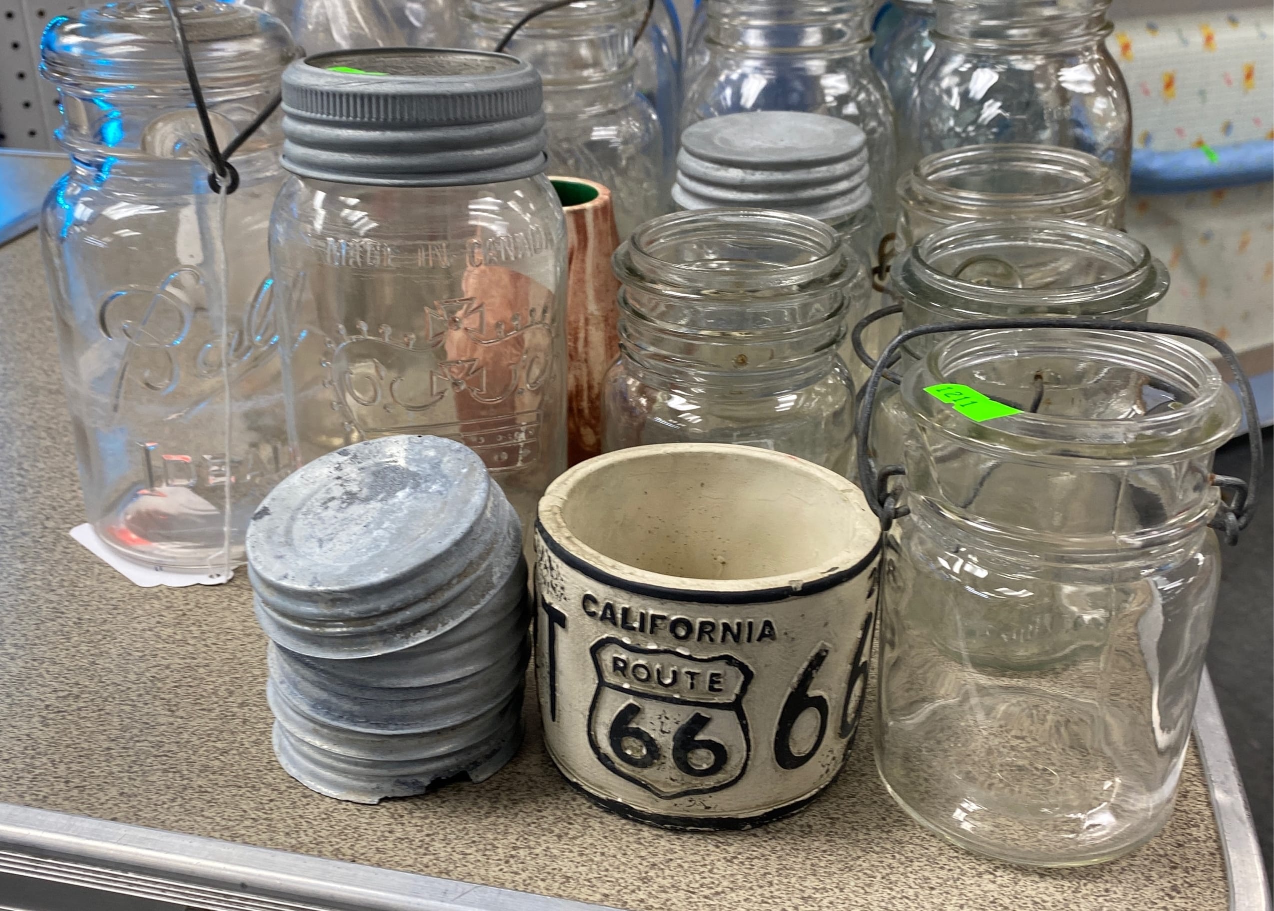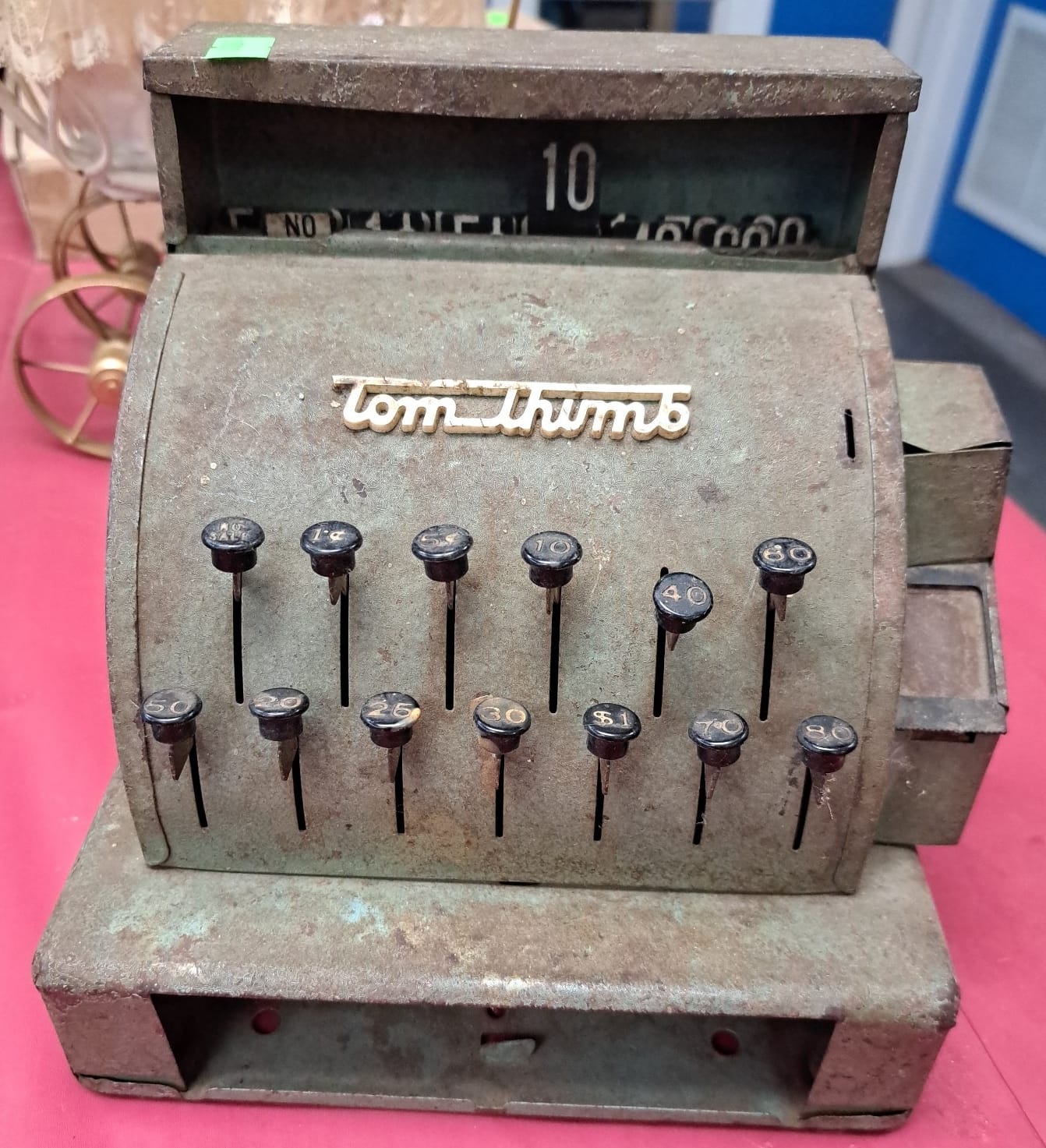 1503 Ornaments, Tim thumb toy register no drawer, metal buggy, beam decanter, amber glass jar, pressed glass sherbets and goblets, frames