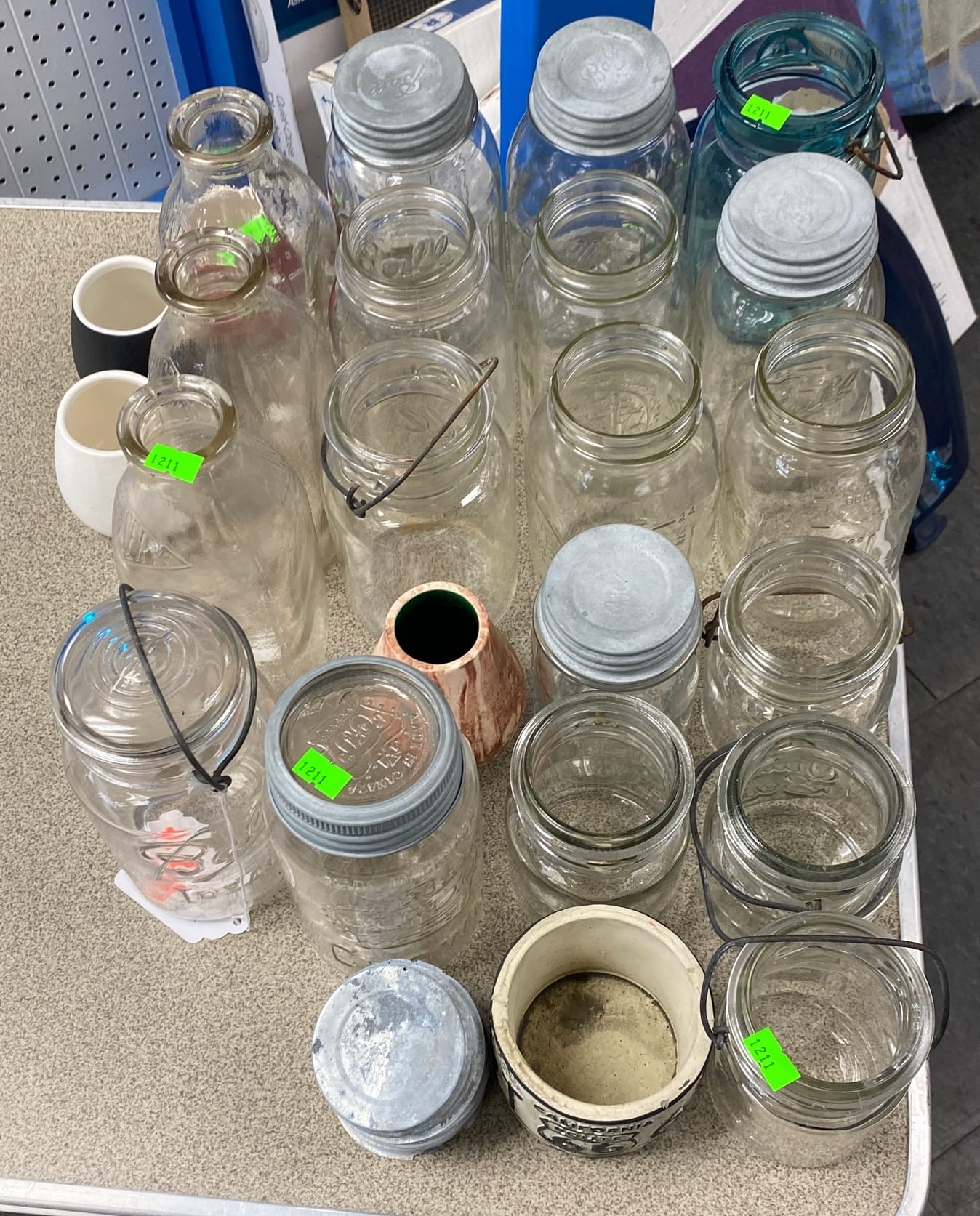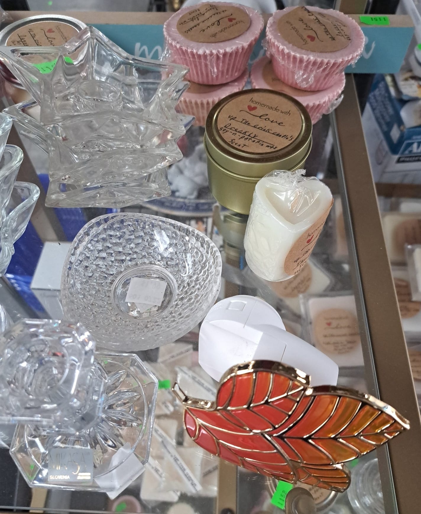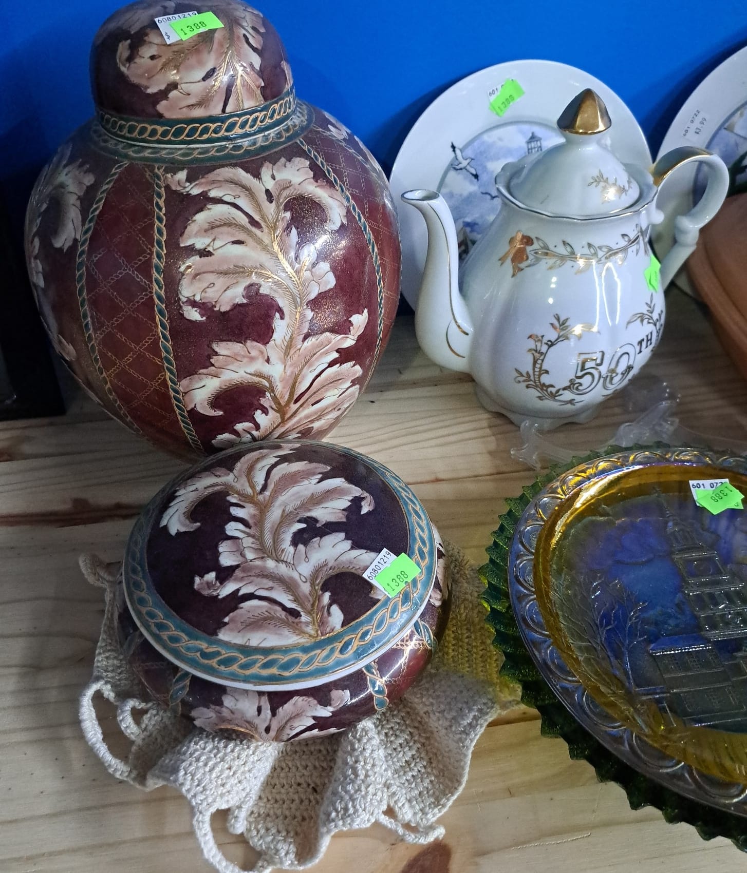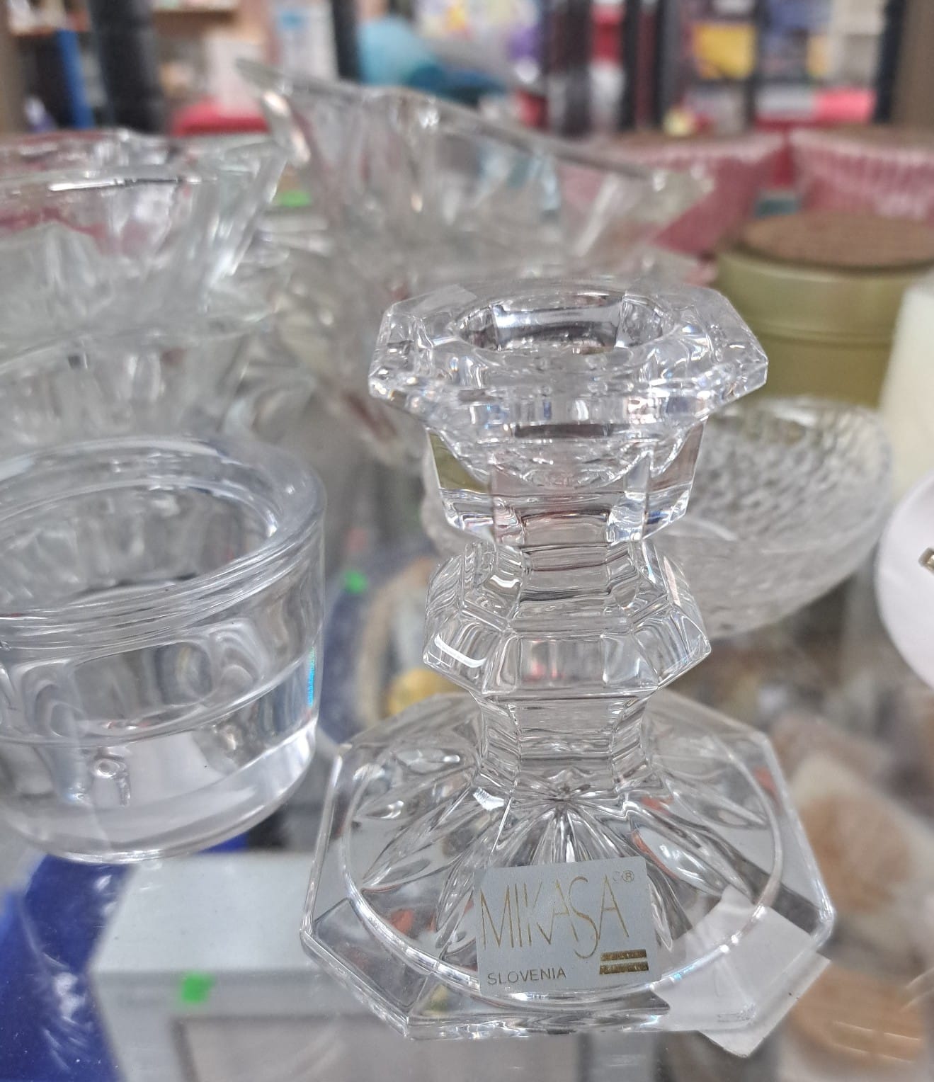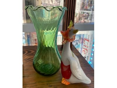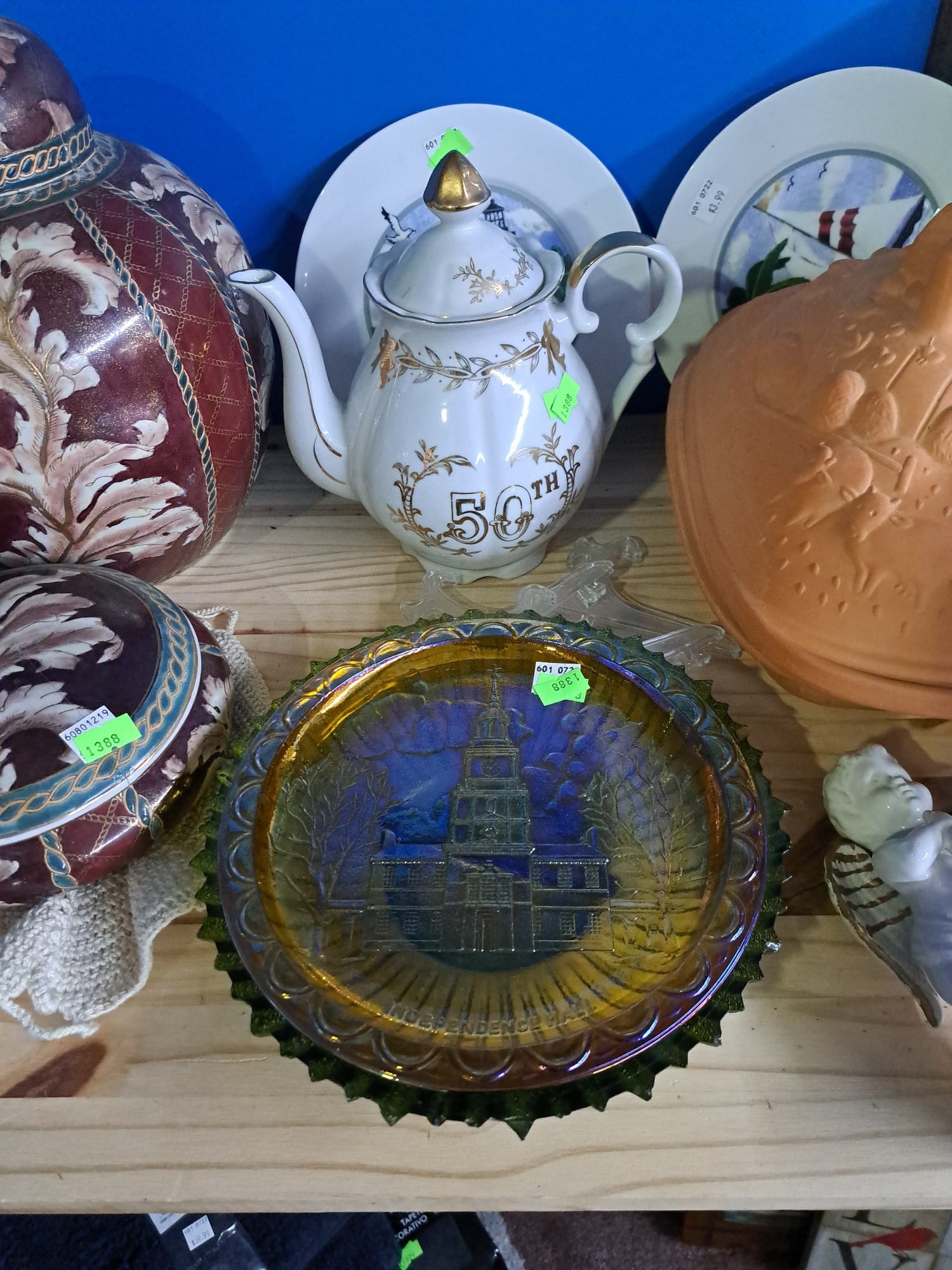 1503 Ornaments, Tim thumb toy register no drawer, metal buggy, beam decanter, amber glass jar, pressed glass sherbets and goblets, frames
