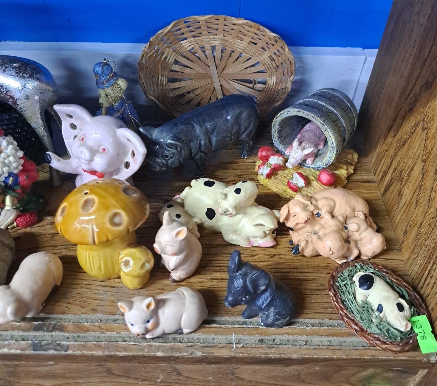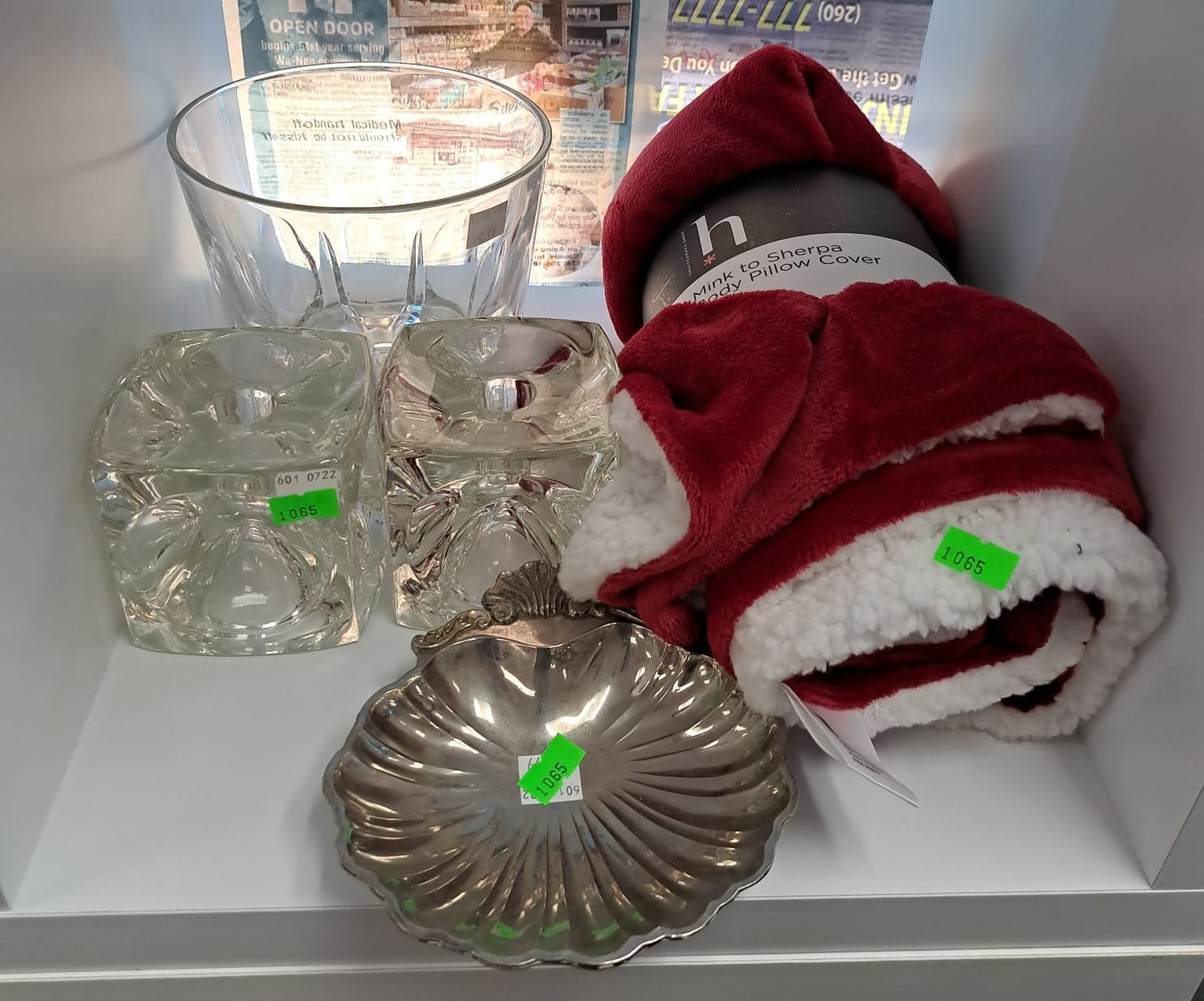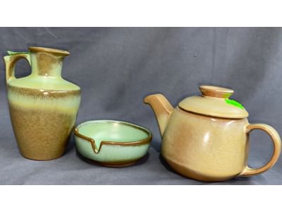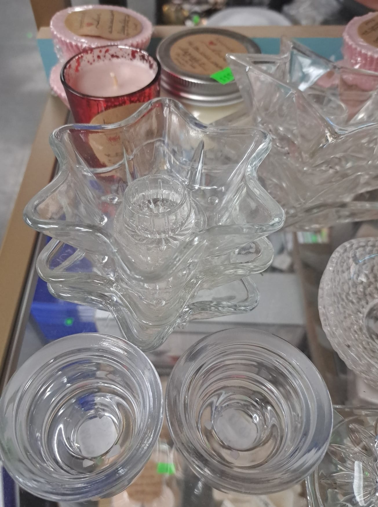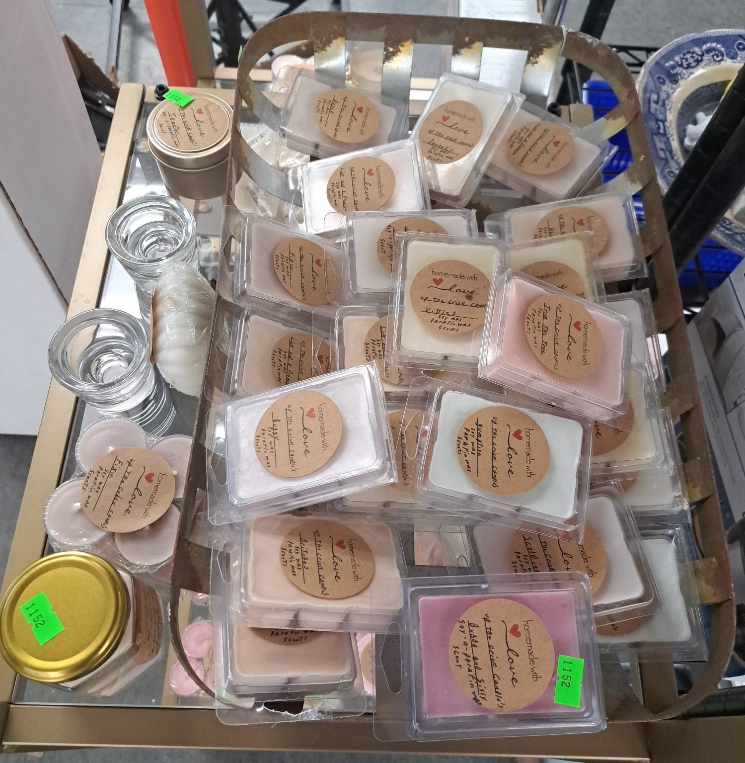 1503 Ornaments, Tim thumb toy register no drawer, metal buggy, beam decanter, amber glass jar, pressed glass sherbets and goblets, frames