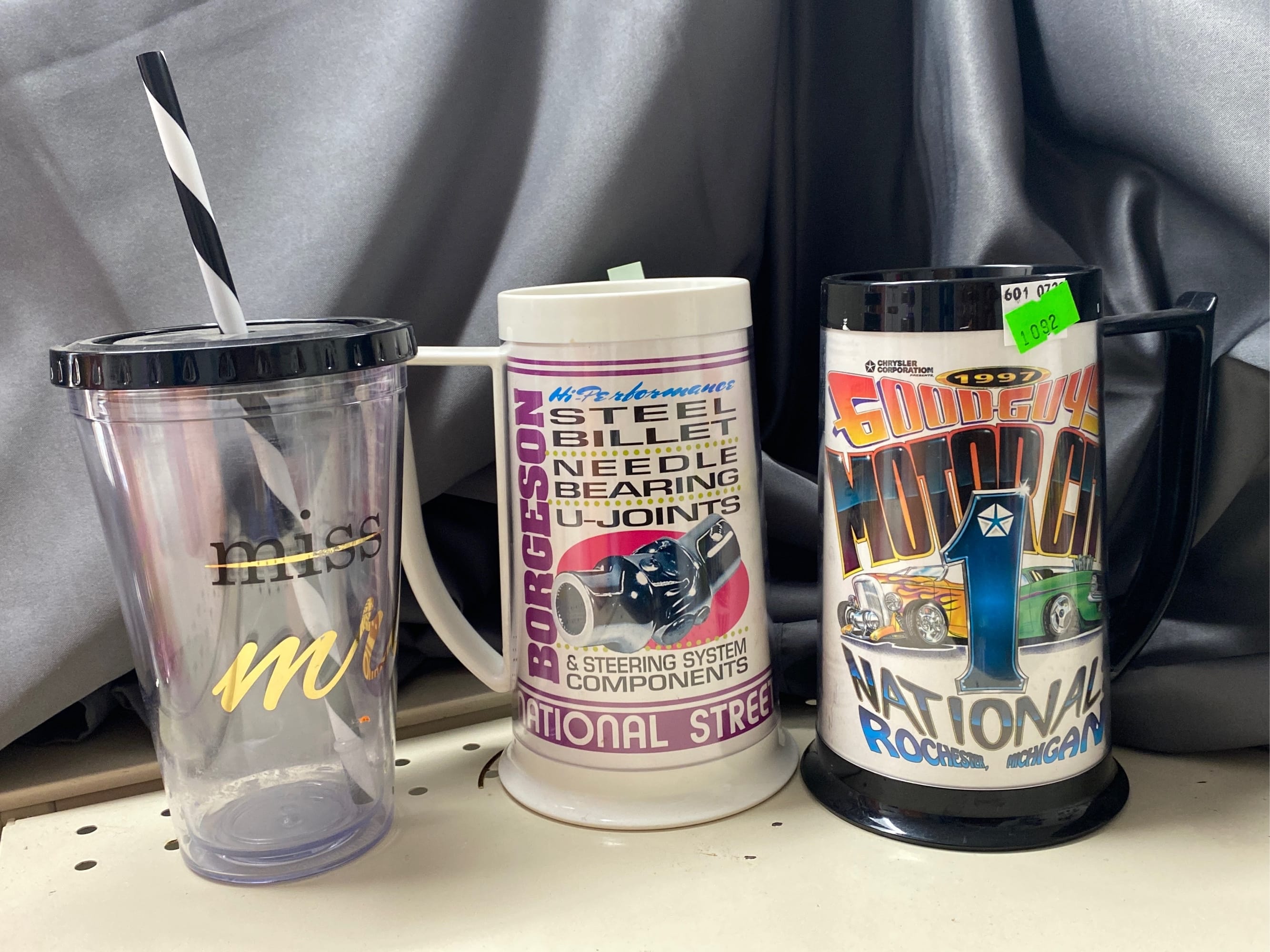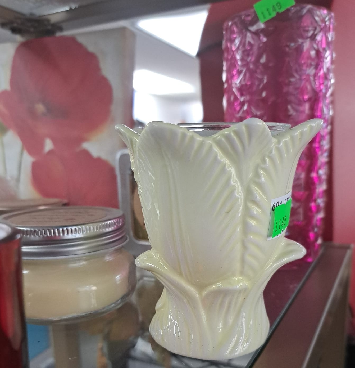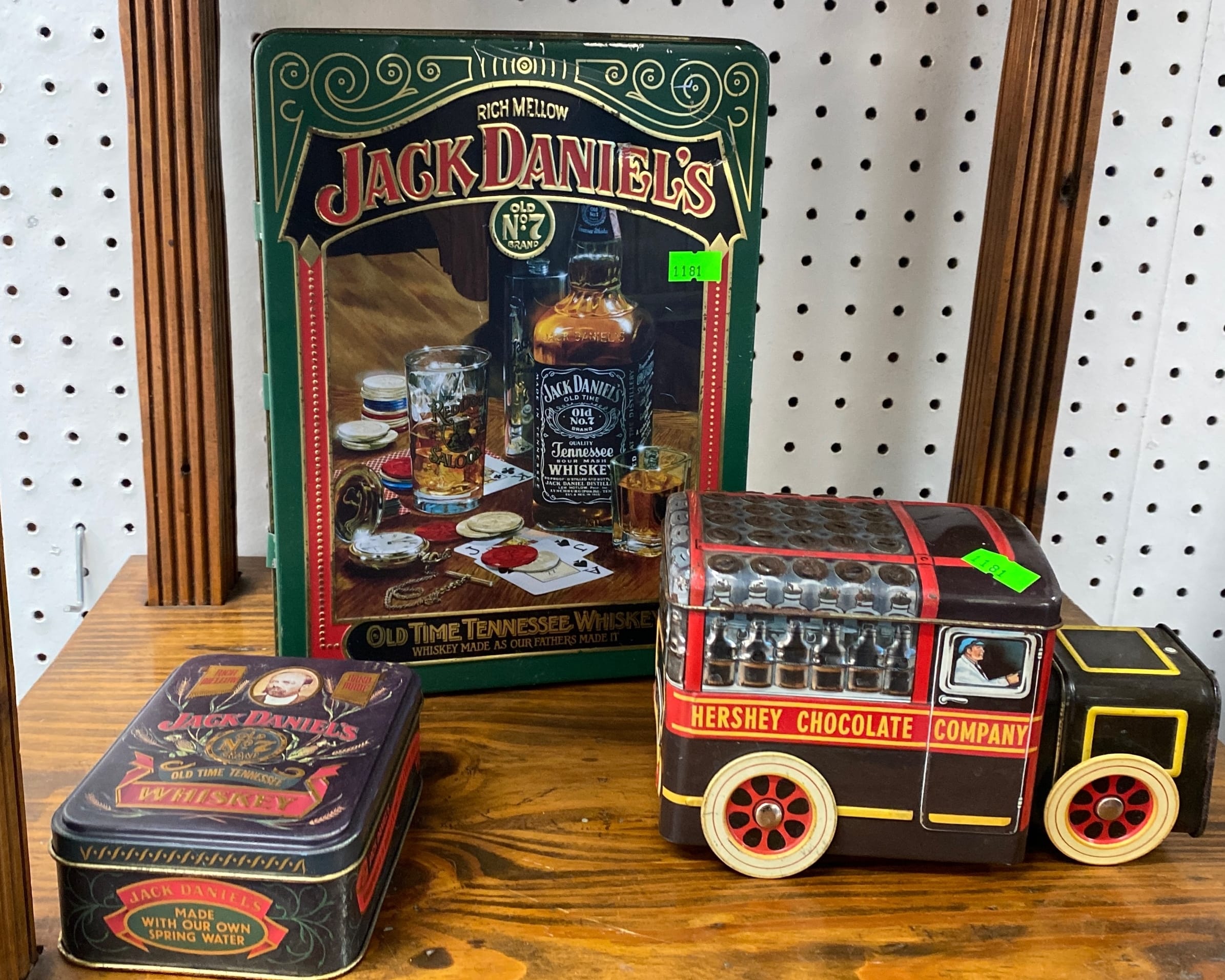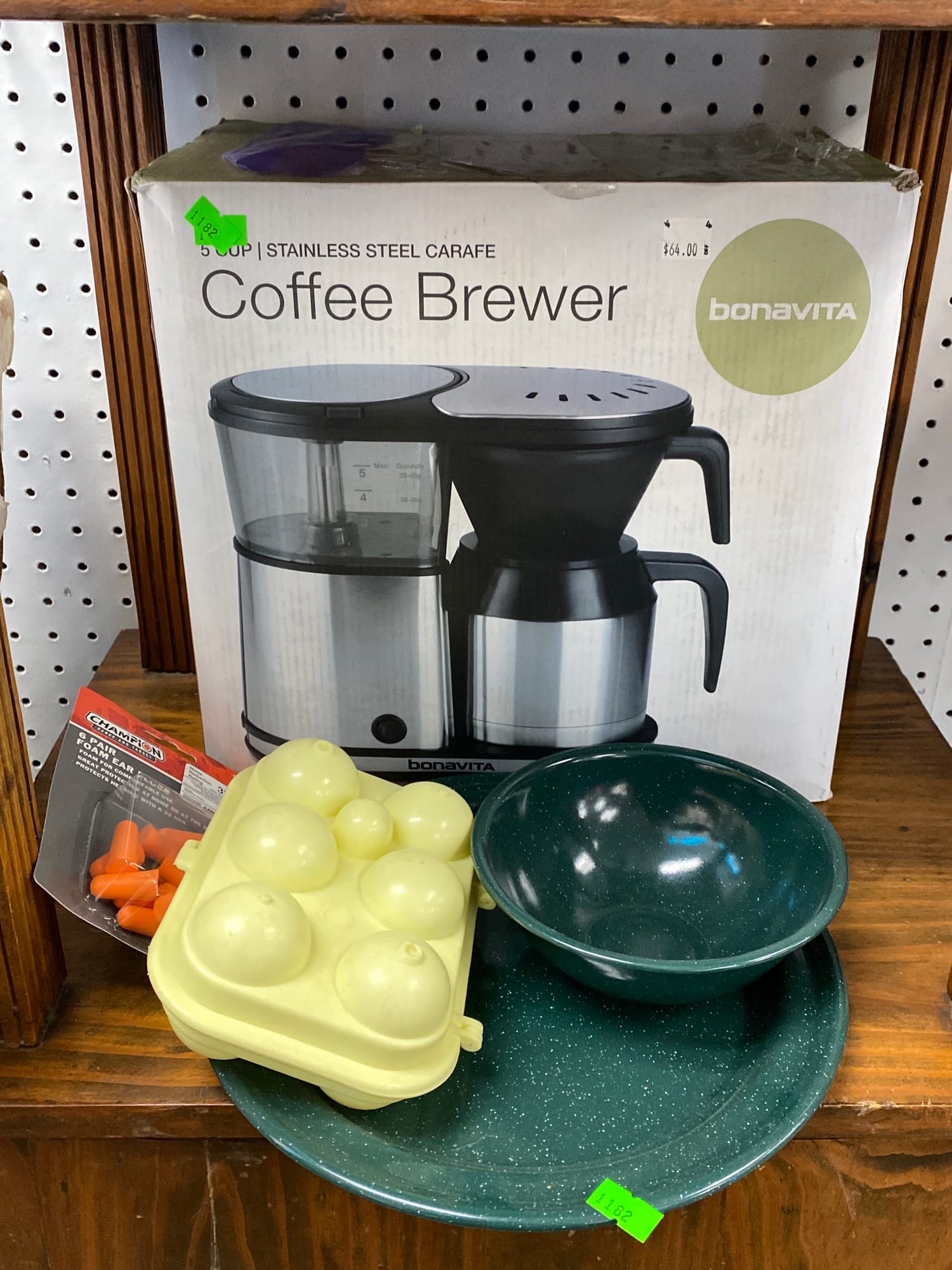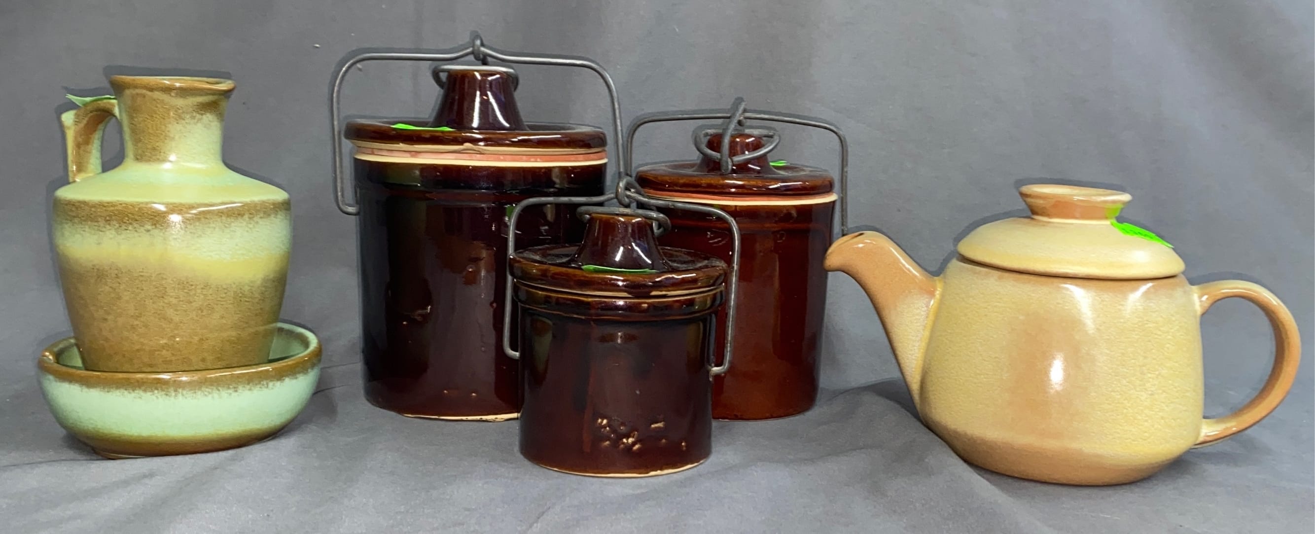 1503 Ornaments, Tim thumb toy register no drawer, metal buggy, beam decanter, amber glass jar, pressed glass sherbets and goblets, frames