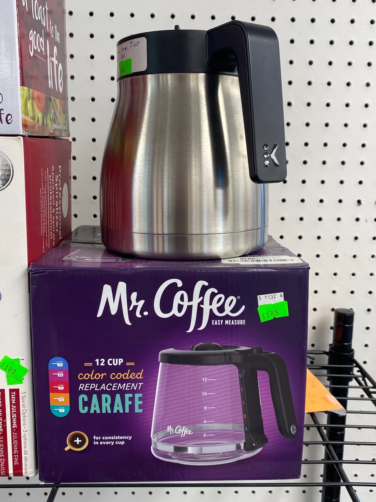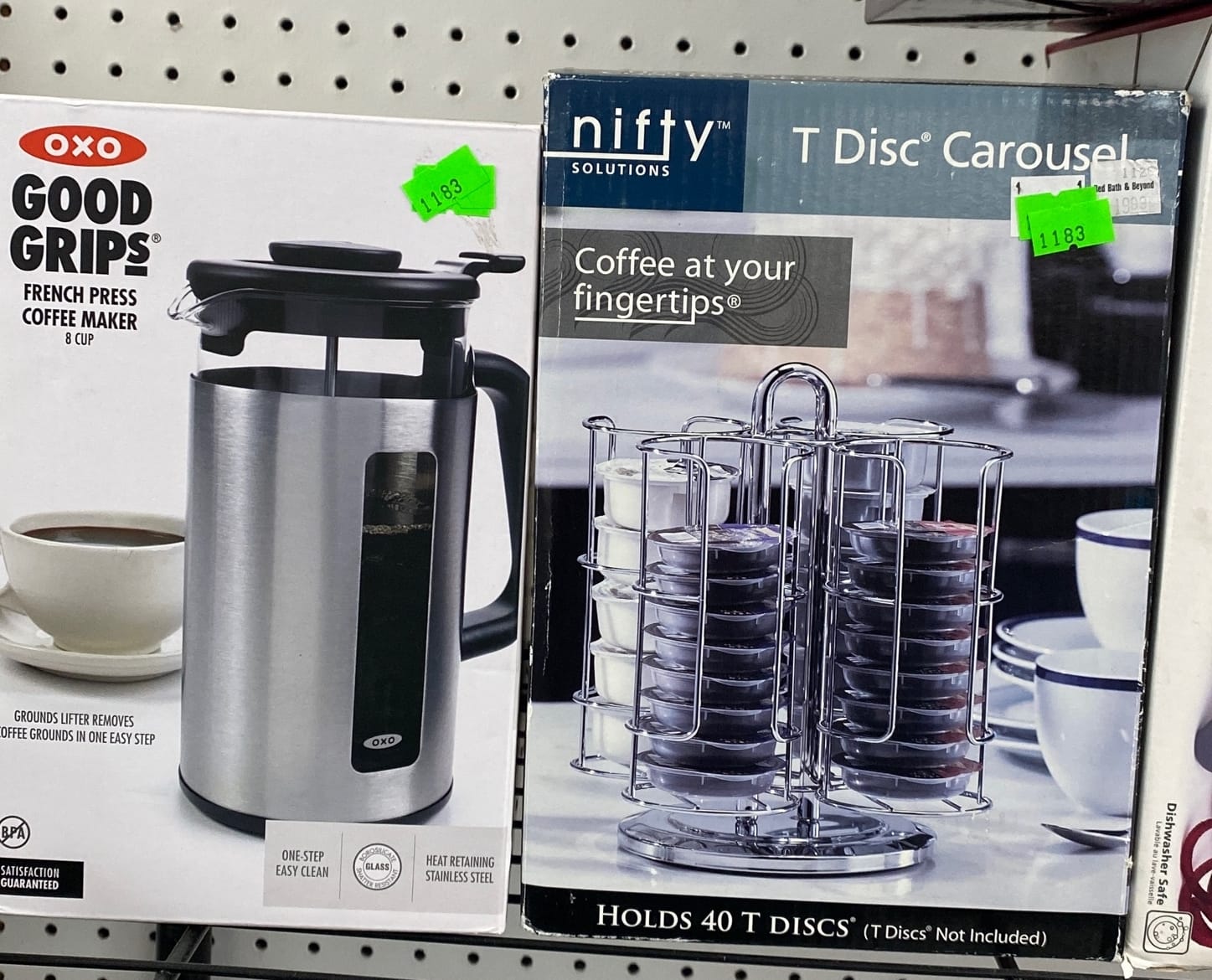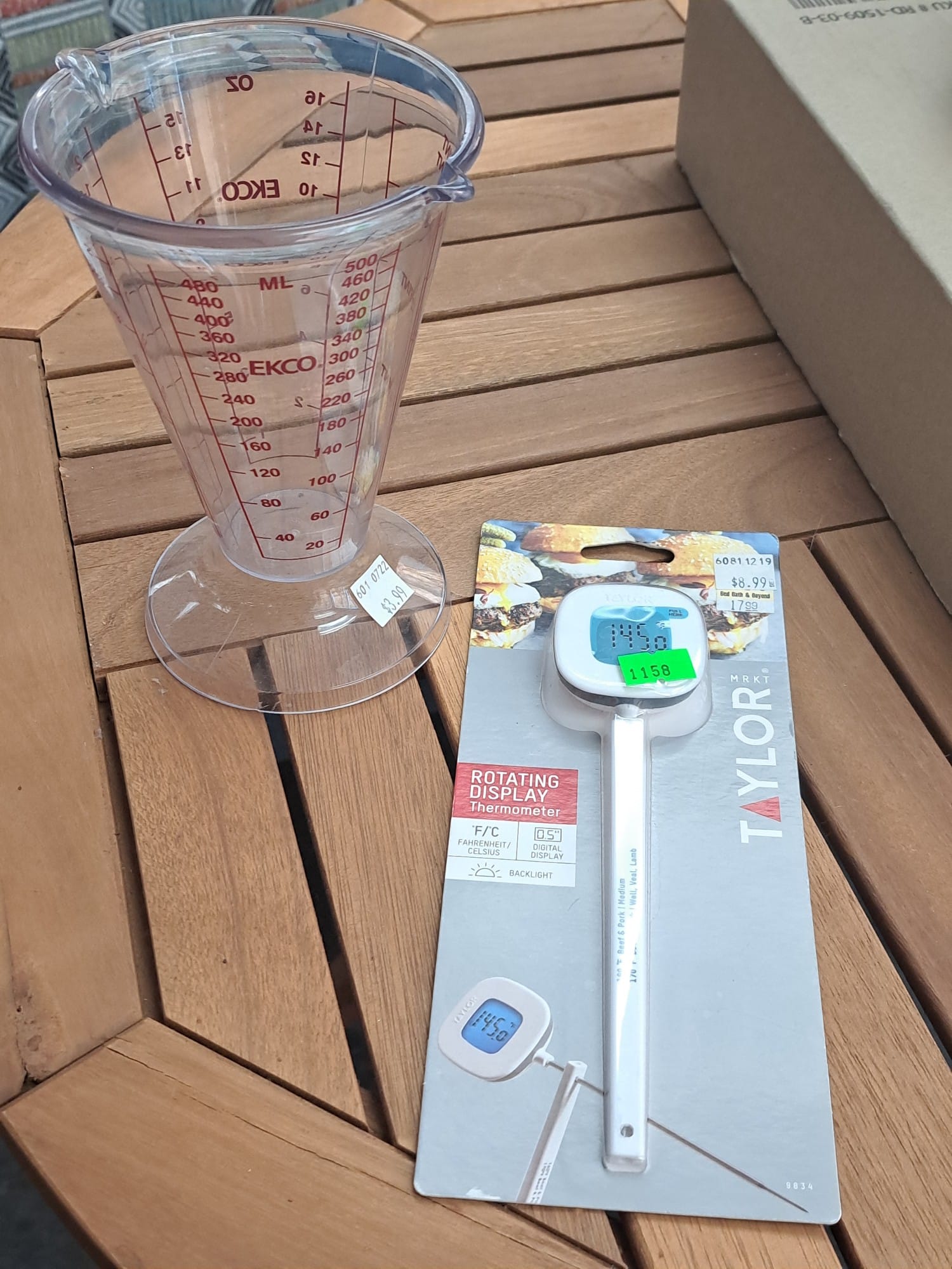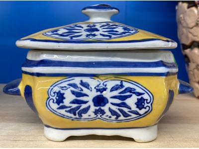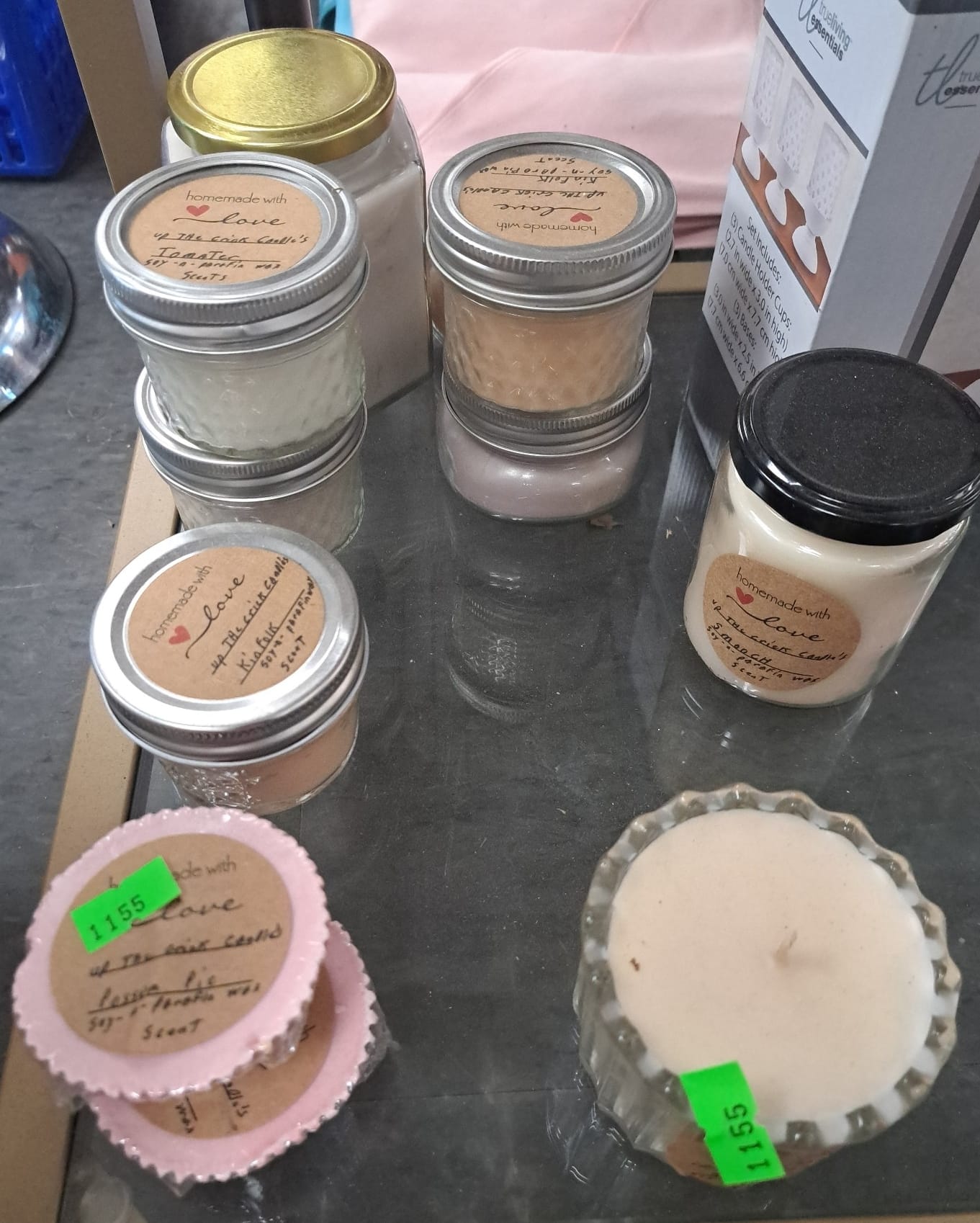 1503 Ornaments, Tim thumb toy register no drawer, metal buggy, beam decanter, amber glass jar, pressed glass sherbets and goblets, frames