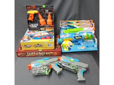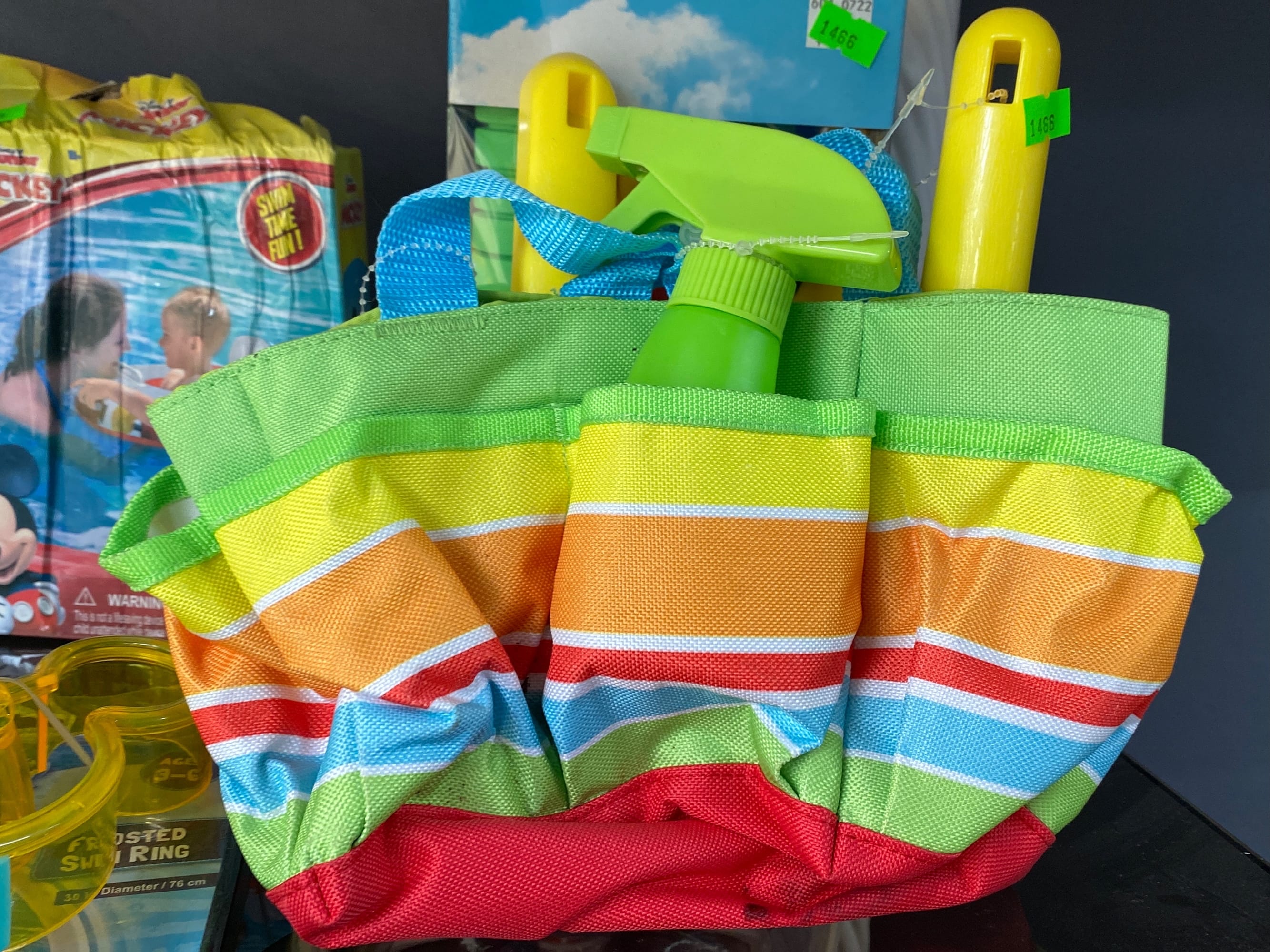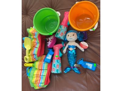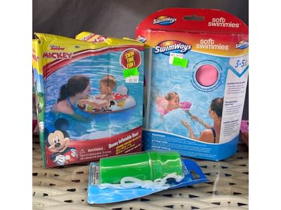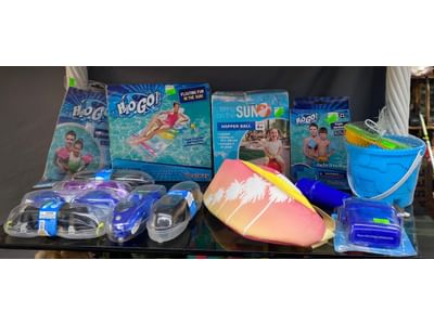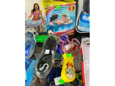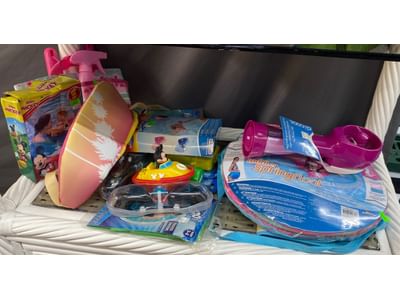 1466 Inflatable pool items, water goggle assortment, beach bag and toys
