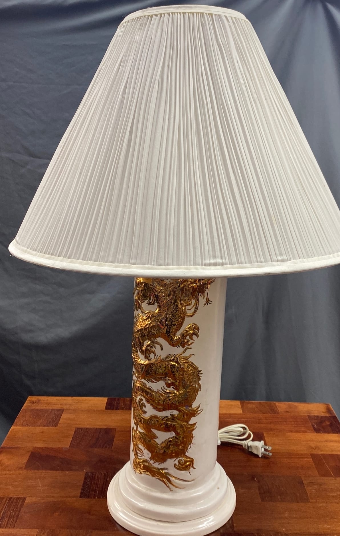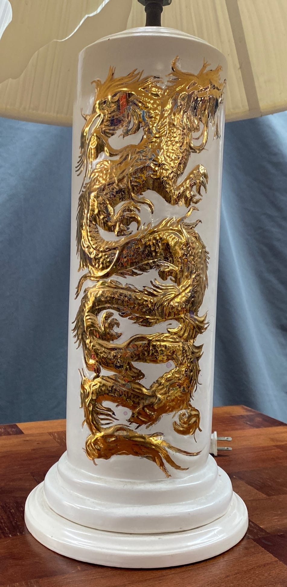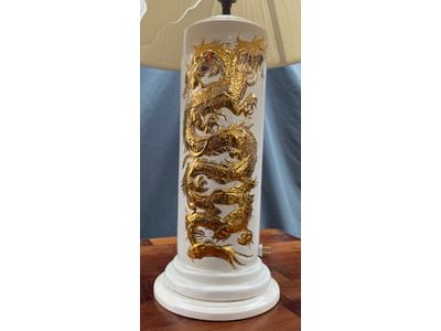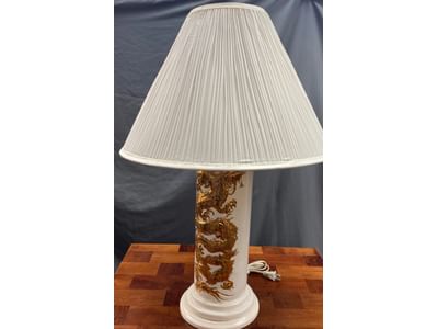 1451 Dragon theme lamp ceramic 27in , shade interior liner cracked